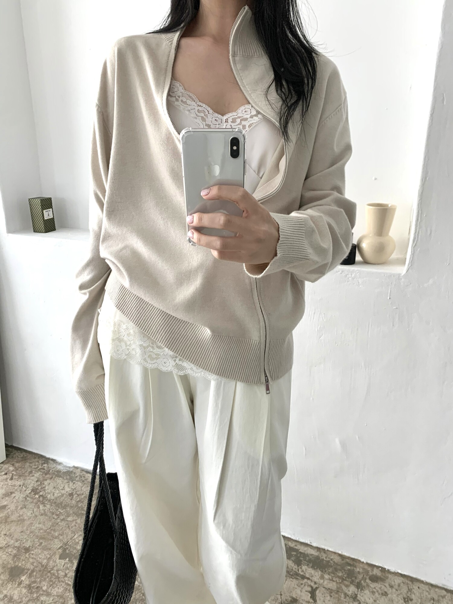 사선으로 이어진 지퍼라인이 특히나 유니크하면서도 트렌디한 무드를 표현해줍니다.