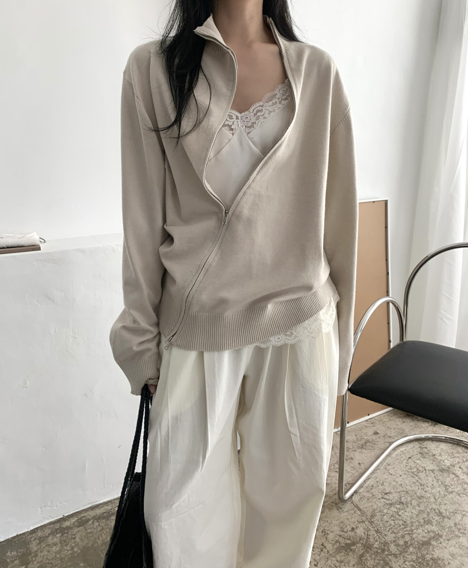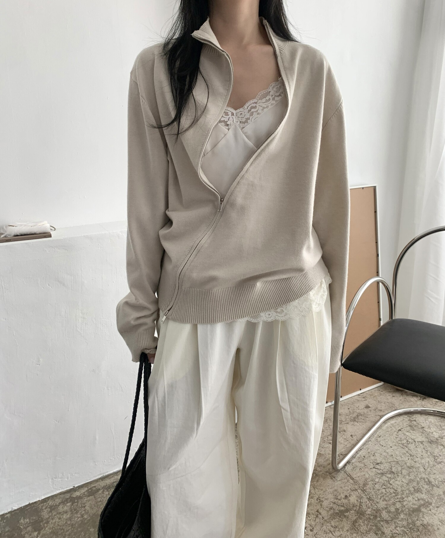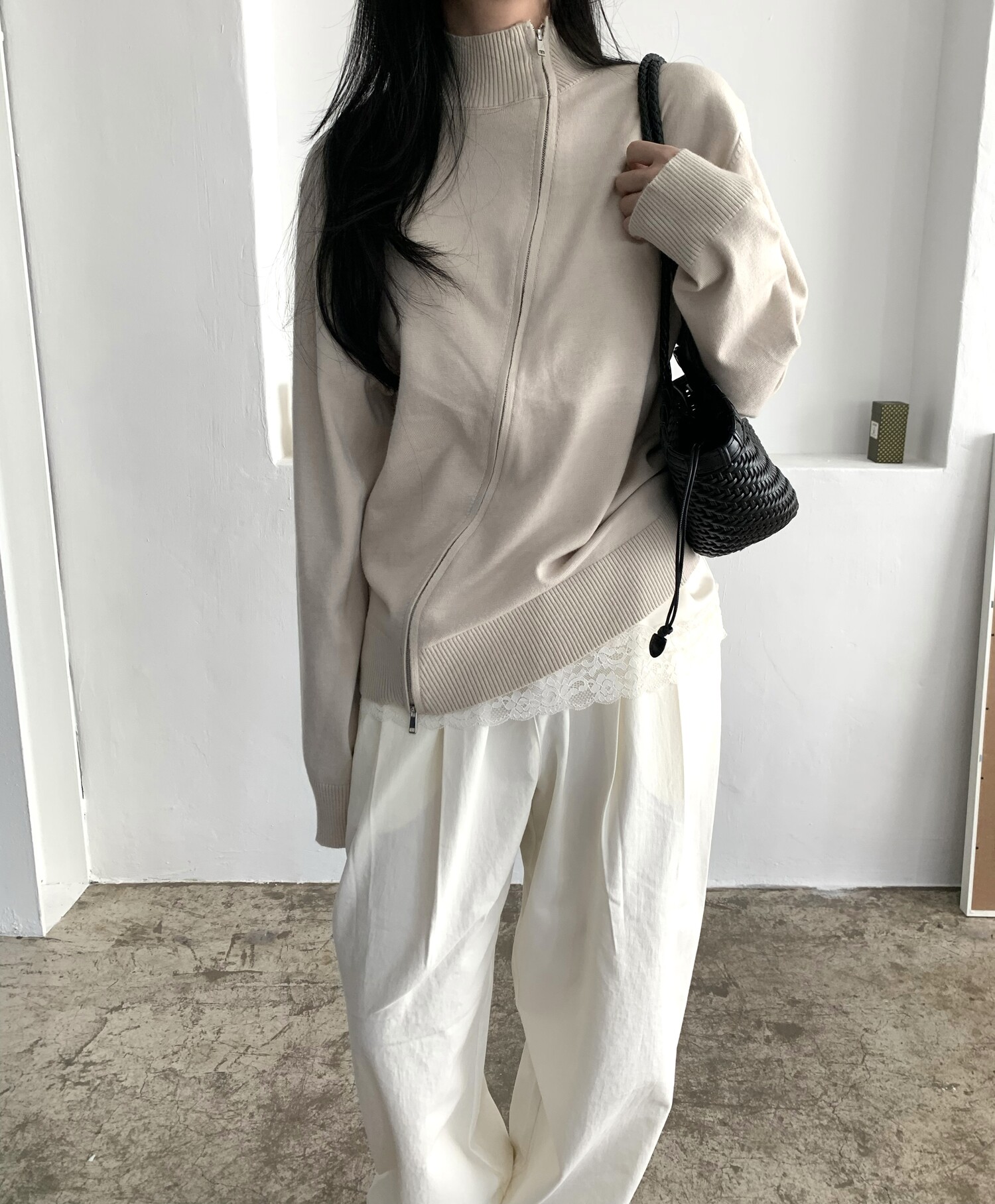 Diagonal loose fit zip-up knit-3color