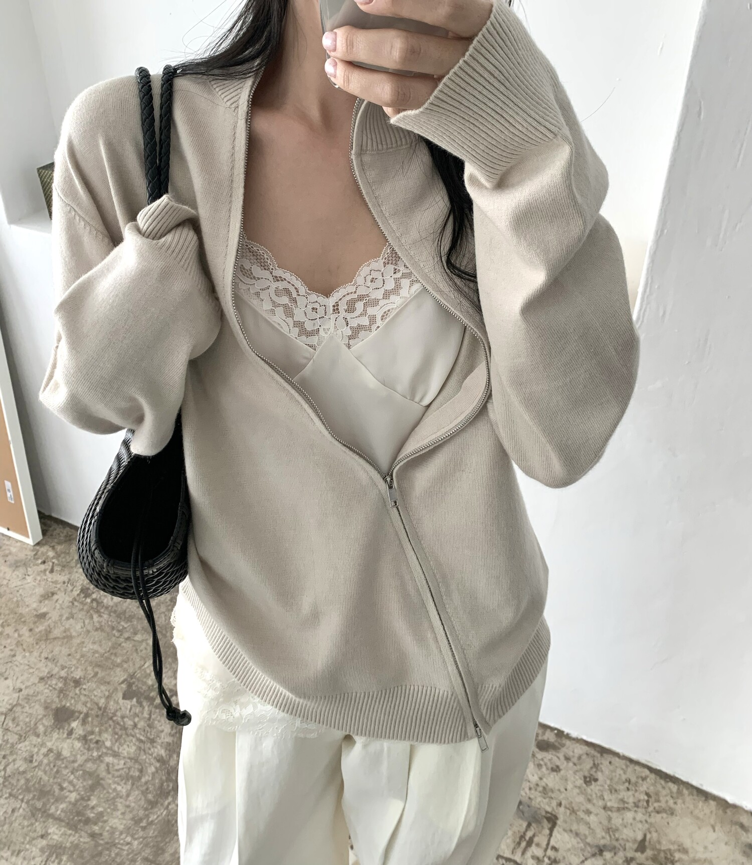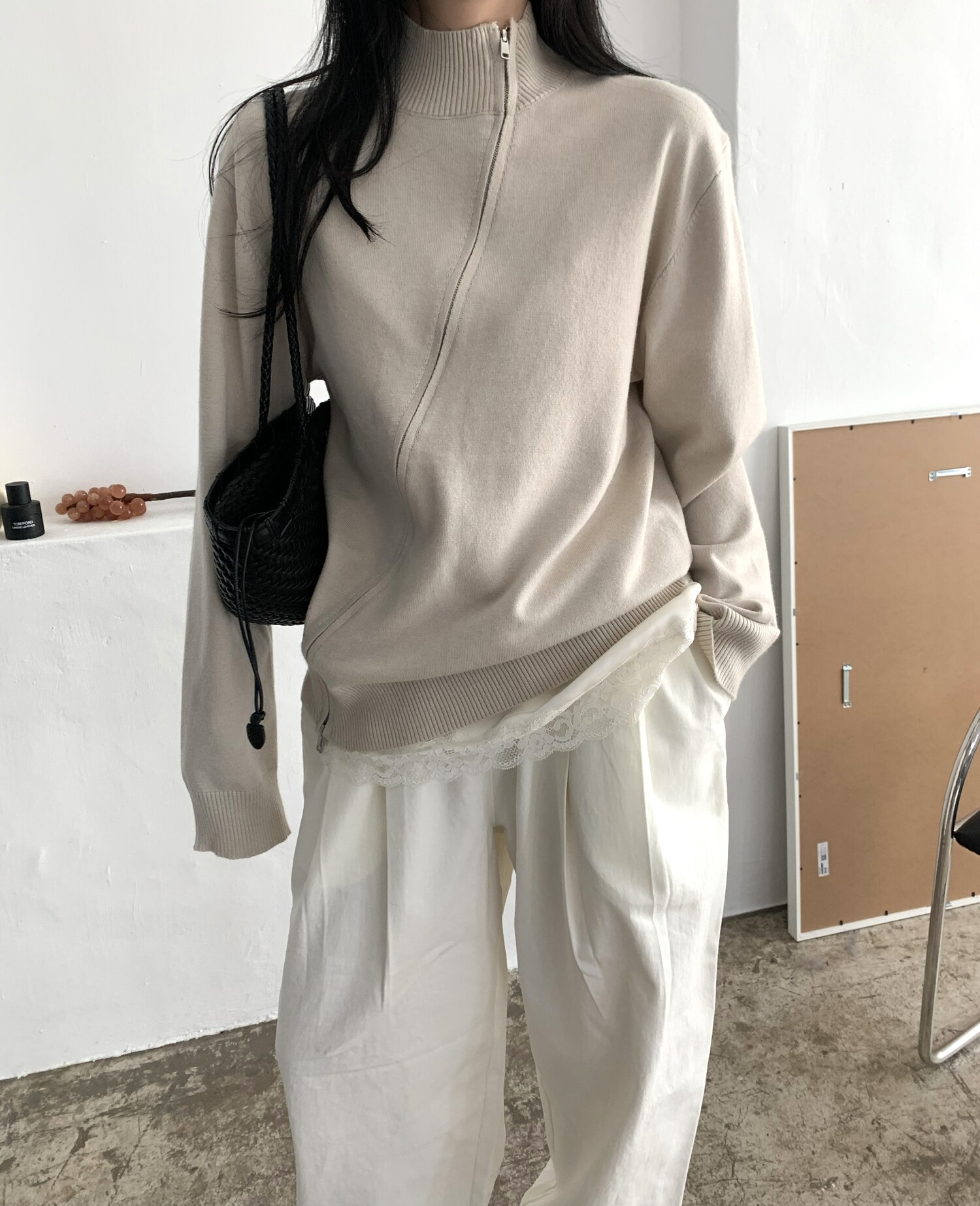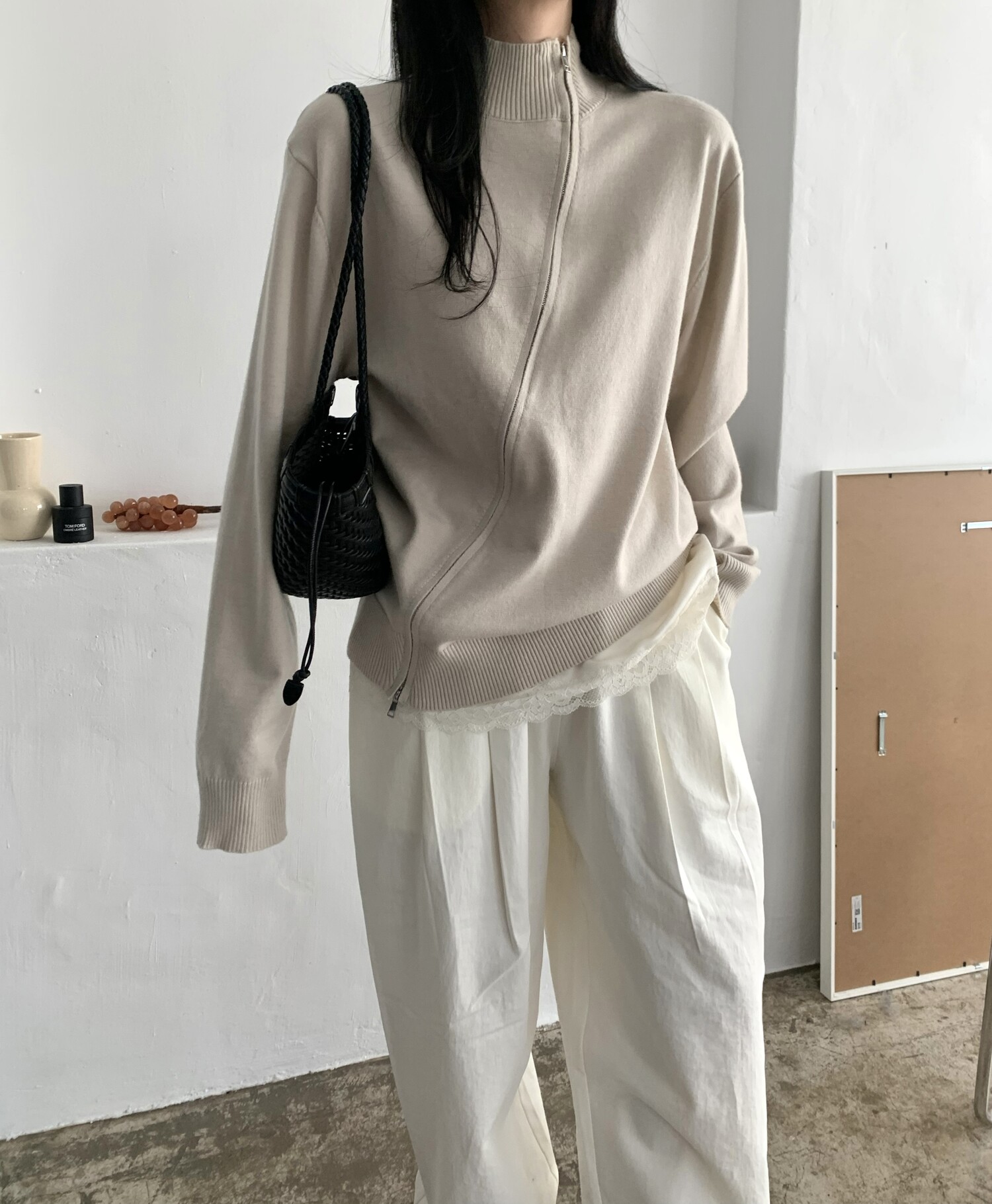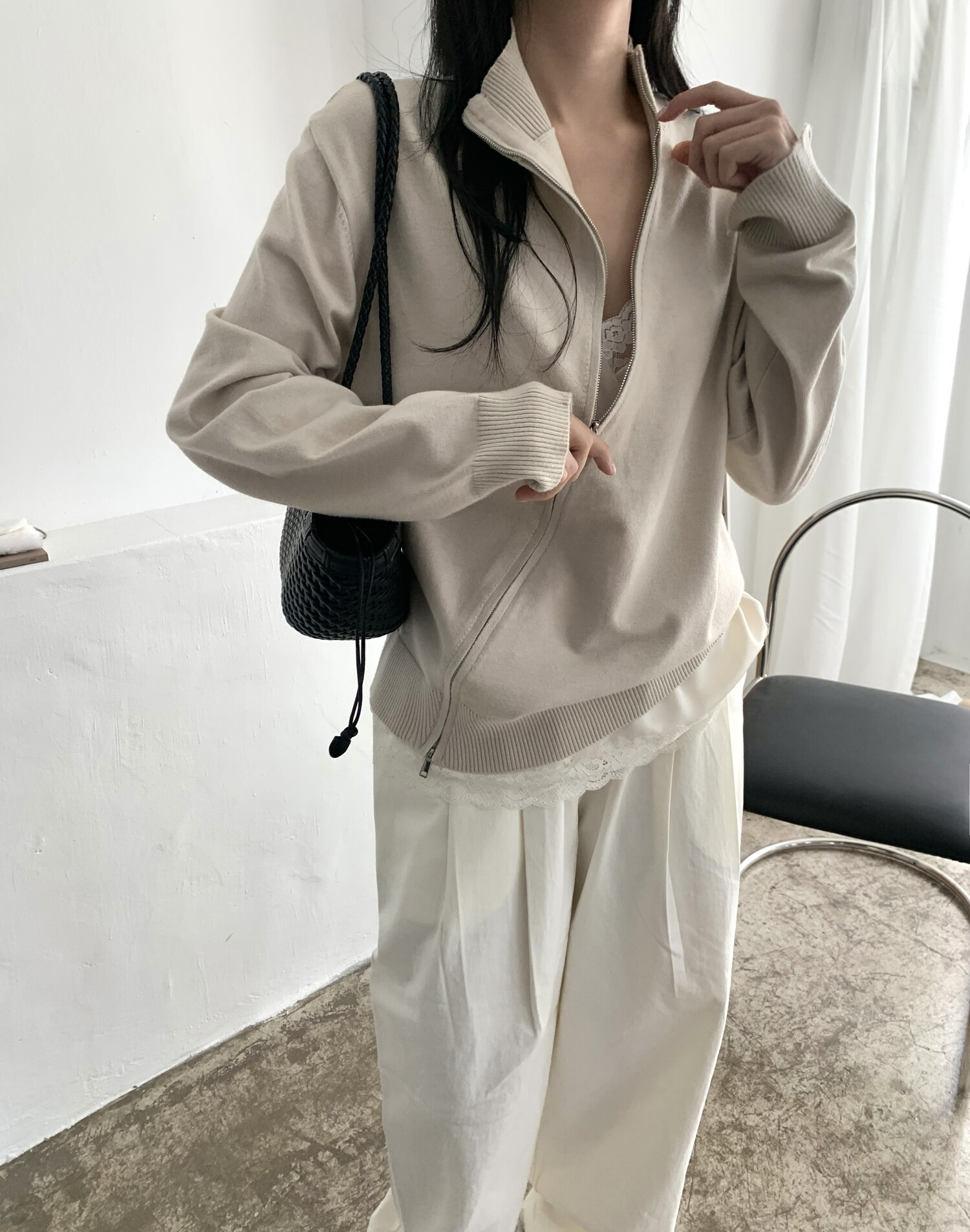 Diagonal loose fit zip-up knit-3color