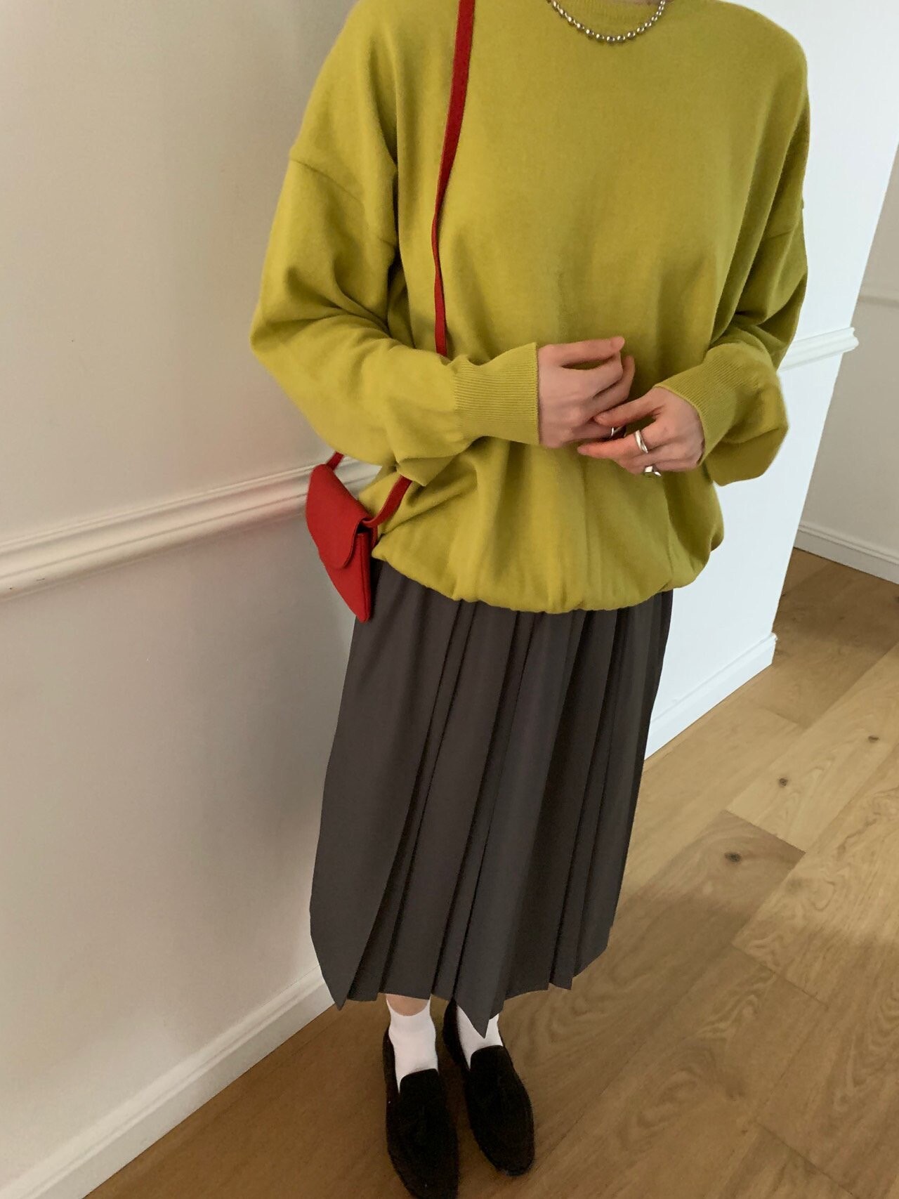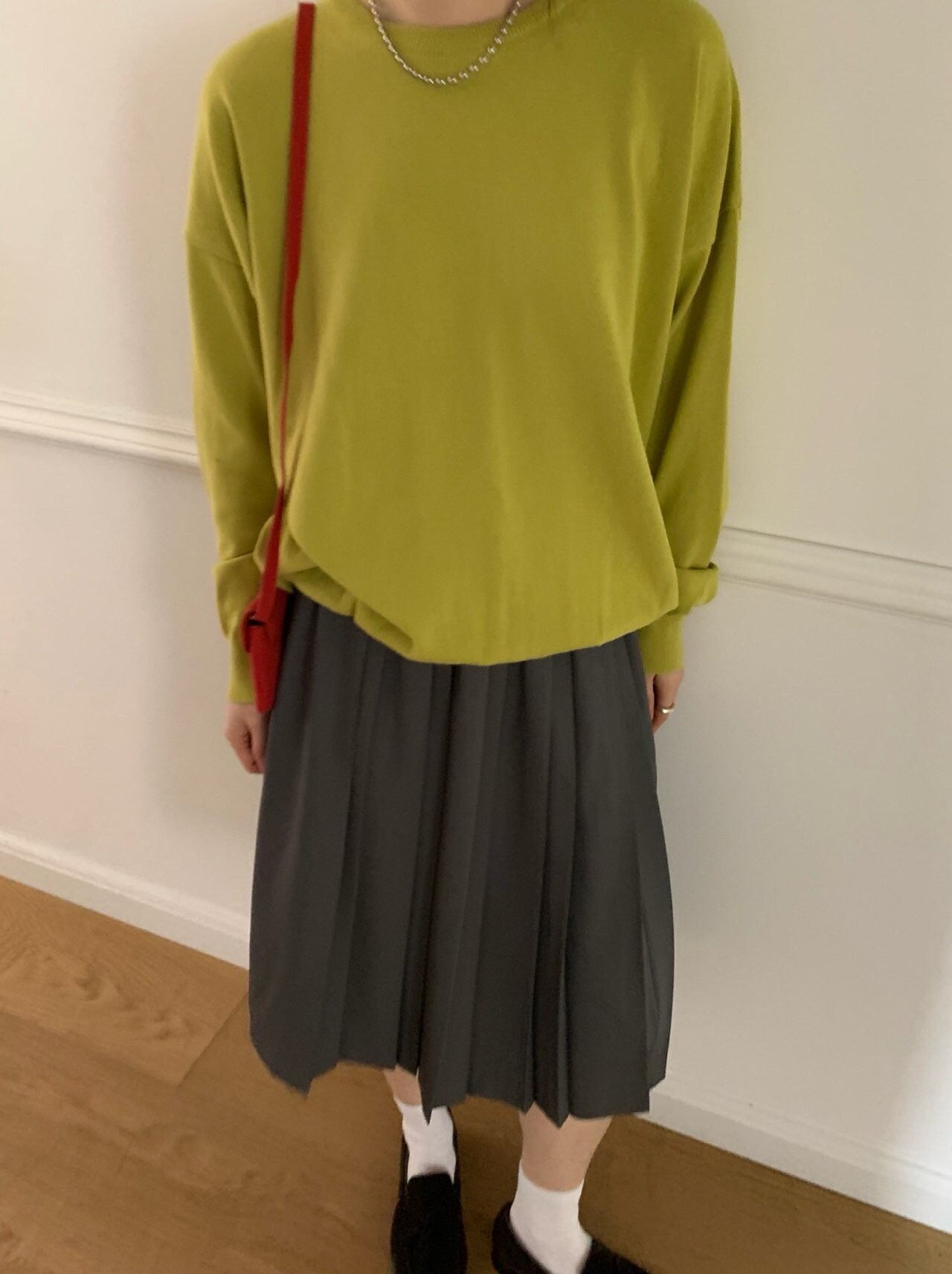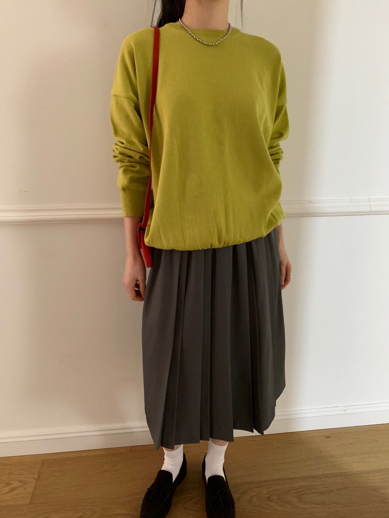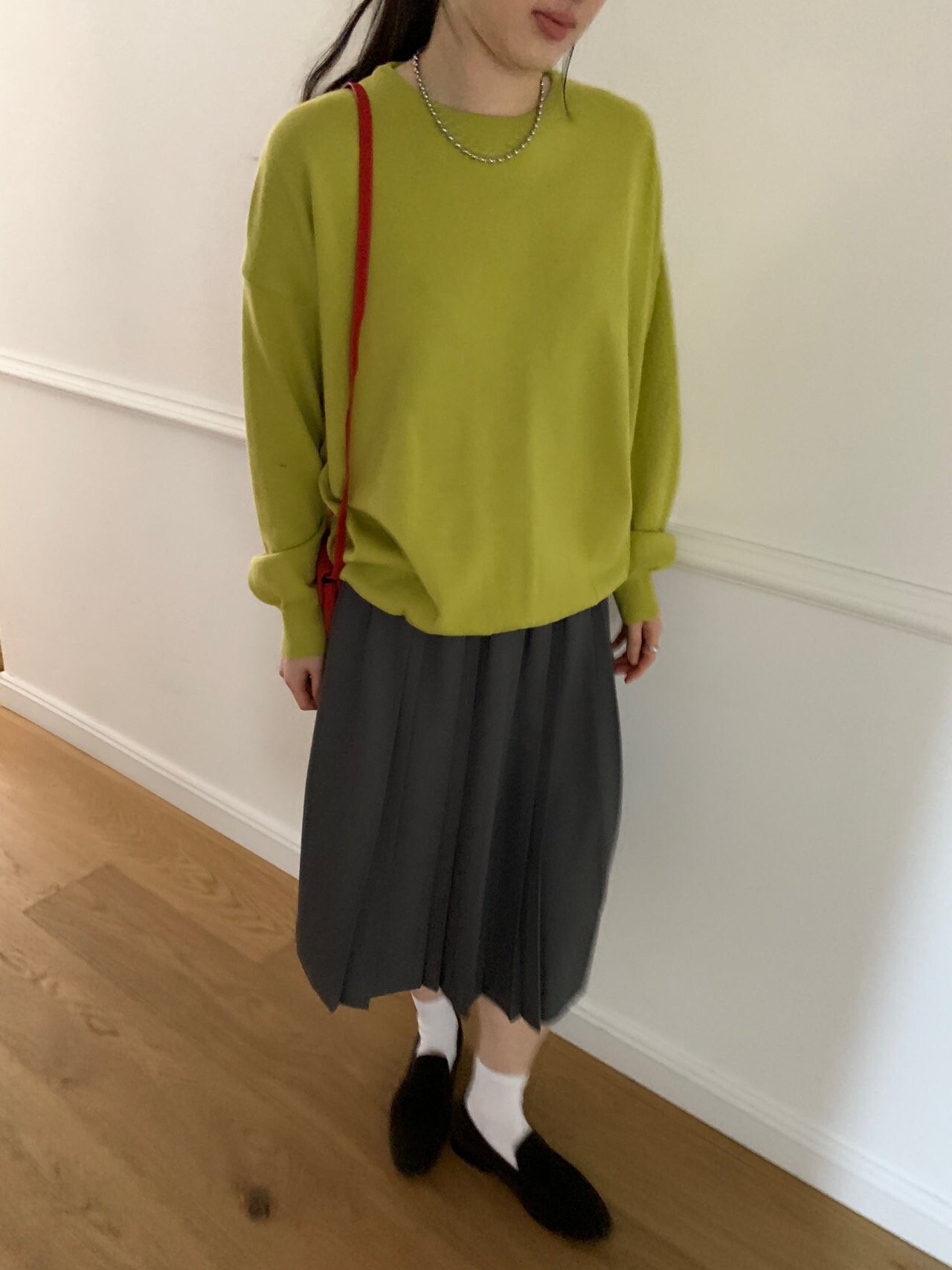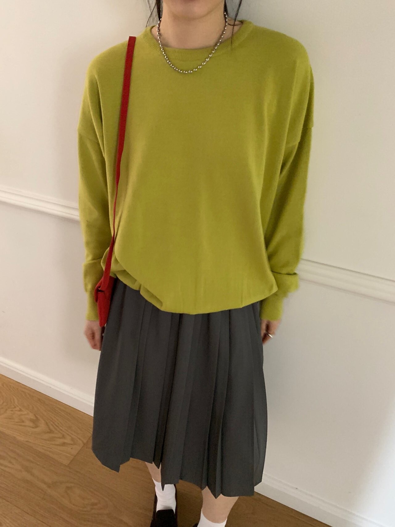 gray-상의 Candy loose fit long knit / olive green 착용