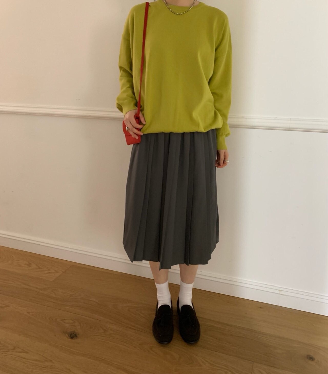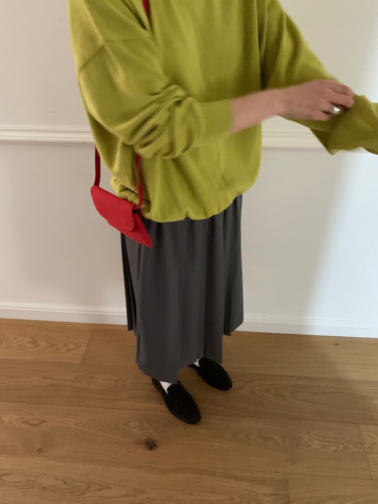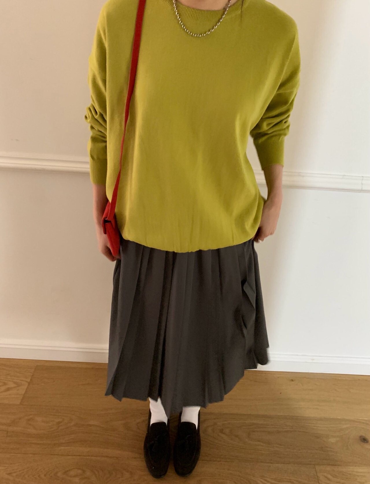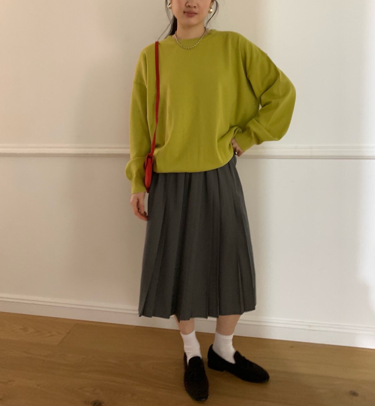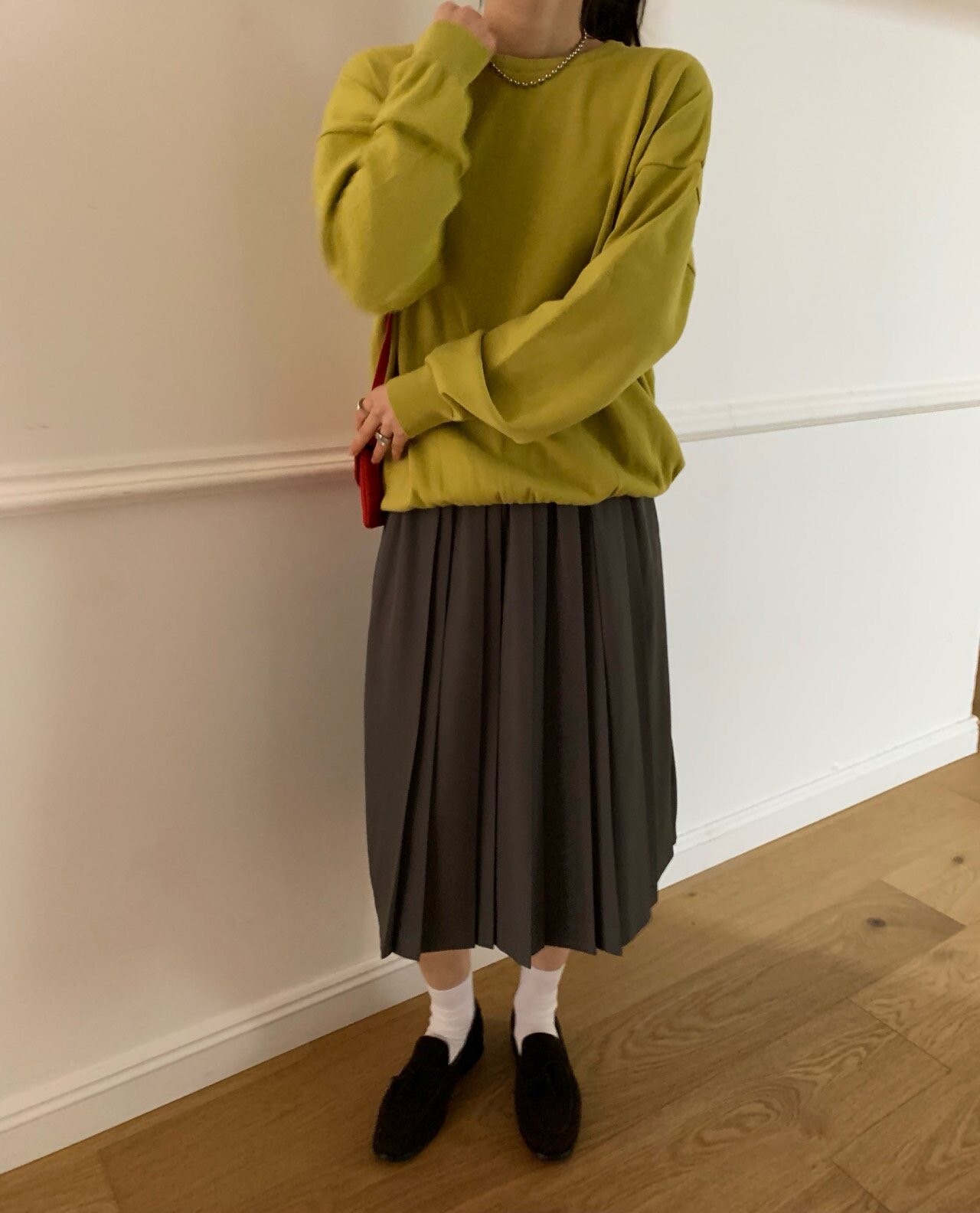 gray-상의 Candy loose fit long knit / olive green 착용