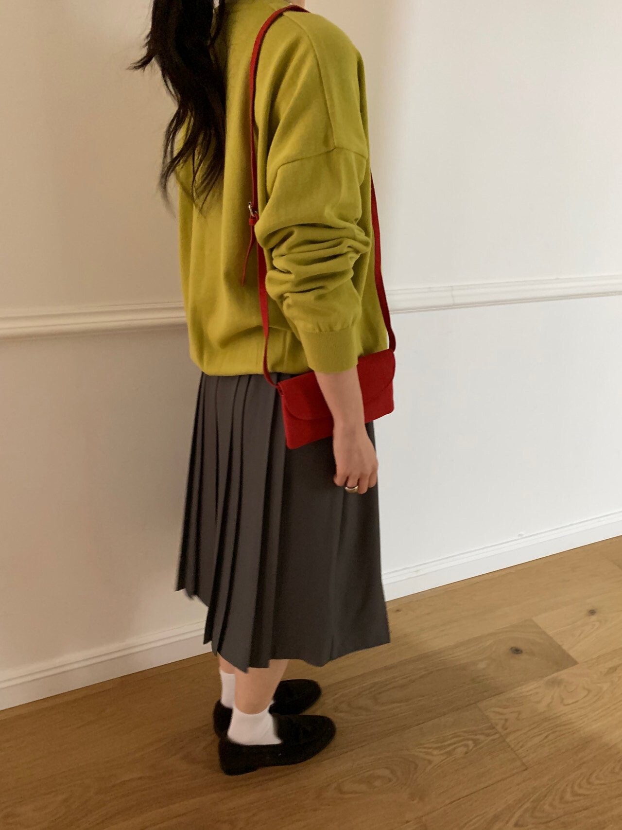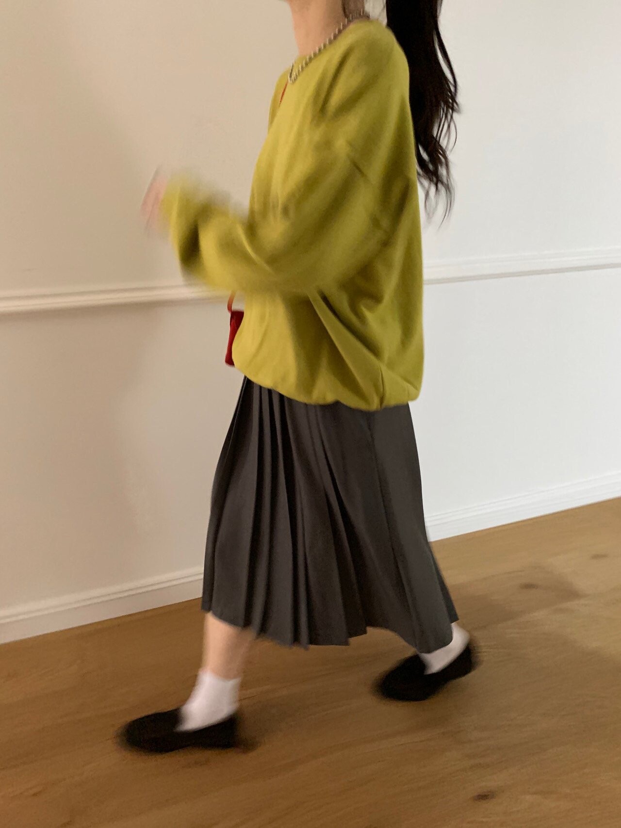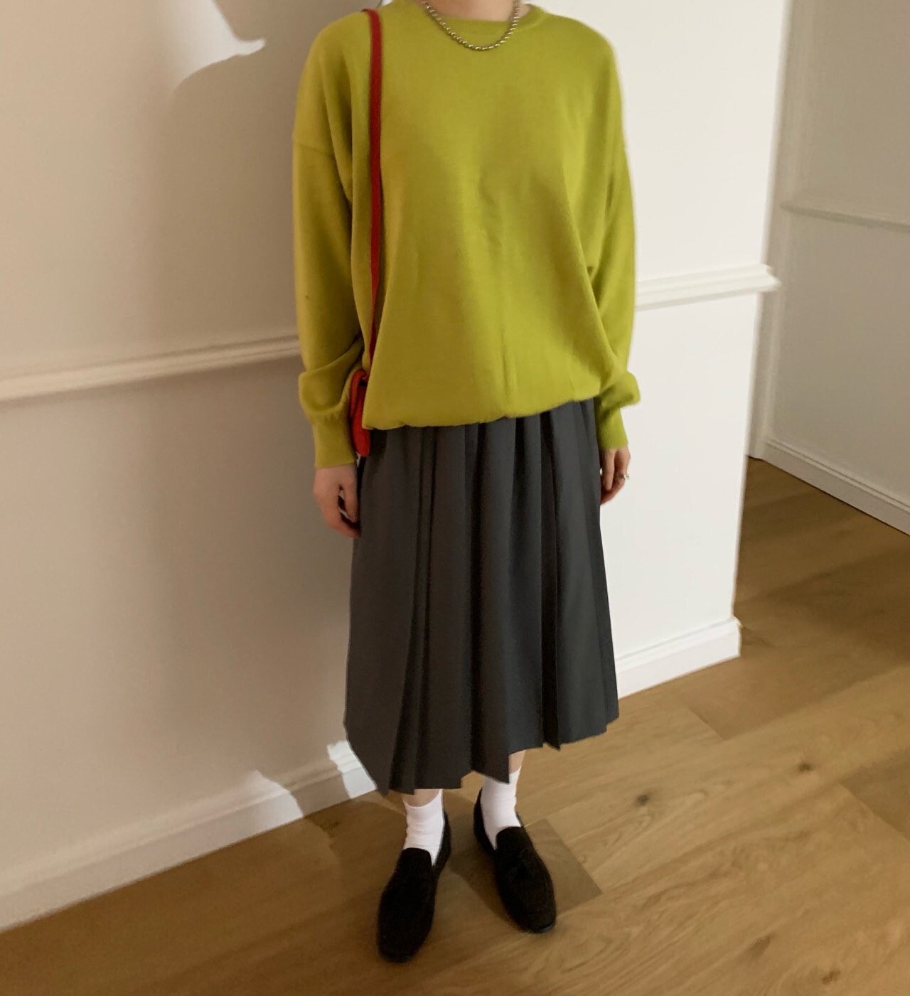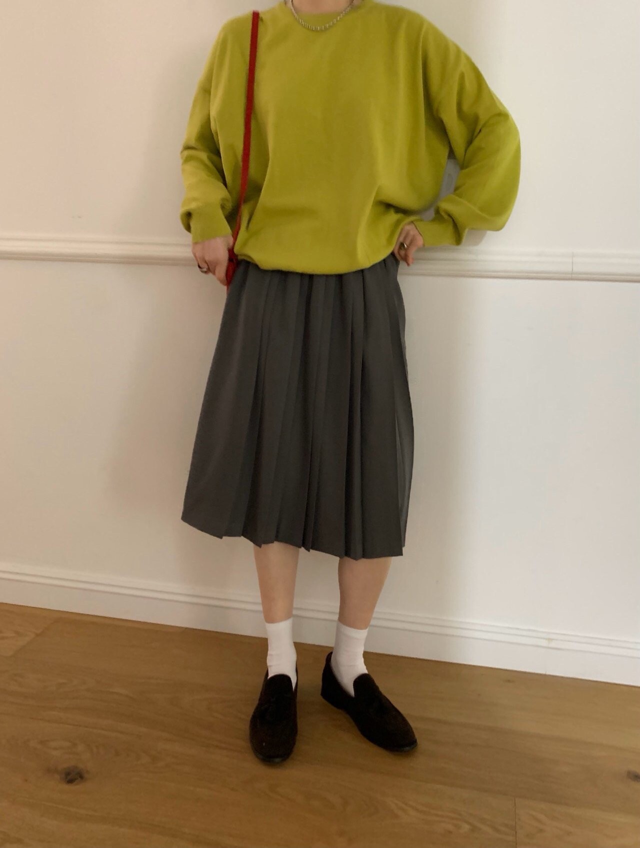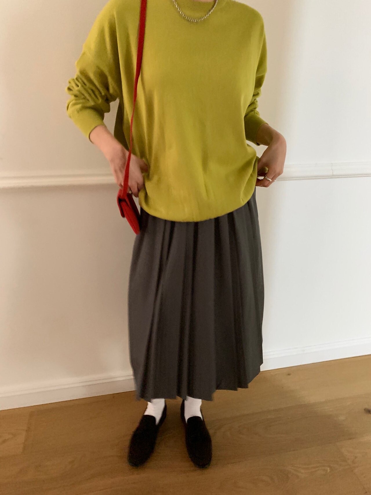 gray-상의 Candy loose fit long knit / olive green 착용