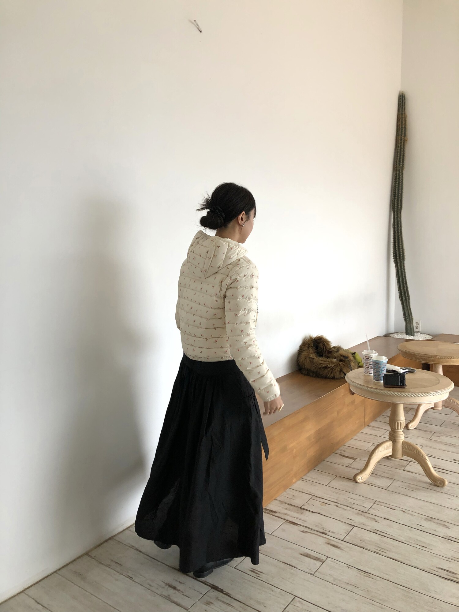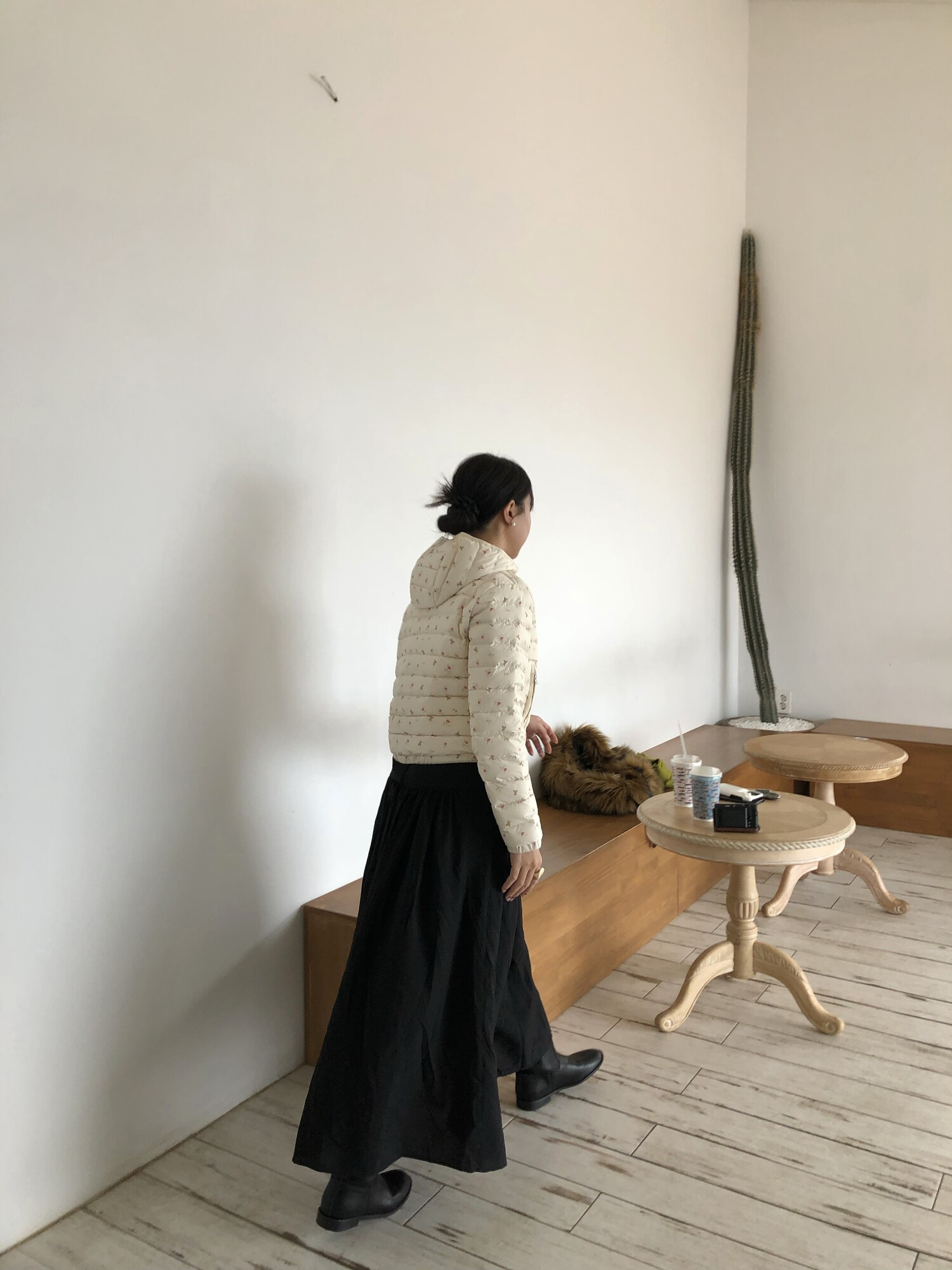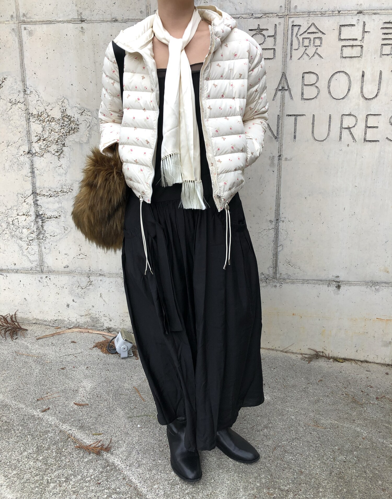 경량패딩 특유의 볼륨감은 크지 않아서 과함 없이 입기좋았습니다. 연청에 입어도 이쁘고 원피스와도 너무 잘 어울리구요. 데일리하게 두루두루 잘 입어지실거에요.