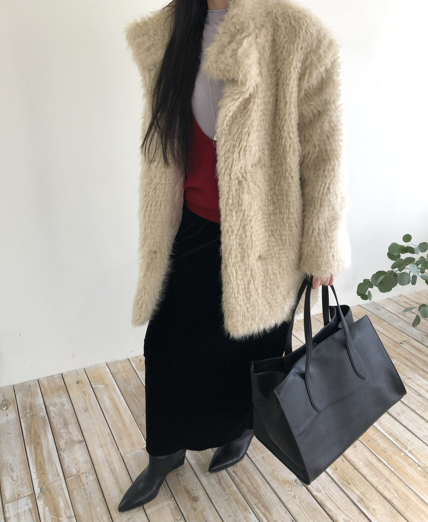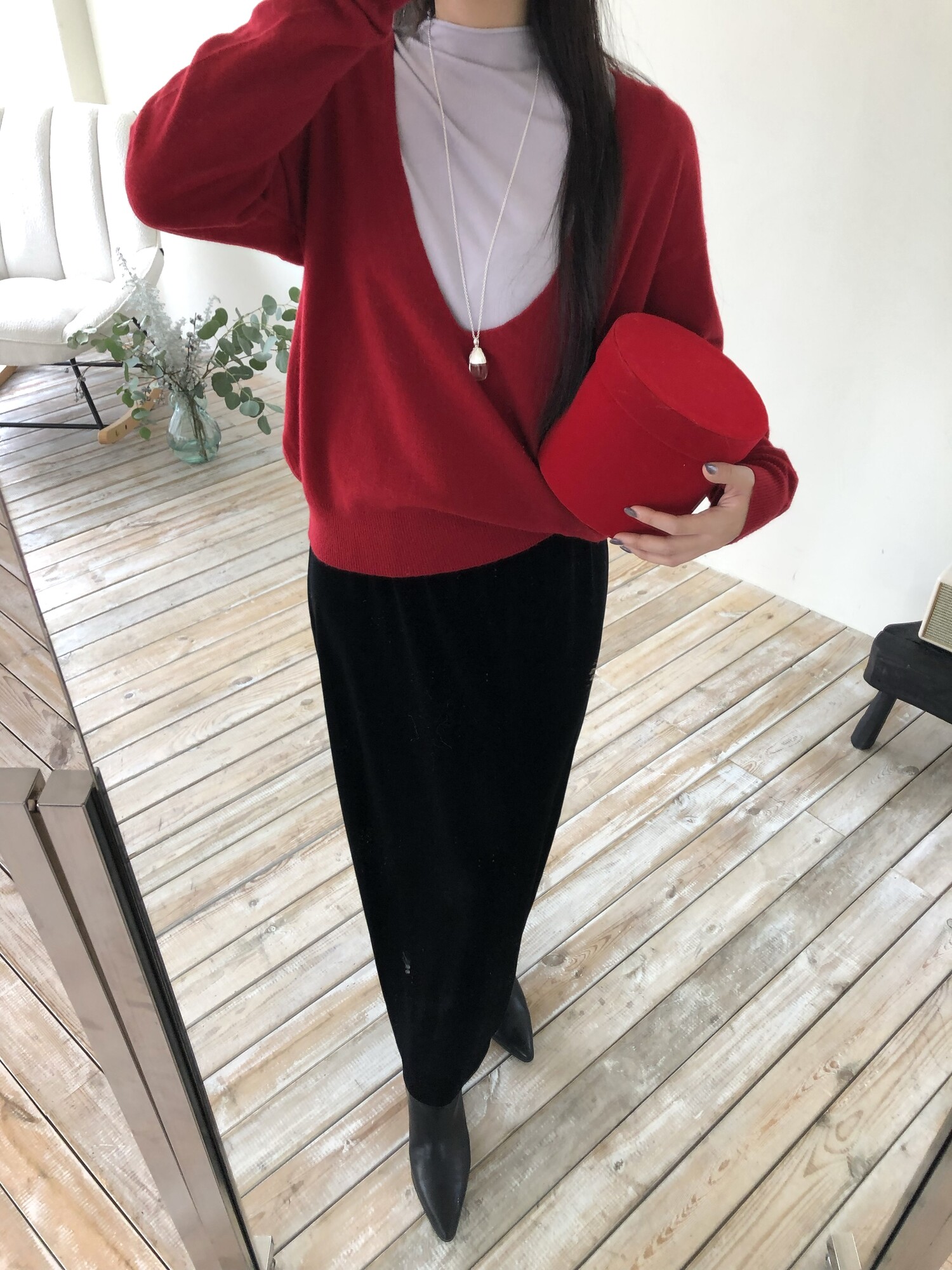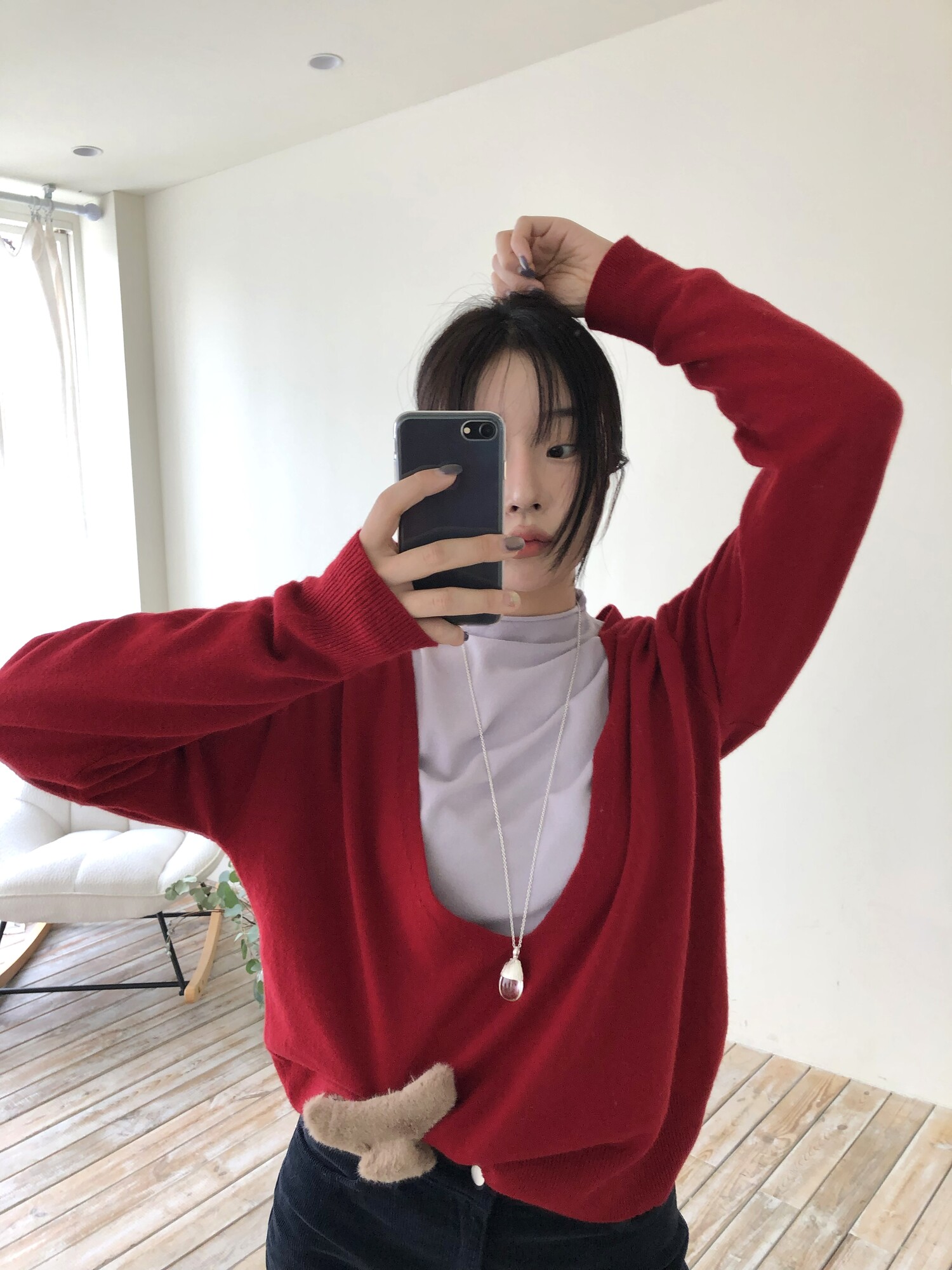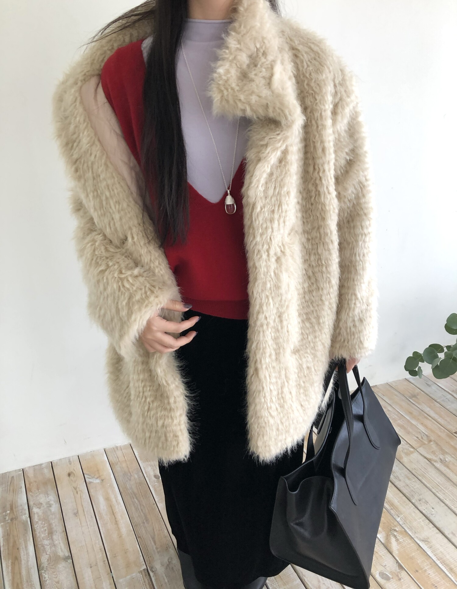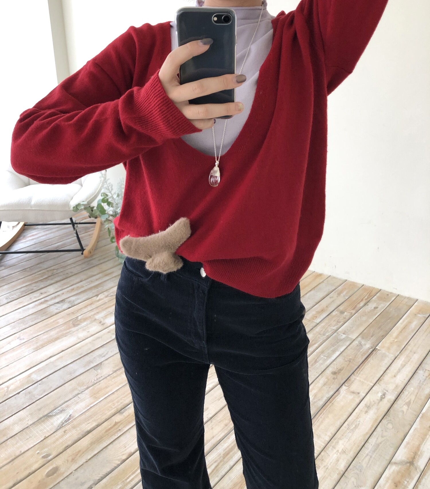 레이어드를 위해 의도된 디자인인 딥한 브이넥으로 파임 있는 편이며 얇은 이너와 레이어드하여 착용하여 더욱 멋스럽고 따뜻하게 착용 하실 수 있습니다.