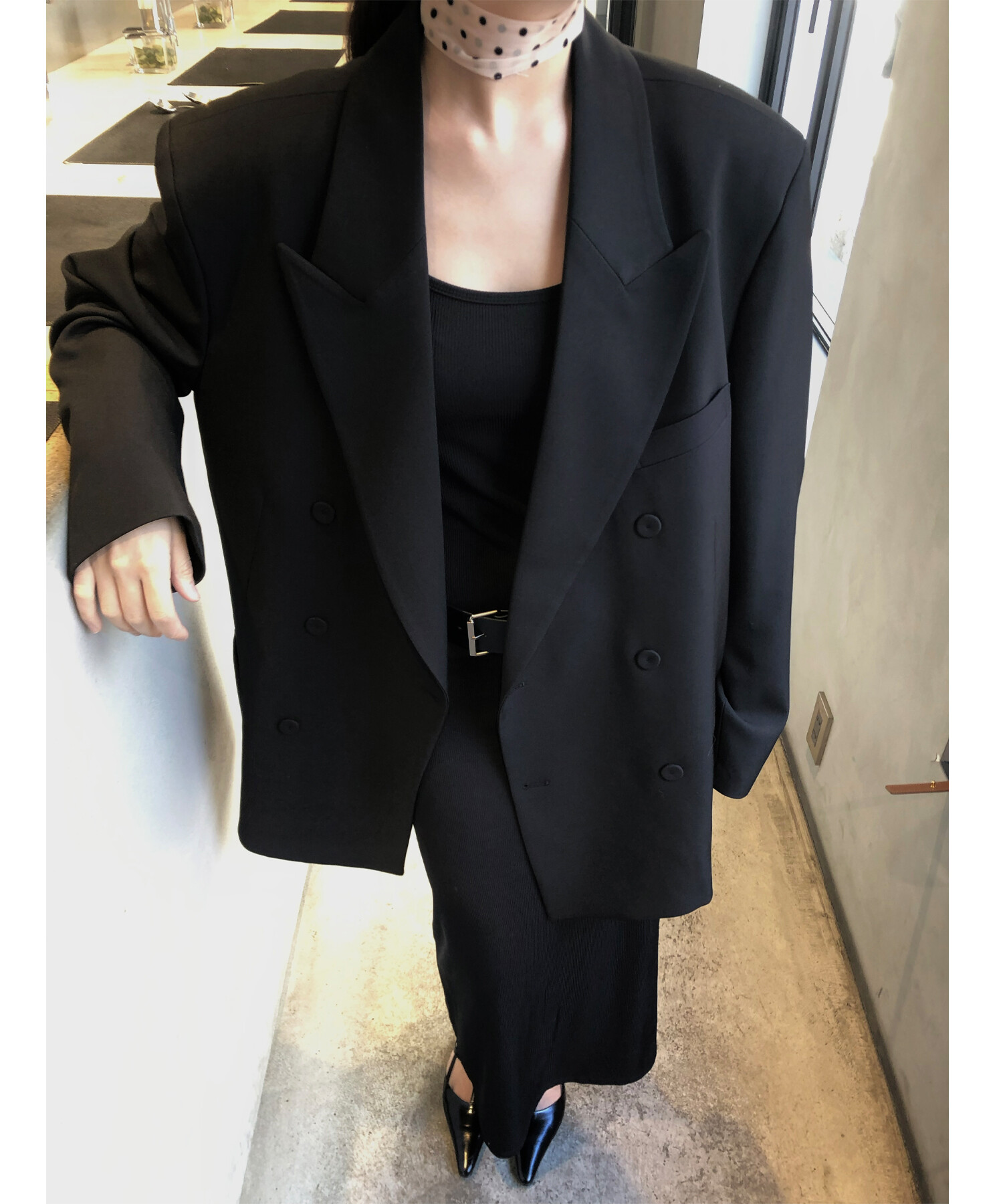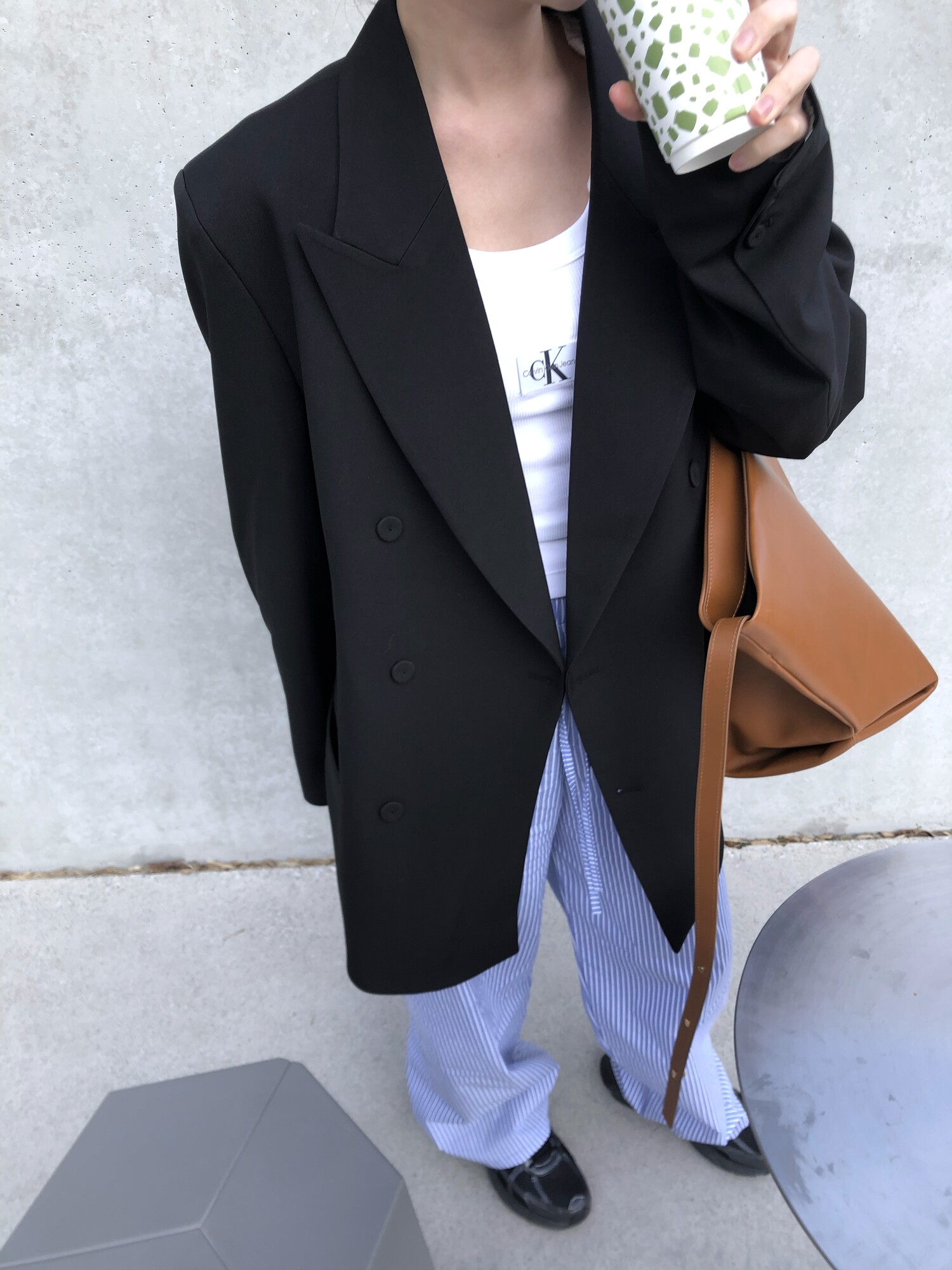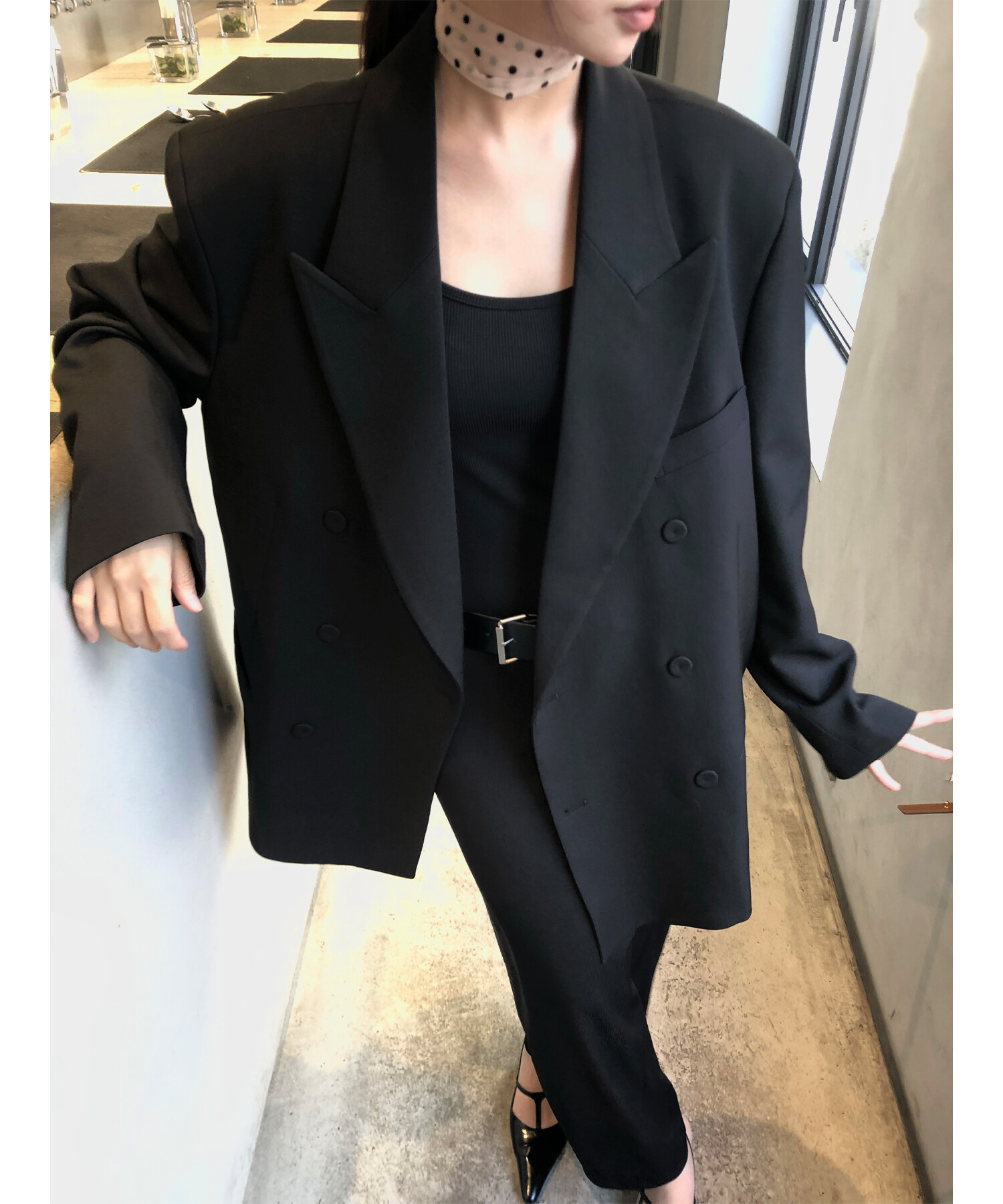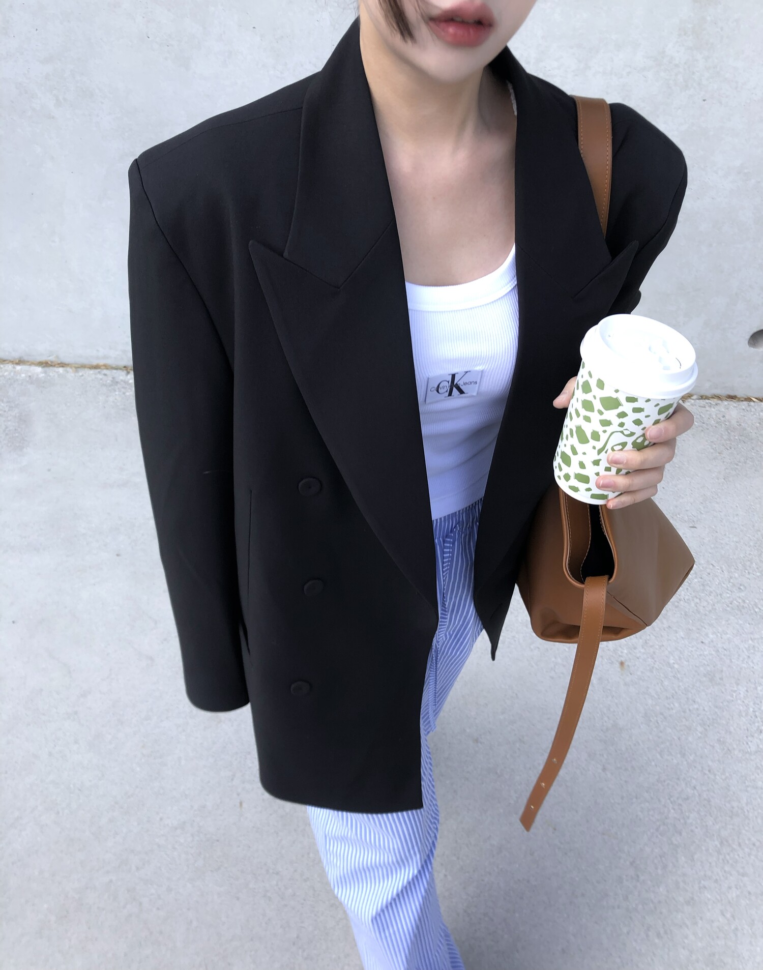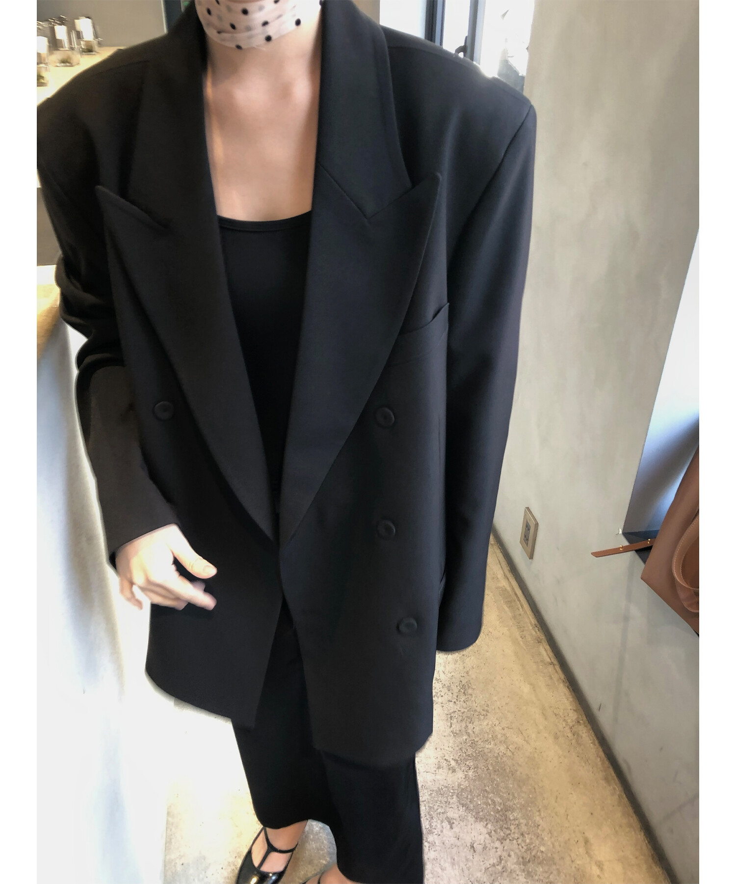 고급스런 테일러 라인의 유니섹스 오버핏 자켓이에요, 우선 길게 떨어지면서도 시크한 카라와 오버핏에 반했구요, 55기준 조금 크지만 큰 맛대로 딱 이쁘고 너무나 멋들어지는 자켓이에요, (44분께는 전체적으로 너무 클거 같아 비추드립니다.) 보이프렌핏으로 입기좋으며, 시크한 무드의 쓰리버튼으로 적당히 긴 기장까지 정말 보기힘든 고급스런 라인입니다ㅜㅜ (가격대는 또 얼마나 합리적이구요,,) 팬츠와도 찰떡이지만 롱새틴 스커트나 원피스와도 매우 잘 어울린답니다. 특별한 날 입기에도 너무 좋구요, 매트하면서도 구김성 적은 원단과 고급스런 버튼, 오버한 숄더라인에서 툭 떨어지는 핏까지 너무나 제 스타일입니다,,요런 자켓에 프렌치한 감성의 흰나시와 파자마스런 위트있는 스트라이프 팬츠, 무심한 듯 툭 걸친 빅 숄더백..꼭 입어보고 싶었던 룩이기도 하구요, 그냥 메종메츄어의 취향가득 담은 룩이에요,,! 프렌치한 감성의 오버핏 자켓 찾으신다면 무조건 이거요,,,적극 추천드립니다.