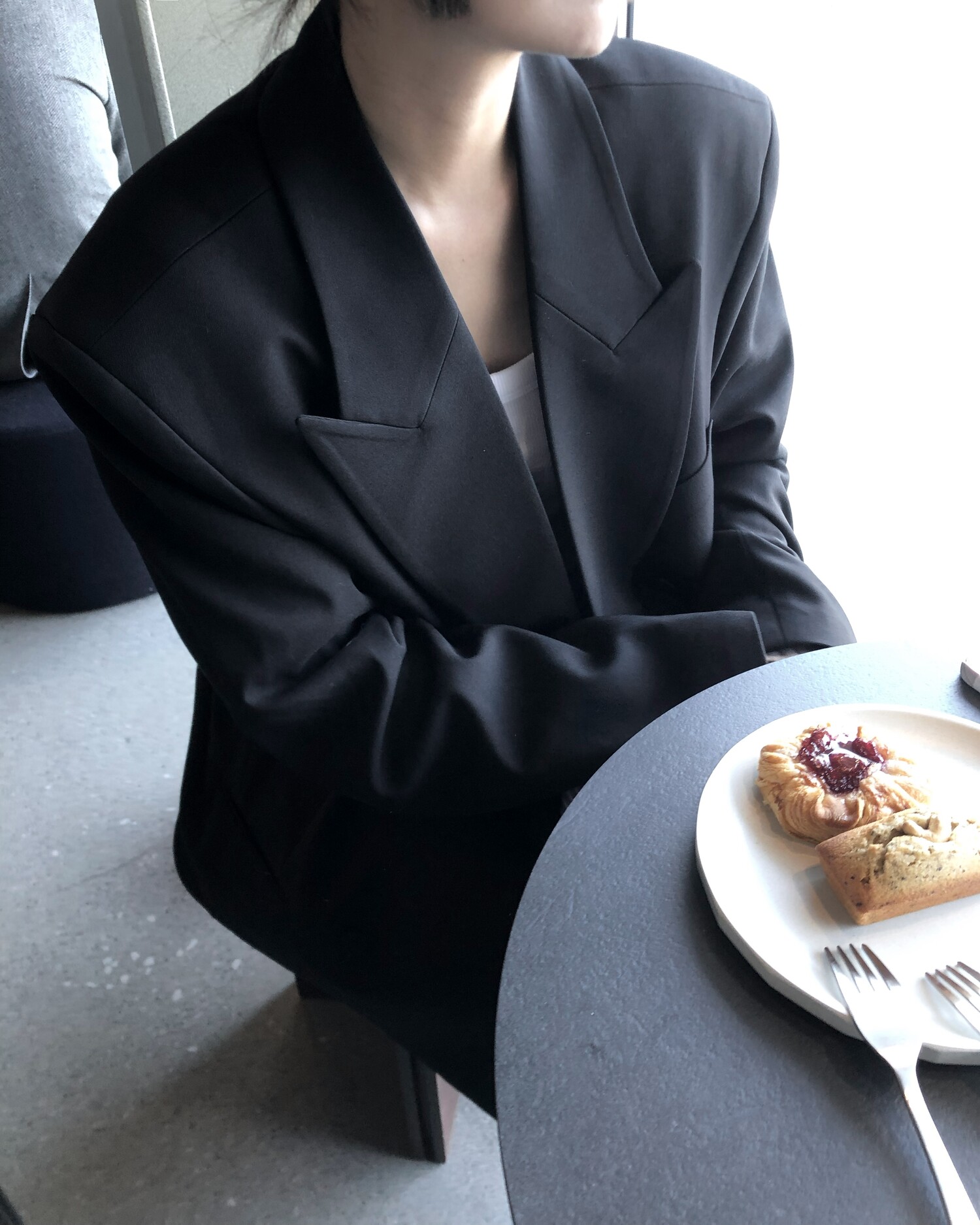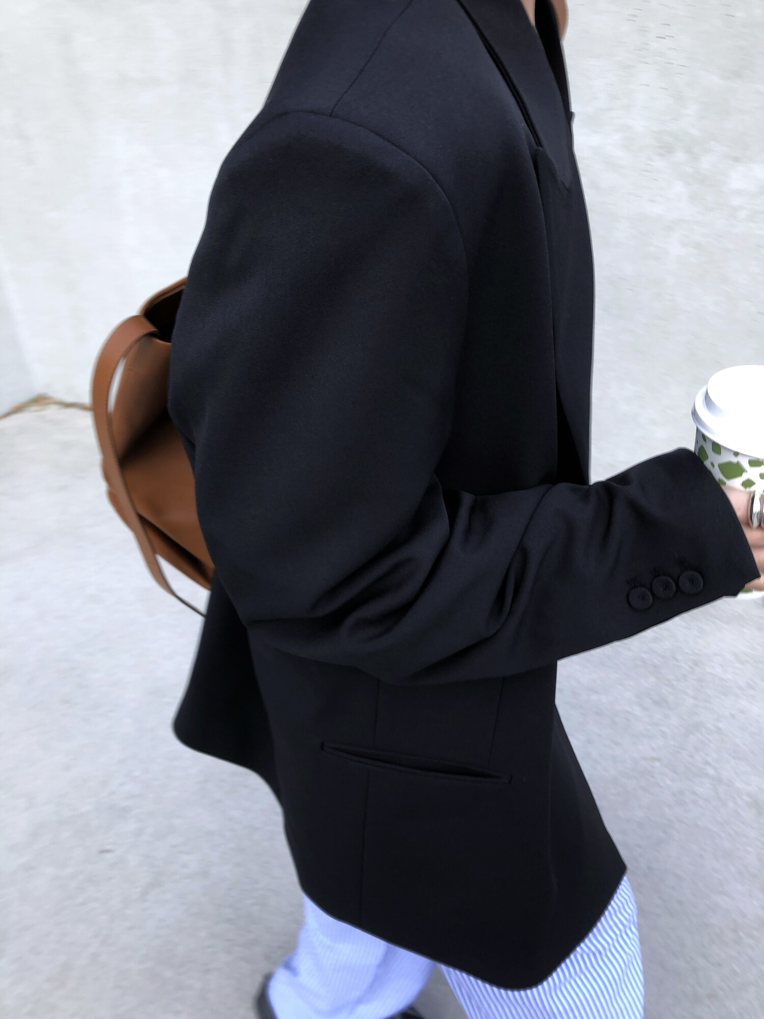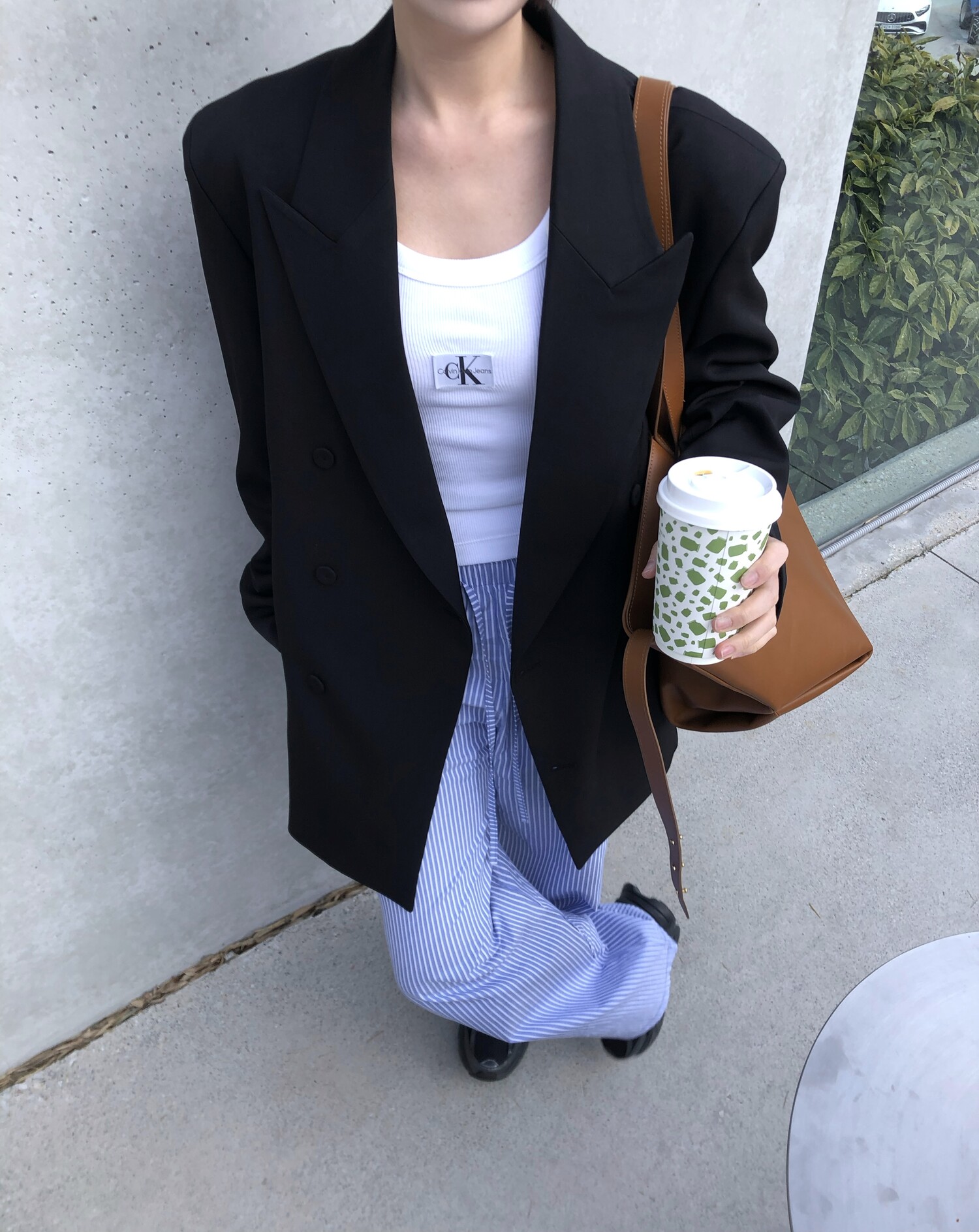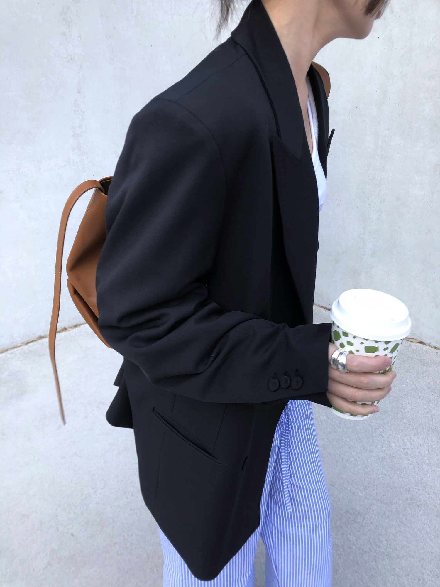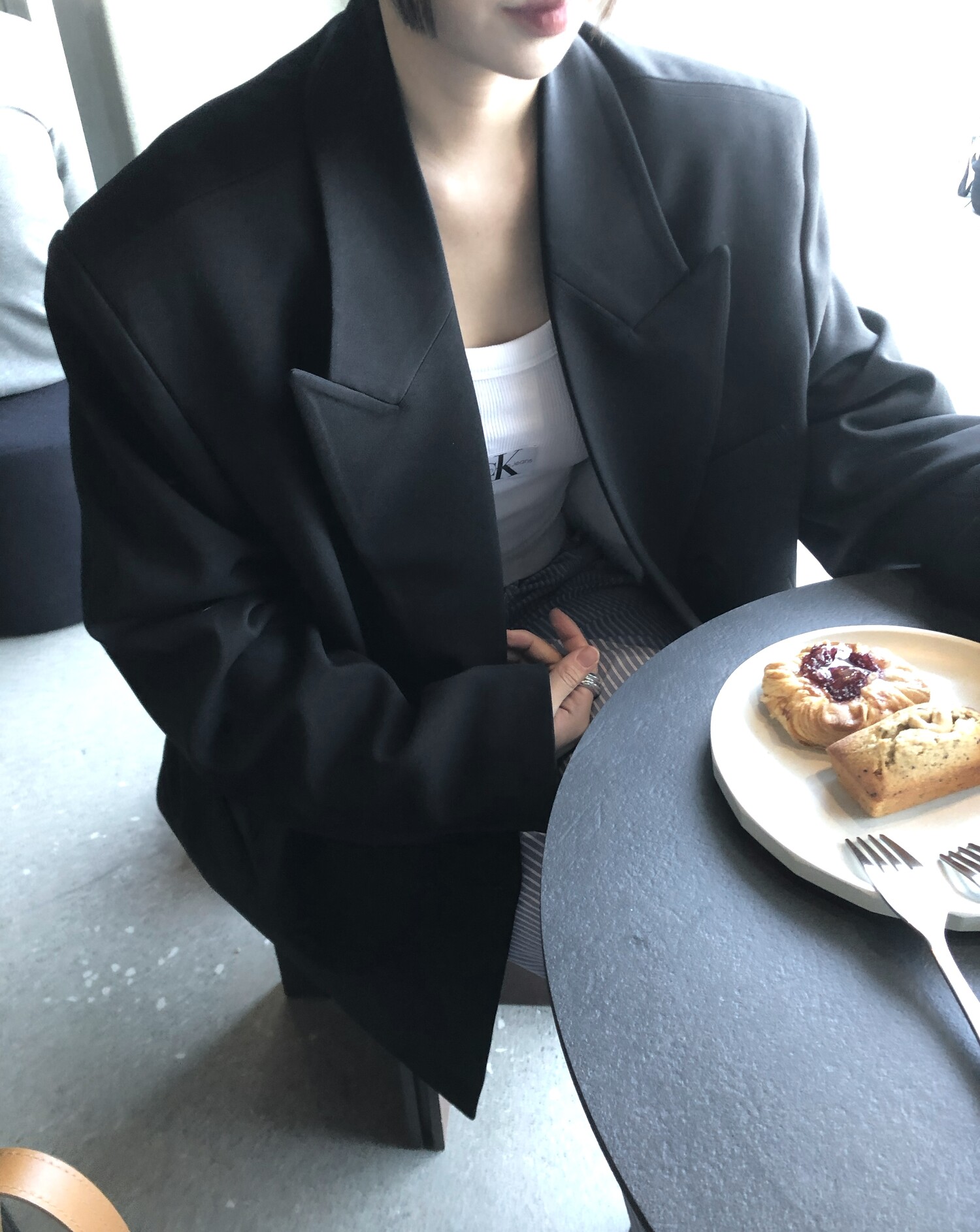고급스런 테일러 라인의 유니섹스 오버핏 자켓이에요, 우선 길게 떨어지면서도 시크한 카라와 오버핏에 반했구요, 55기준 조금 크지만 큰 맛대로 딱 이쁘고 너무나 멋들어지는 자켓이에요, (44분께는 전체적으로 너무 클거 같아 비추드립니다.) 보이프렌핏으로 입기좋으며, 시크한 무드의 쓰리버튼으로 적당히 긴 기장까지 정말 보기힘든 고급스런 라인입니다ㅜㅜ (가격대는 또 얼마나 합리적이구요,,) 팬츠와도 찰떡이지만 롱새틴 스커트나 원피스와도 매우 잘 어울린답니다. 특별한 날 입기에도 너무 좋구요, 매트하면서도 구김성 적은 원단과 고급스런 버튼, 오버한 숄더라인에서 툭 떨어지는 핏까지 너무나 제 스타일입니다,,요런 자켓에 프렌치한 감성의 흰나시와 파자마스런 위트있는 스트라이프 팬츠, 무심한 듯 툭 걸친 빅 숄더백..꼭 입어보고 싶었던 룩이기도 하구요, 그냥 메종메츄어의 취향가득 담은 룩이에요,,! 프렌치한 감성의 오버핏 자켓 찾으신다면 무조건 이거요,,,적극 추천드립니다.