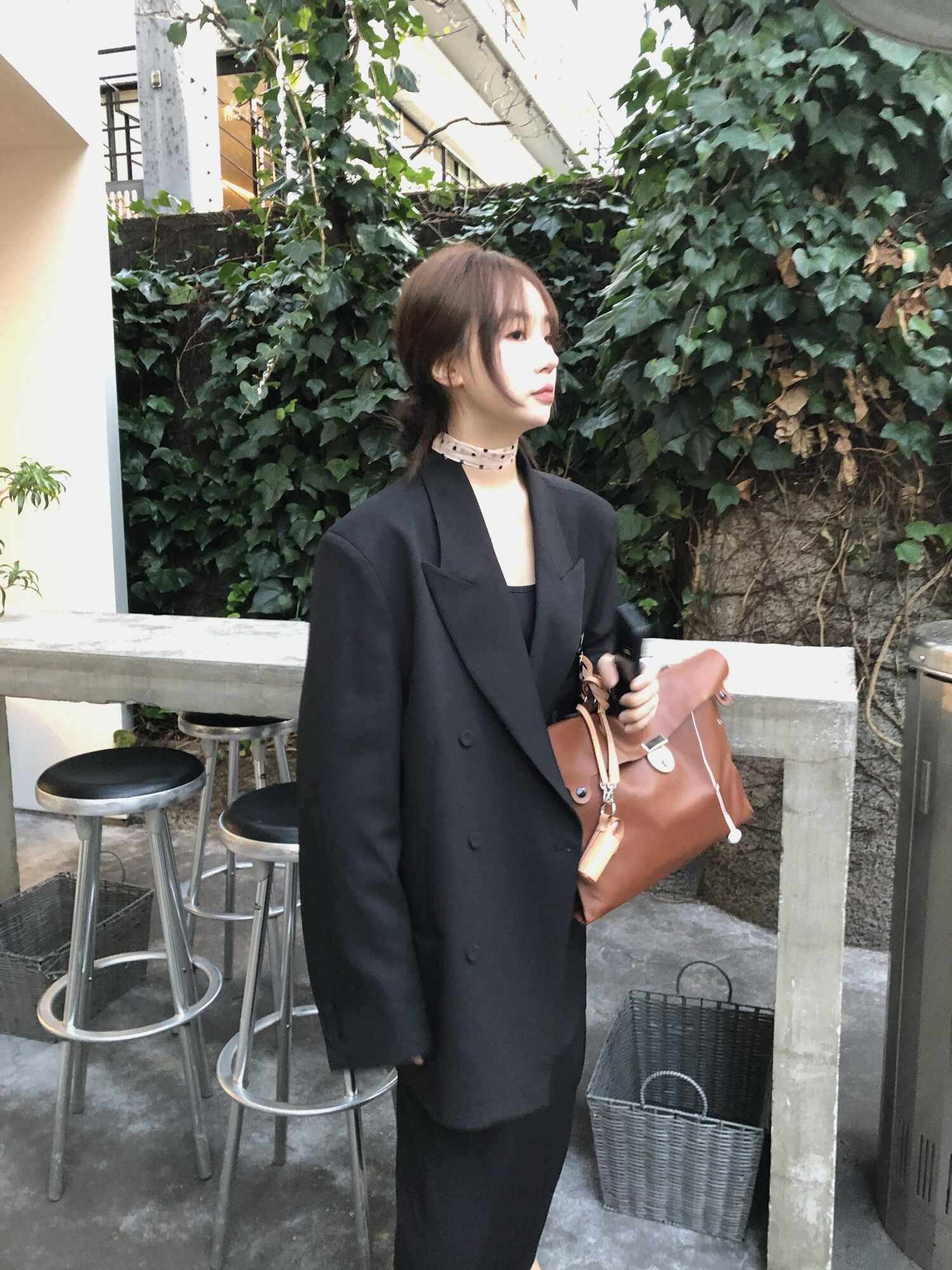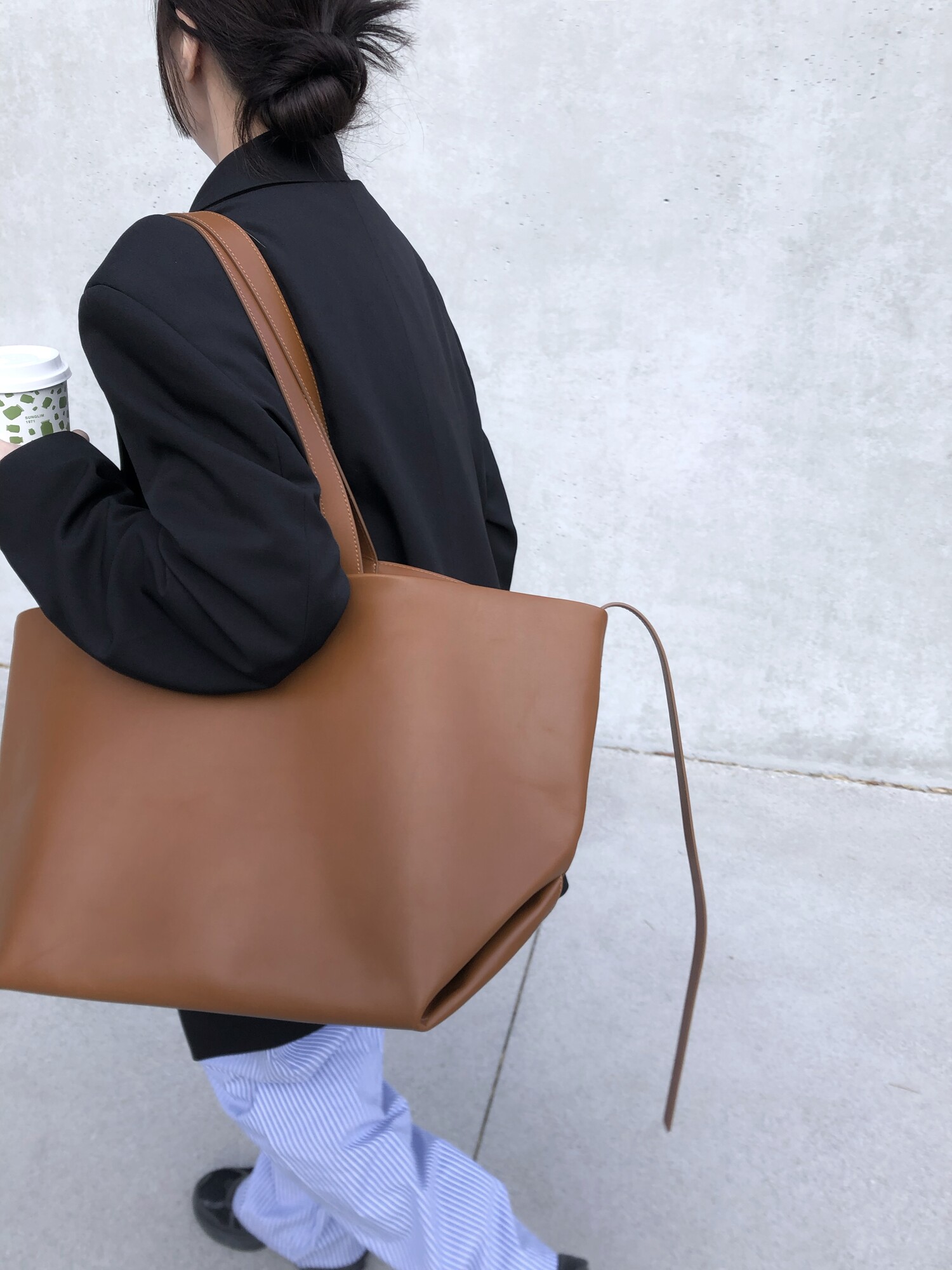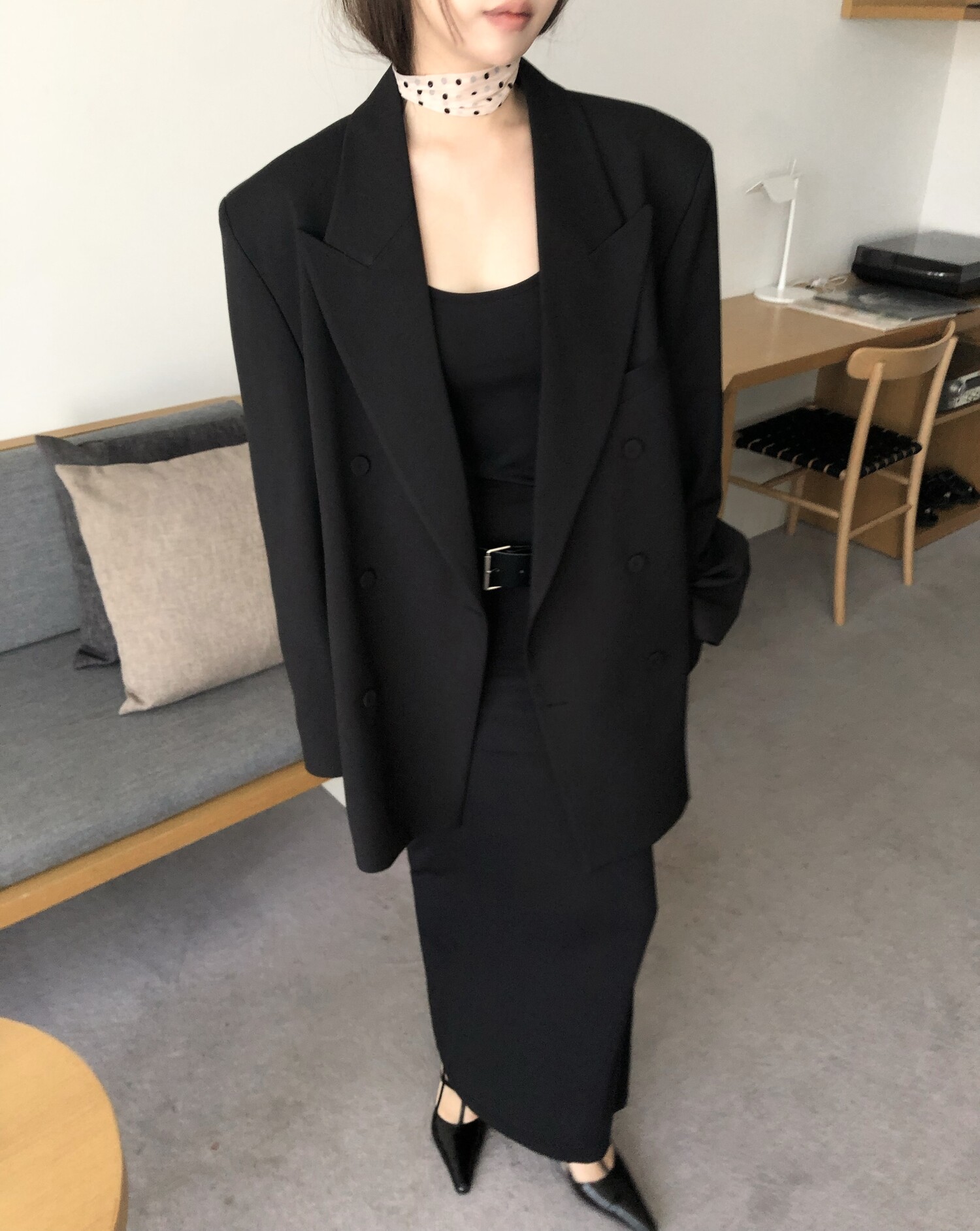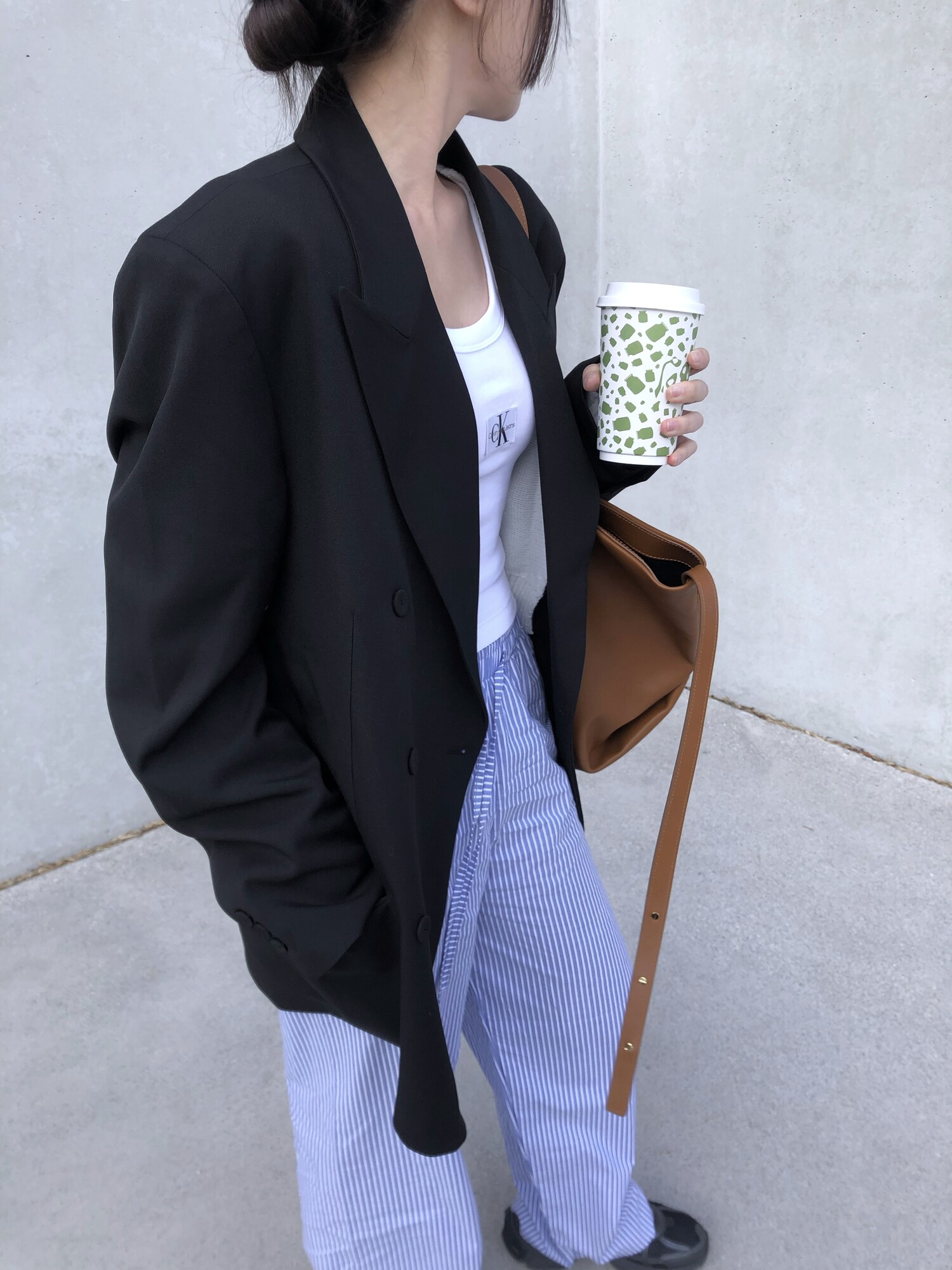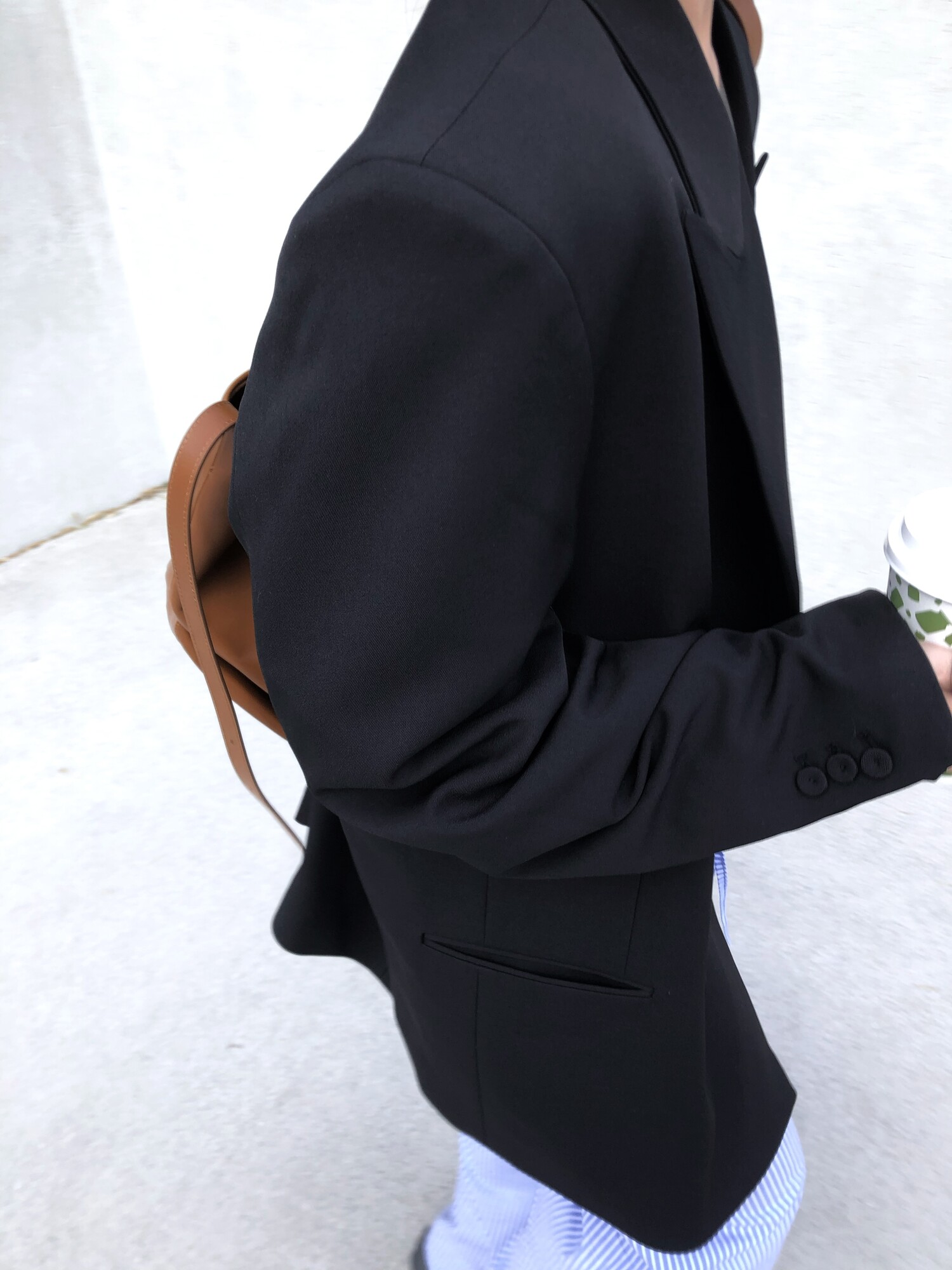 고급스런 테일러 라인의 유니섹스 오버핏 자켓이에요, 우선 길게 떨어지면서도 시크한 카라와 오버핏에 반했구요, 55기준 조금 크지만 큰 맛대로 딱 이쁘고 너무나 멋들어지는 자켓이에요, (44분께는 전체적으로 너무 클거 같아 비추드립니다.) 보이프렌핏으로 입기좋으며, 시크한 무드의 쓰리버튼으로 적당히 긴 기장까지 정말 보기힘든 고급스런 라인입니다ㅜㅜ (가격대는 또 얼마나 합리적이구요,,) 팬츠와도 찰떡이지만 롱새틴 스커트나 원피스와도 매우 잘 어울린답니다. 특별한 날 입기에도 너무 좋구요, 매트하면서도 구김성 적은 원단과 고급스런 버튼, 오버한 숄더라인에서 툭 떨어지는 핏까지 너무나 제 스타일입니다,,요런 자켓에 프렌치한 감성의 흰나시와 파자마스런 위트있는 스트라이프 팬츠, 무심한 듯 툭 걸친 빅 숄더백..꼭 입어보고 싶었던 룩이기도 하구요, 그냥 메종메츄어의 취향가득 담은 룩이에요,,! 프렌치한 감성의 오버핏 자켓 찾으신다면 무조건 이거요,,,적극 추천드립니다.