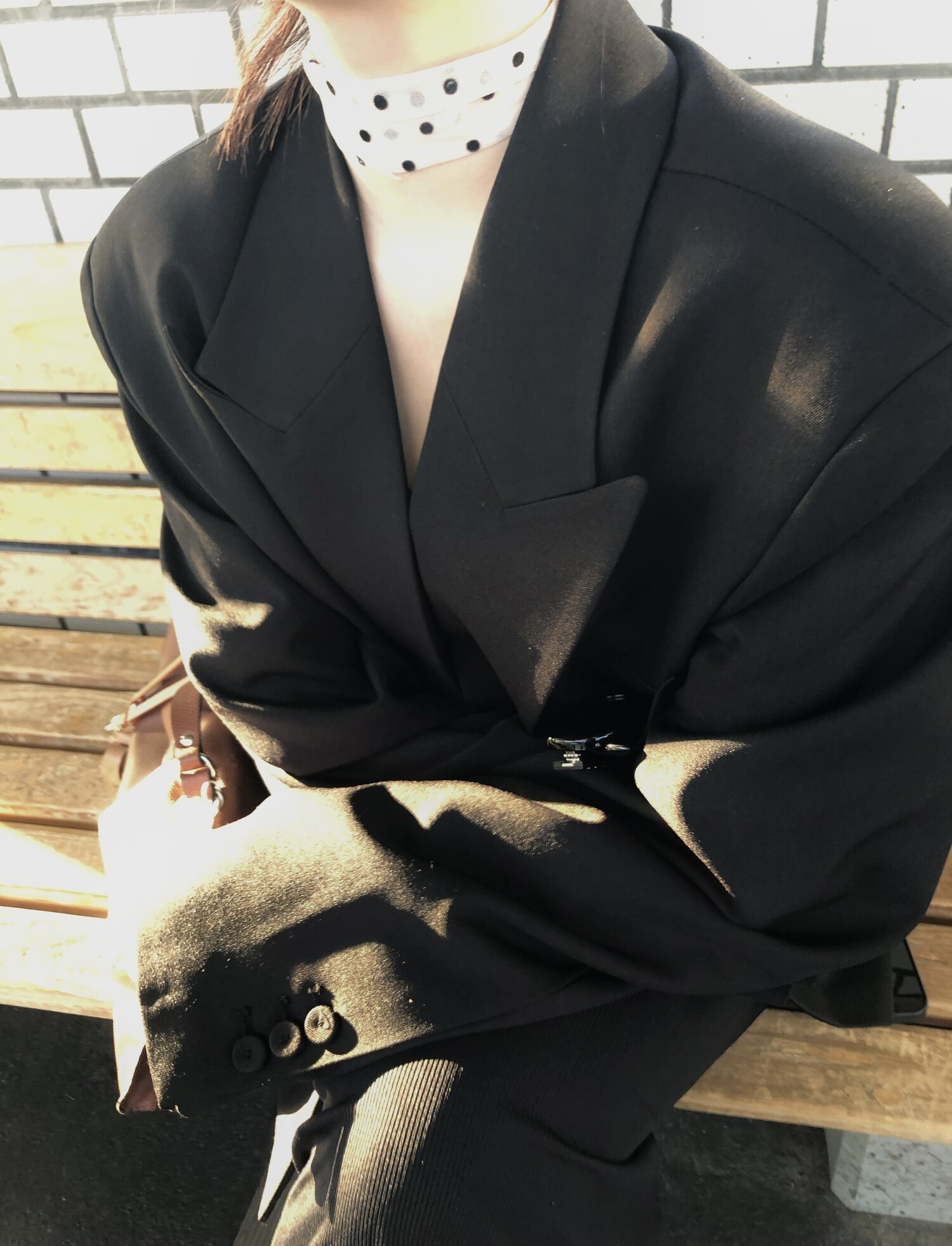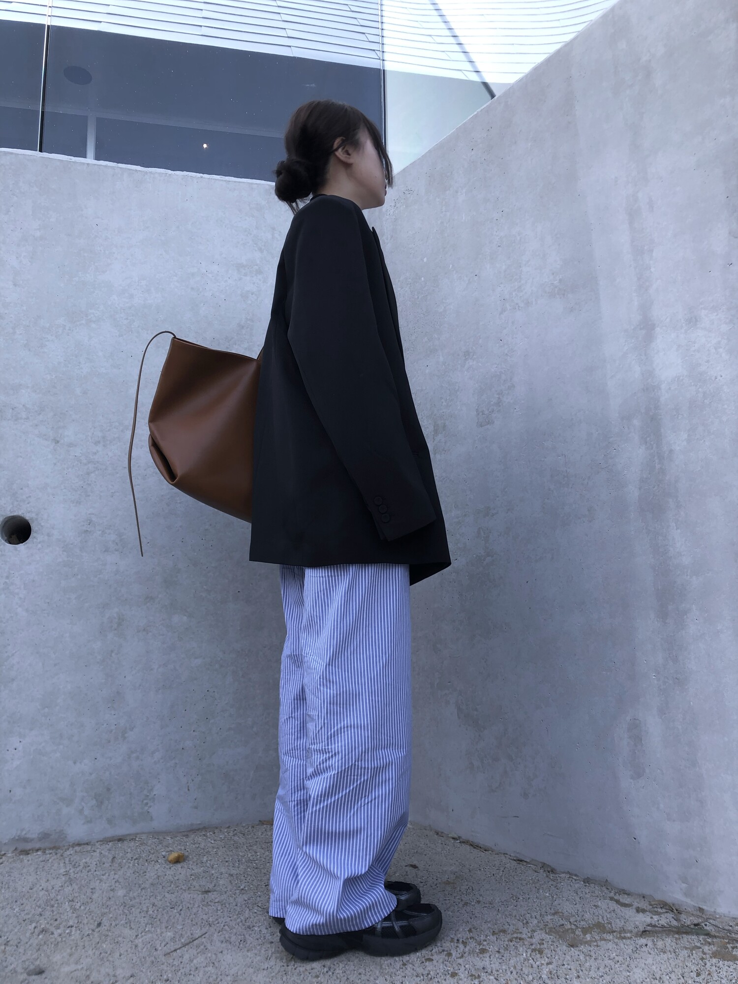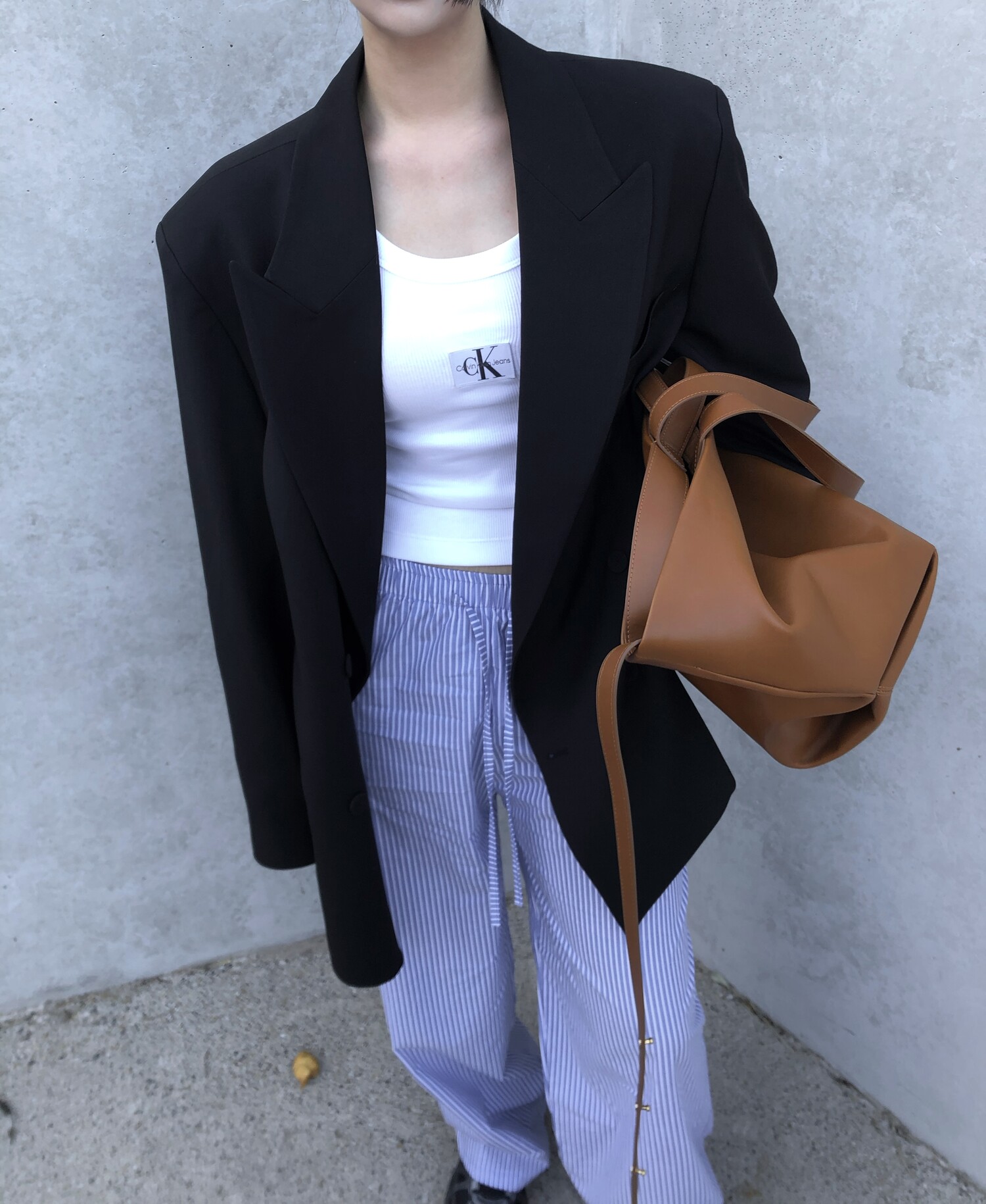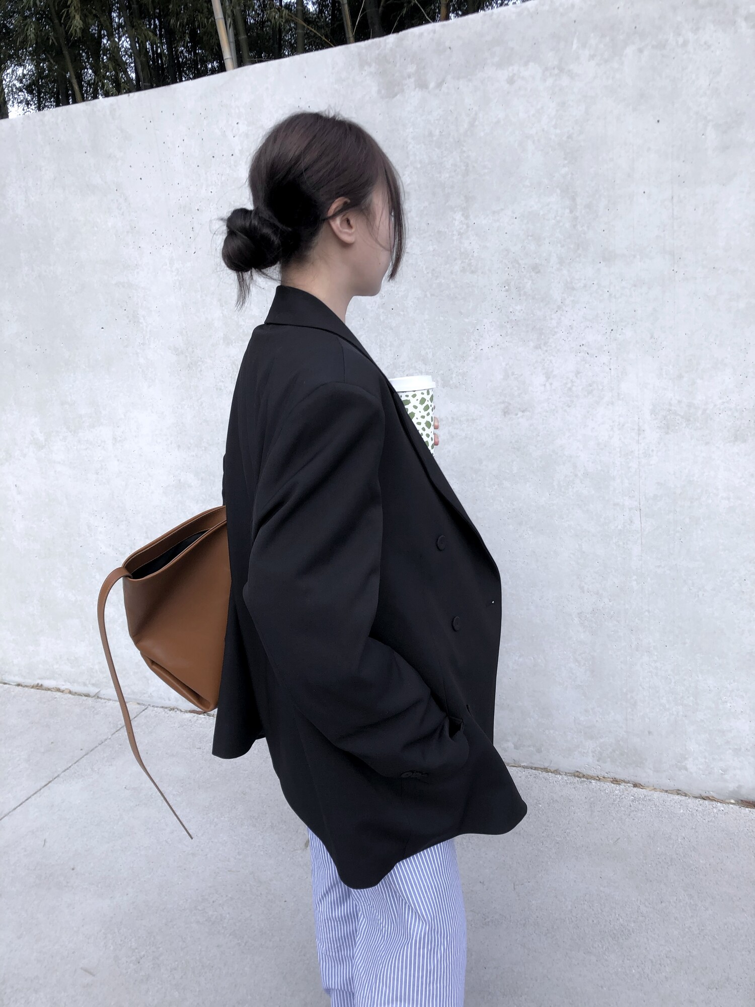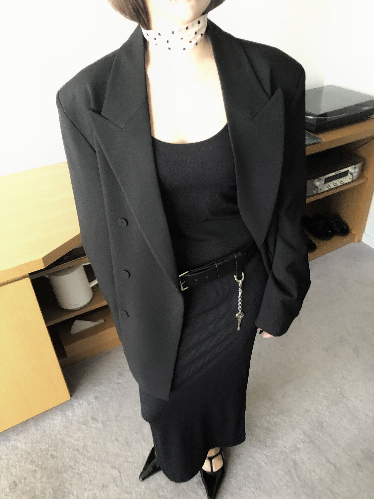 고급스런 테일러 라인의 유니섹스 오버핏 자켓이에요, 우선 길게 떨어지면서도 시크한 카라와 오버핏에 반했구요, 55기준 조금 크지만 큰 맛대로 딱 이쁘고 너무나 멋들어지는 자켓이에요, (44분께는 전체적으로 너무 클거 같아 비추드립니다.) 보이프렌핏으로 입기좋으며, 시크한 무드의 쓰리버튼으로 적당히 긴 기장까지 정말 보기힘든 고급스런 라인입니다ㅜㅜ (가격대는 또 얼마나 합리적이구요,,) 팬츠와도 찰떡이지만 롱새틴 스커트나 원피스와도 매우 잘 어울린답니다. 특별한 날 입기에도 너무 좋구요, 매트하면서도 구김성 적은 원단과 고급스런 버튼, 오버한 숄더라인에서 툭 떨어지는 핏까지 너무나 제 스타일입니다,,요런 자켓에 프렌치한 감성의 흰나시와 파자마스런 위트있는 스트라이프 팬츠, 무심한 듯 툭 걸친 빅 숄더백..꼭 입어보고 싶었던 룩이기도 하구요, 그냥 메종메츄어의 취향가득 담은 룩이에요,,! 프렌치한 감성의 오버핏 자켓 찾으신다면 무조건 이거요,,,적극 추천드립니다.