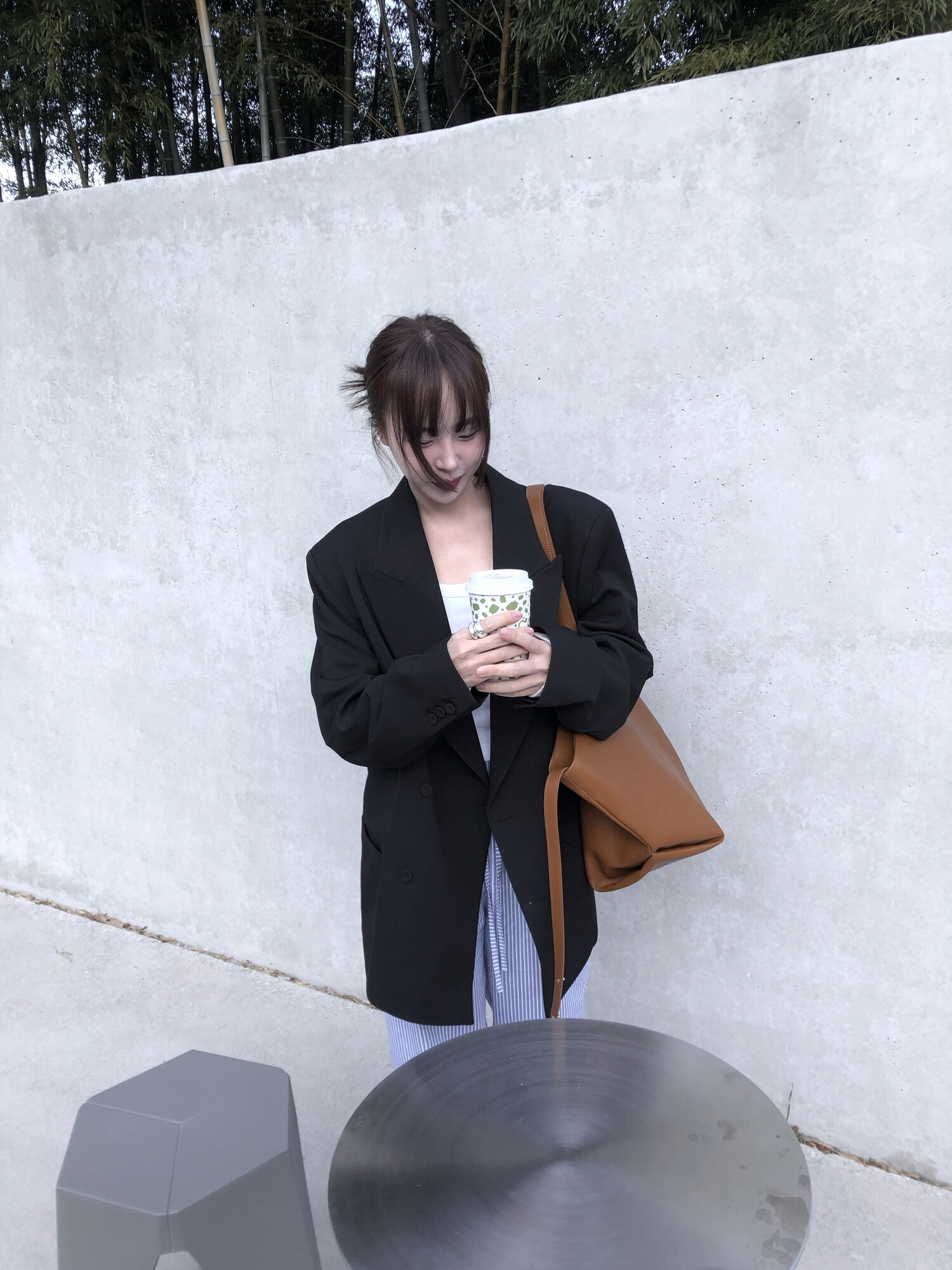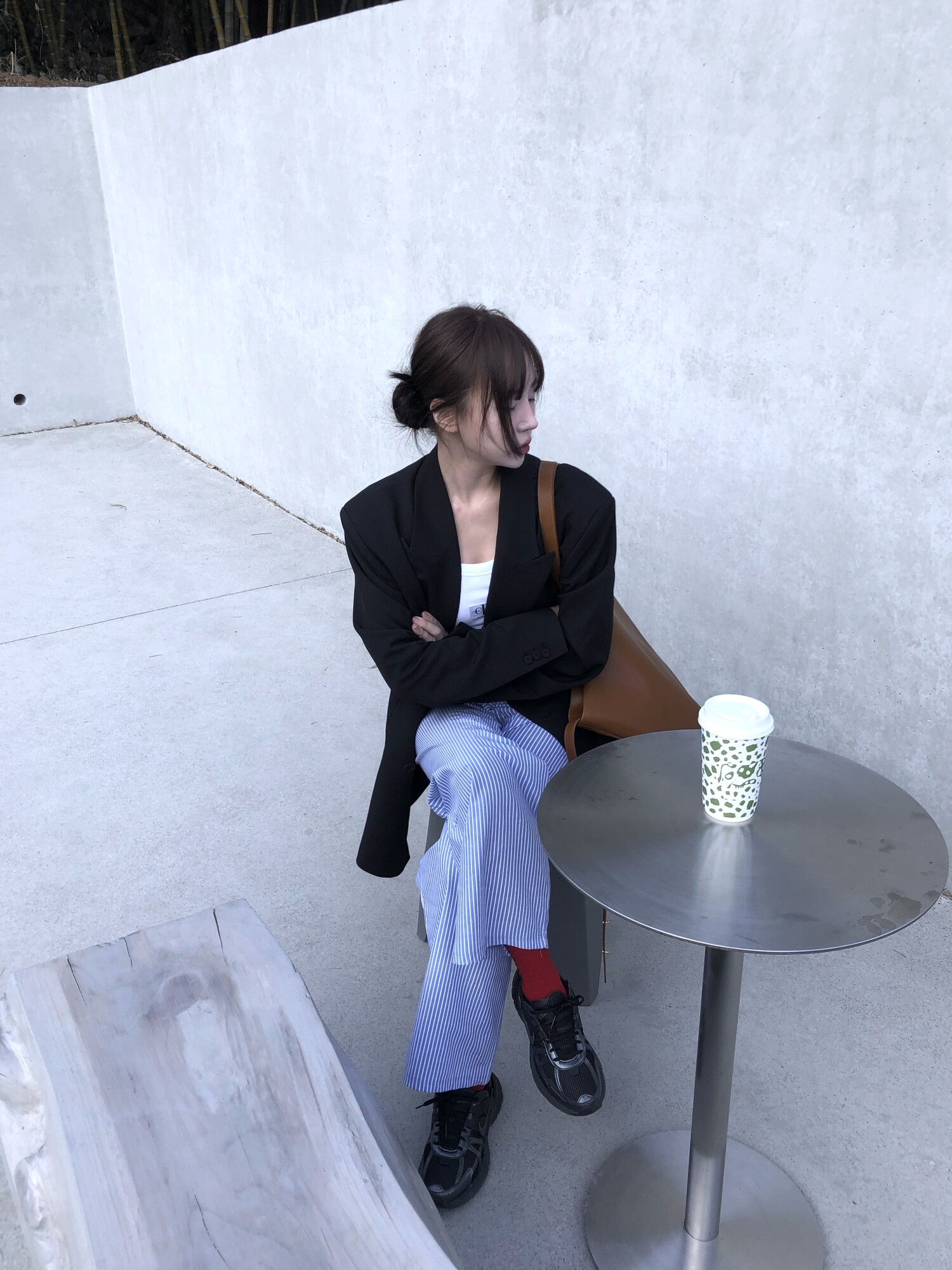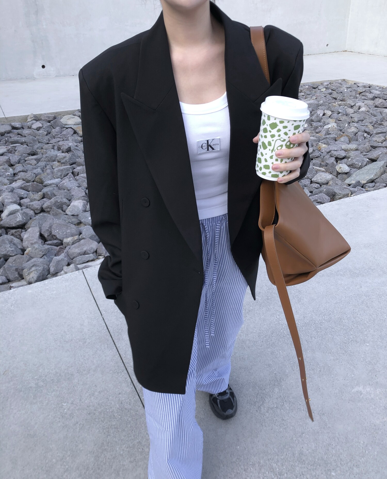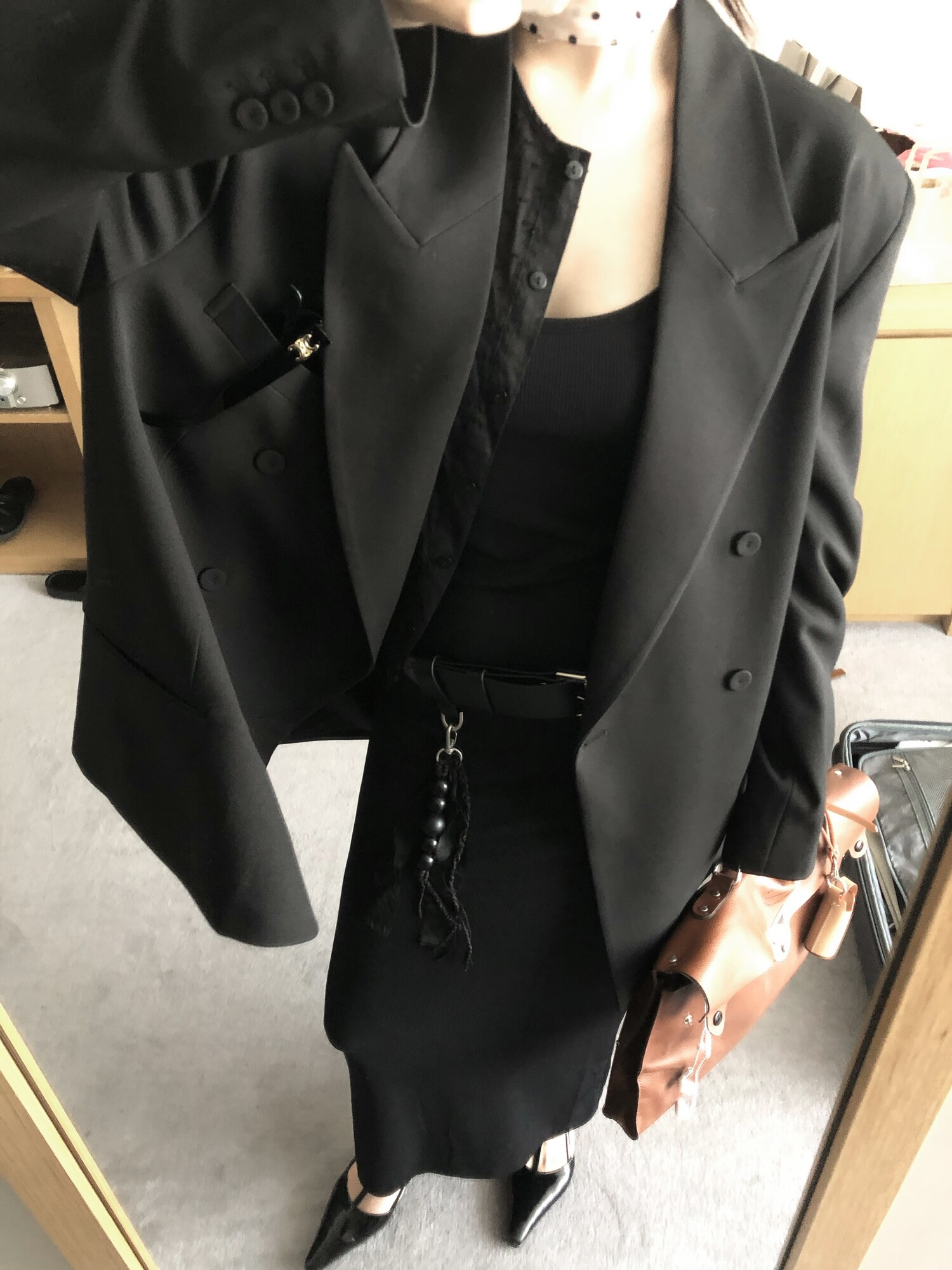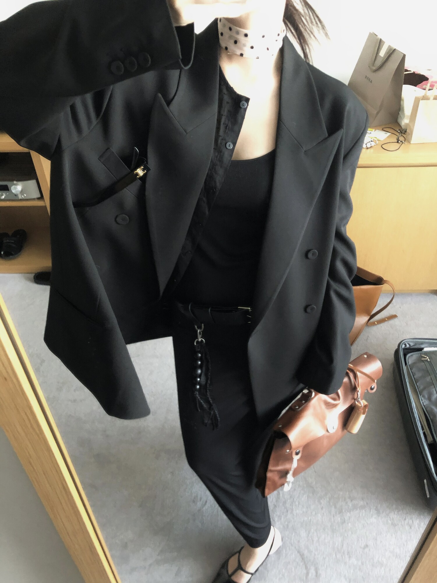 고급스런 테일러 라인의 유니섹스 오버핏 자켓이에요, 우선 길게 떨어지면서도 시크한 카라와 오버핏에 반했구요, 55기준 조금 크지만 큰 맛대로 딱 이쁘고 너무나 멋들어지는 자켓이에요, (44분께는 전체적으로 너무 클거 같아 비추드립니다.) 보이프렌핏으로 입기좋으며, 시크한 무드의 쓰리버튼으로 적당히 긴 기장까지 정말 보기힘든 고급스런 라인입니다ㅜㅜ (가격대는 또 얼마나 합리적이구요,,) 팬츠와도 찰떡이지만 롱새틴 스커트나 원피스와도 매우 잘 어울린답니다. 특별한 날 입기에도 너무 좋구요, 매트하면서도 구김성 적은 원단과 고급스런 버튼, 오버한 숄더라인에서 툭 떨어지는 핏까지 너무나 제 스타일입니다,,요런 자켓에 프렌치한 감성의 흰나시와 파자마스런 위트있는 스트라이프 팬츠, 무심한 듯 툭 걸친 빅 숄더백..꼭 입어보고 싶었던 룩이기도 하구요, 그냥 메종메츄어의 취향가득 담은 룩이에요,,! 프렌치한 감성의 오버핏 자켓 찾으신다면 무조건 이거요,,,적극 추천드립니다.