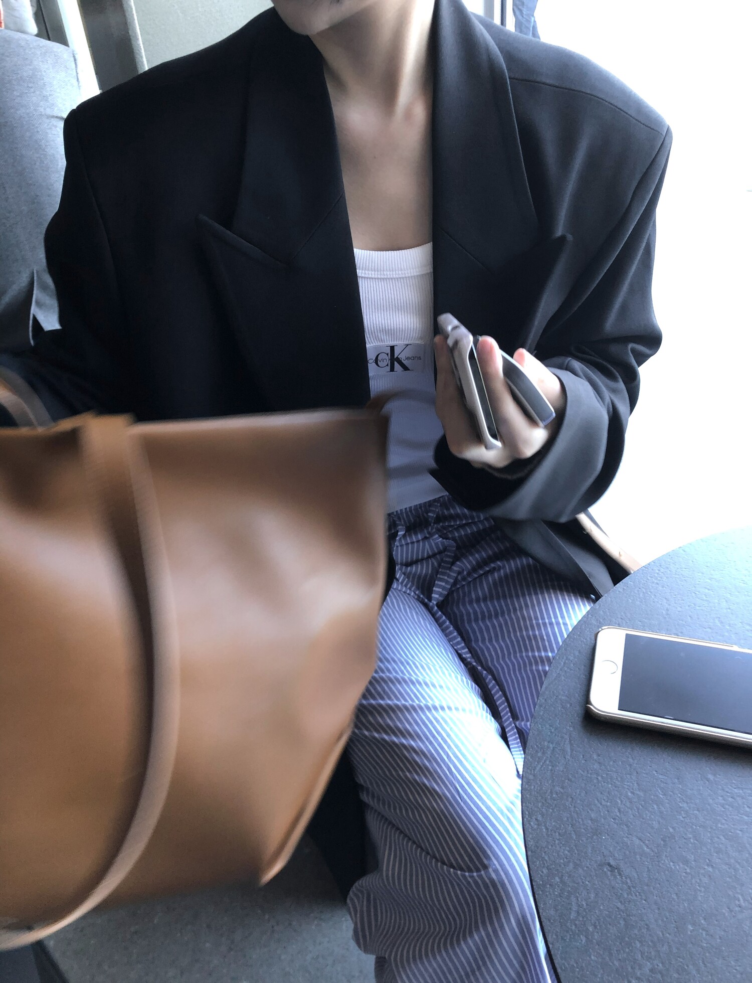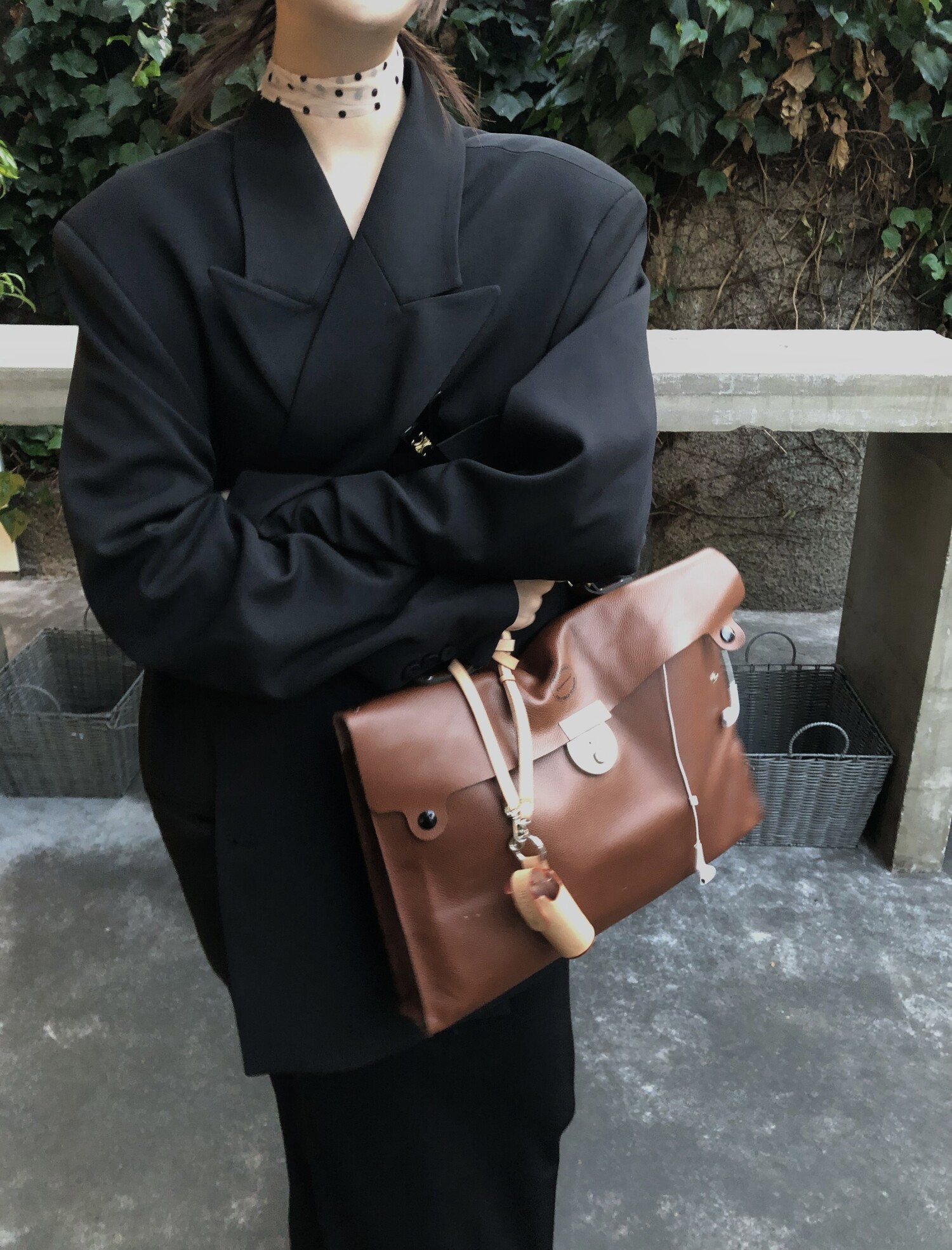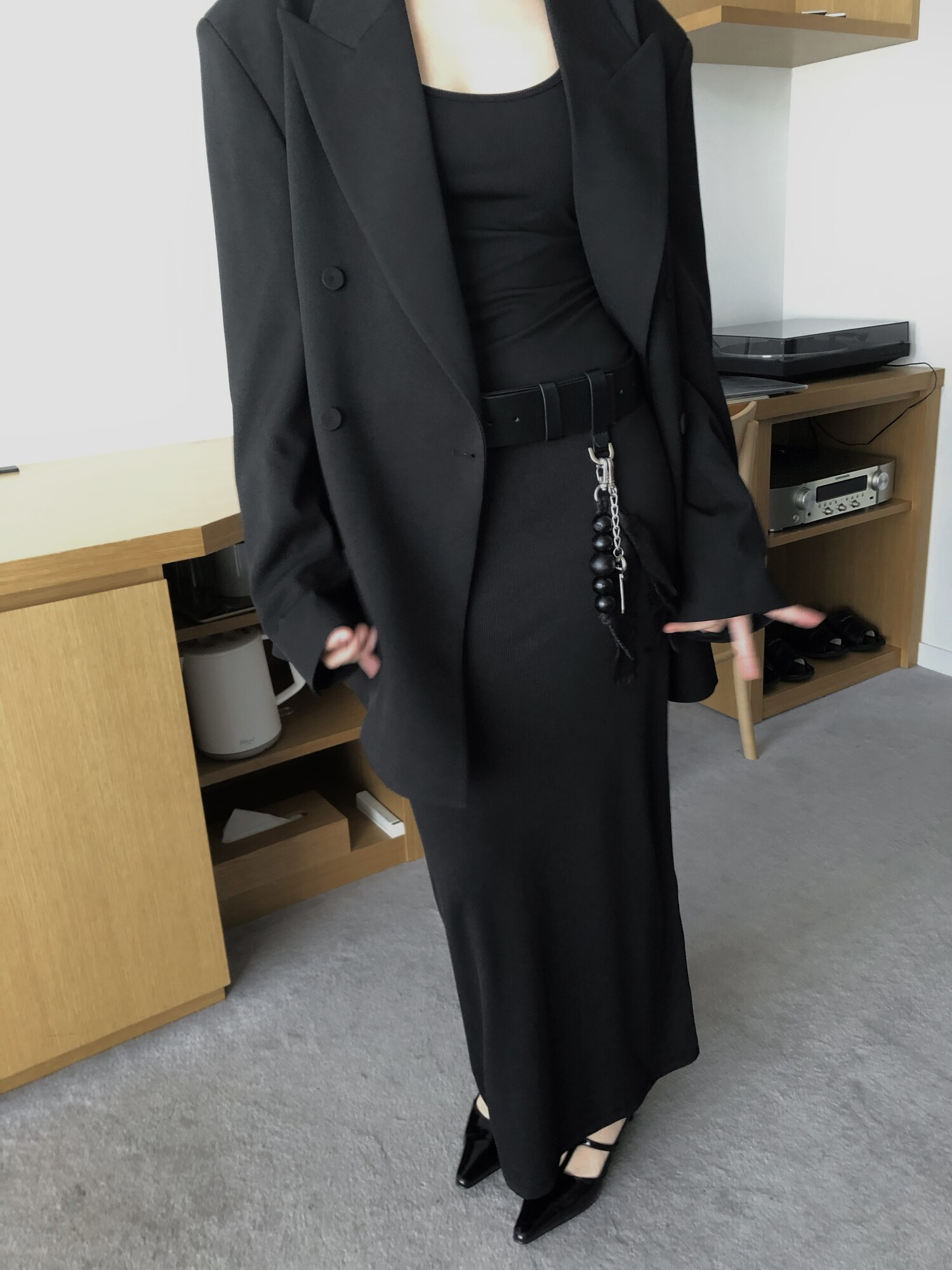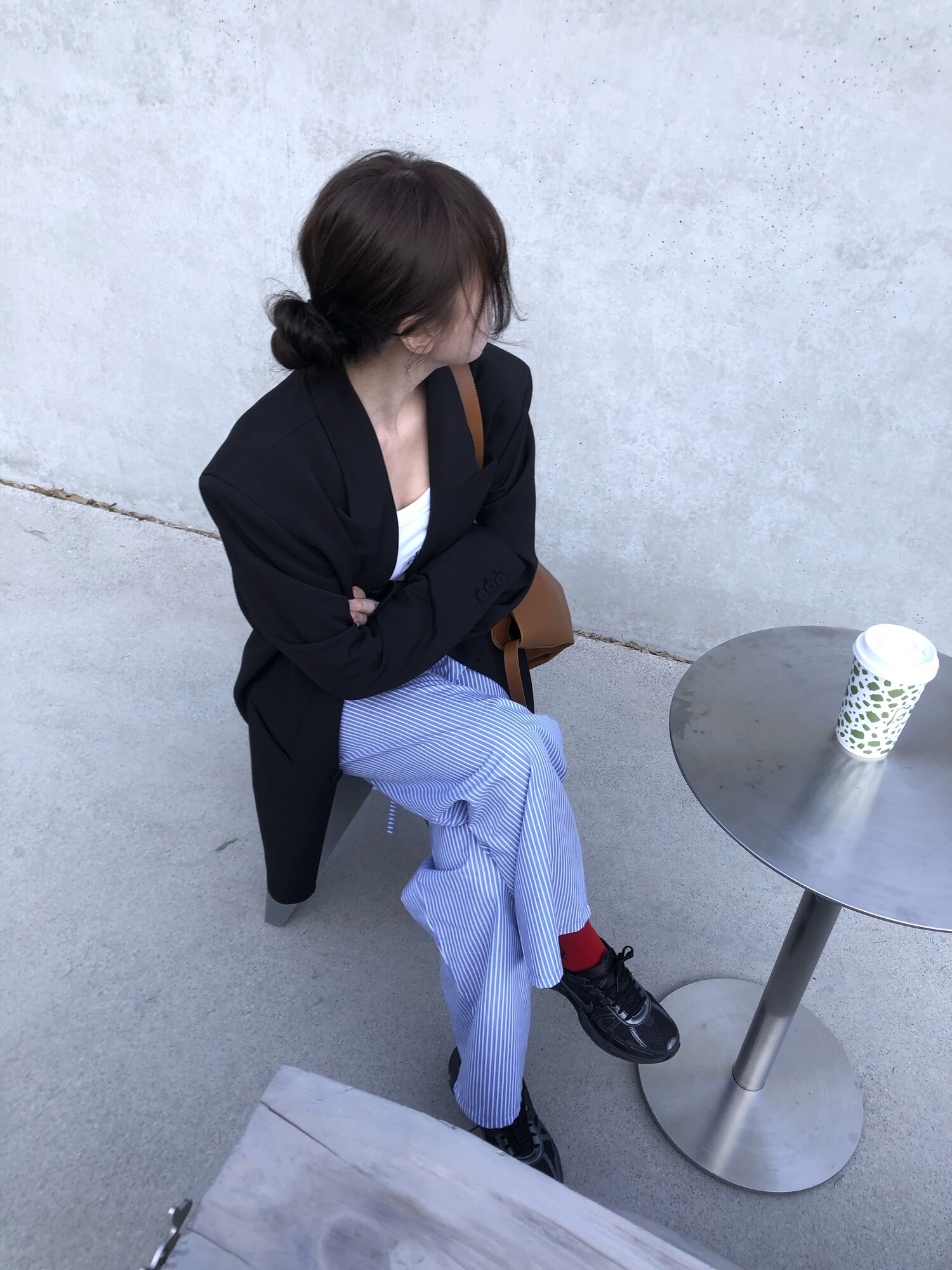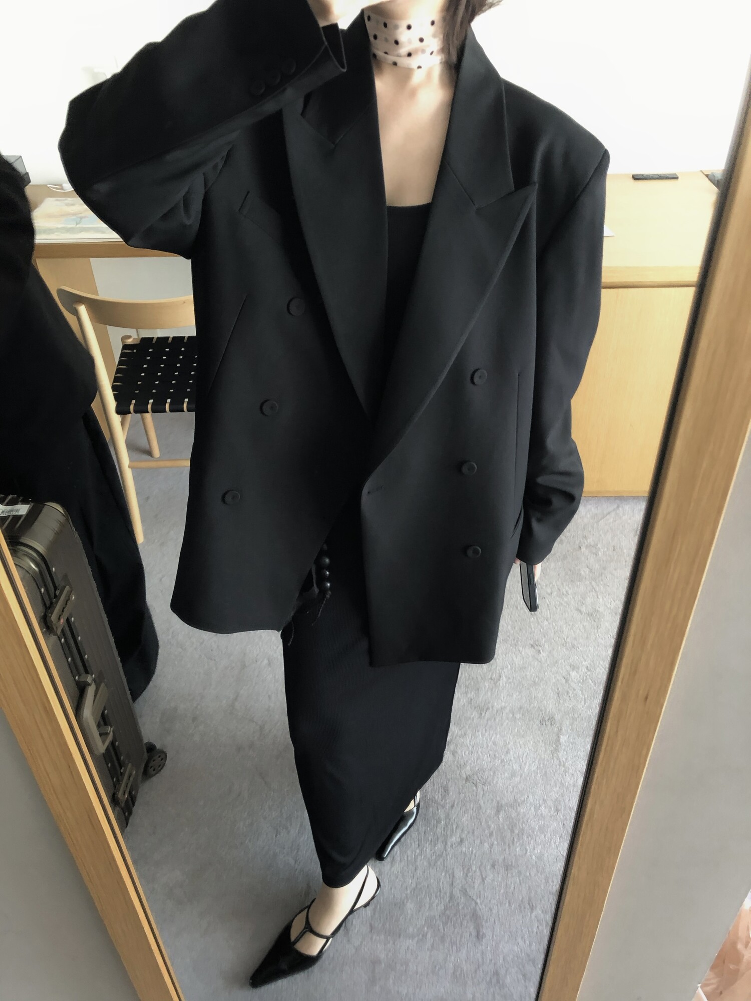 고급스런 테일러 라인의 유니섹스 오버핏 자켓이에요, 우선 길게 떨어지면서도 시크한 카라와 오버핏에 반했구요, 55기준 조금 크지만 큰 맛대로 딱 이쁘고 너무나 멋들어지는 자켓이에요, (44분께는 전체적으로 너무 클거 같아 비추드립니다.) 보이프렌핏으로 입기좋으며, 시크한 무드의 쓰리버튼으로 적당히 긴 기장까지 정말 보기힘든 고급스런 라인입니다ㅜㅜ (가격대는 또 얼마나 합리적이구요,,) 팬츠와도 찰떡이지만 롱새틴 스커트나 원피스와도 매우 잘 어울린답니다. 특별한 날 입기에도 너무 좋구요, 매트하면서도 구김성 적은 원단과 고급스런 버튼, 오버한 숄더라인에서 툭 떨어지는 핏까지 너무나 제 스타일입니다,,요런 자켓에 프렌치한 감성의 흰나시와 파자마스런 위트있는 스트라이프 팬츠, 무심한 듯 툭 걸친 빅 숄더백..꼭 입어보고 싶었던 룩이기도 하구요, 그냥 메종메츄어의 취향가득 담은 룩이에요,,! 프렌치한 감성의 오버핏 자켓 찾으신다면 무조건 이거요,,,적극 추천드립니다.