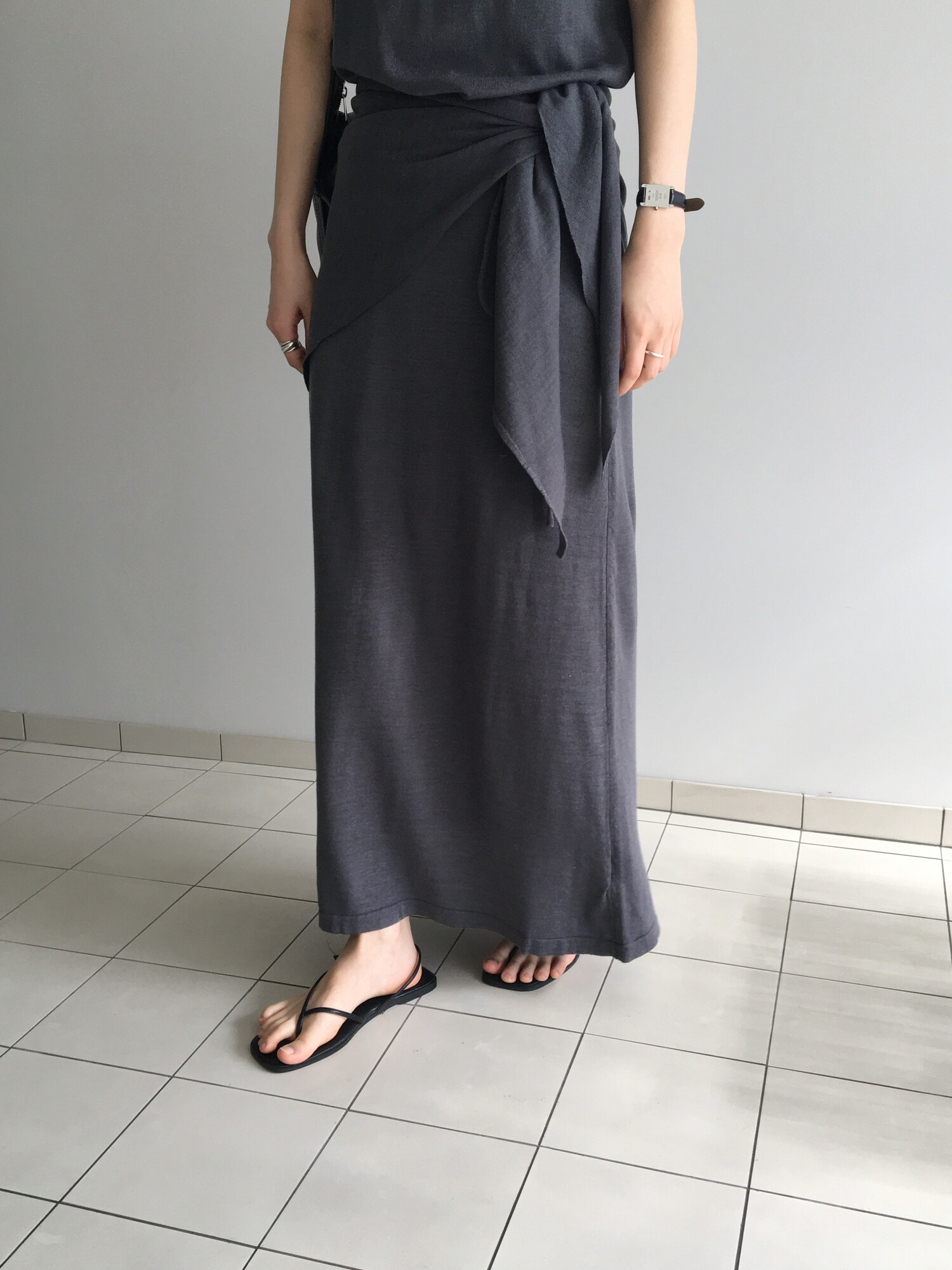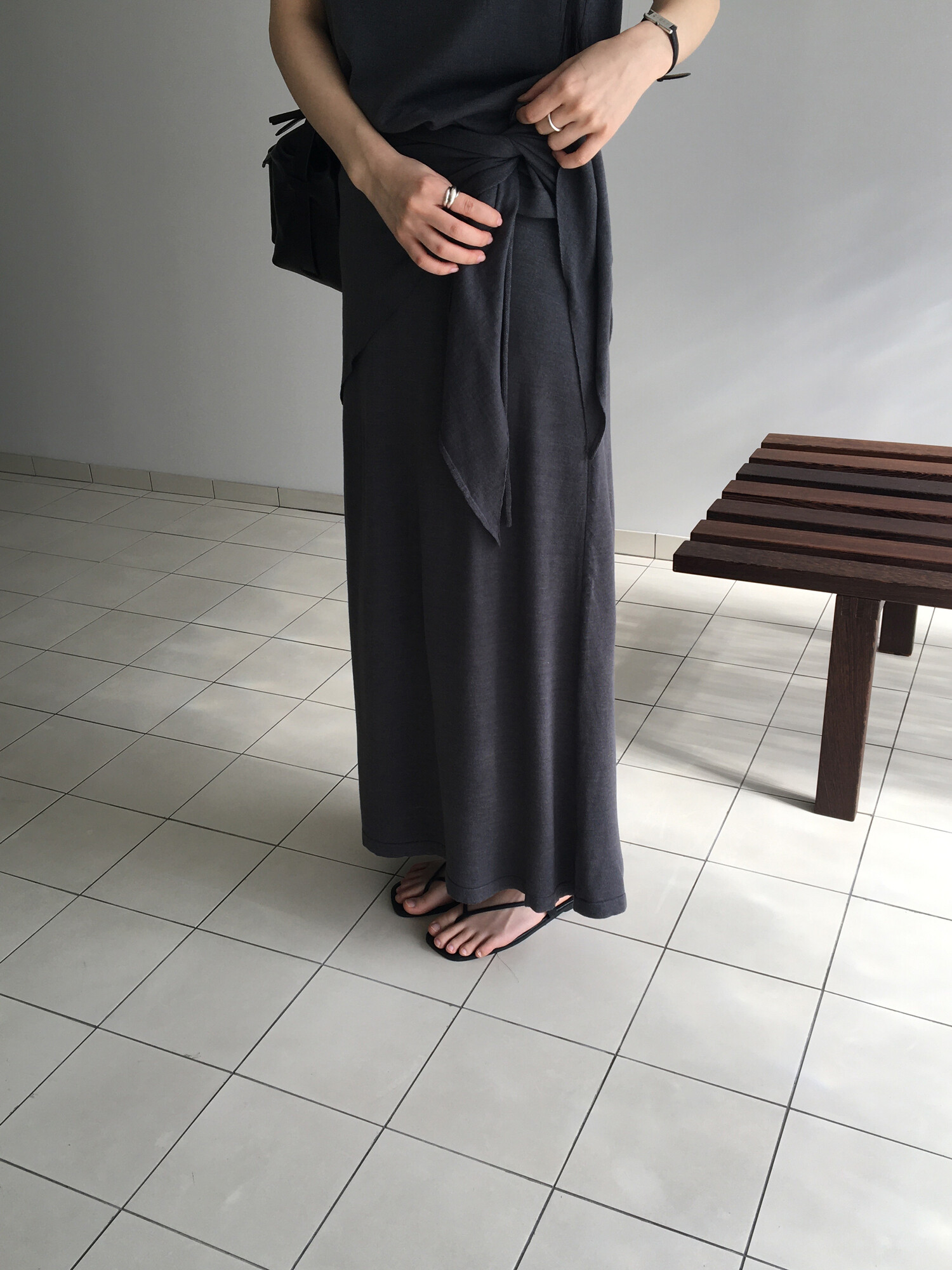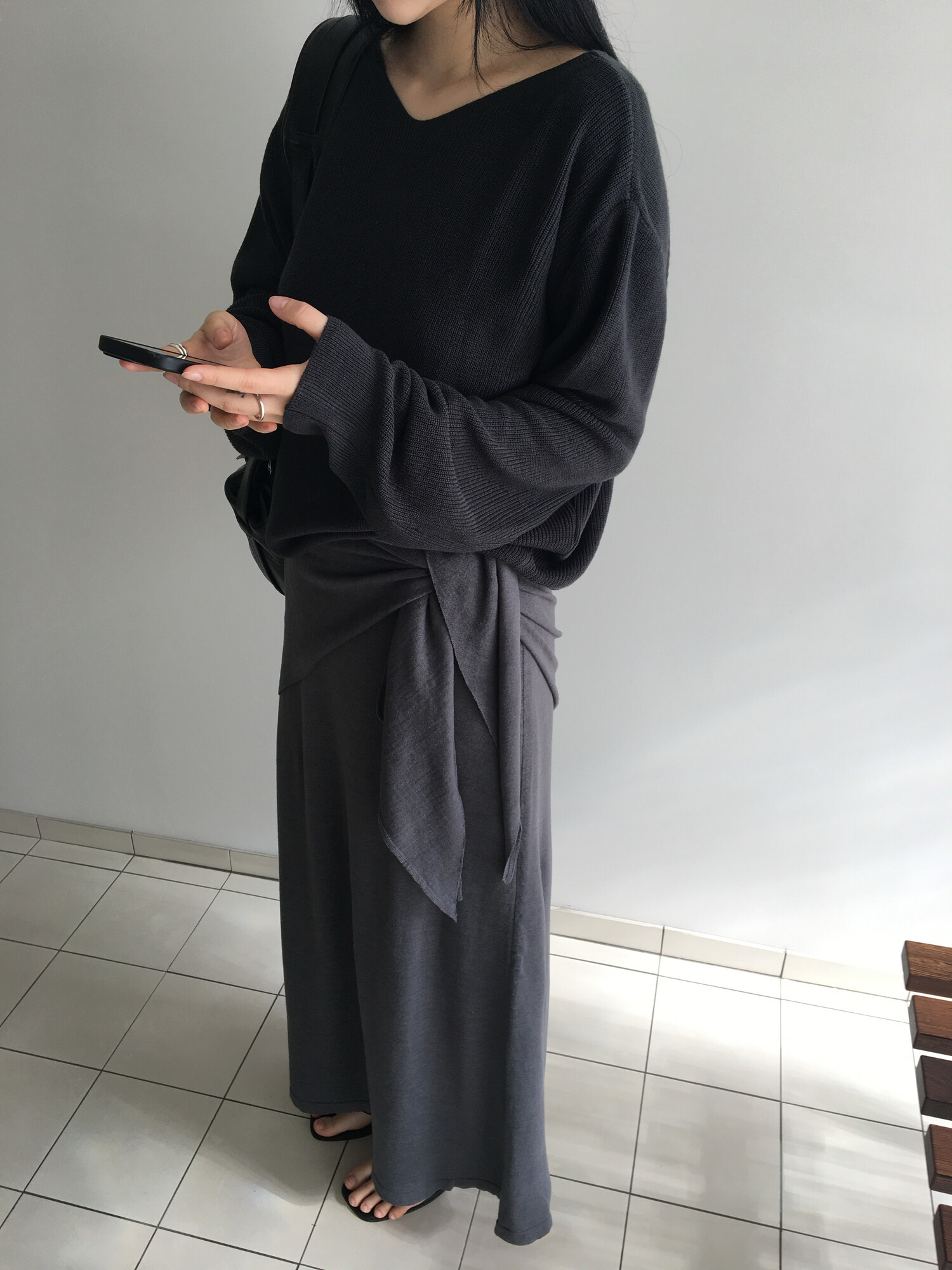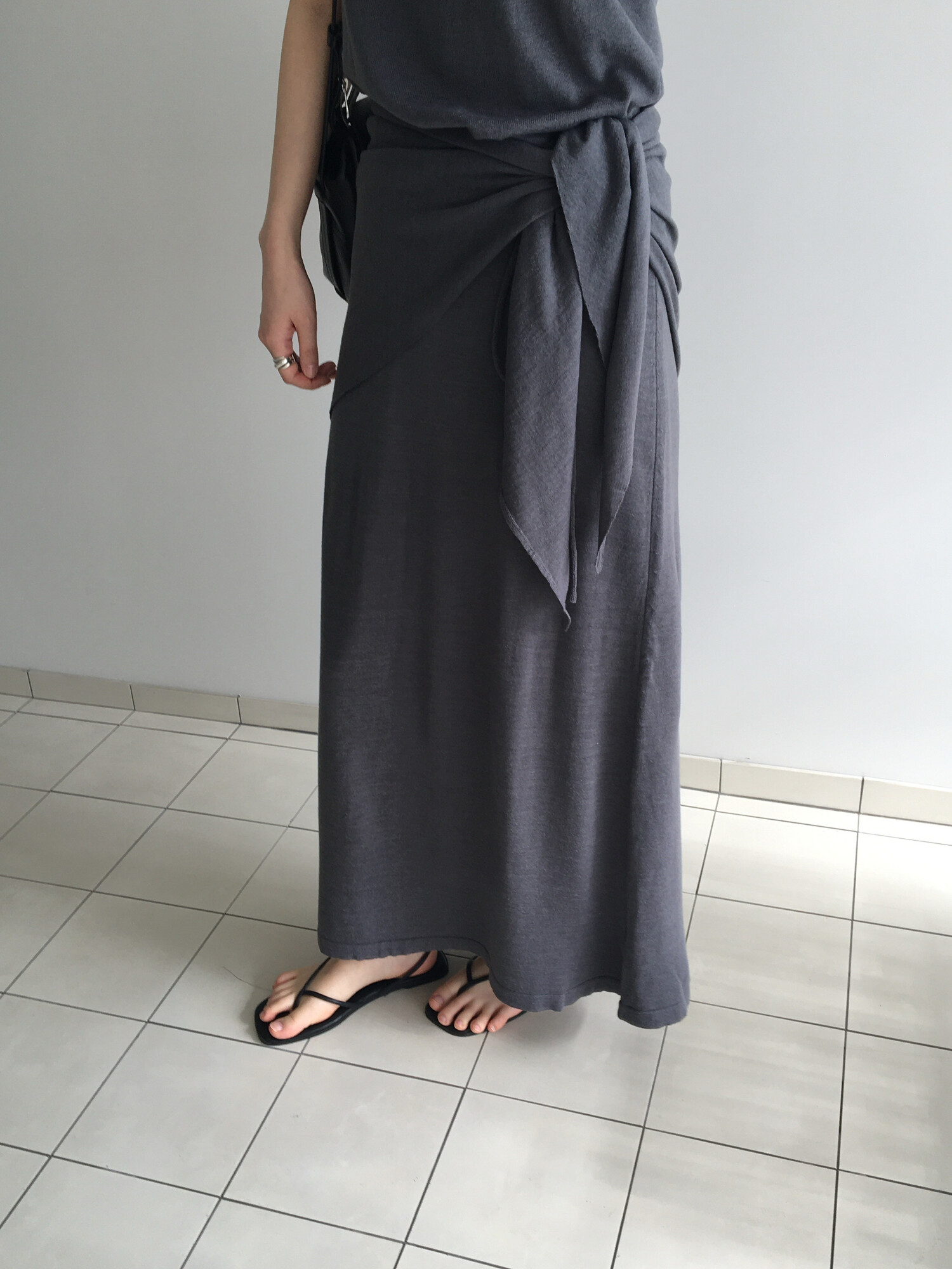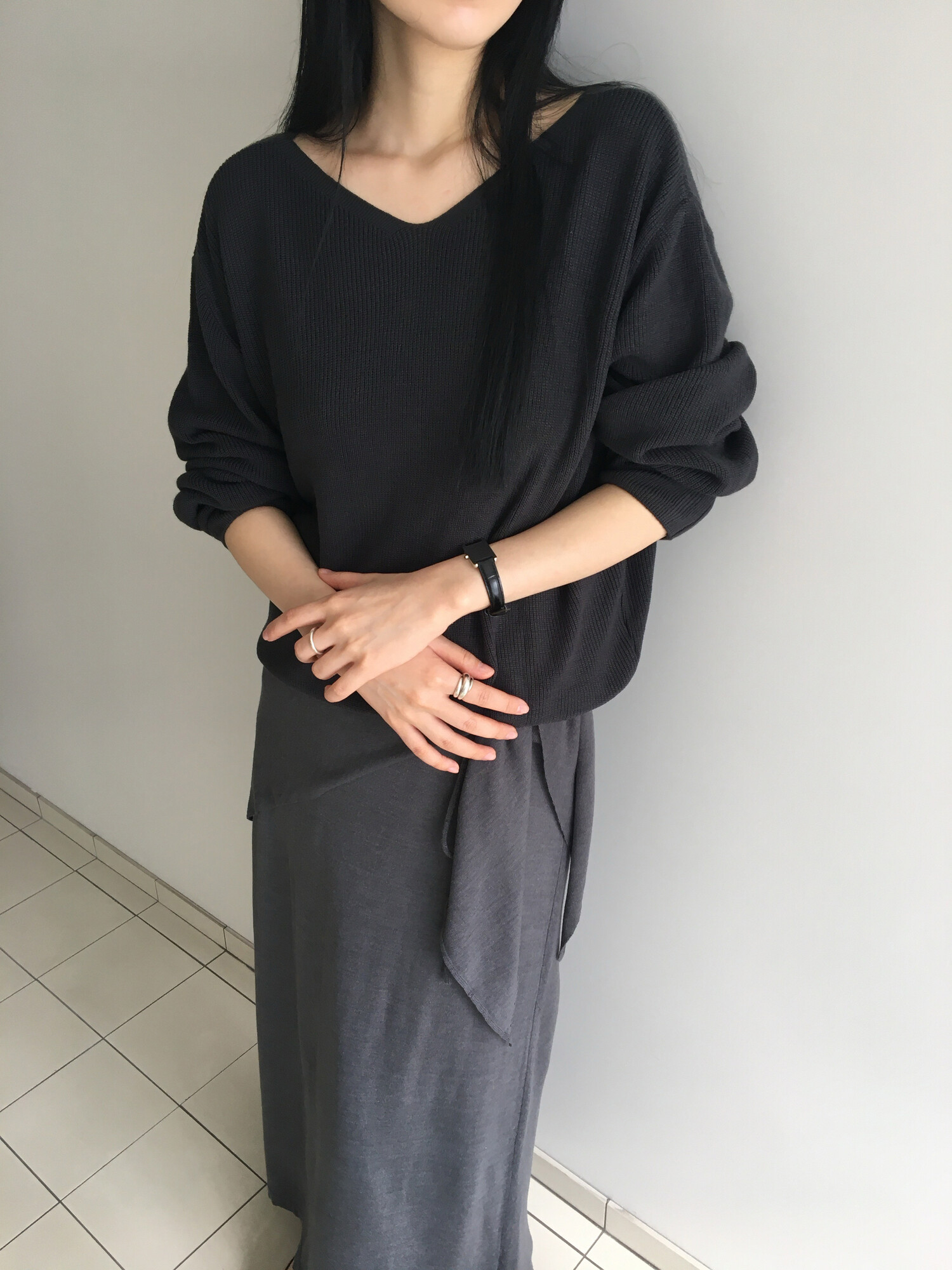 charcoal-허리에 둘러 연출된 스카프는 제품명 Crocus long knit scarf 이며 별도 구매바랍니다.