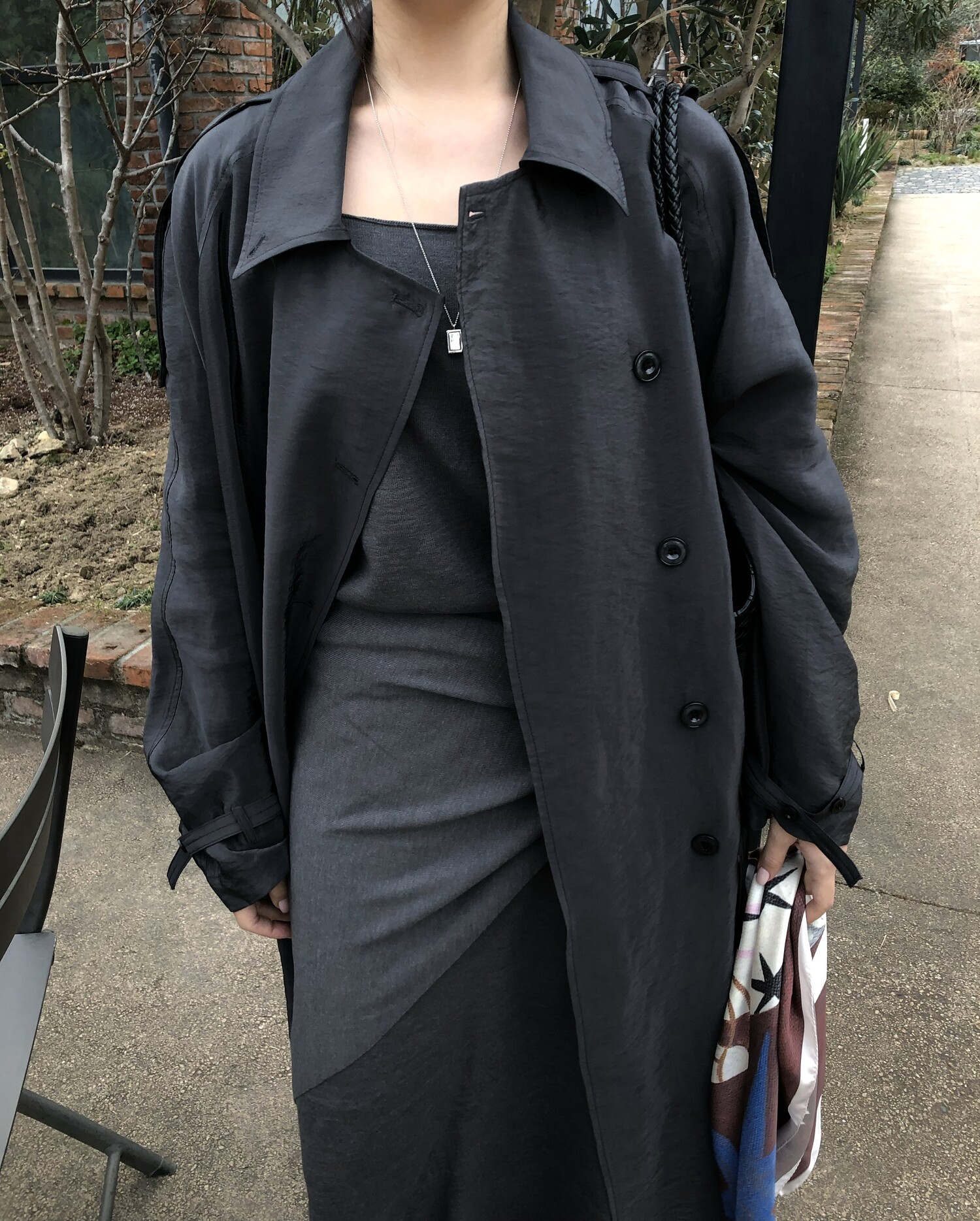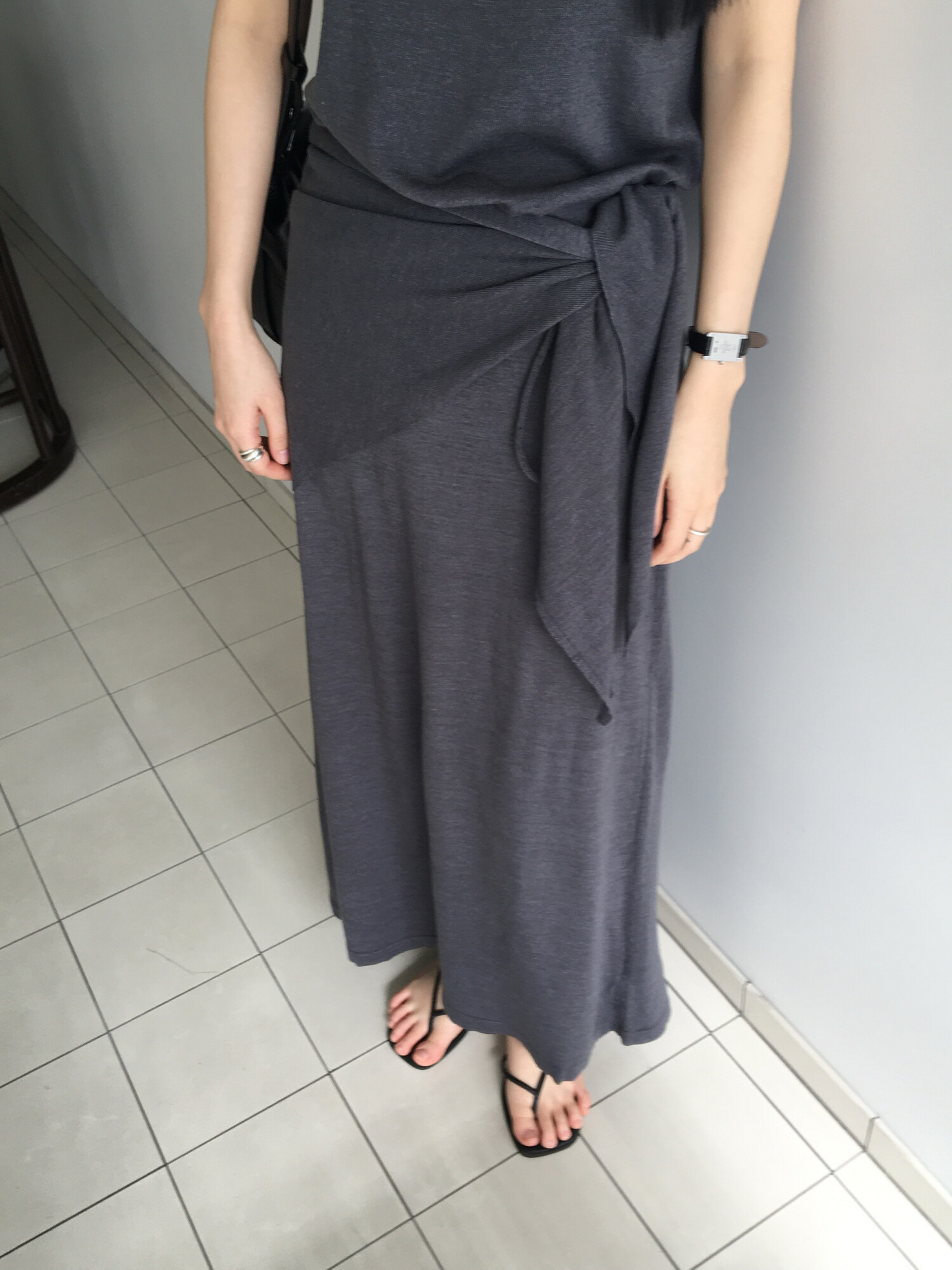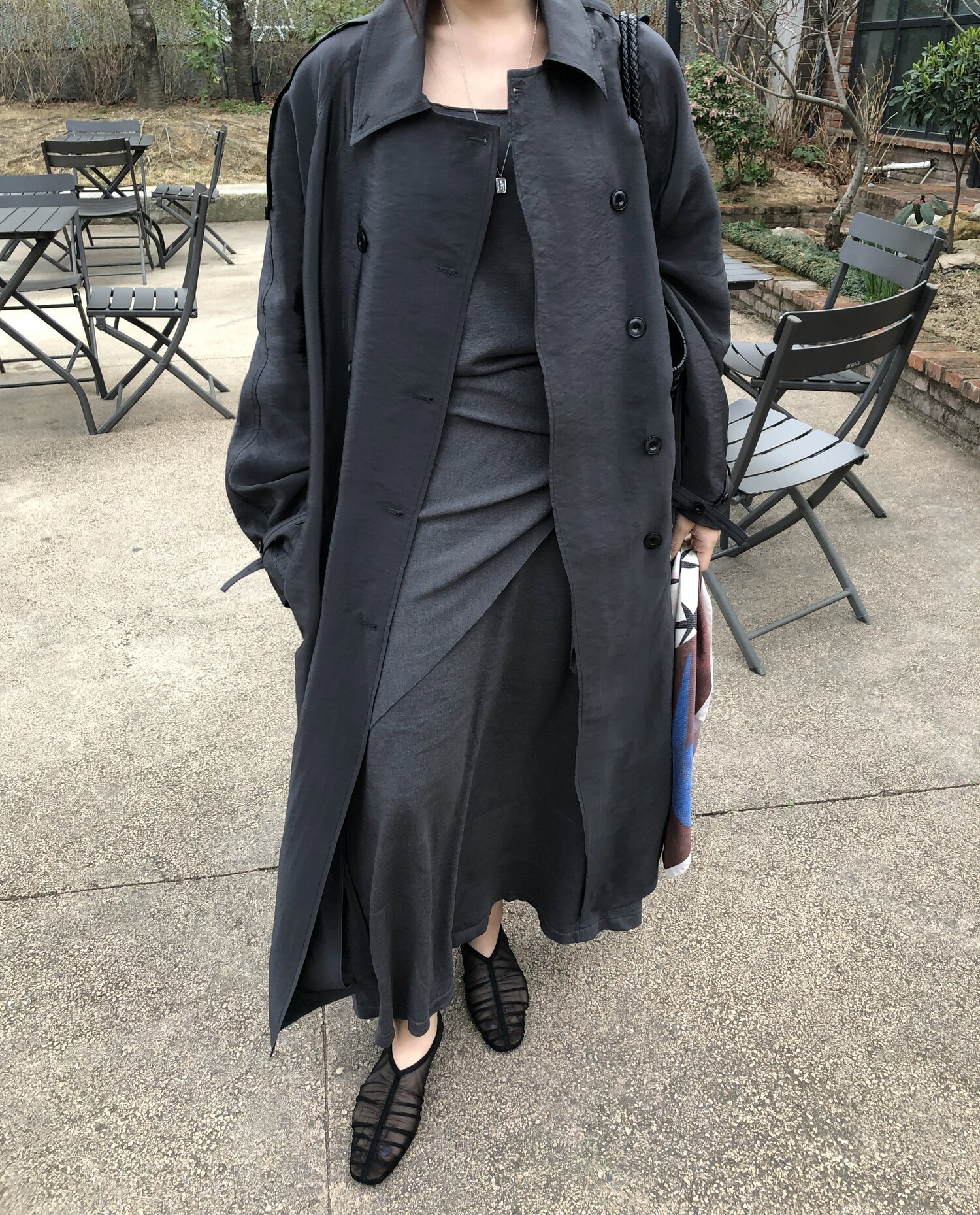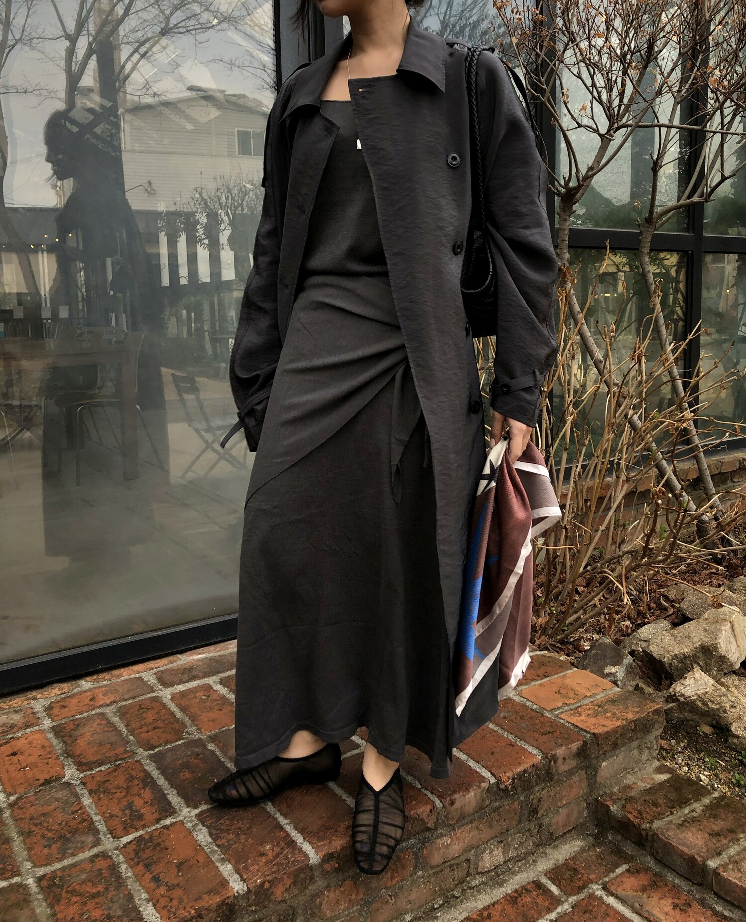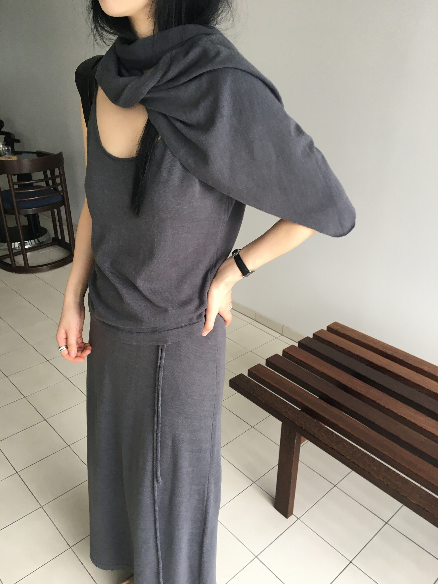 charcoal-허리에 둘러 연출된 스카프는 제품명 Crocus long knit scarf 이며 별도 구매바랍니다.