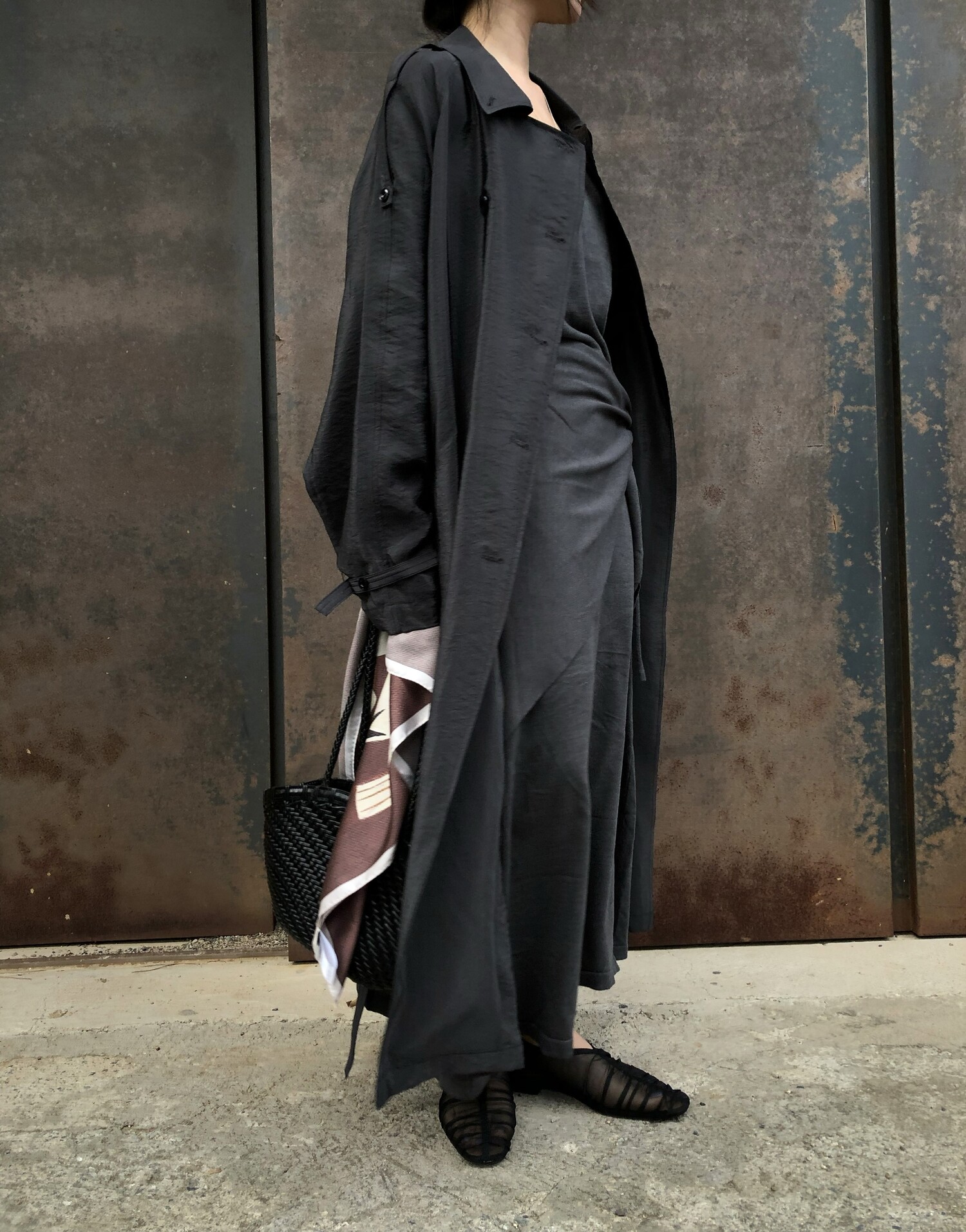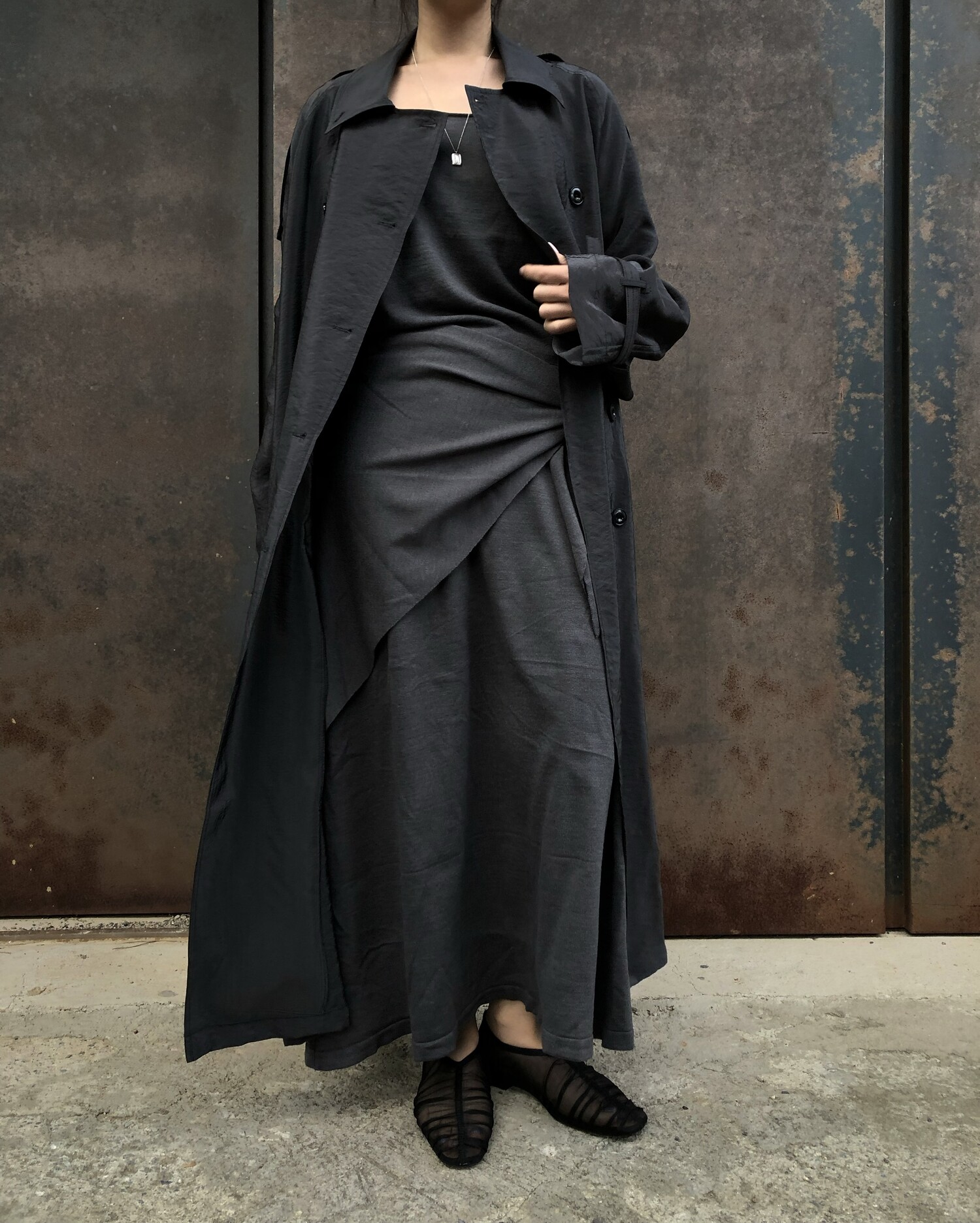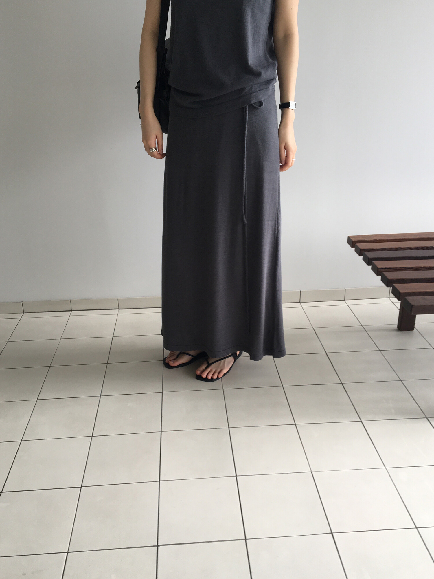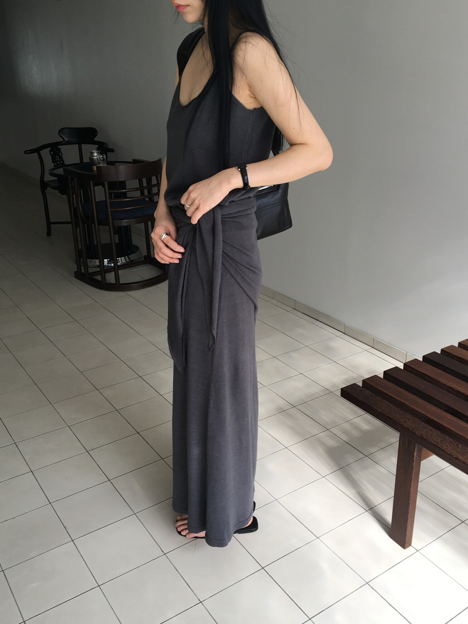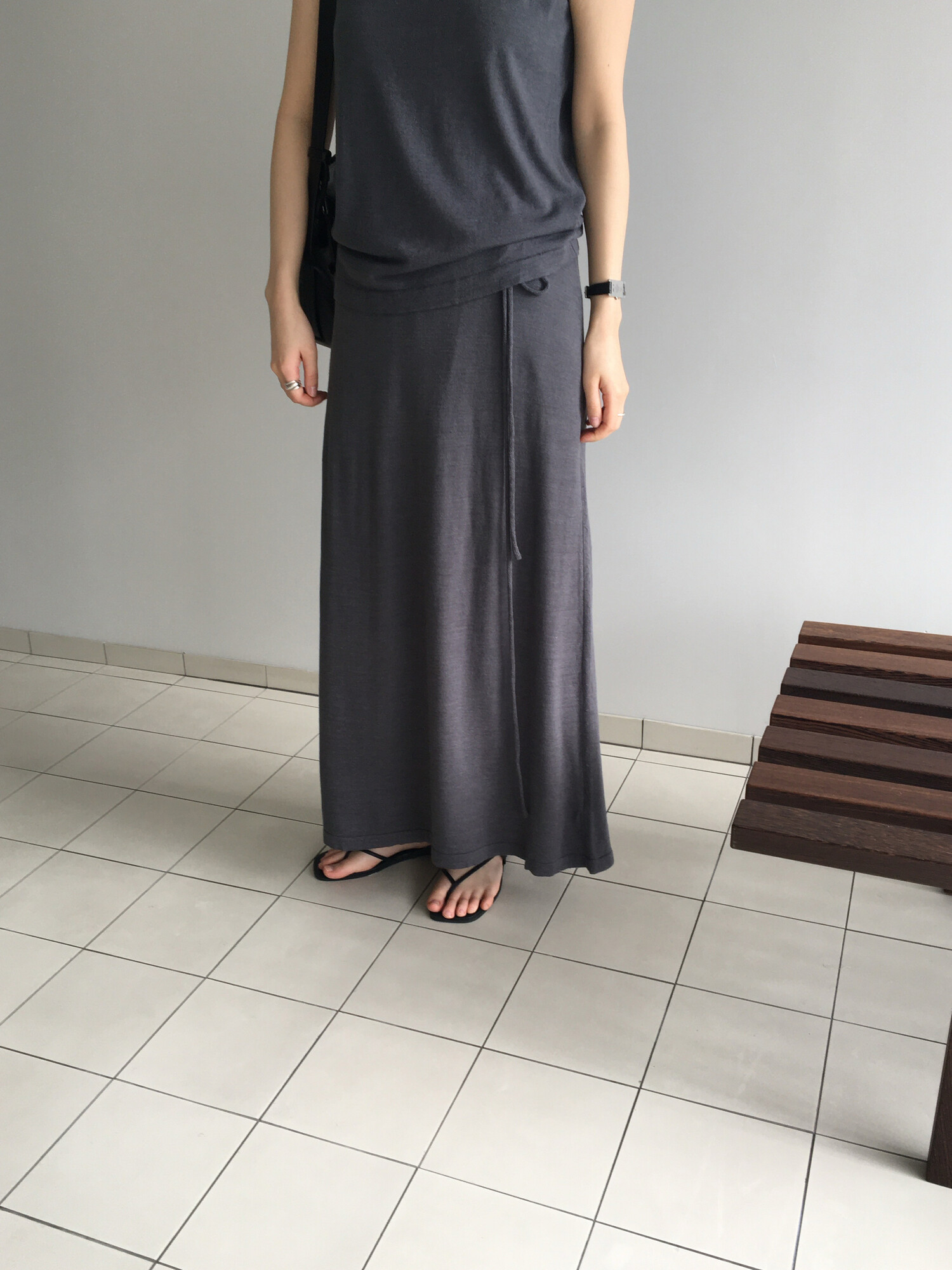charcoal-허리에 둘러 연출된 스카프는 제품명 Crocus long knit scarf 이며 별도 구매바랍니다.