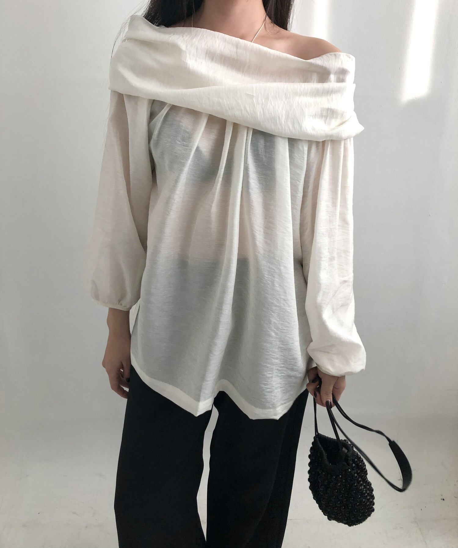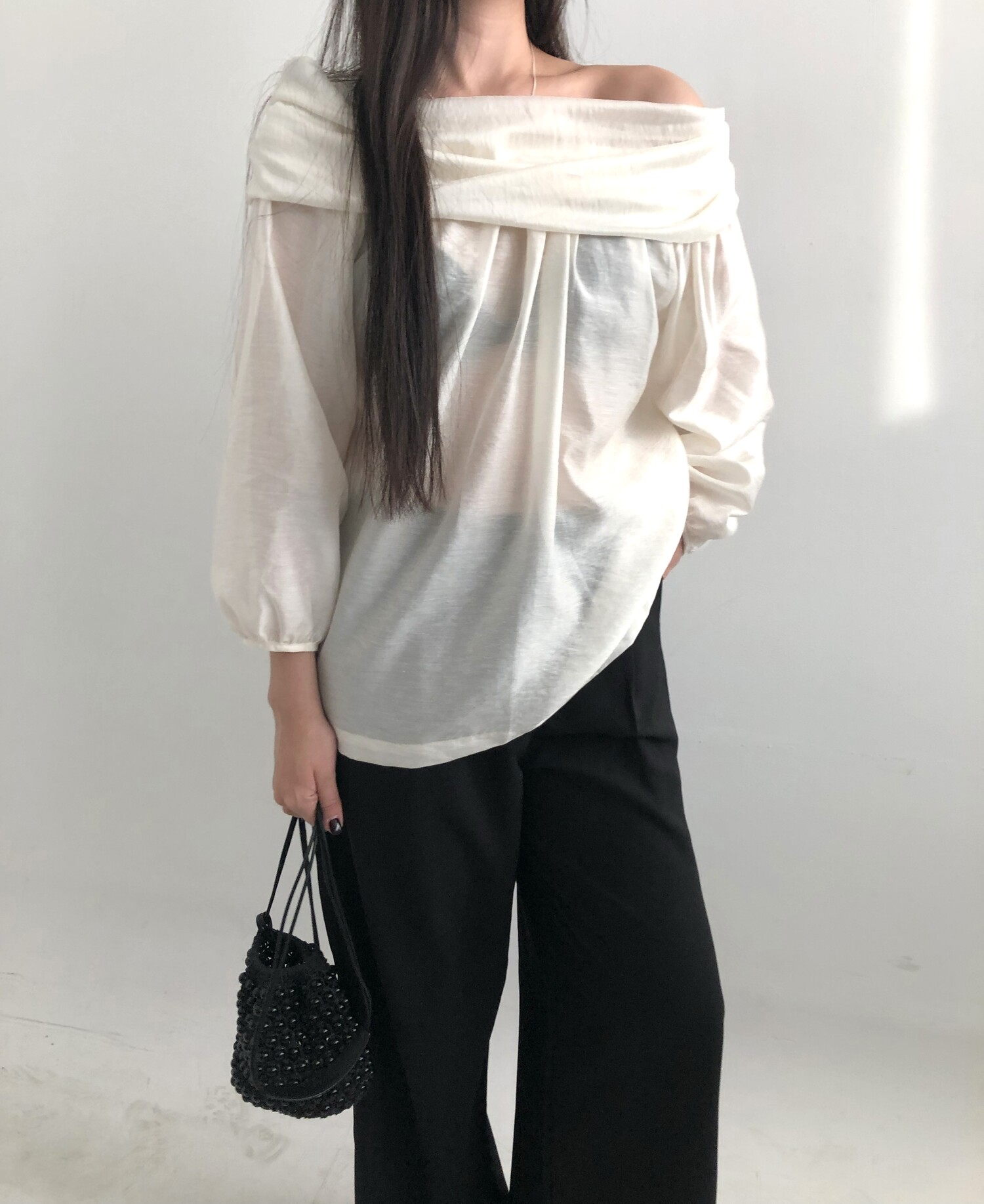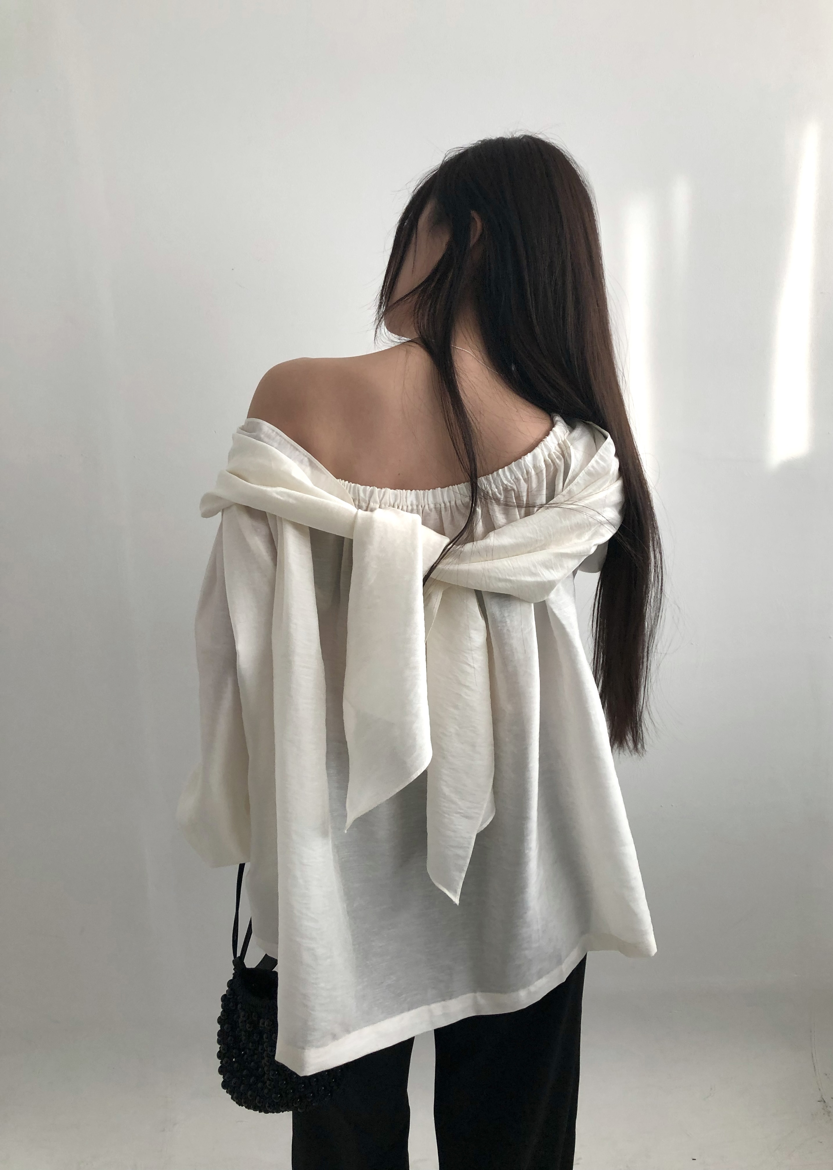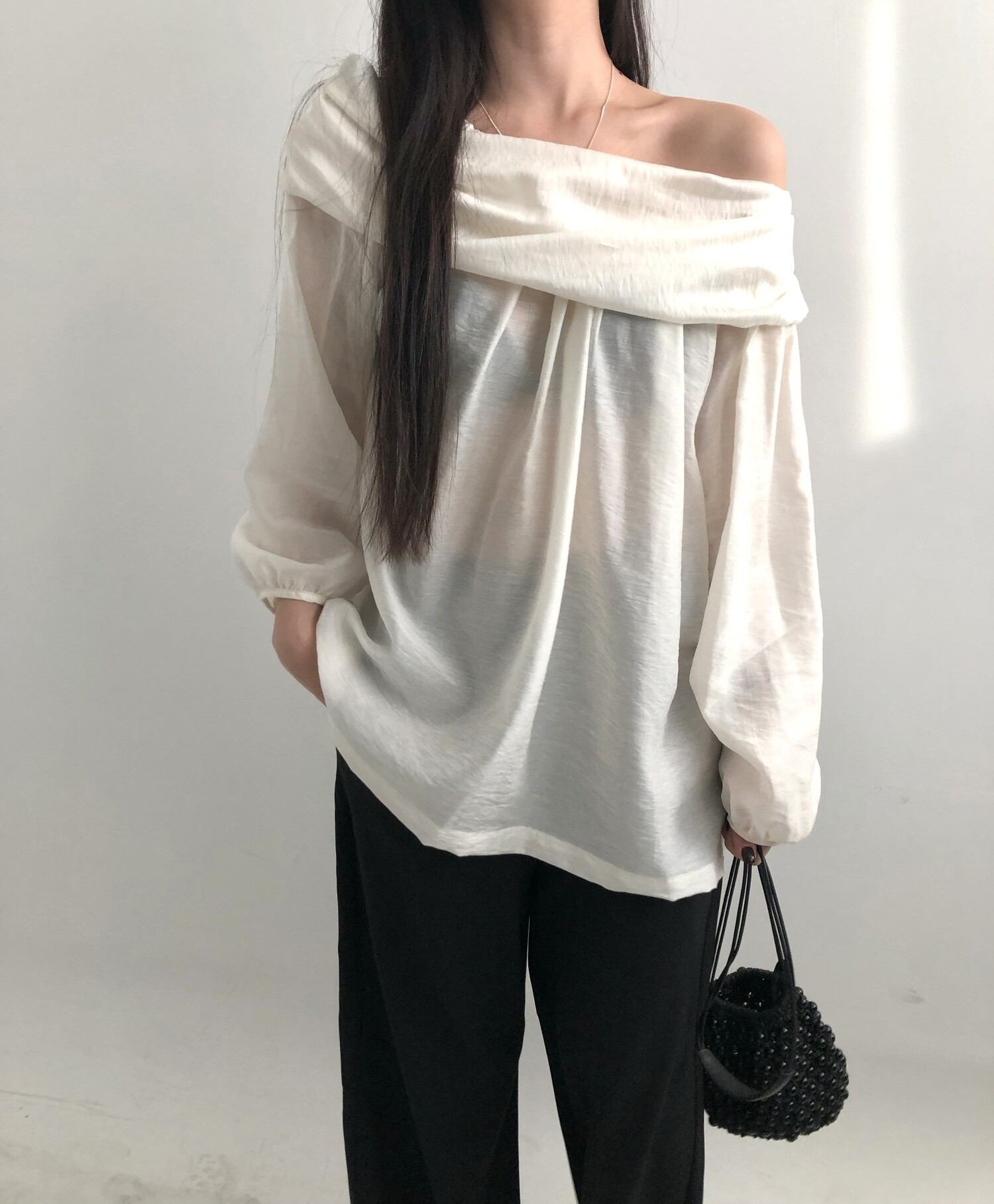 오프숄더로도,하이넥으로도 여성스런 무드 가득한 블라우스로 적극 추천드립니다.