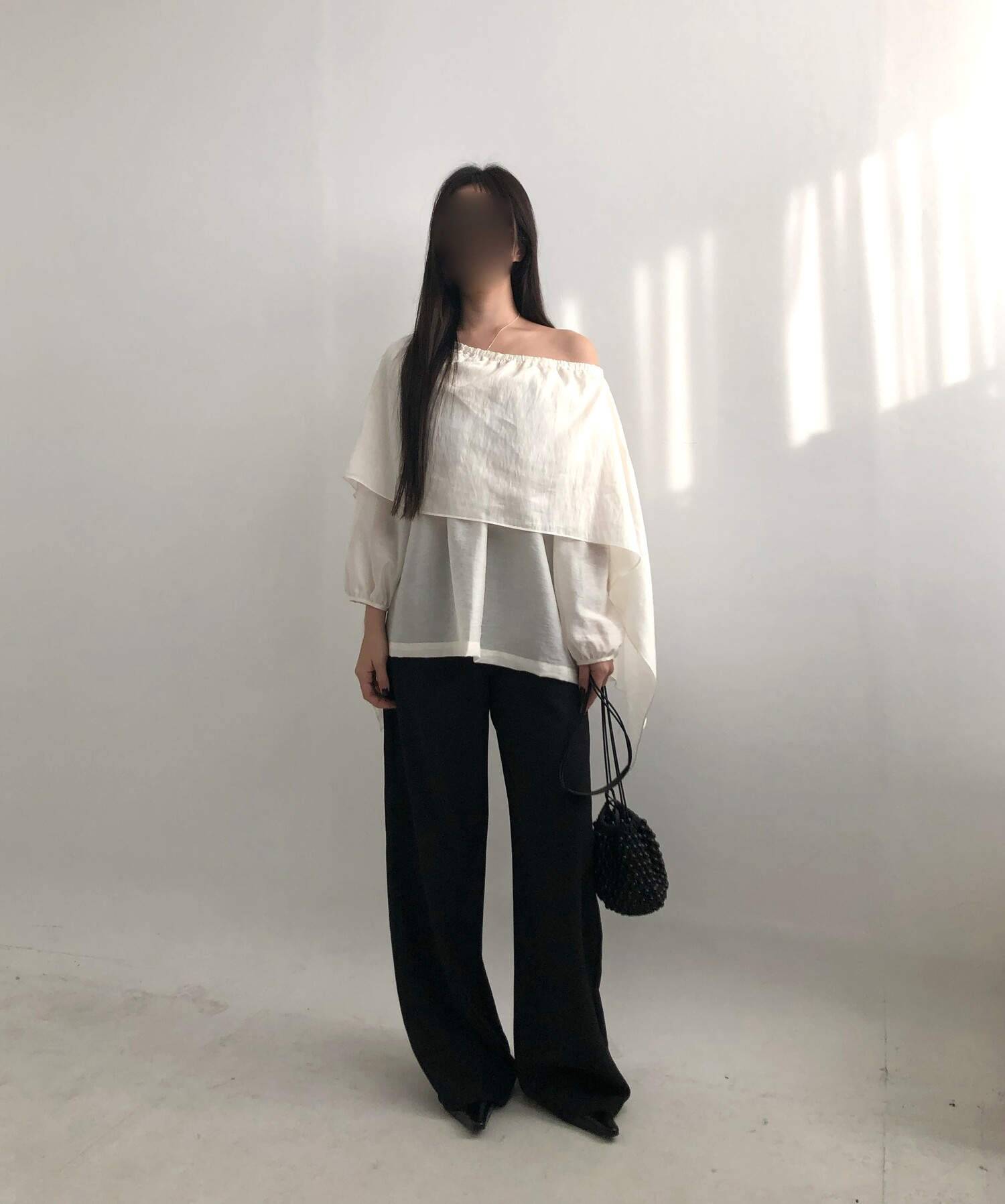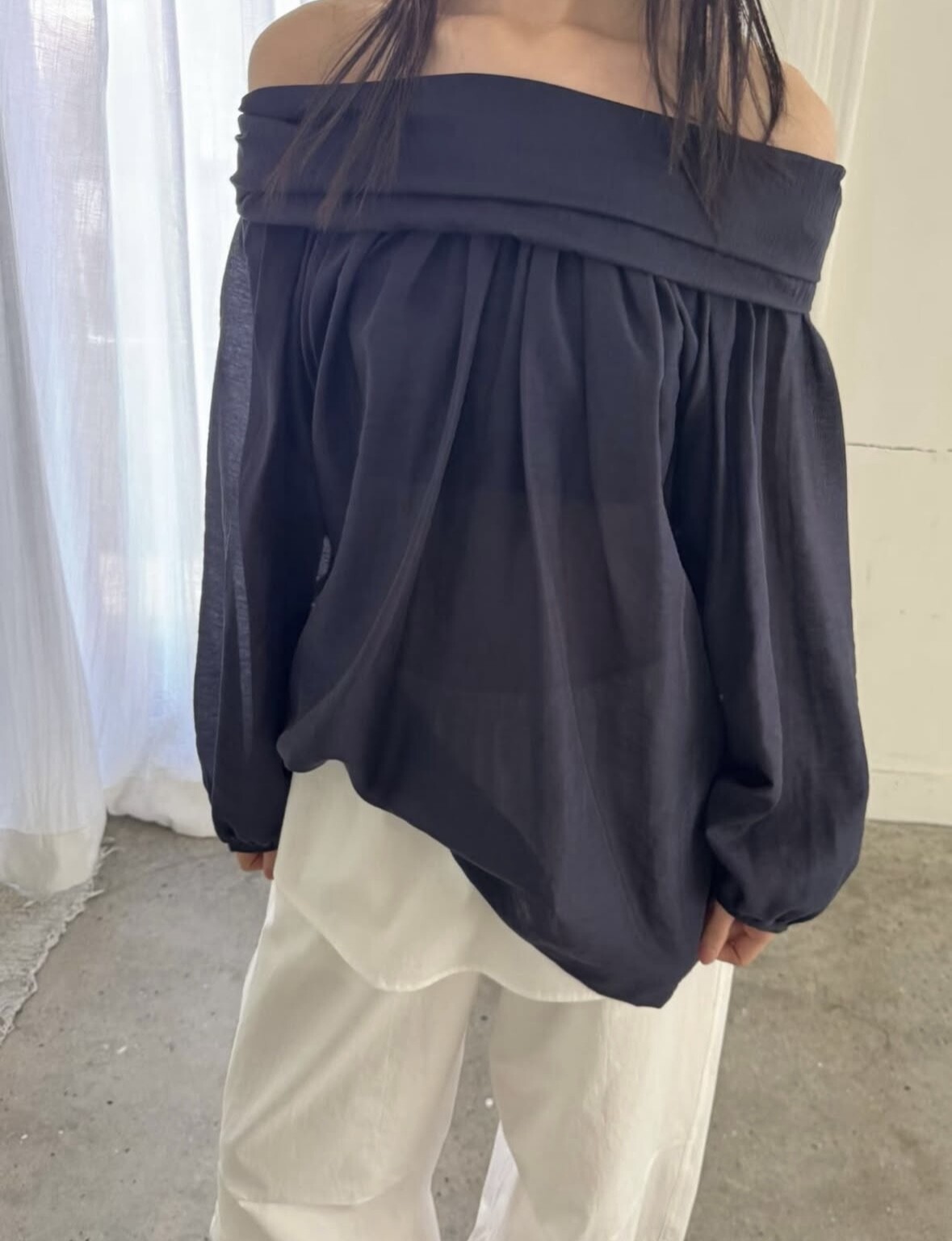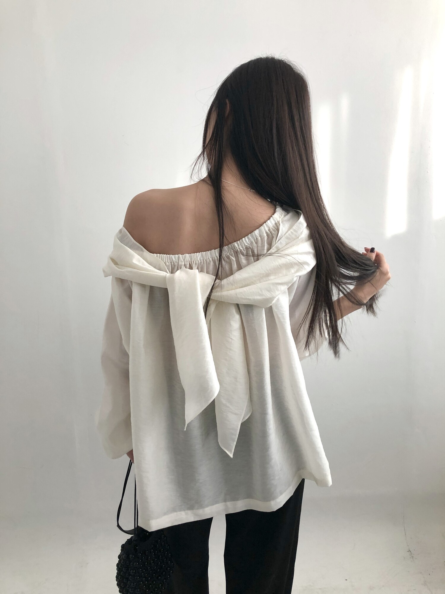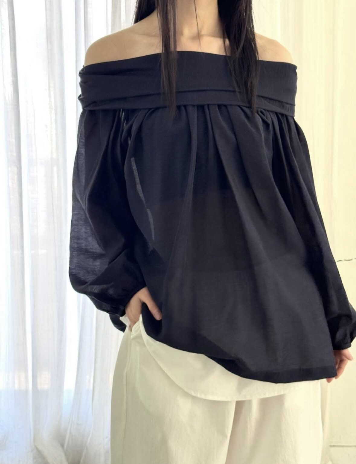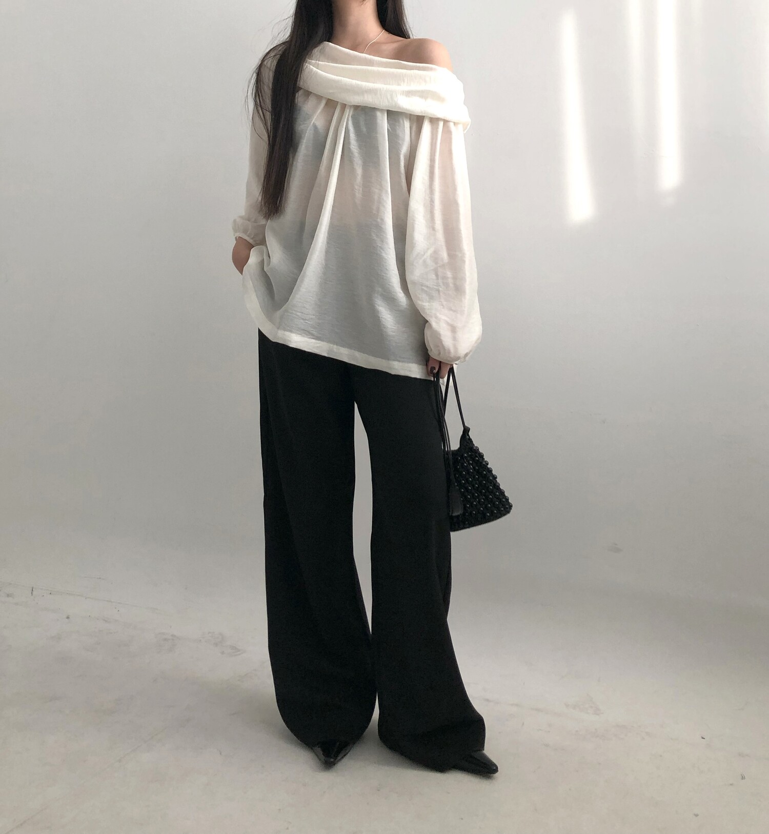 오프숄더로도,하이넥으로도 여성스런 무드 가득한 블라우스로 적극 추천드립니다.