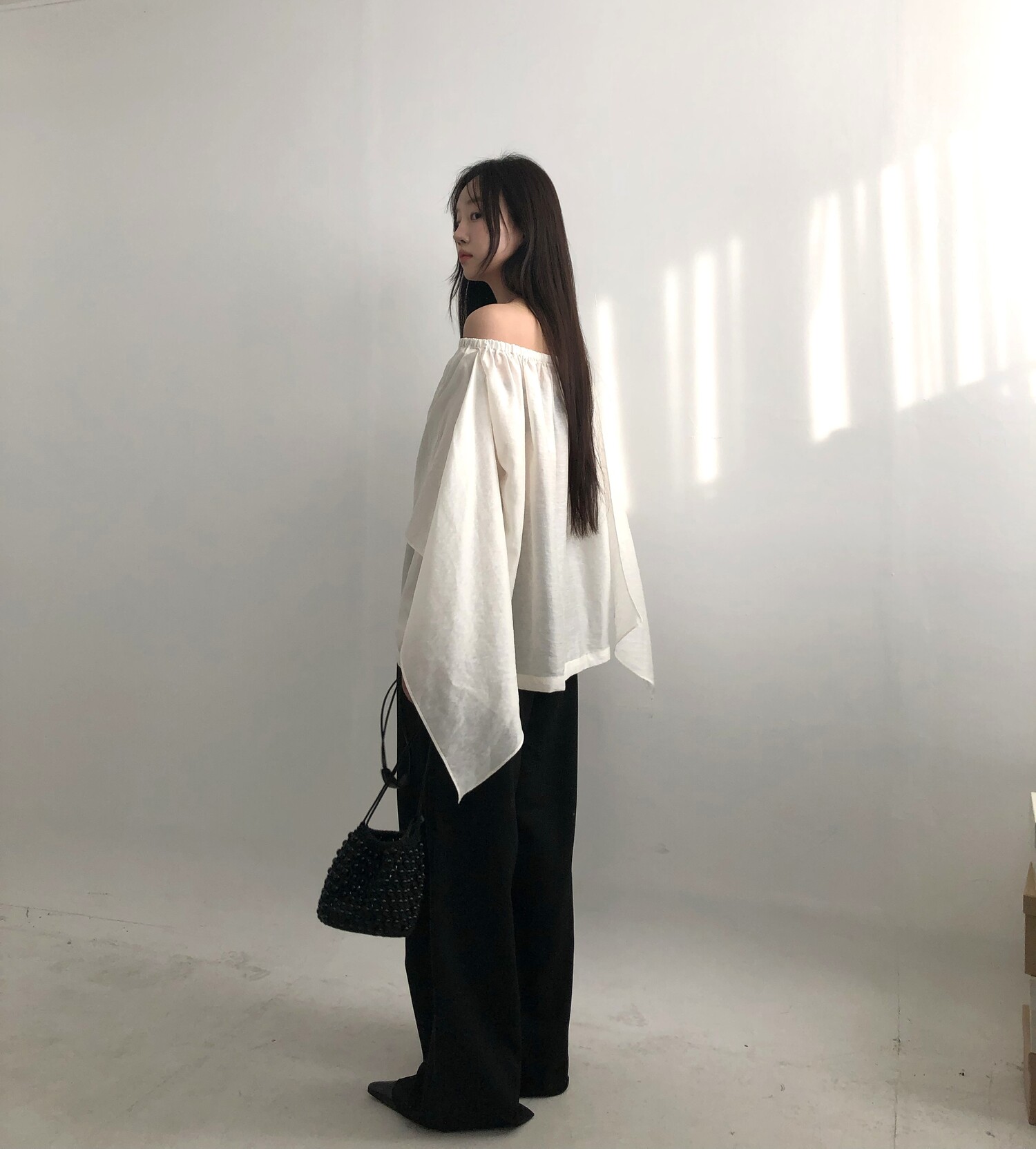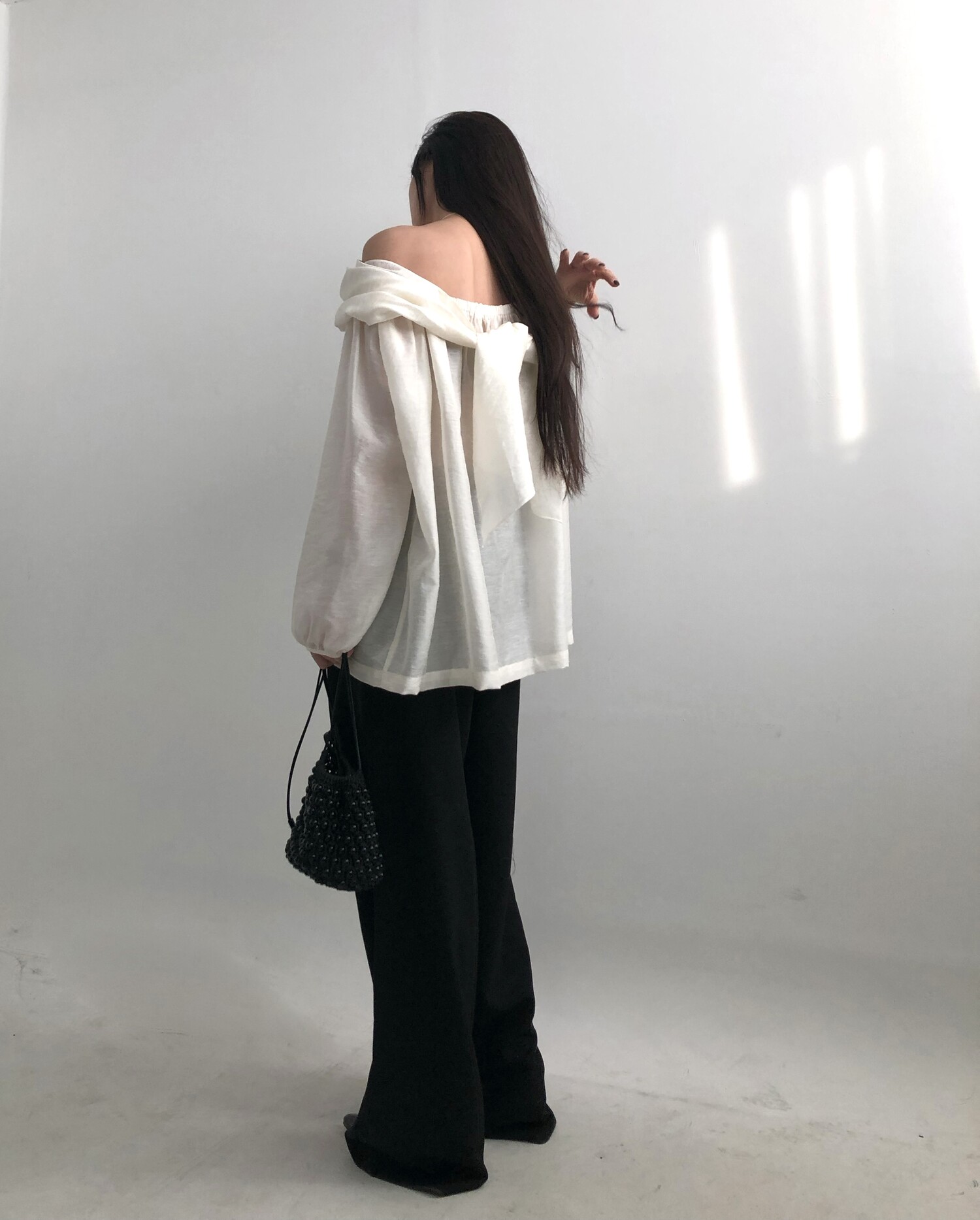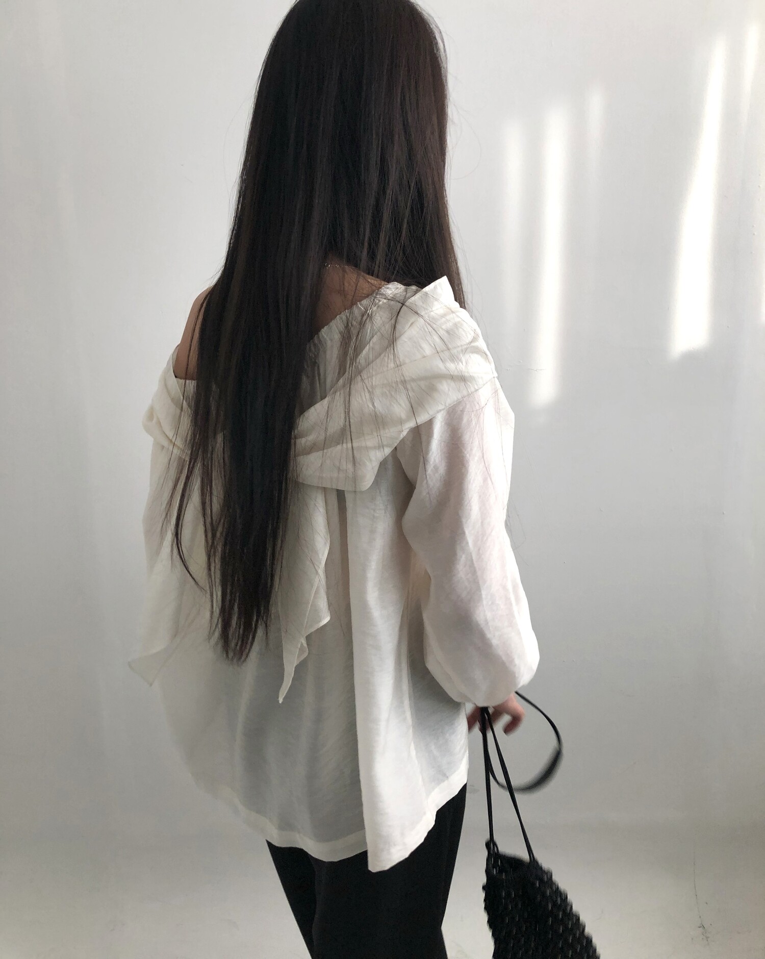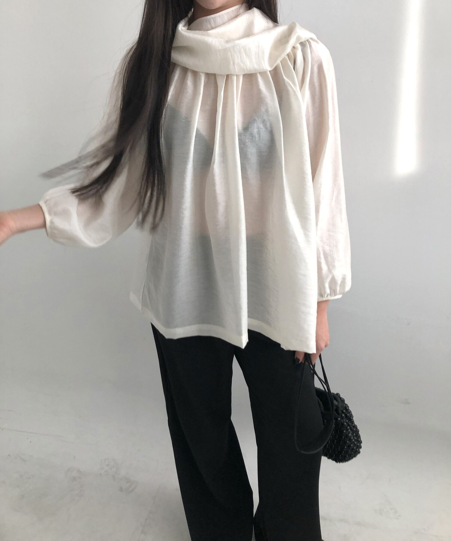 오프숄더로도,하이넥으로도 여성스런 무드 가득한 블라우스로 적극 추천드립니다.