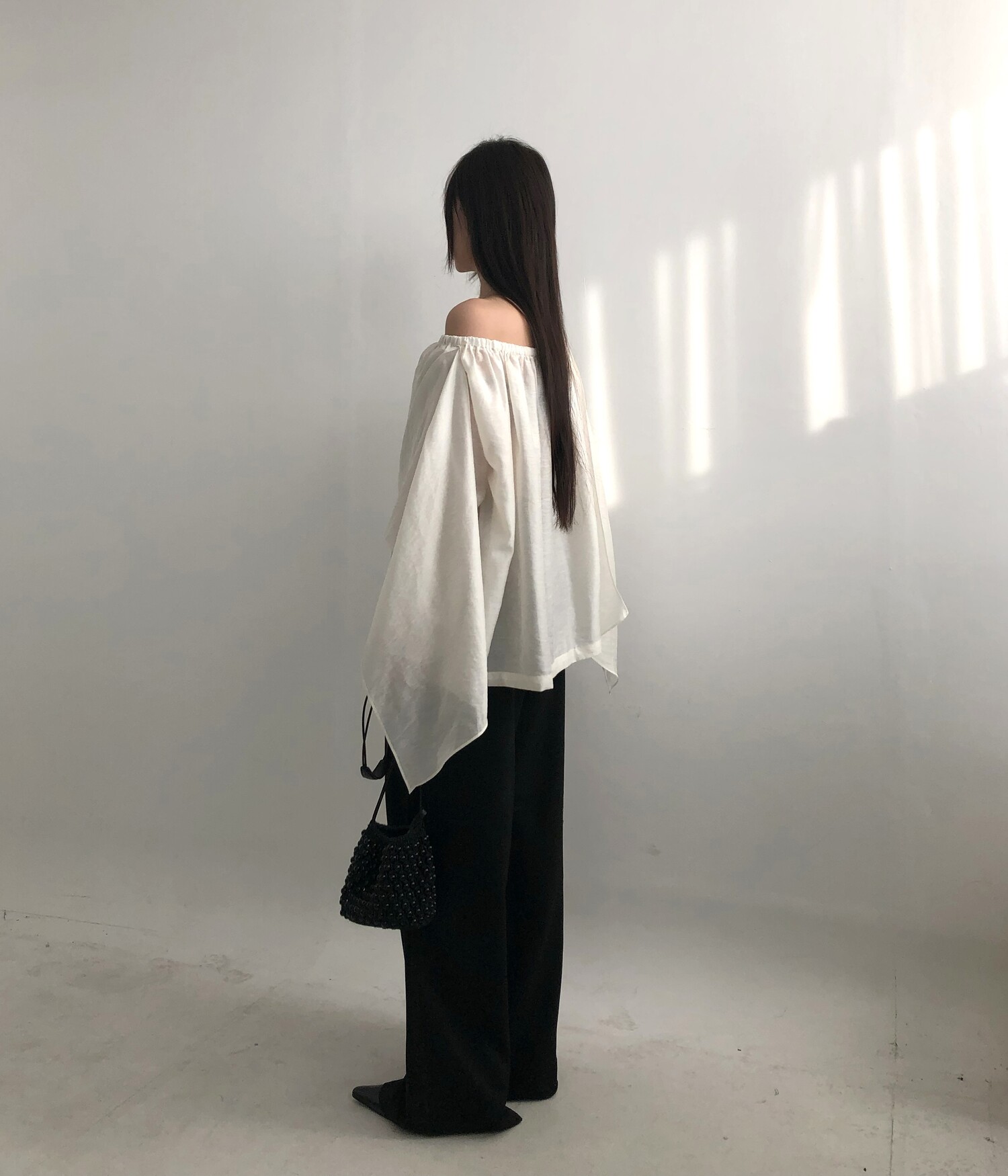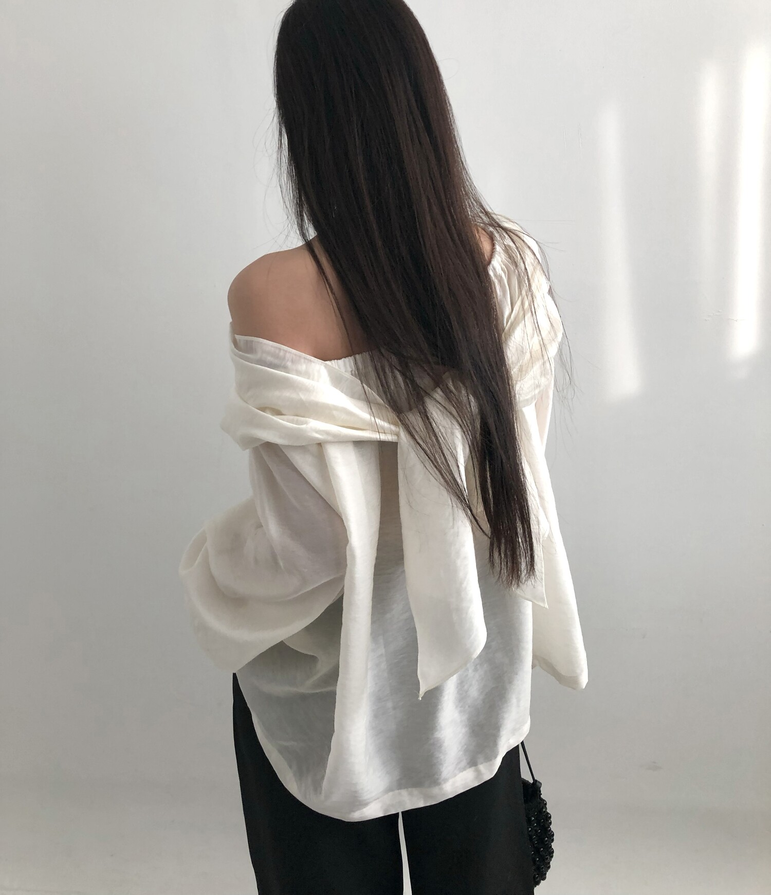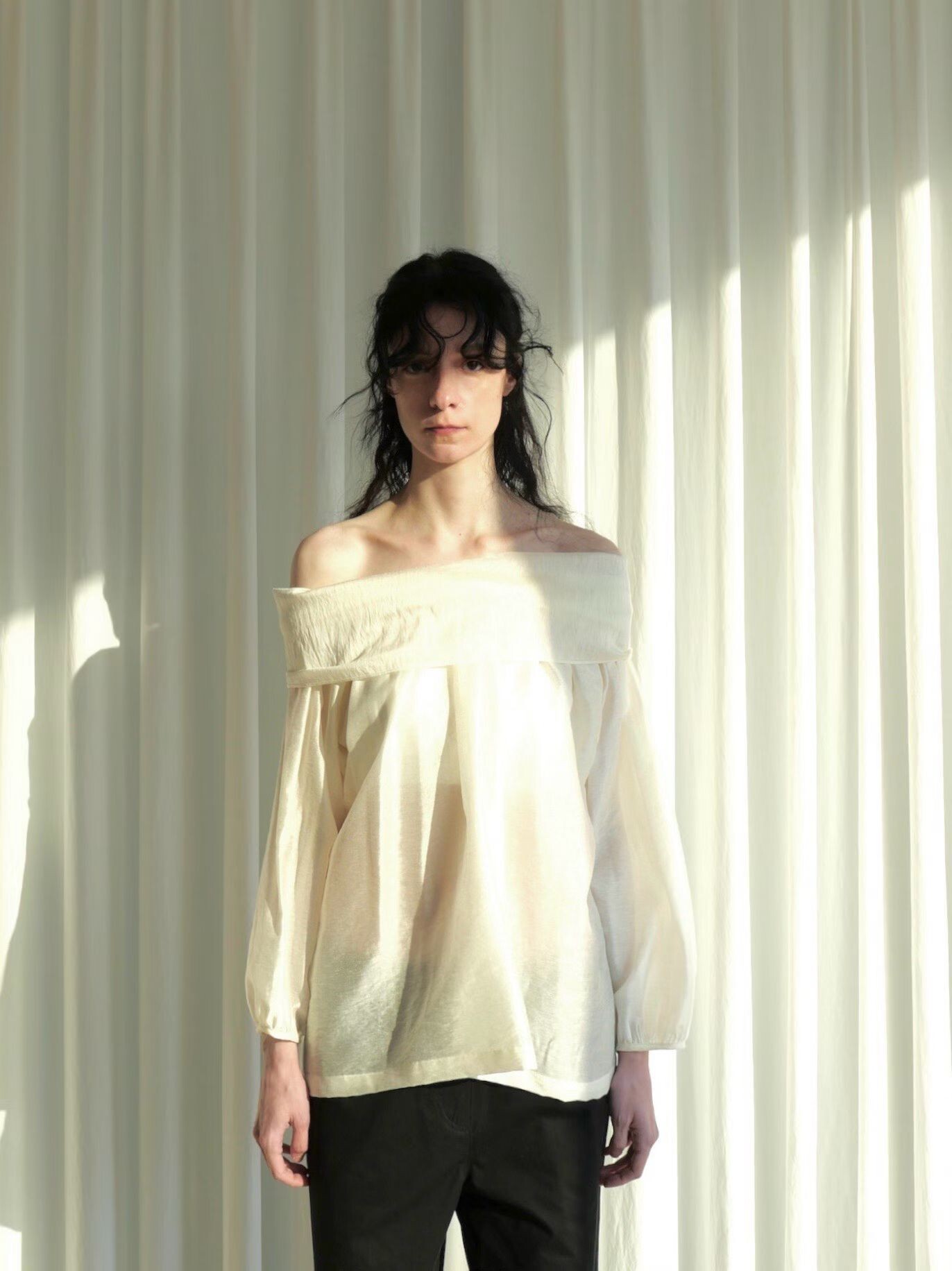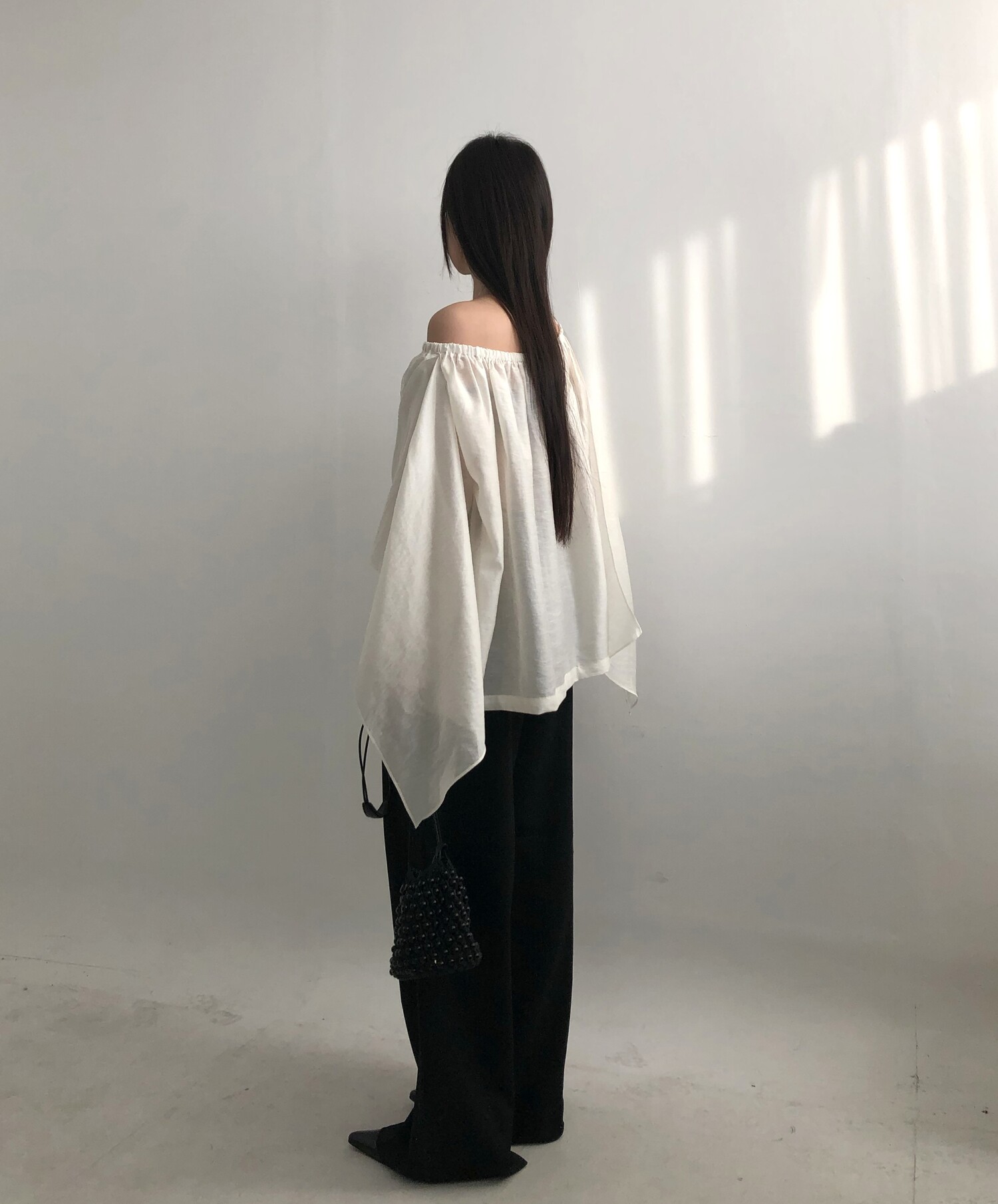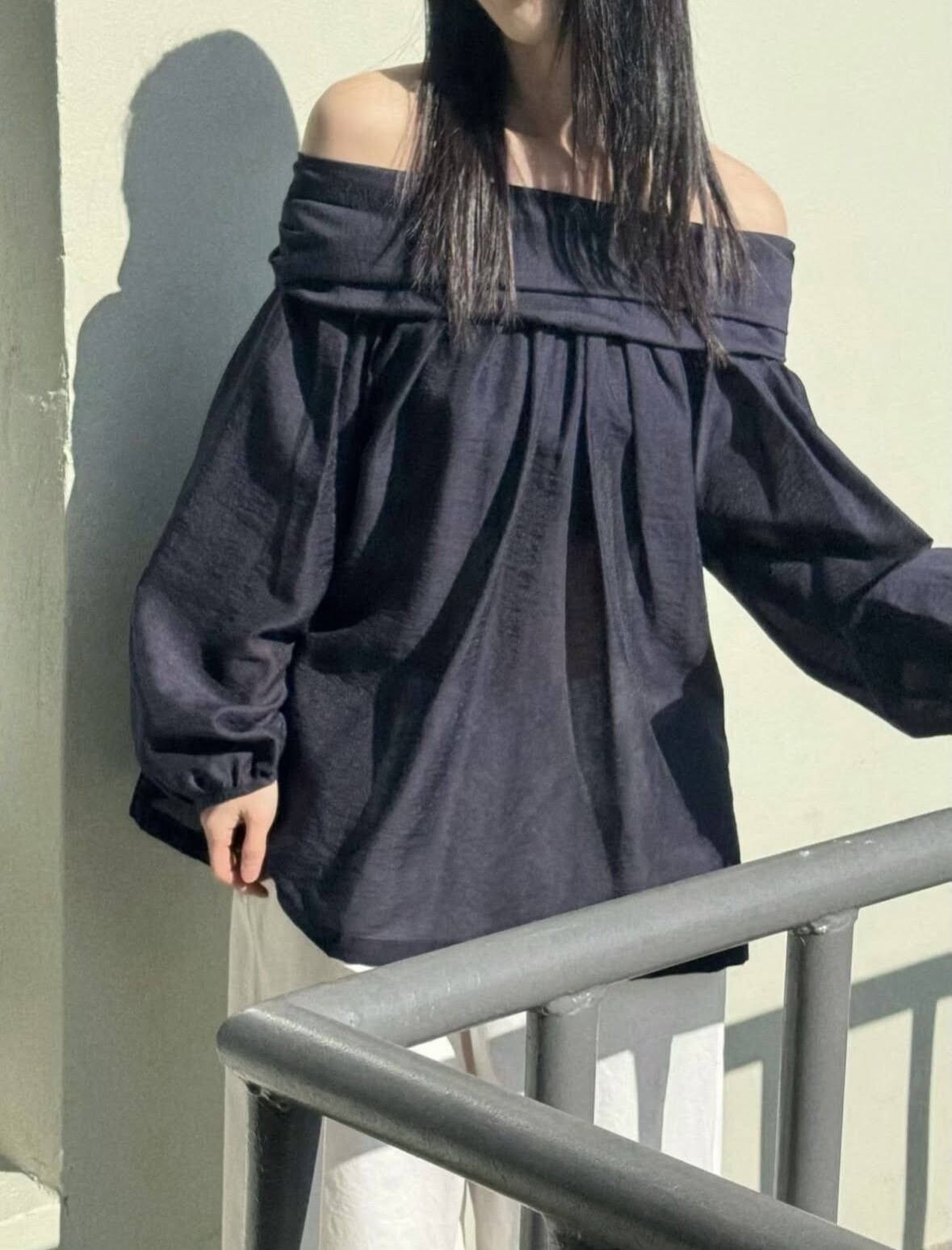 오프숄더로도,하이넥으로도 여성스런 무드 가득한 블라우스로 적극 추천드립니다.