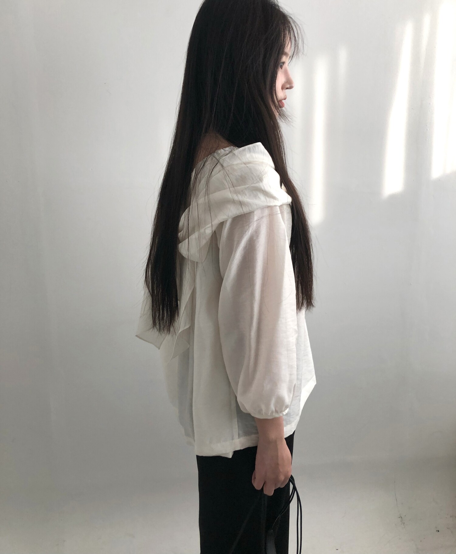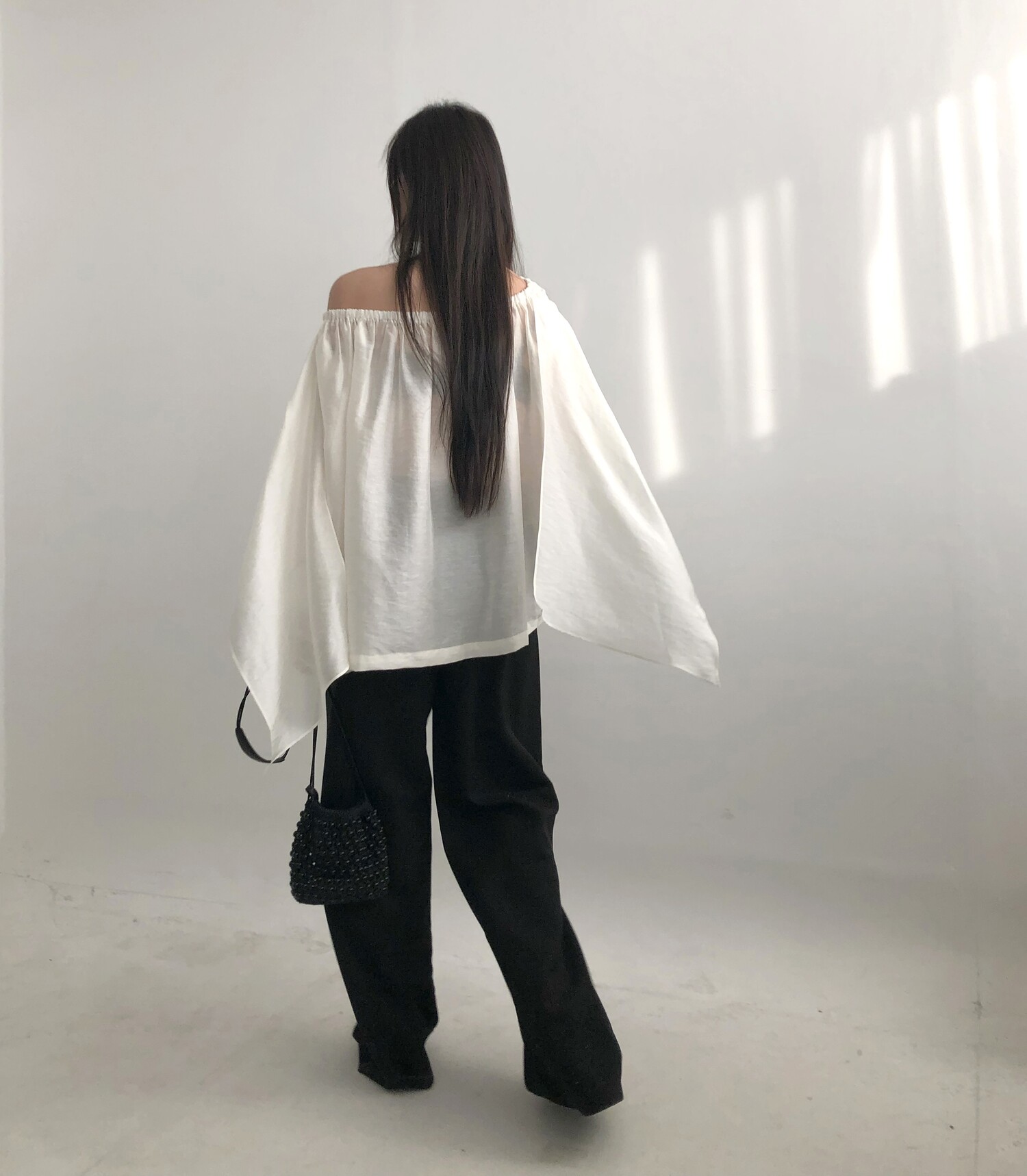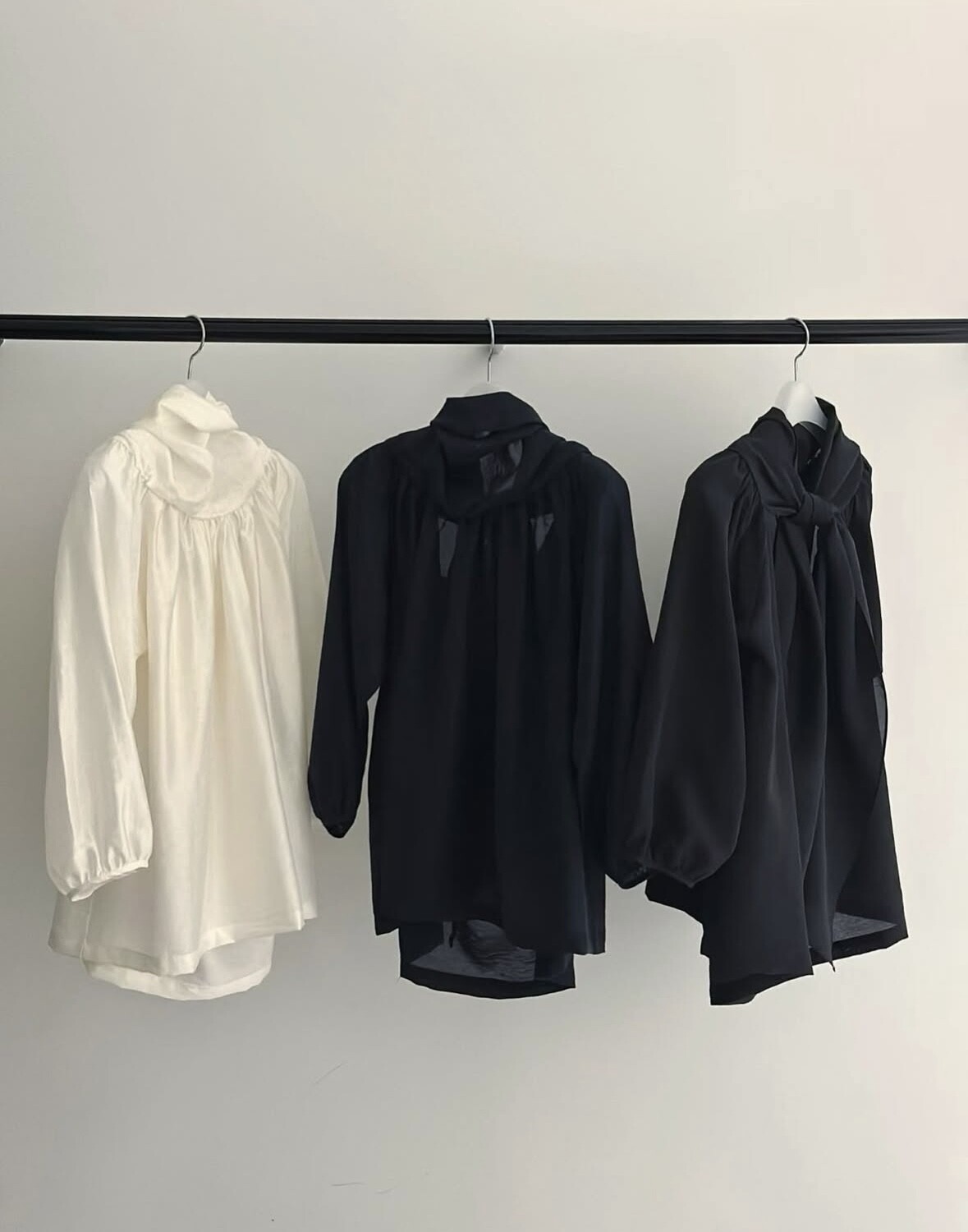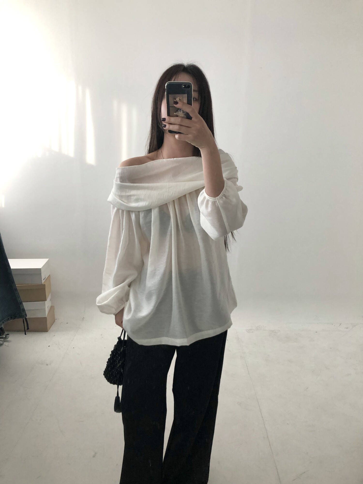 오프숄더로도,하이넥으로도 여성스런 무드 가득한 블라우스로 적극 추천드립니다.