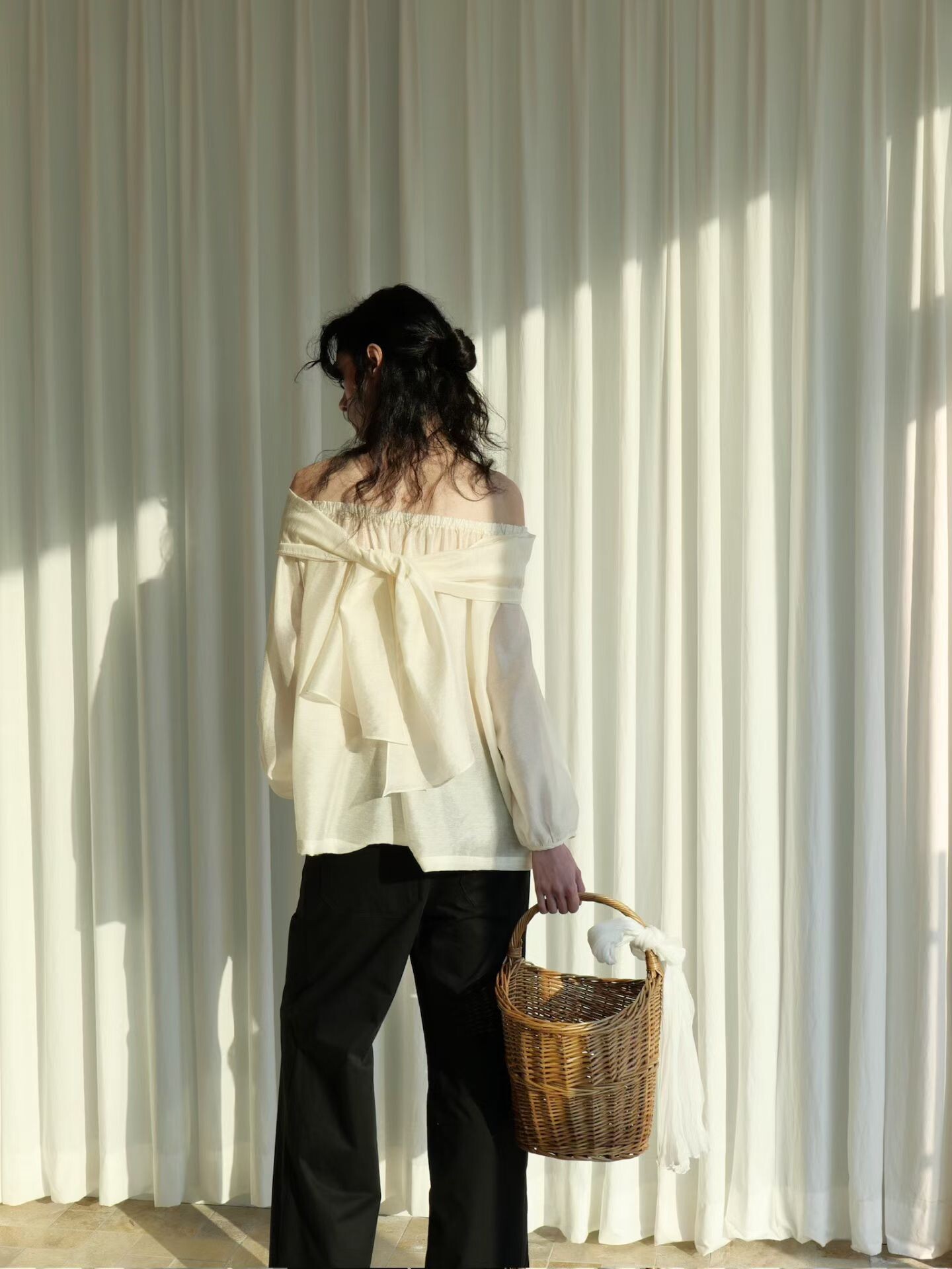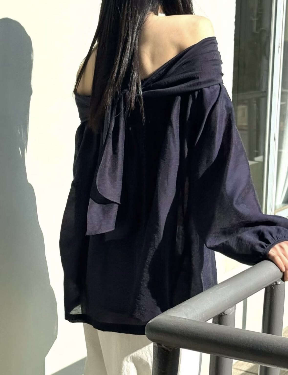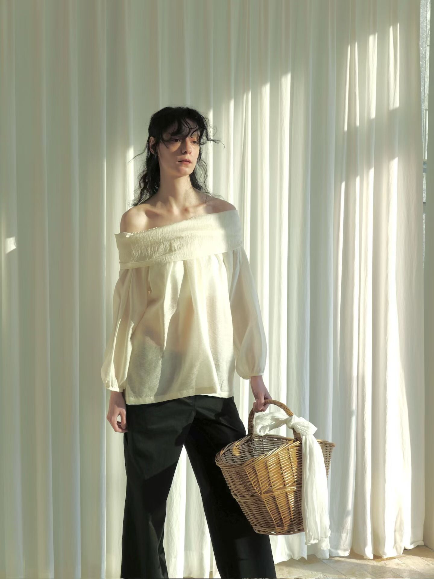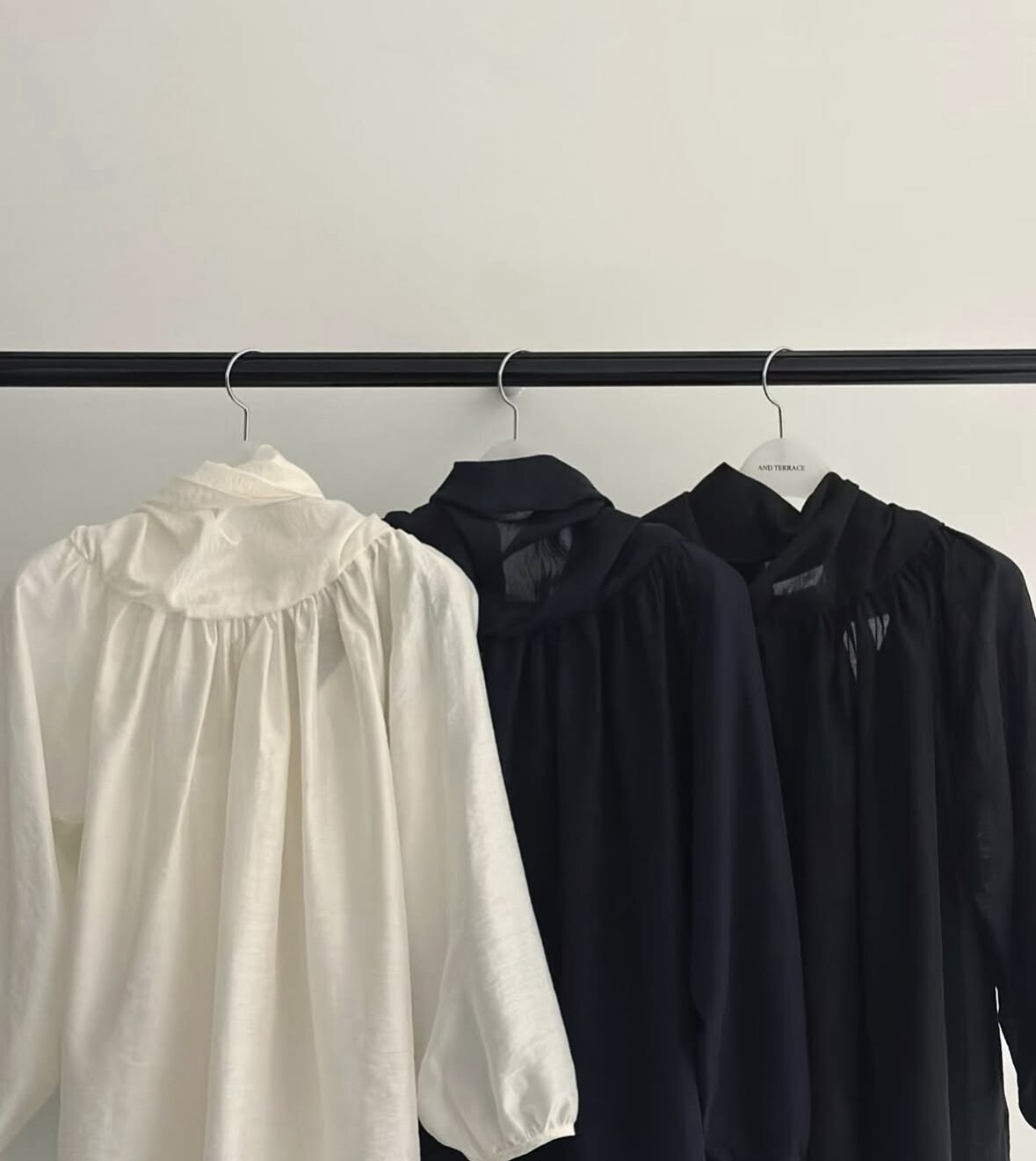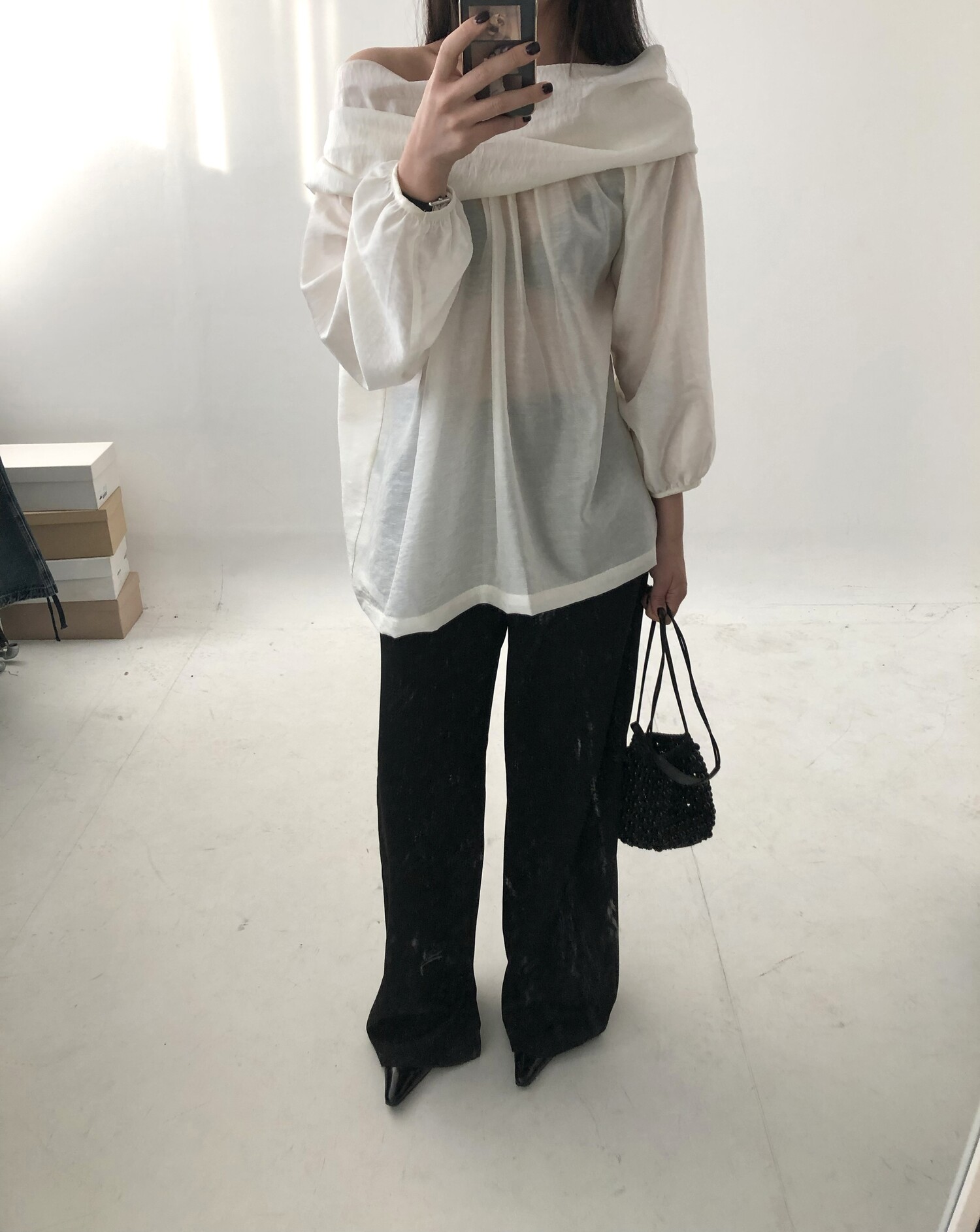 오프숄더로도,하이넥으로도 여성스런 무드 가득한 블라우스로 적극 추천드립니다.