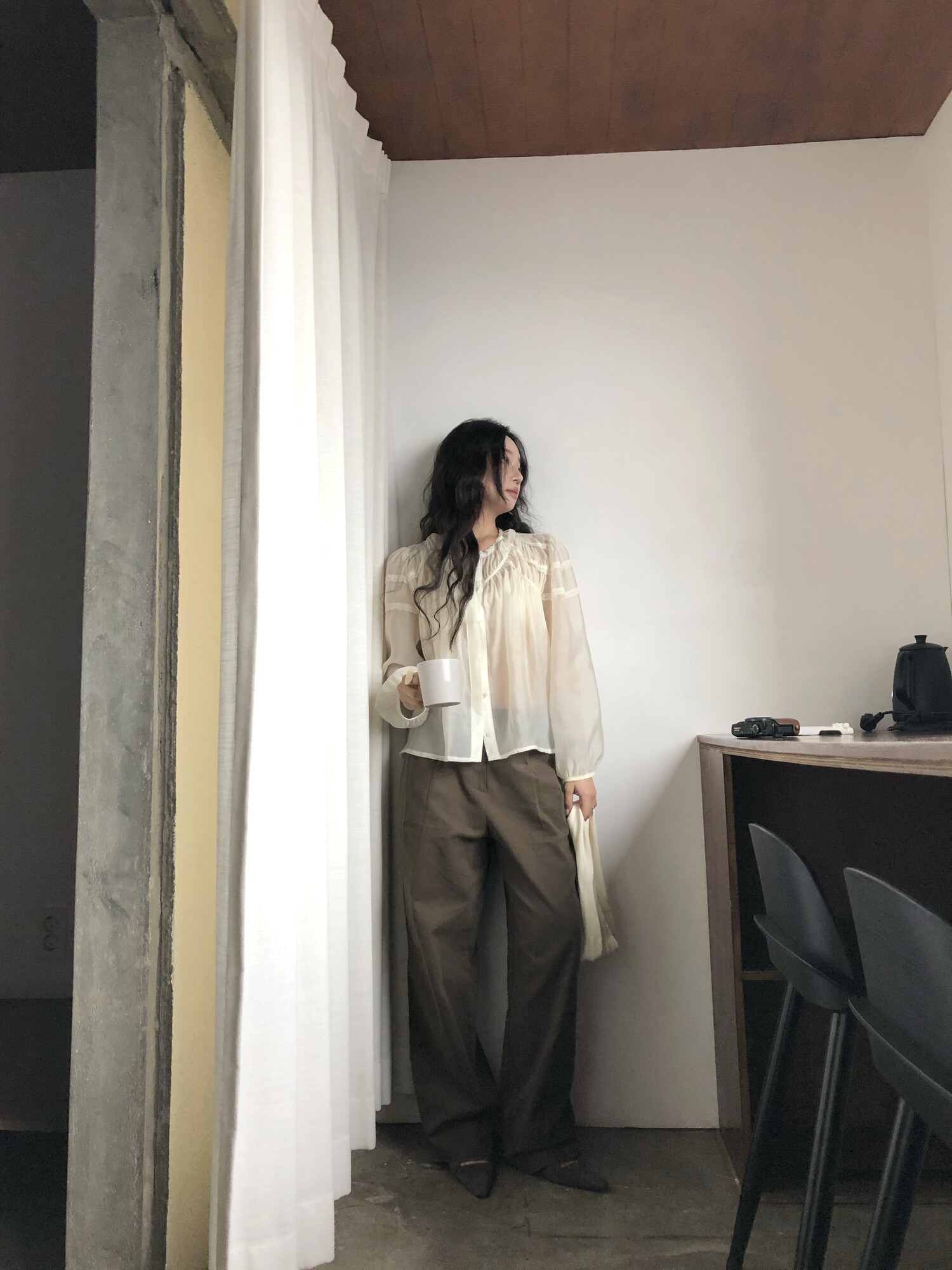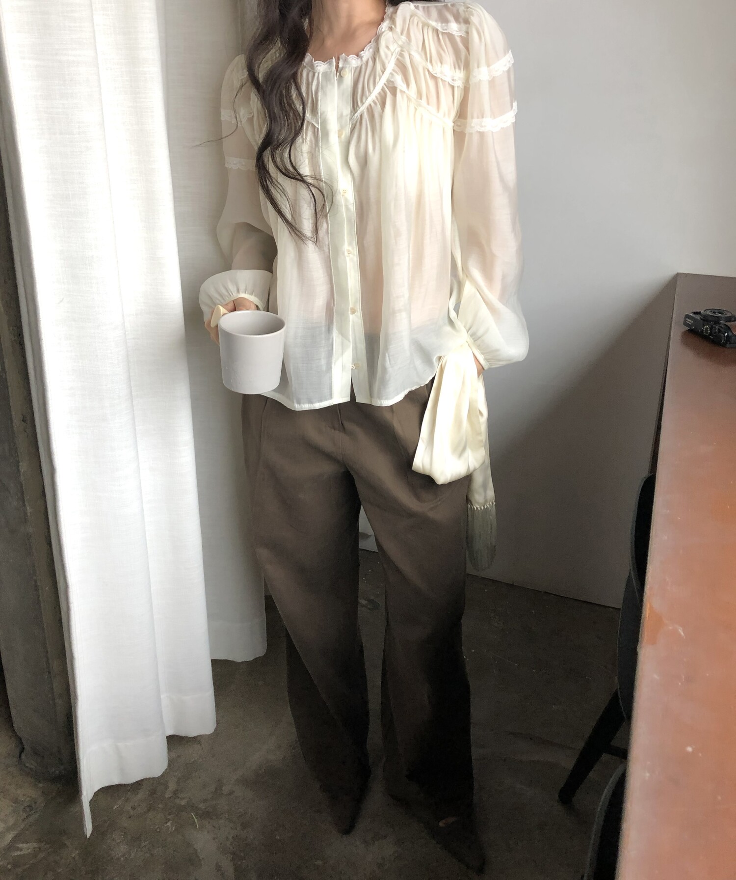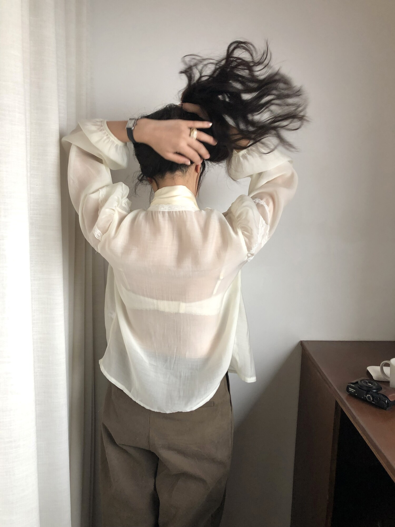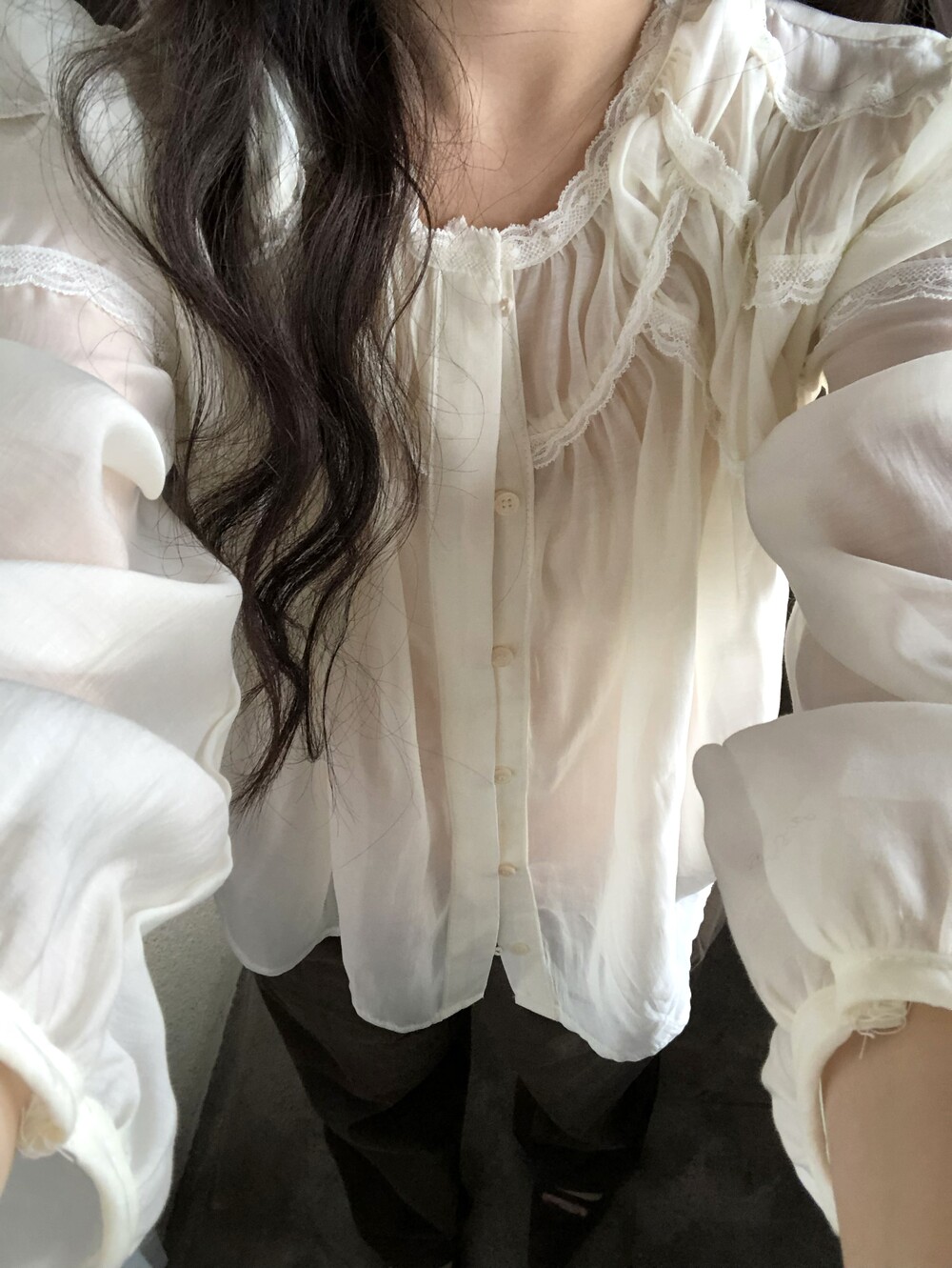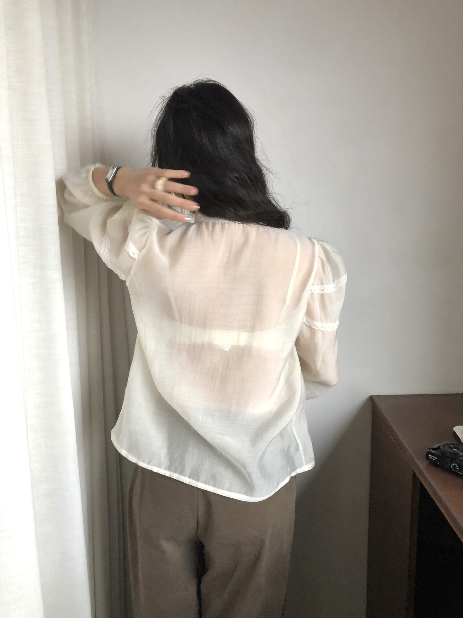 시스루한 쉬폰 소재로 비침 있으며 비침 자체를 즐겨주시는 것도 이쁘구요! 또는 나시와 입어주시면 더욱 안정적으로 입으시기 좋습니다.