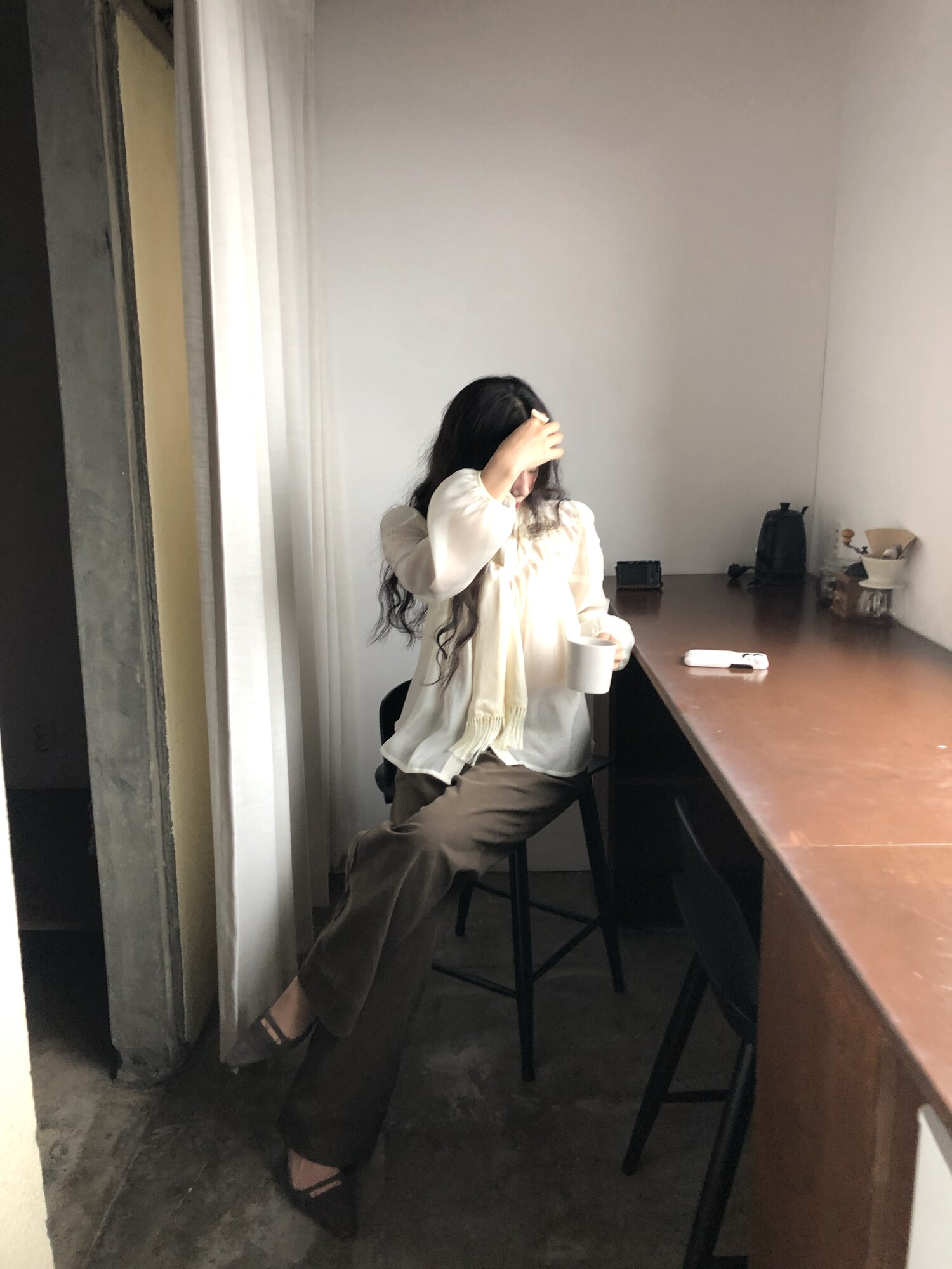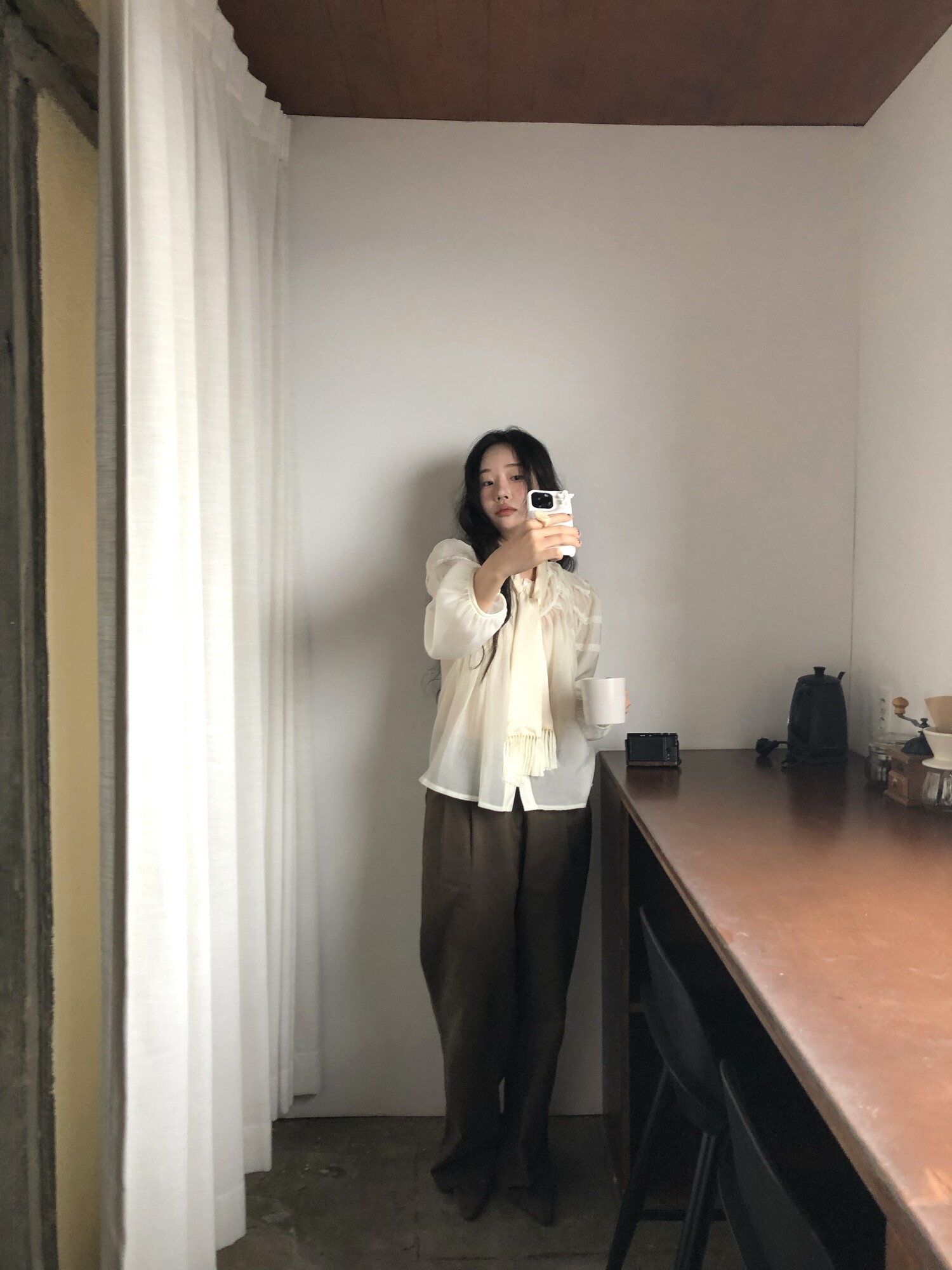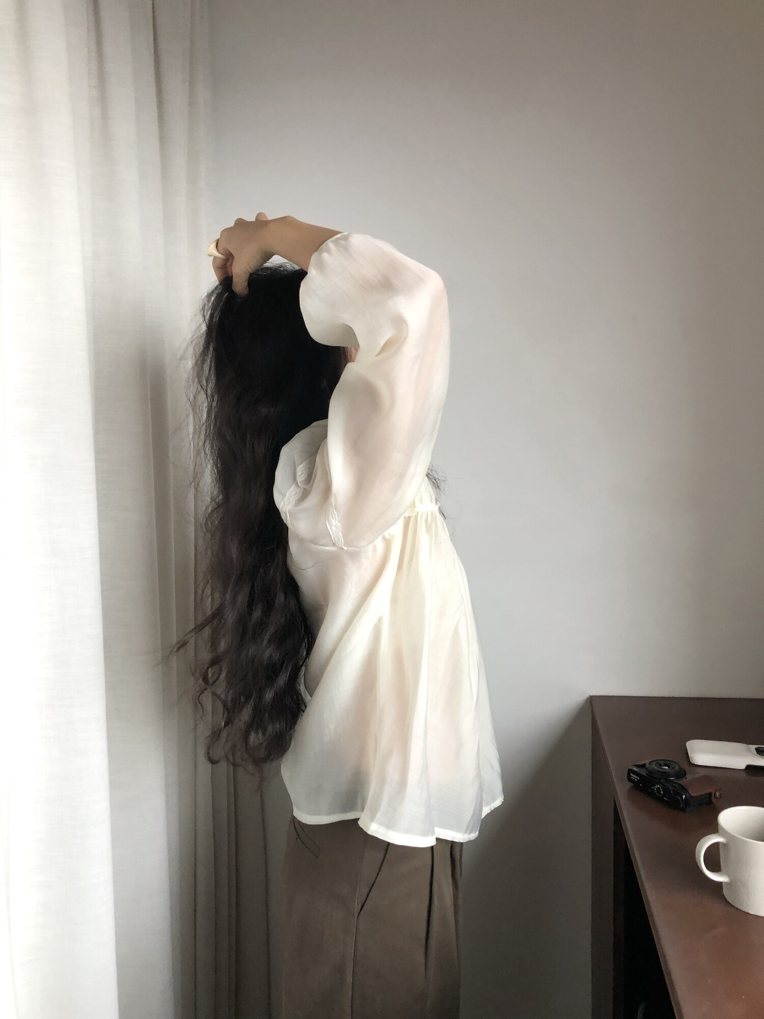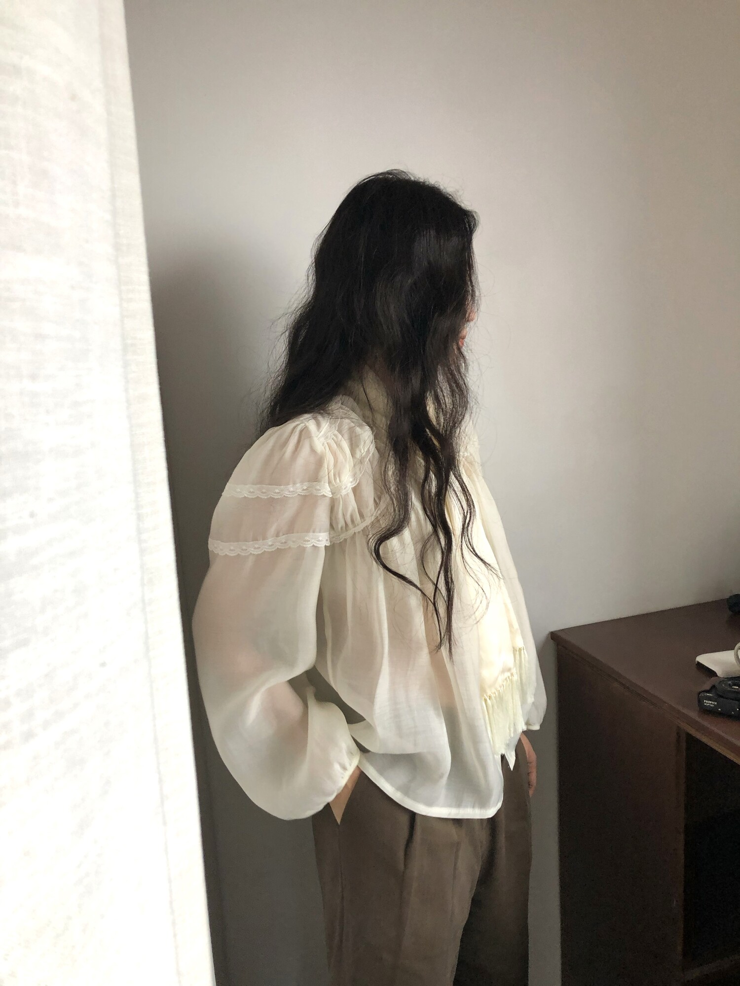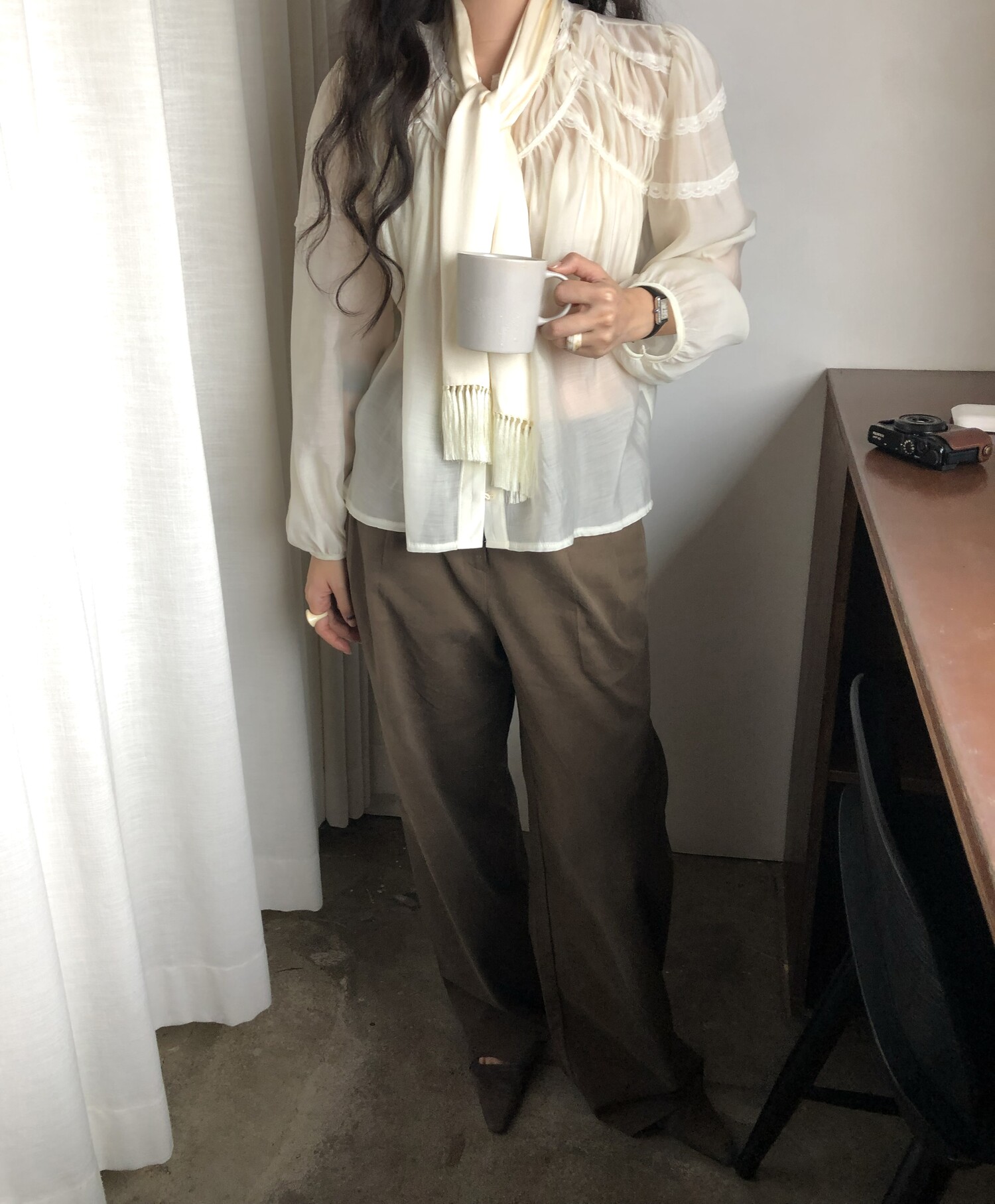 시스루한 쉬폰 소재로 비침 있으며 비침 자체를 즐겨주시는 것도 이쁘구요! 또는 나시와 입어주시면 더욱 안정적으로 입으시기 좋습니다.