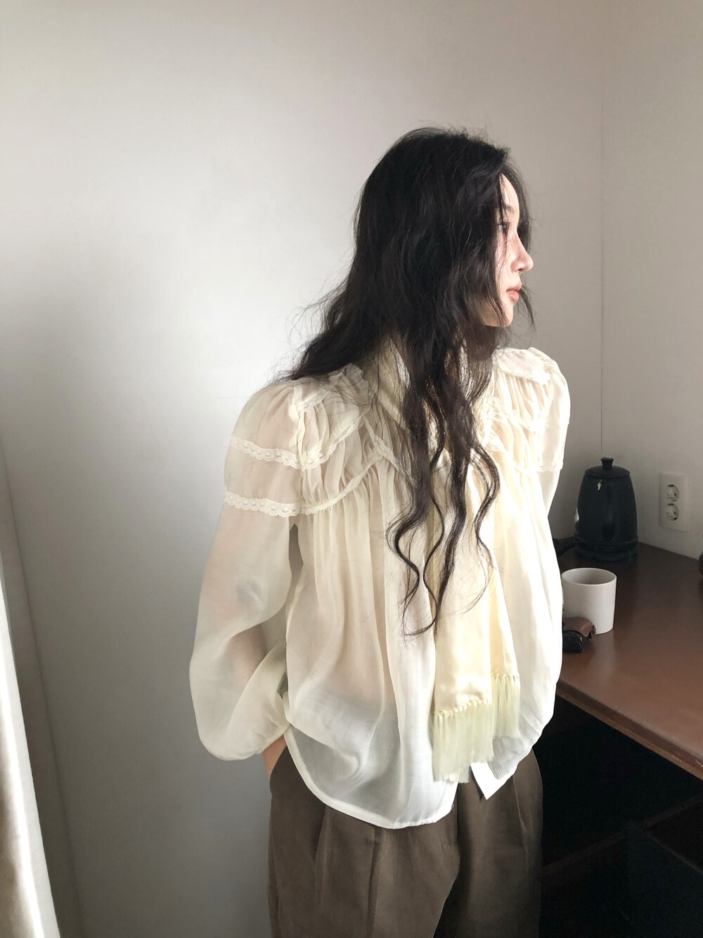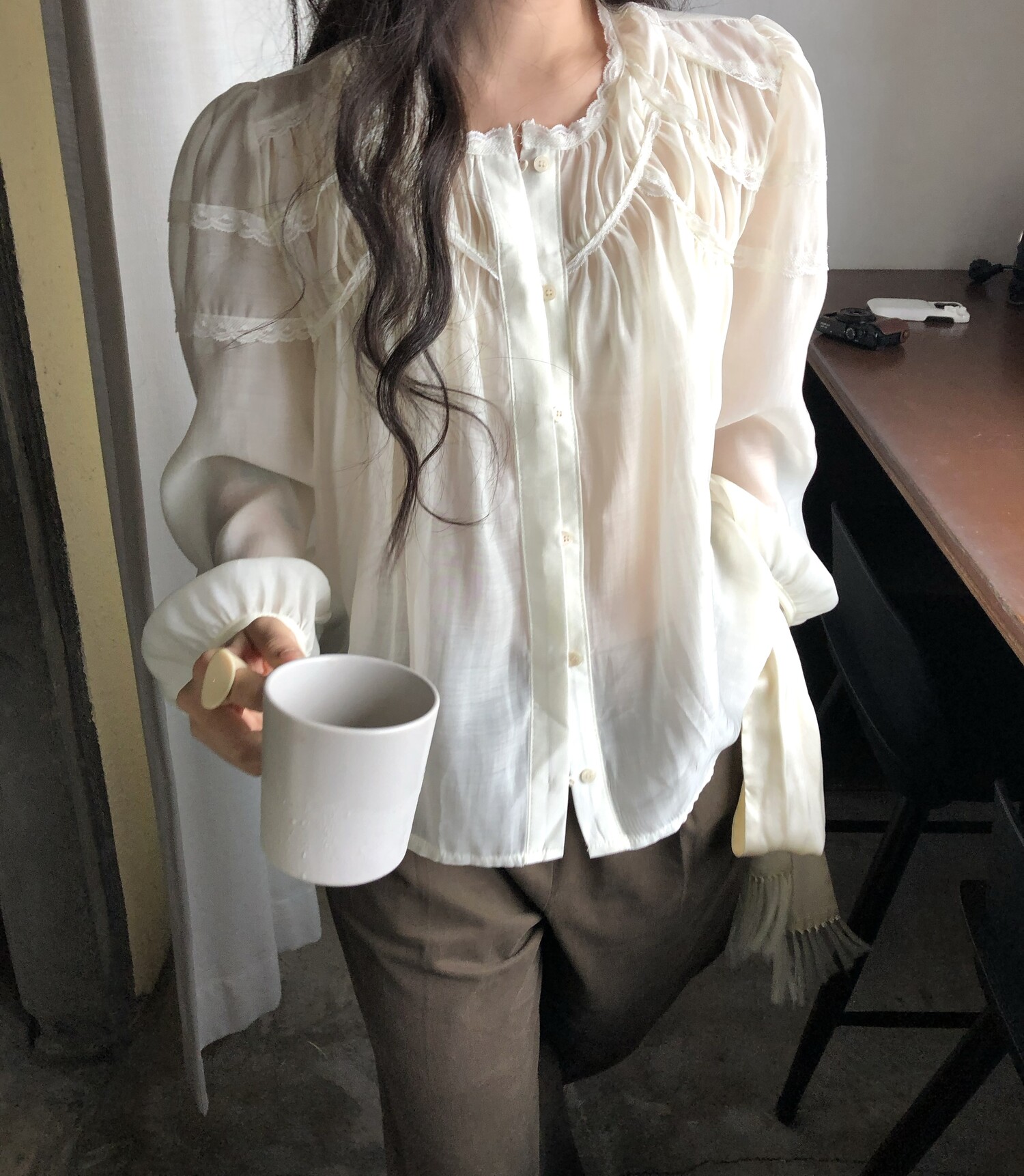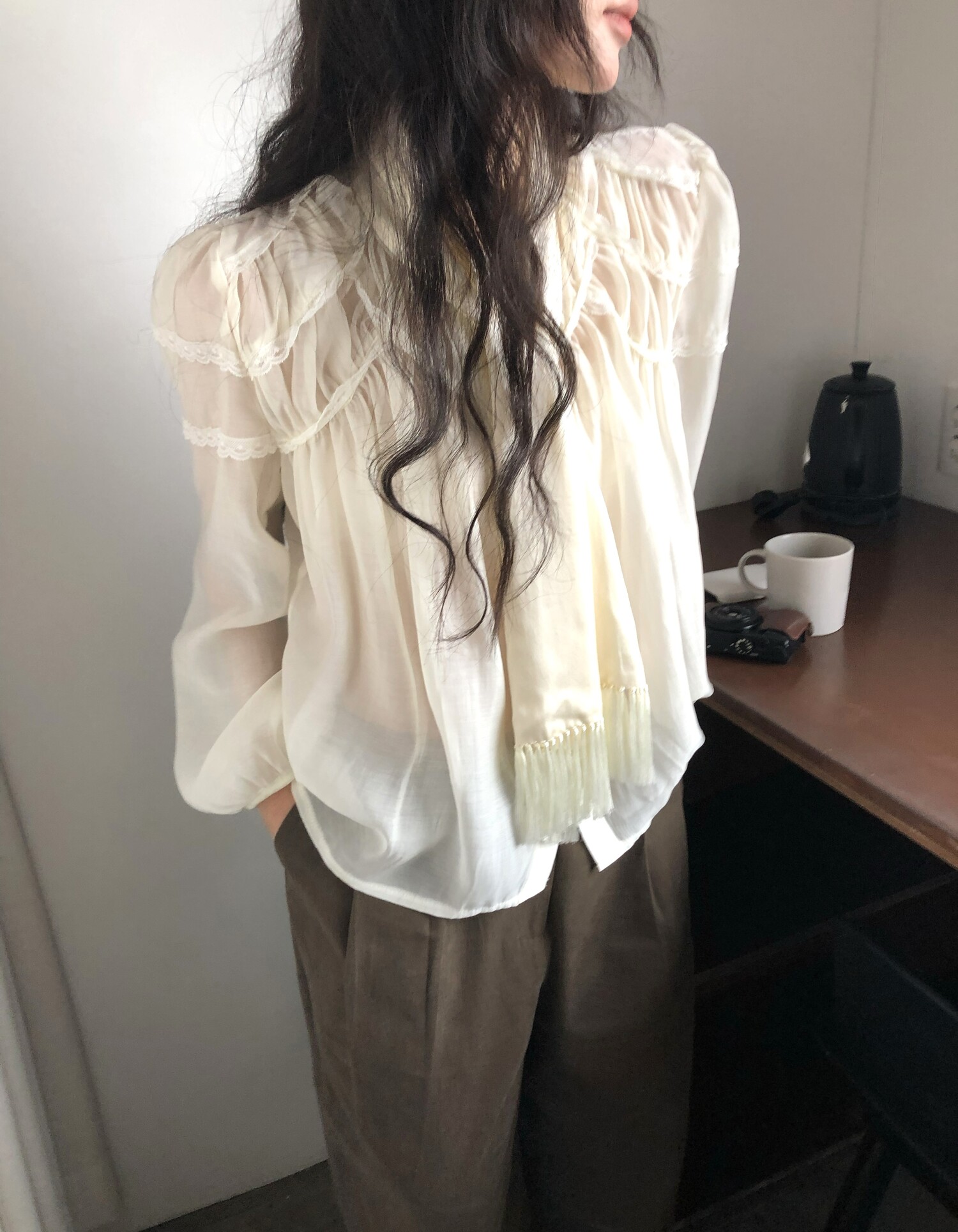 레몬 크림빛 색상으로 피부를 화사하게 밝혀주며 레이스와 셔링의 디테일이 더욱 러블리하게 연출해줍니다.