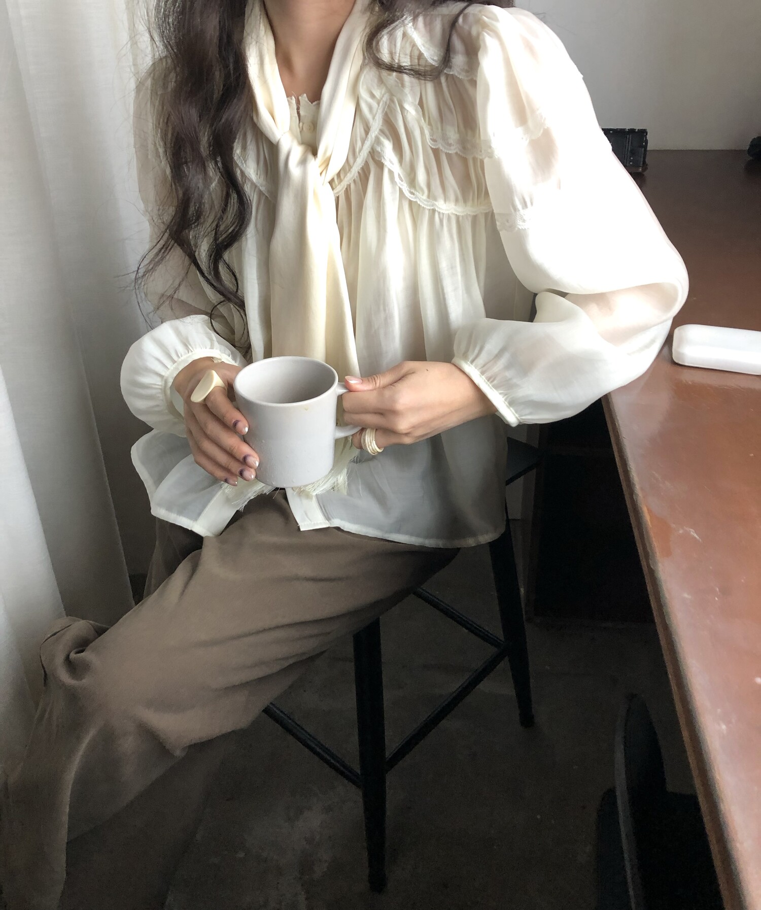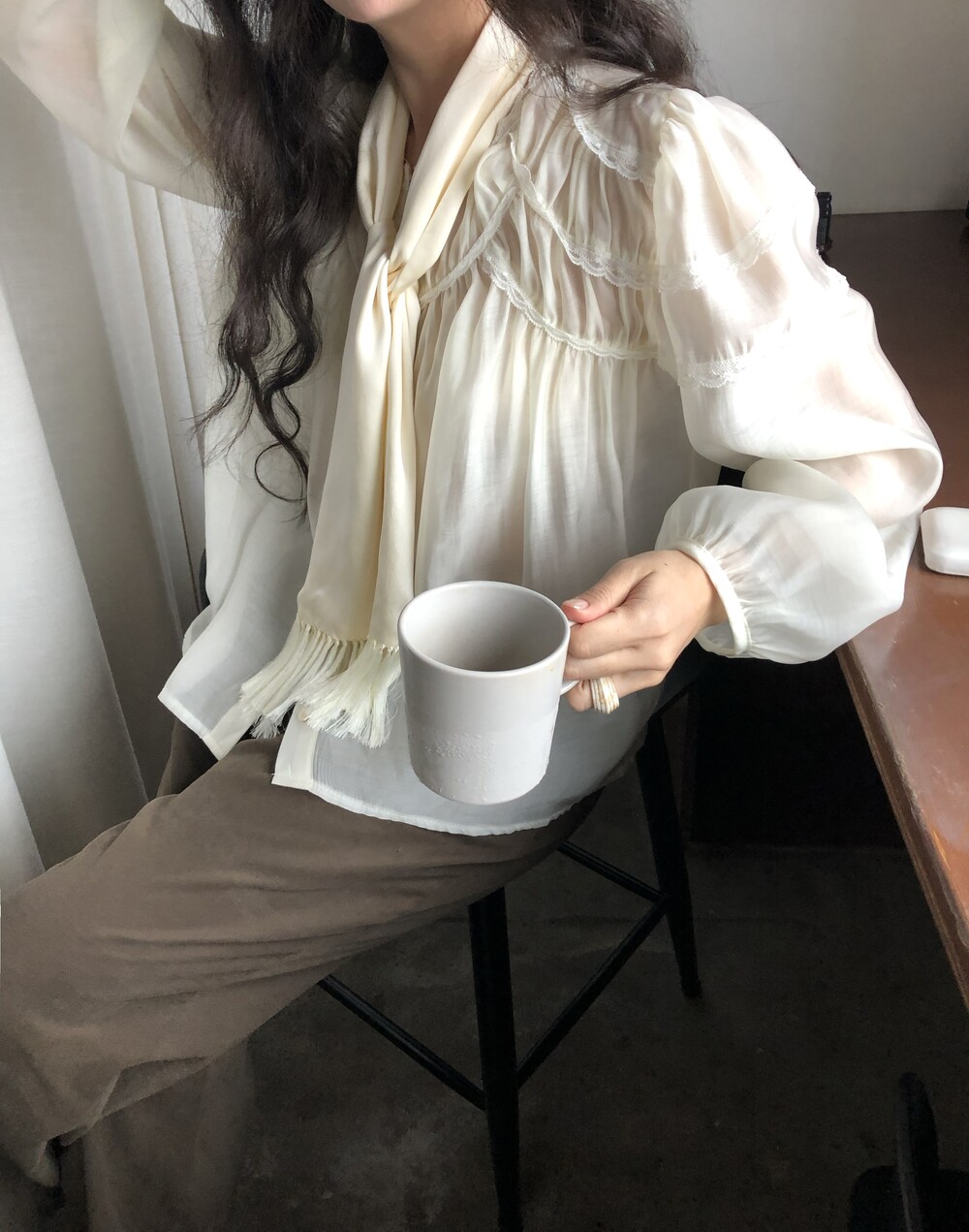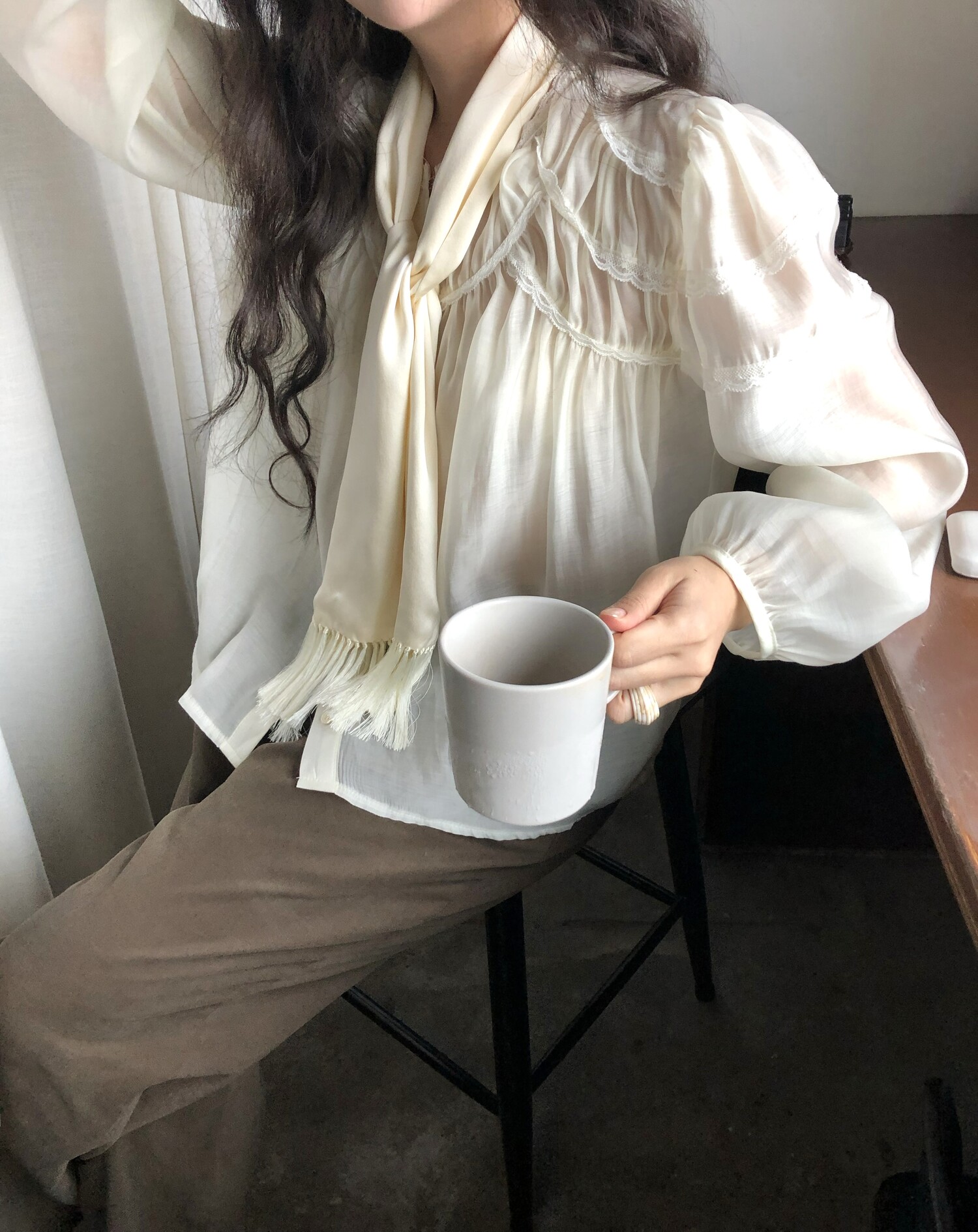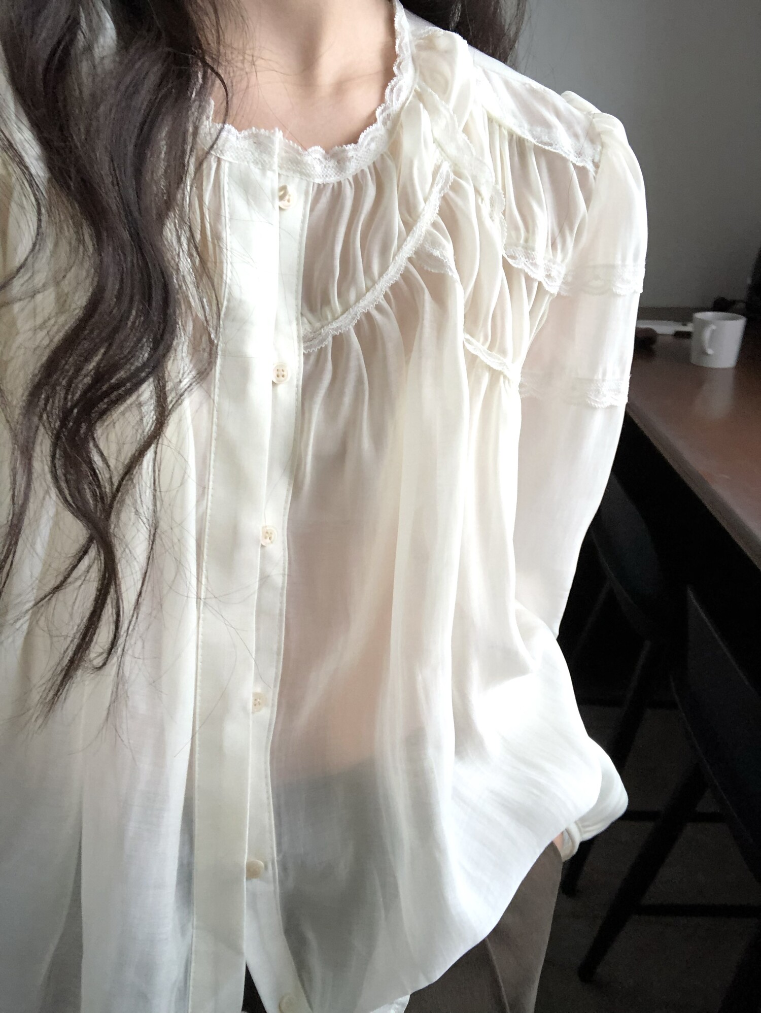 레몬 크림빛 색상으로 피부를 화사하게 밝혀주며 레이스와 셔링의 디테일이 더욱 러블리하게 연출해줍니다.
