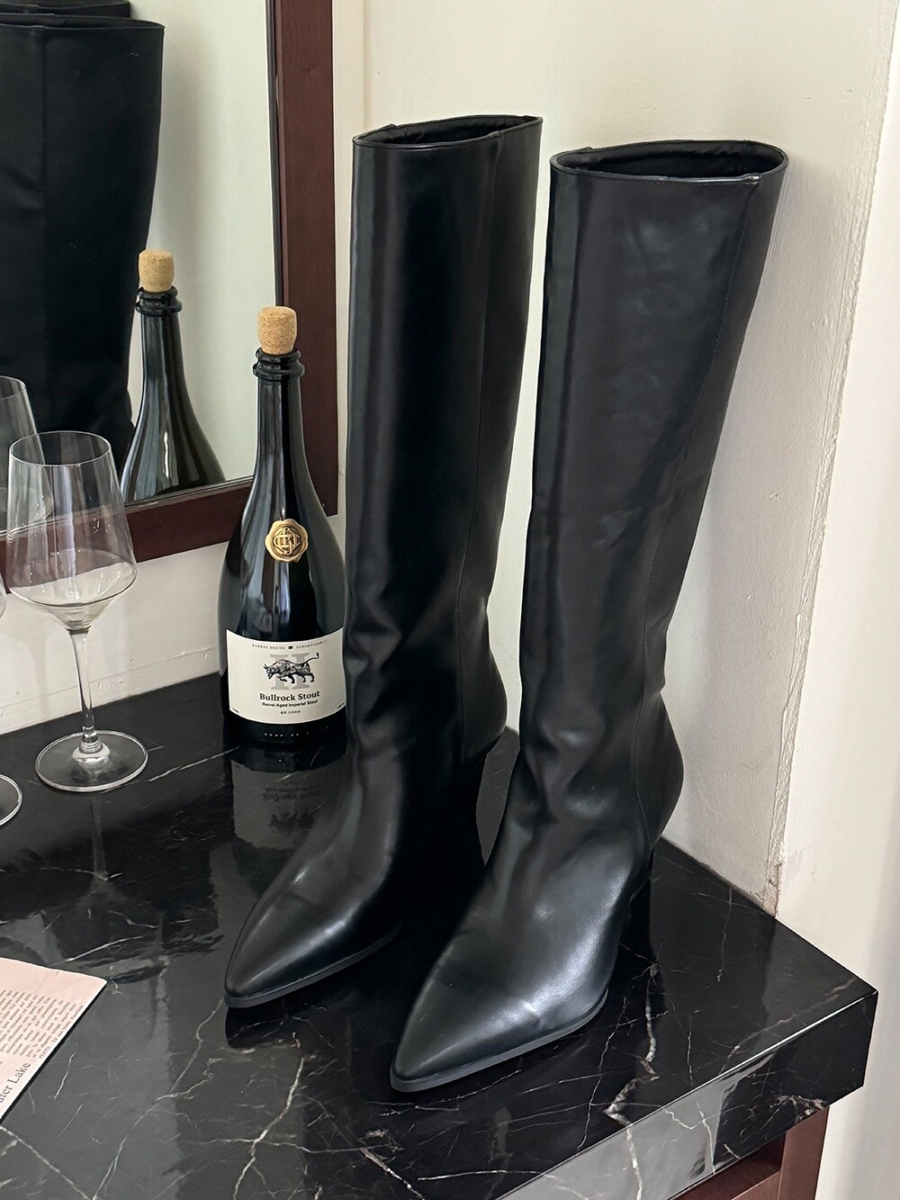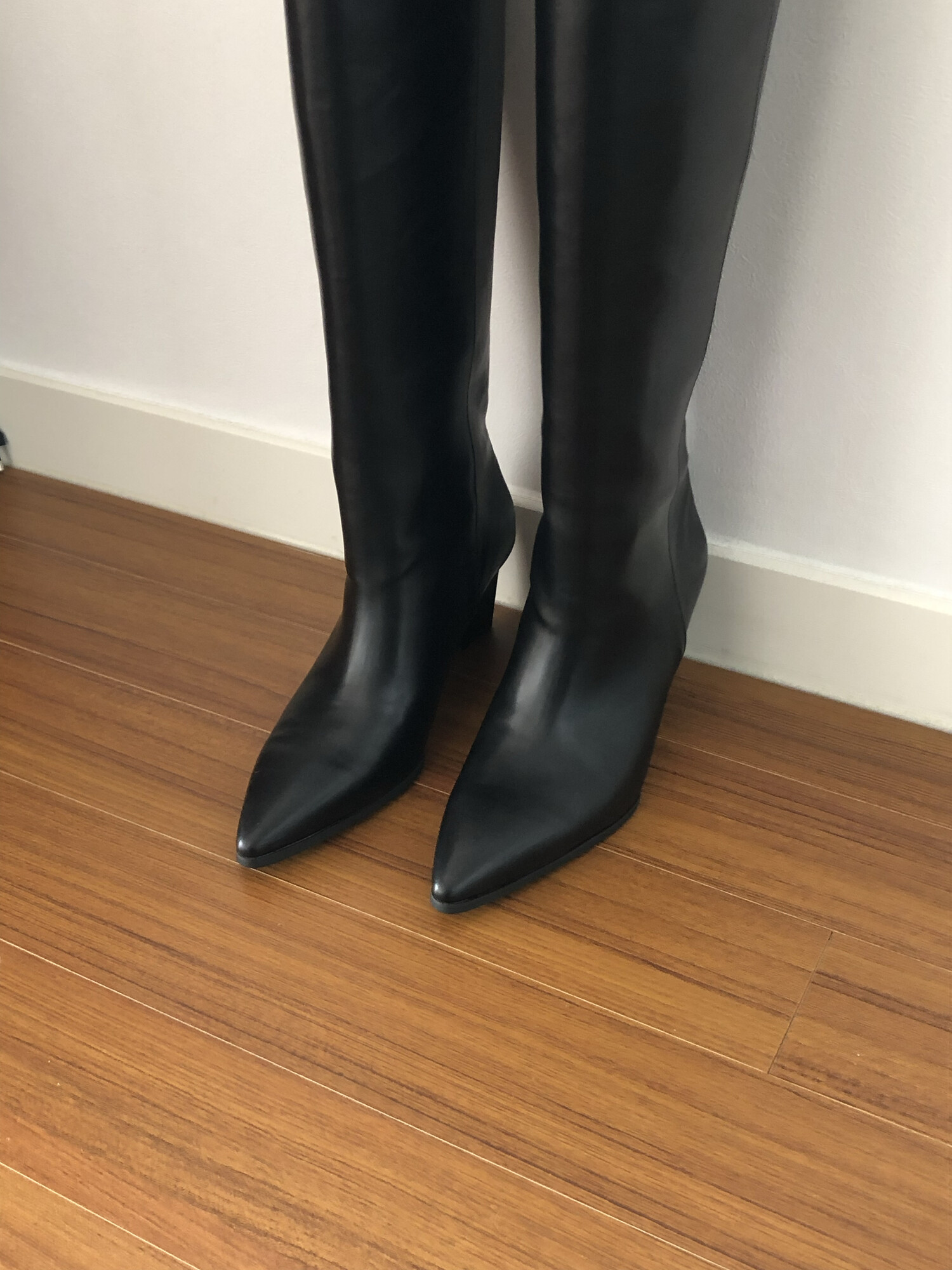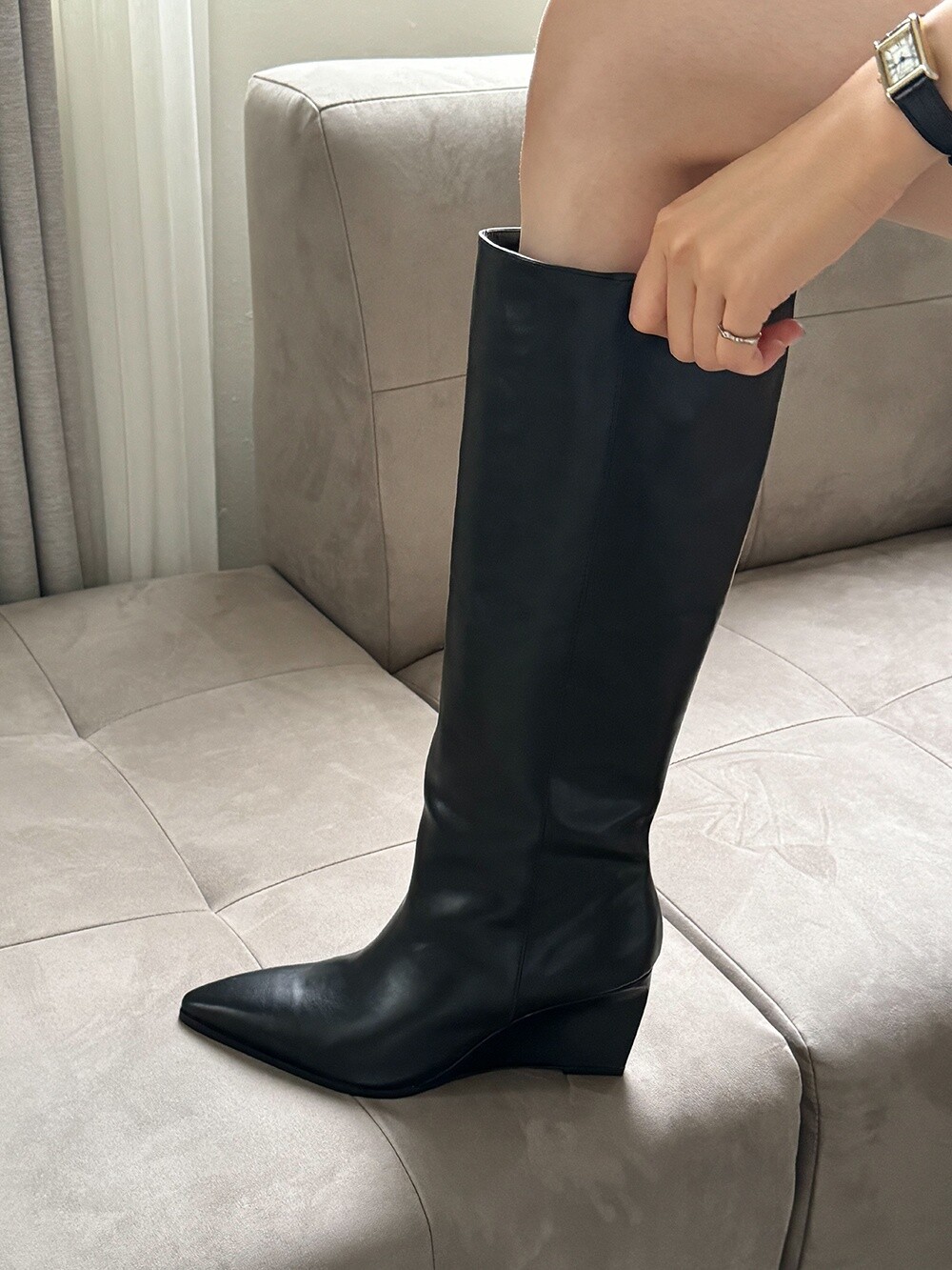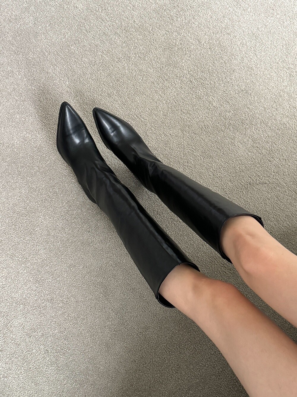 -다리를 슬림하게 연출해주는 군더더기 없이 깔끔한 쉐잎의 스틸레토 롱부츠