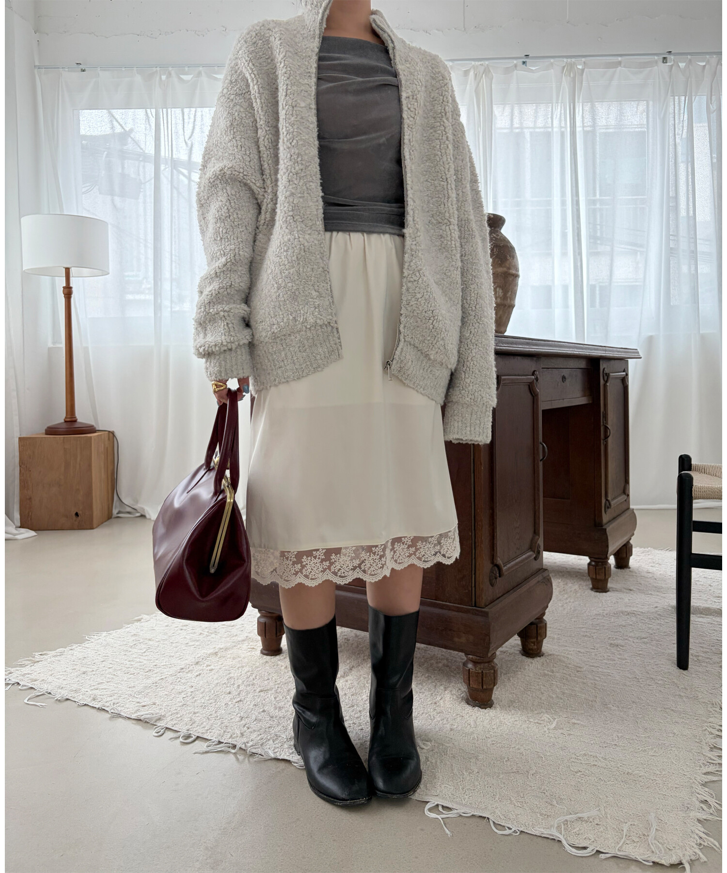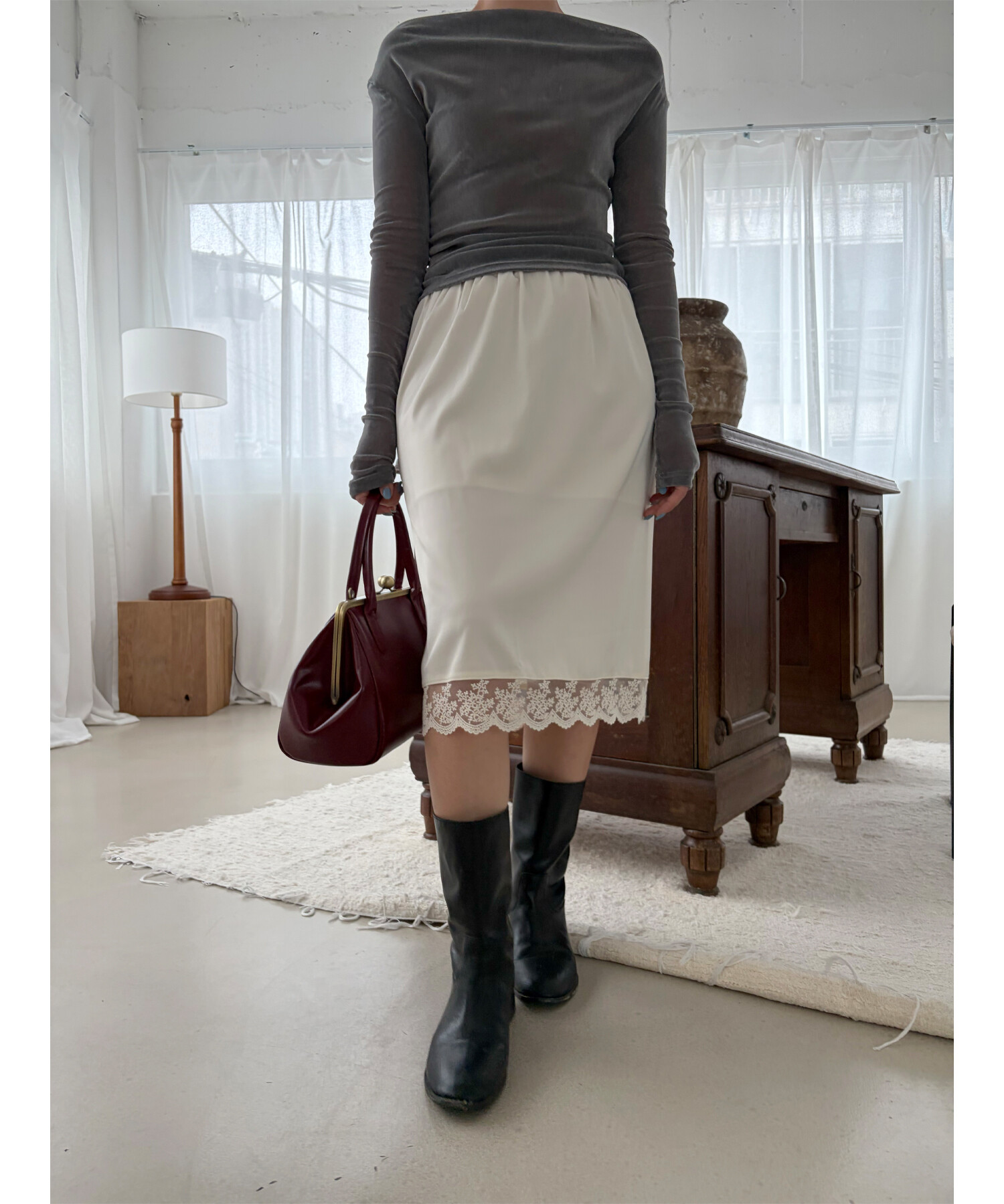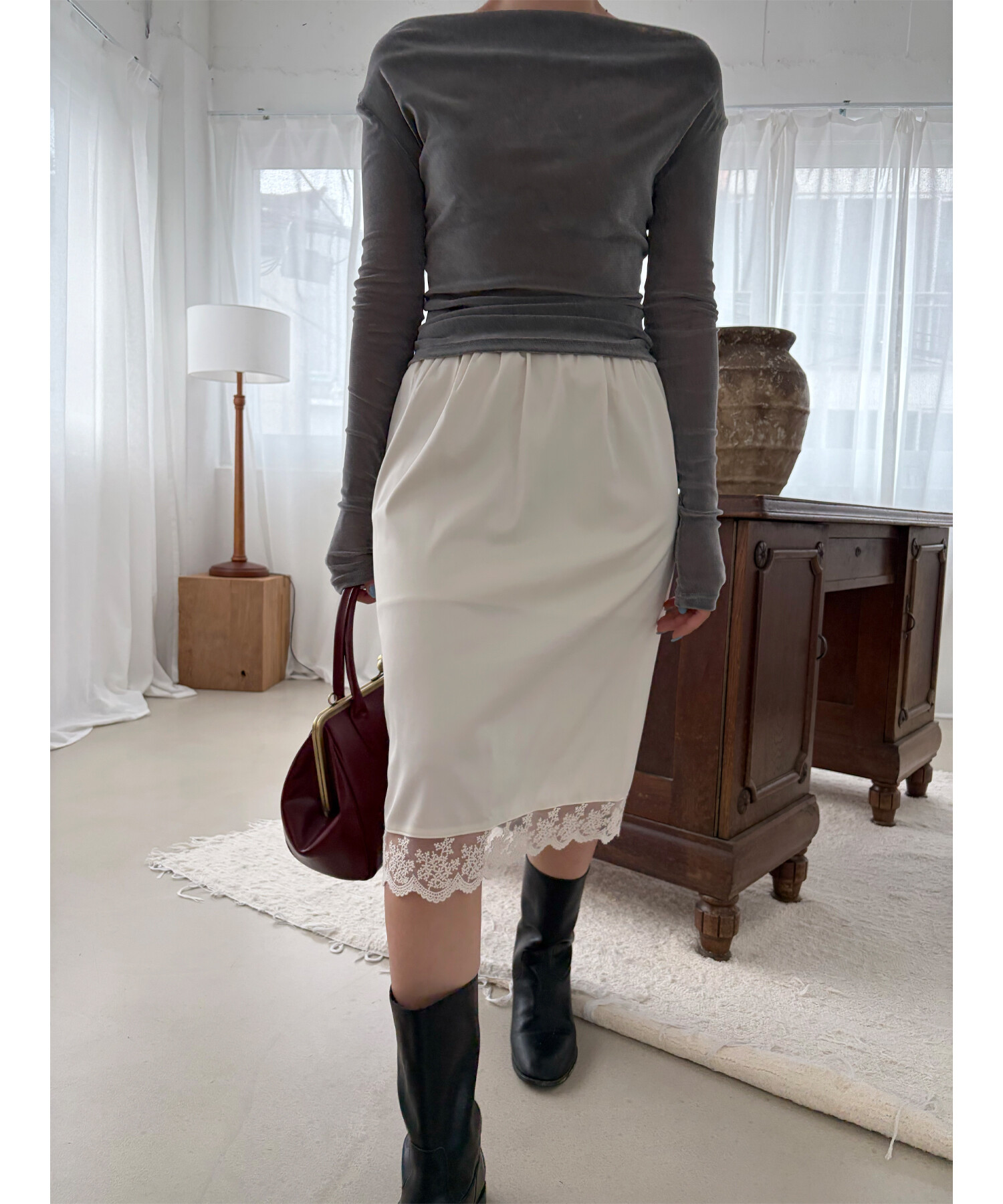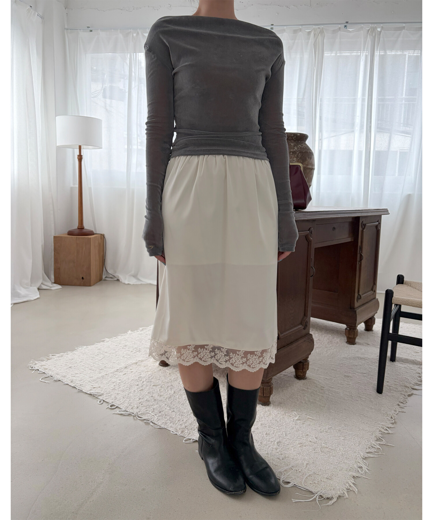 -탄탄한 벨로아 소재로 바디에 핏되어 슬림하게 연출