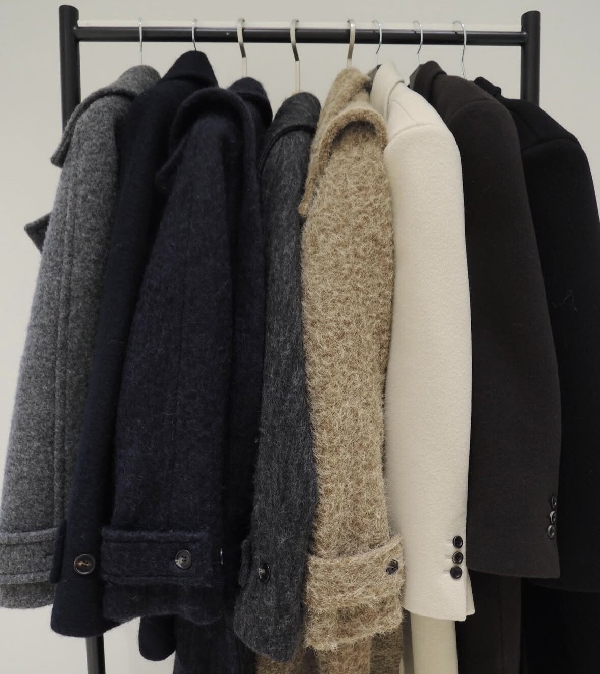 맨 왼쪽 걸린 하프코트 두장 제외 navy-charcoal-camel 순서입니다.