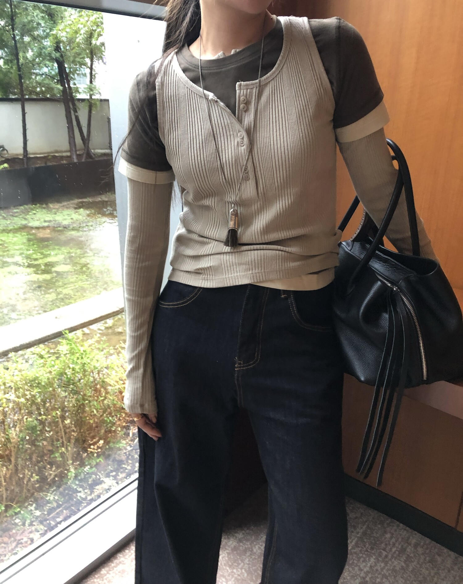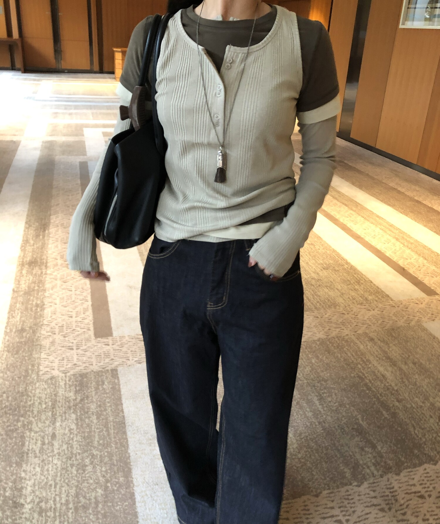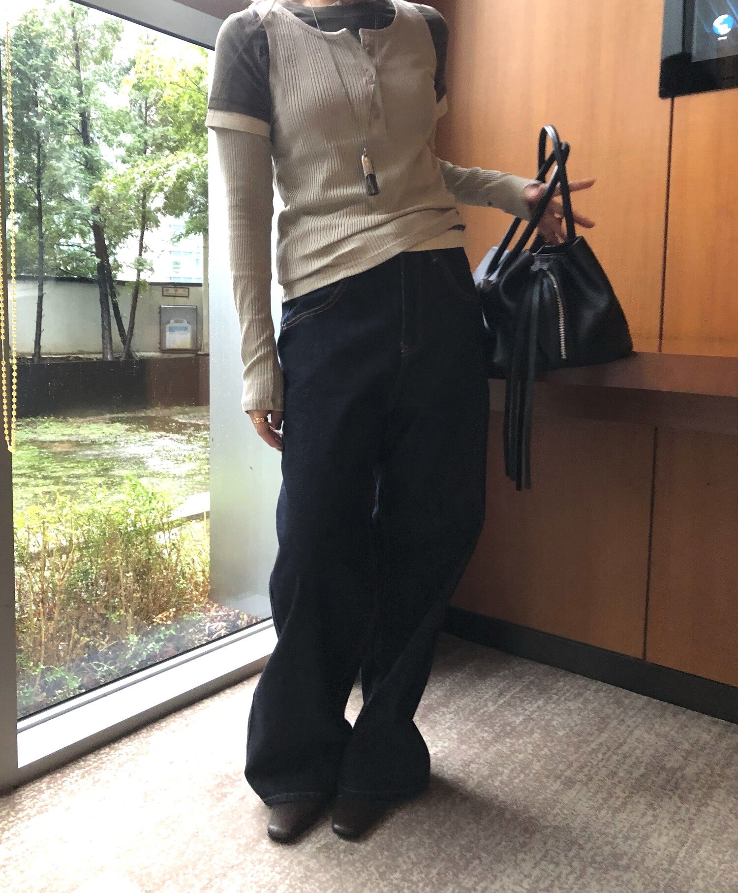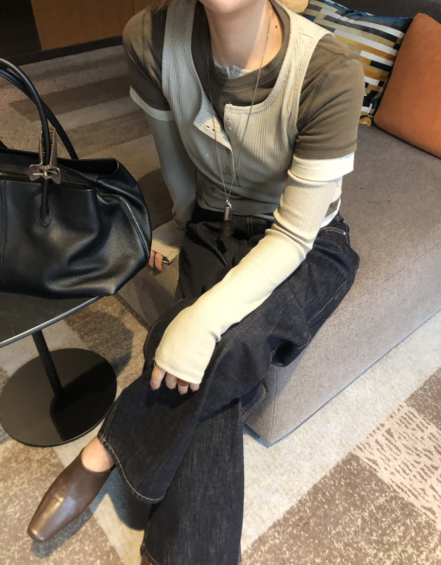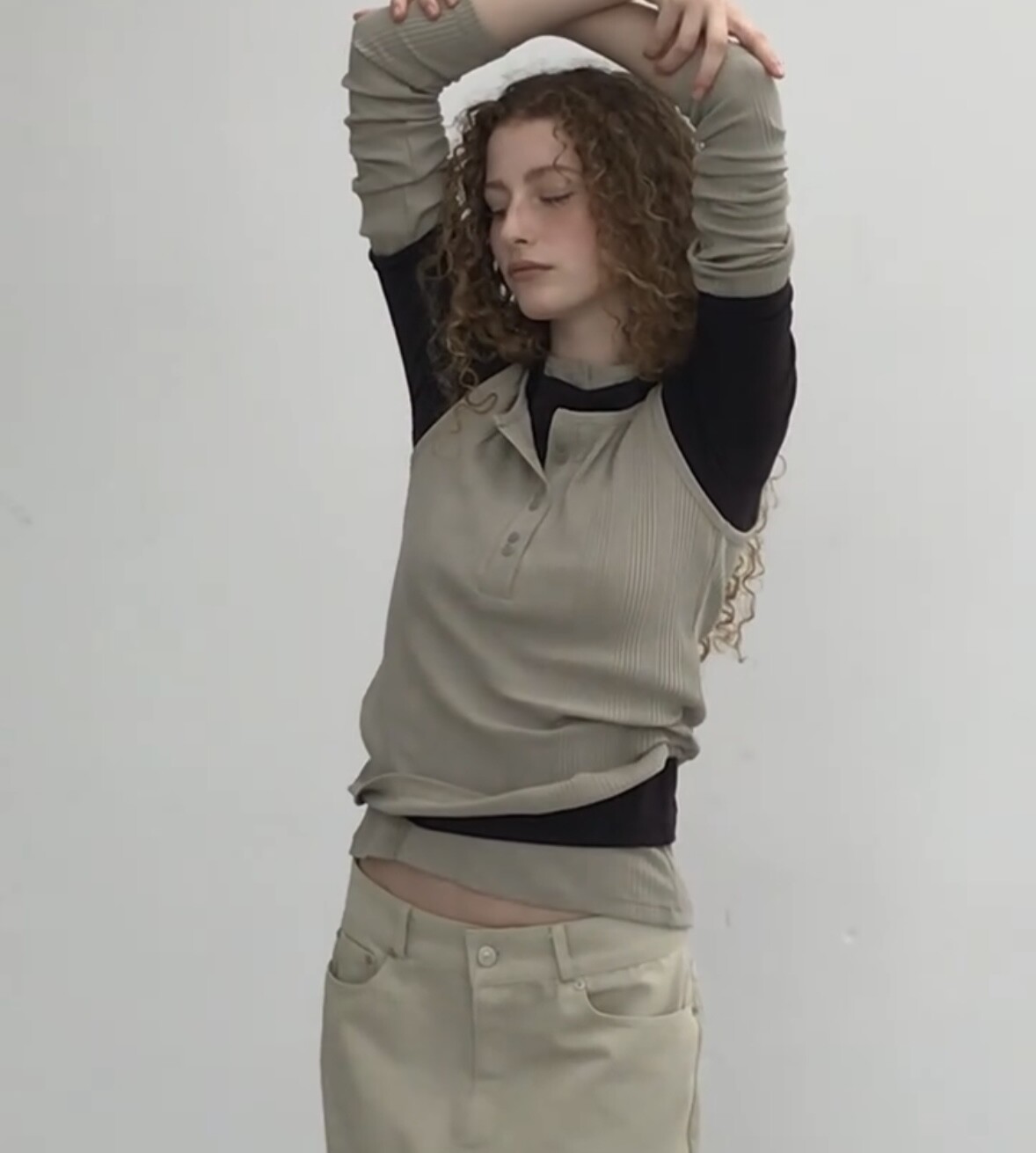 Button pleats sleeveless(beige)+Layered peach t(khaki) 셋업으로 착용