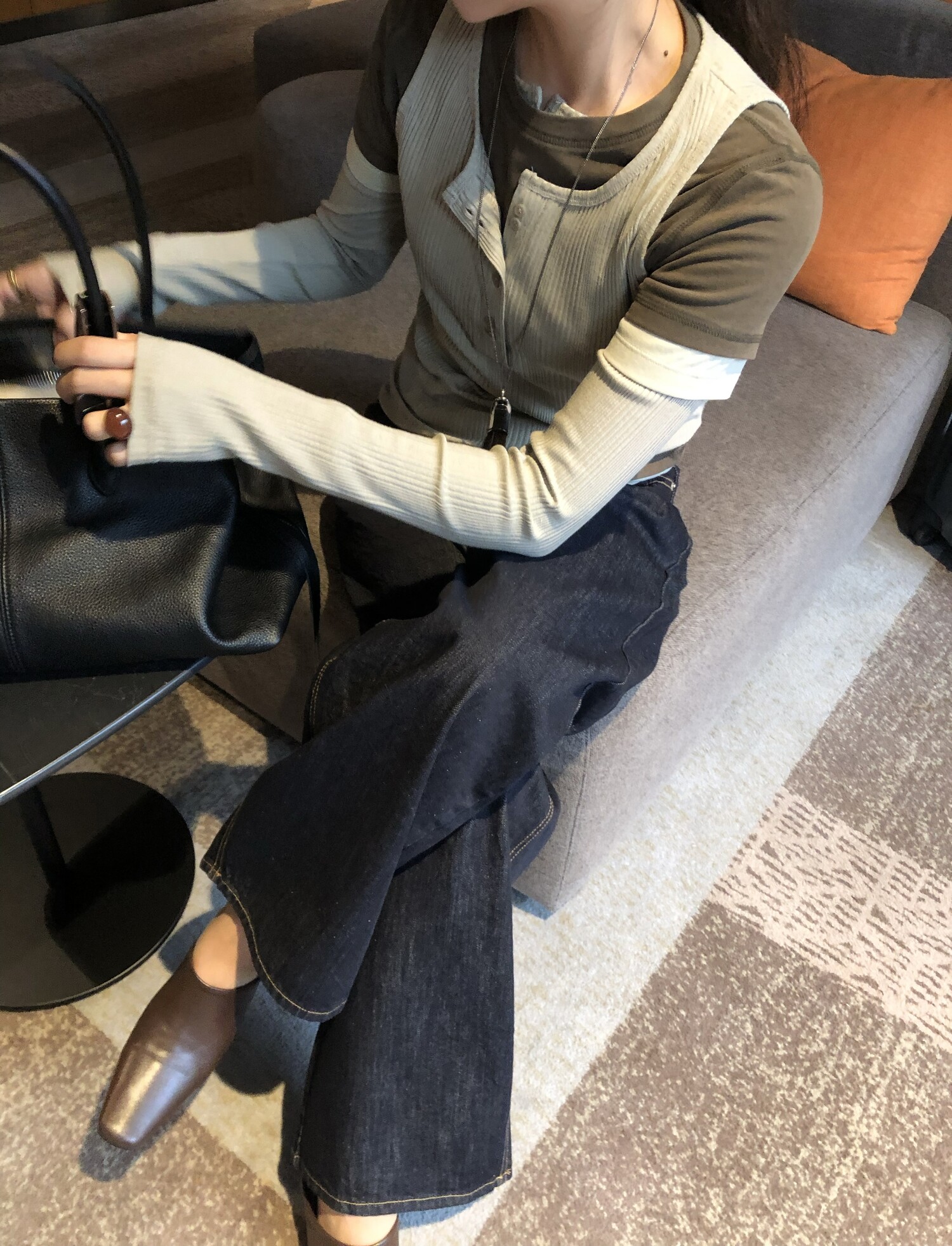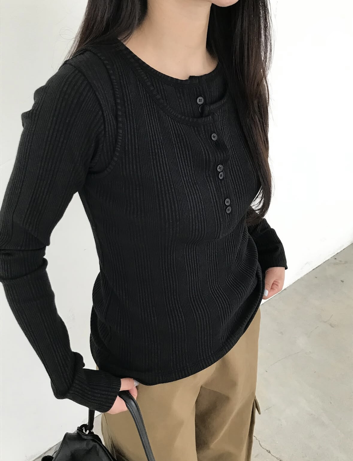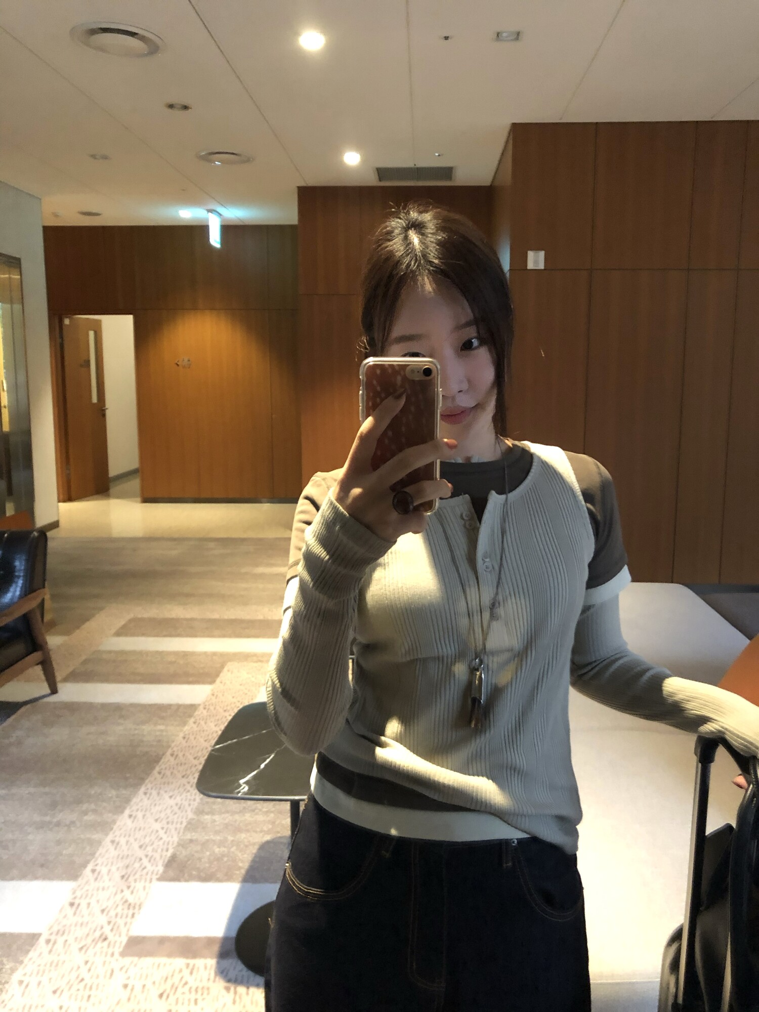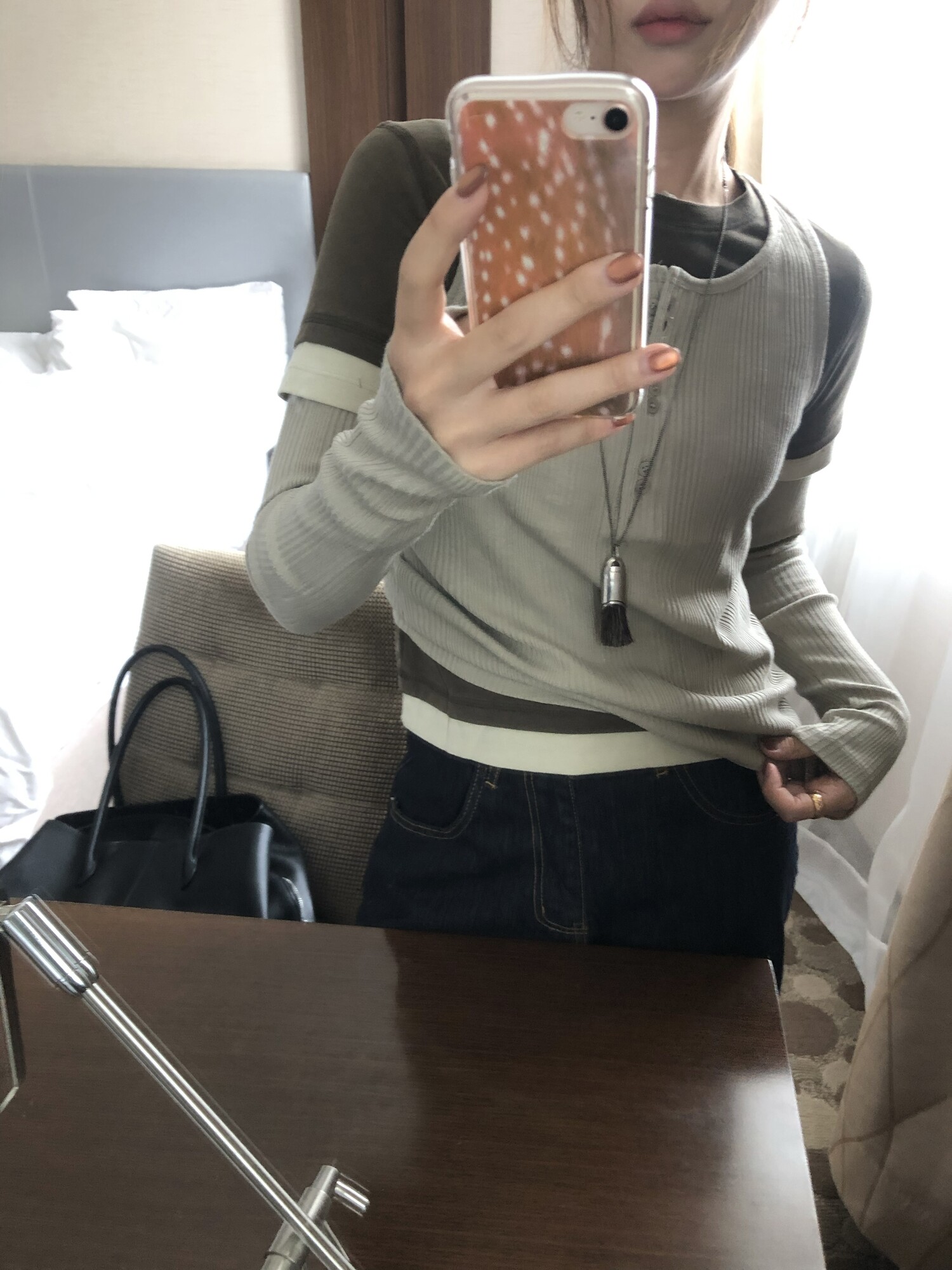 Button pleats sleeveless(beige)+Layered peach t(khaki) 셋업으로 착용