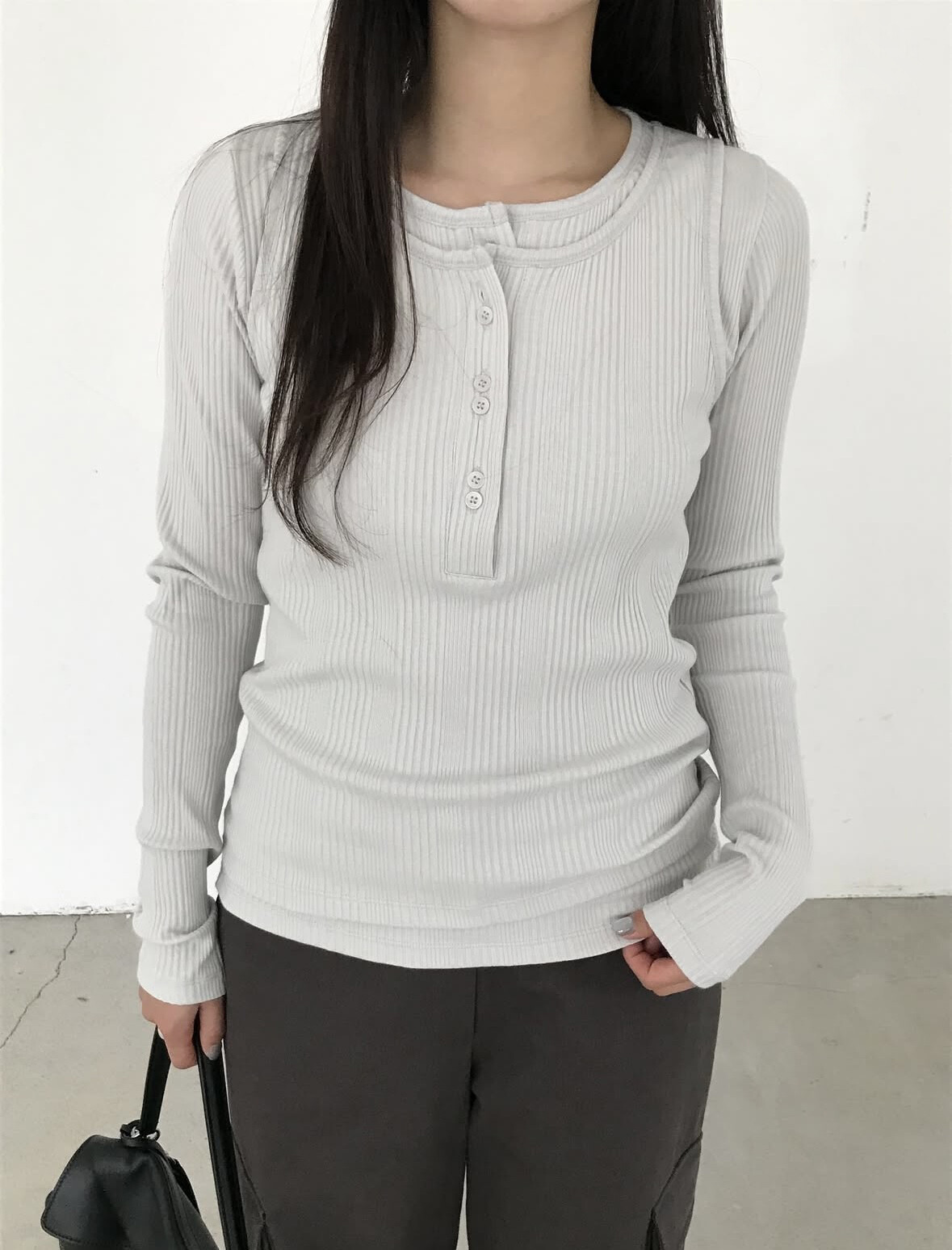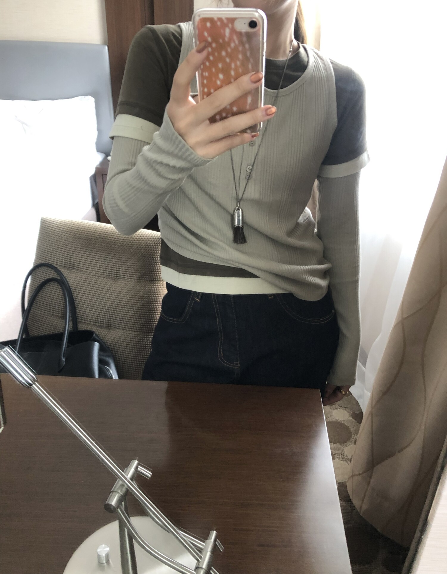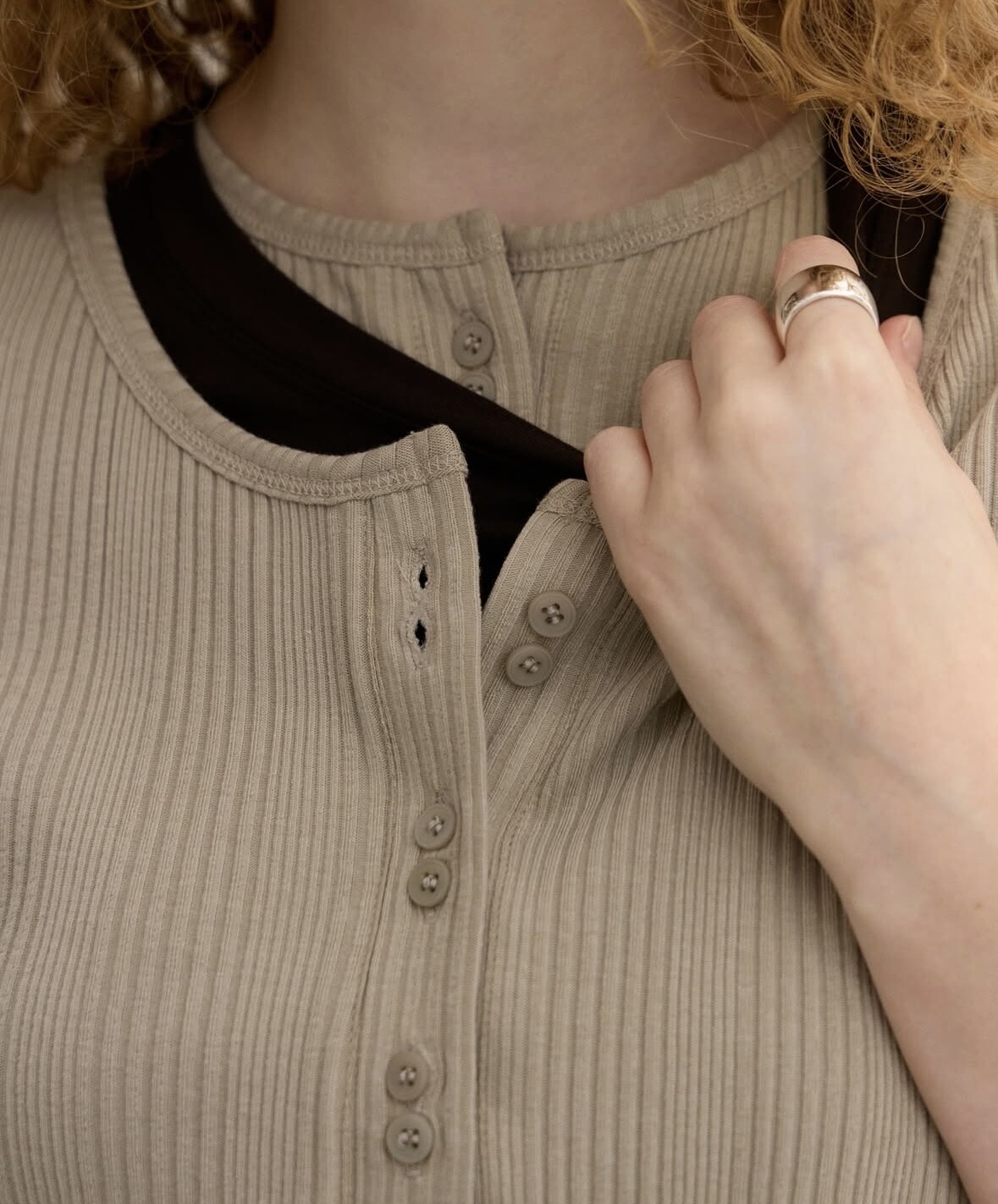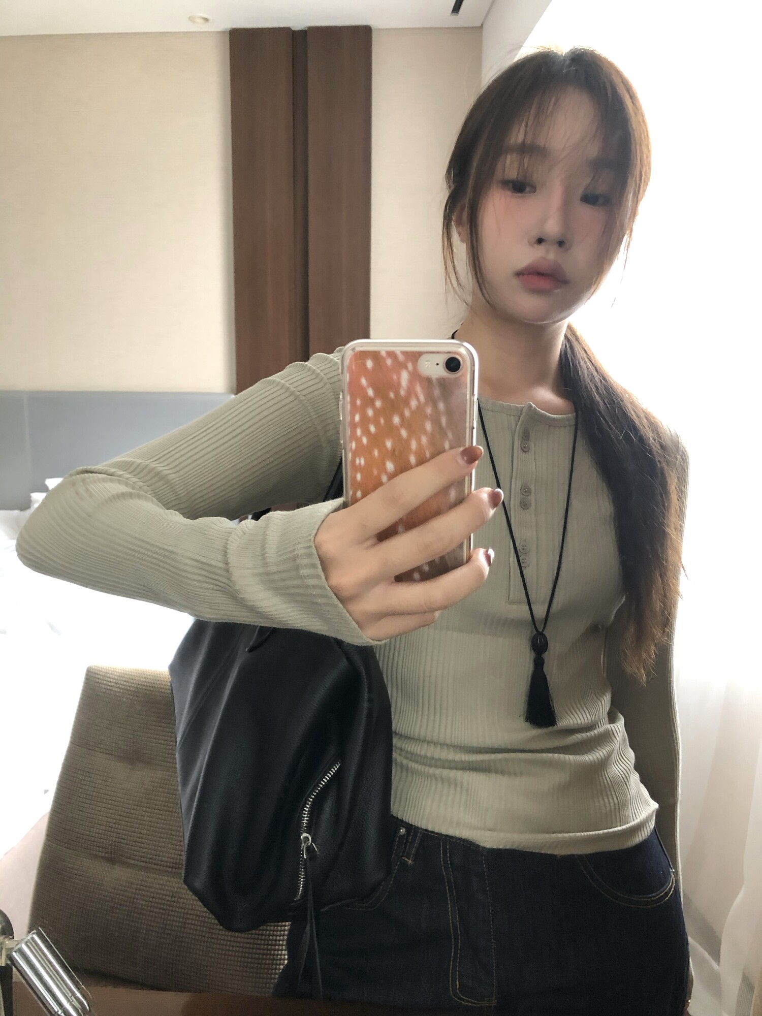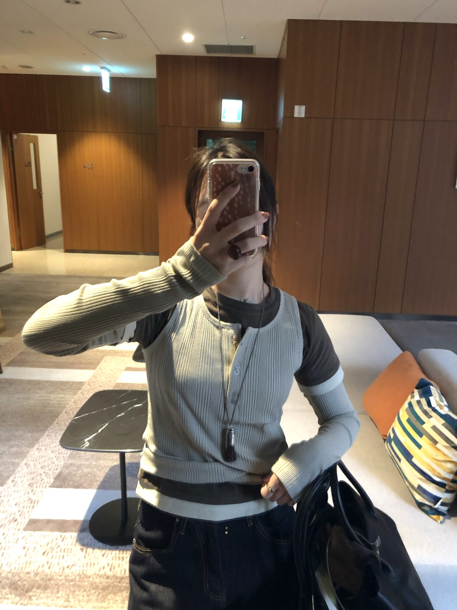 Button pleats sleeveless(beige)+Layered peach t(khaki) 셋업으로 착용