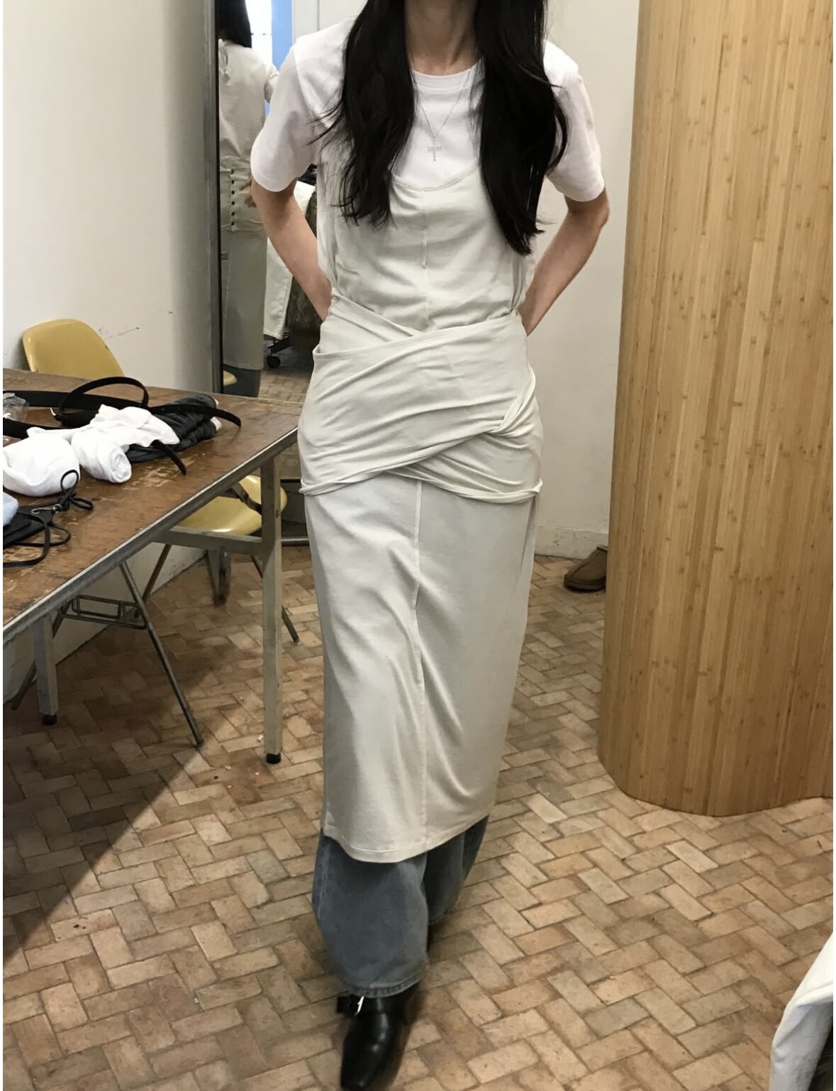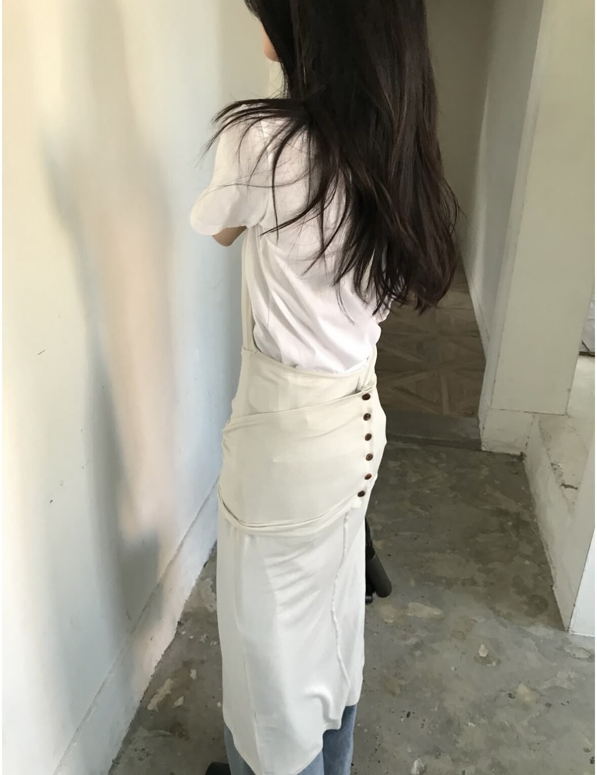-허리부분 양쪽 넓고 긴 끈을 교차시켜 뒤로 버튼 클로징하여 입는 방식입니다.