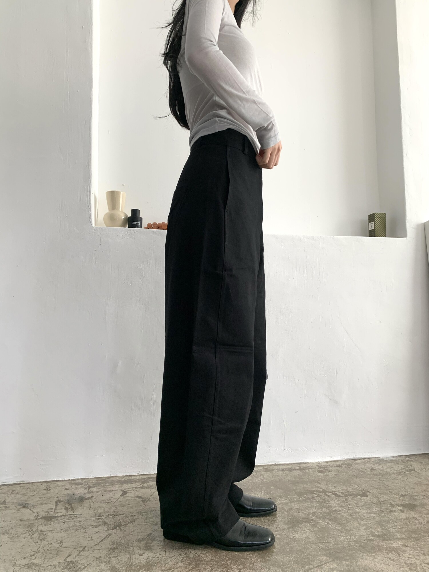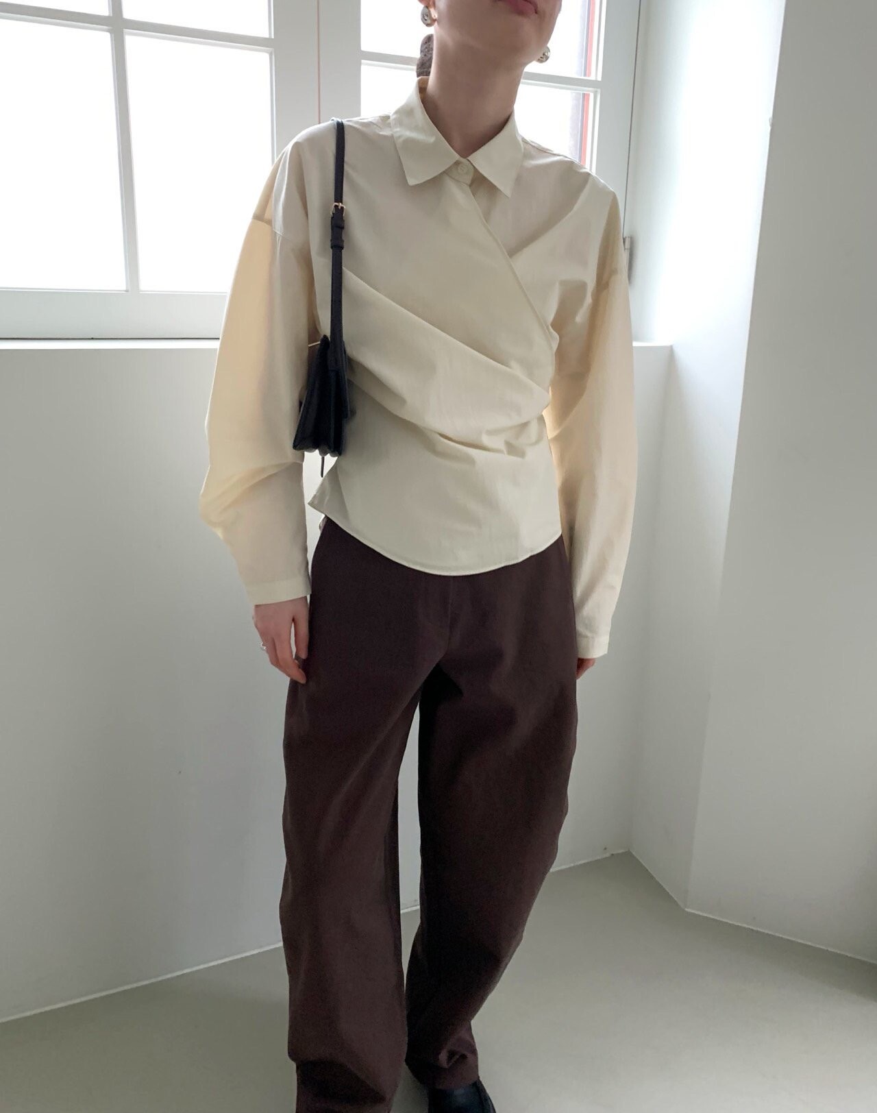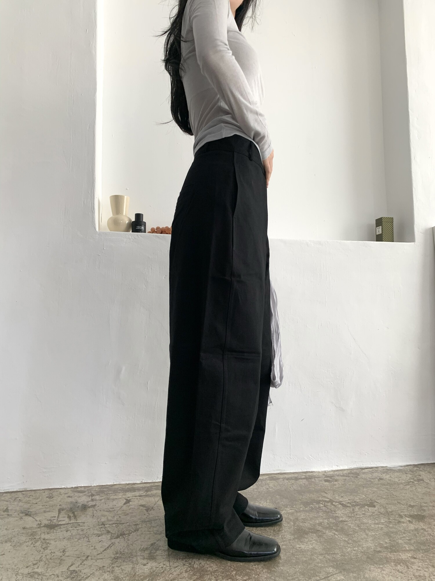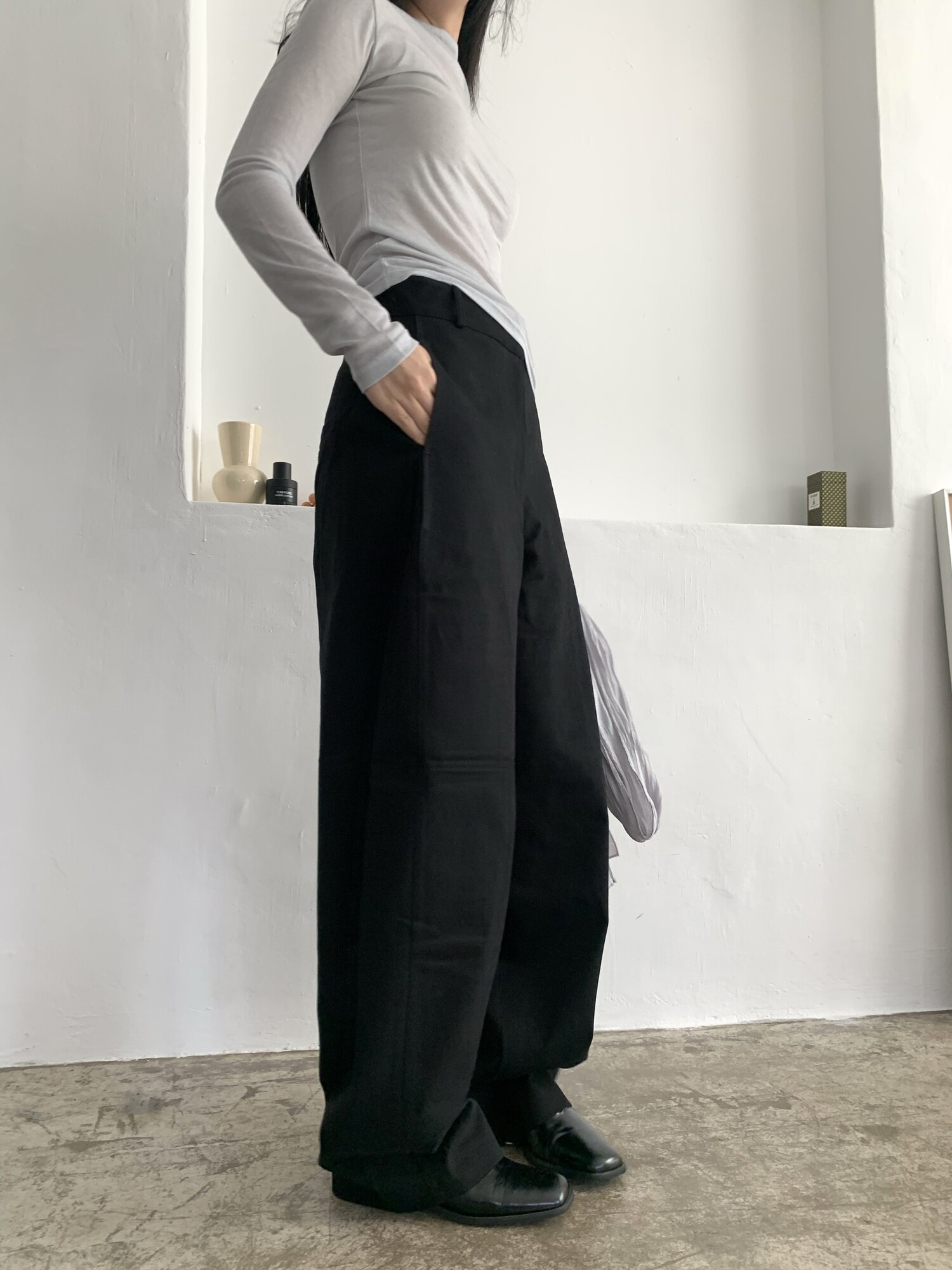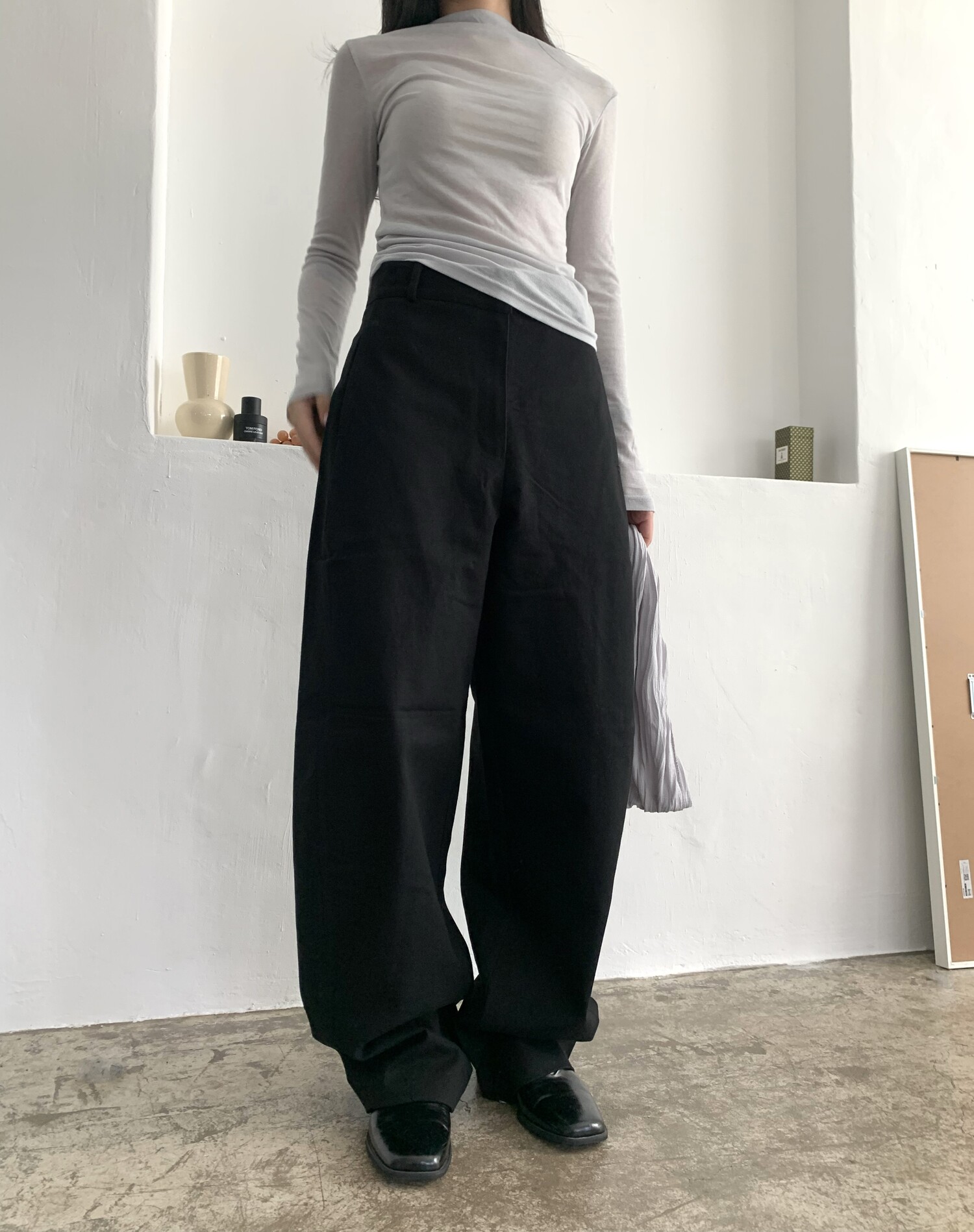 -전체적으로 와이드한 핏으로 중성적이면서도 세련된 무드를 연출