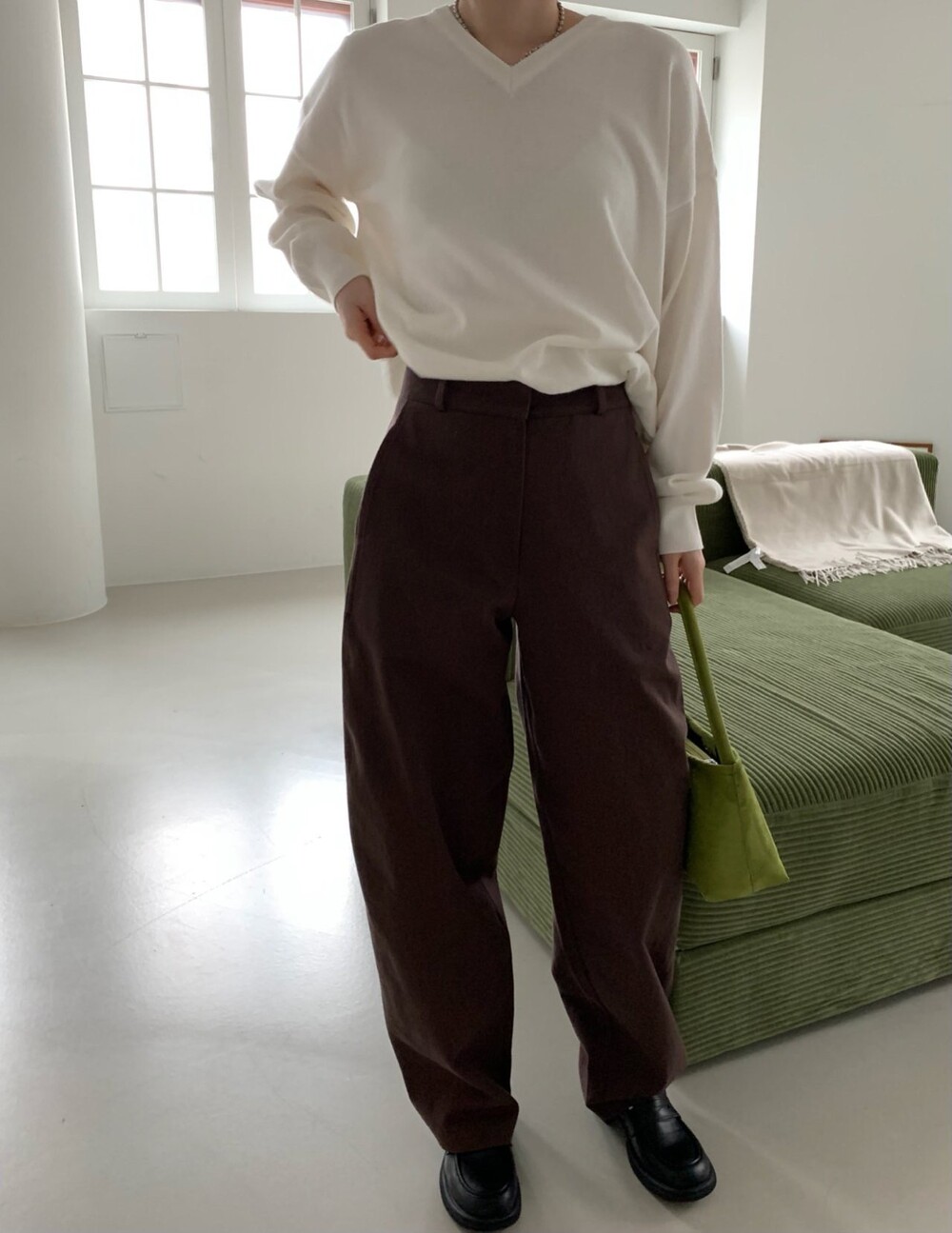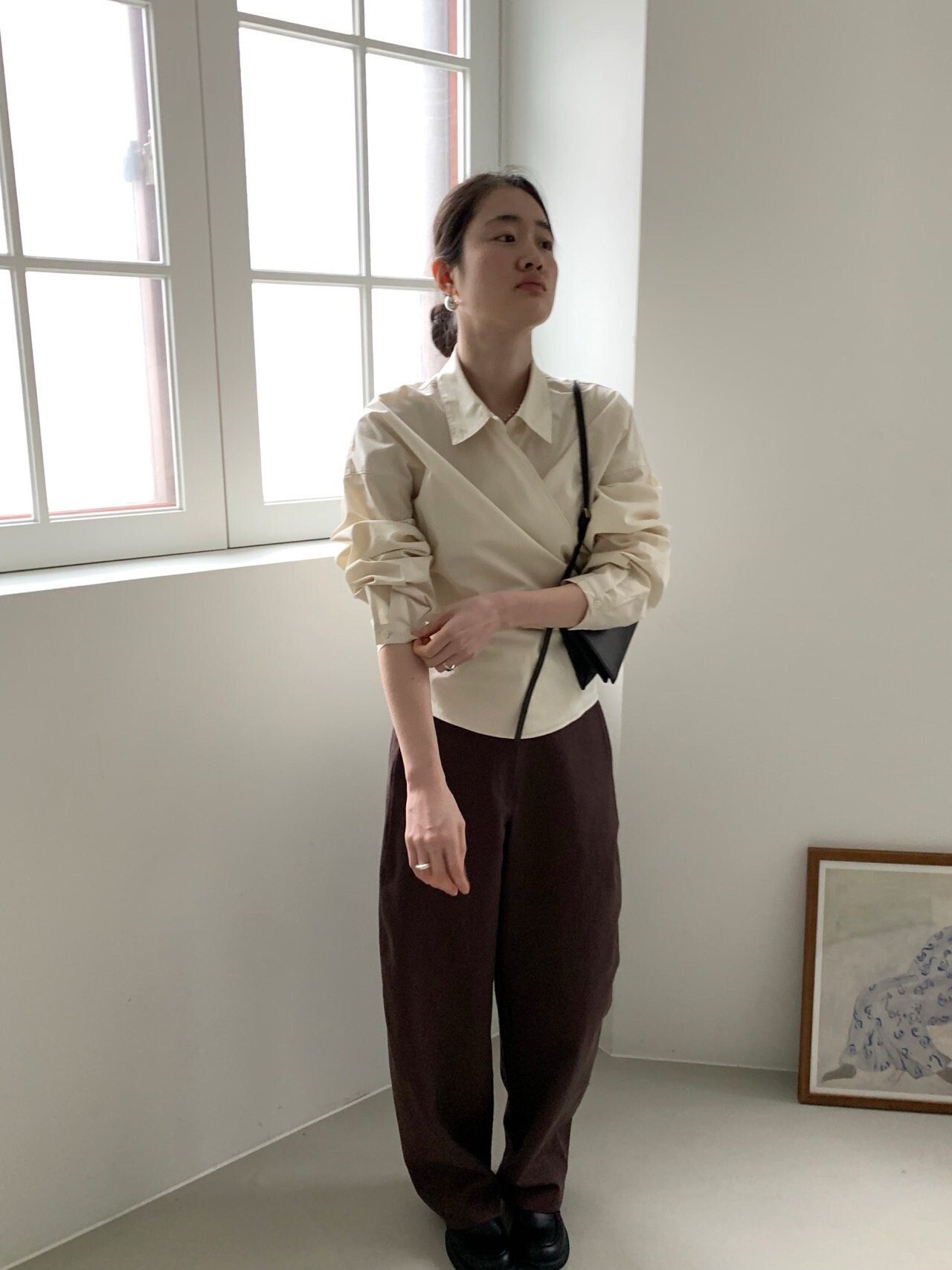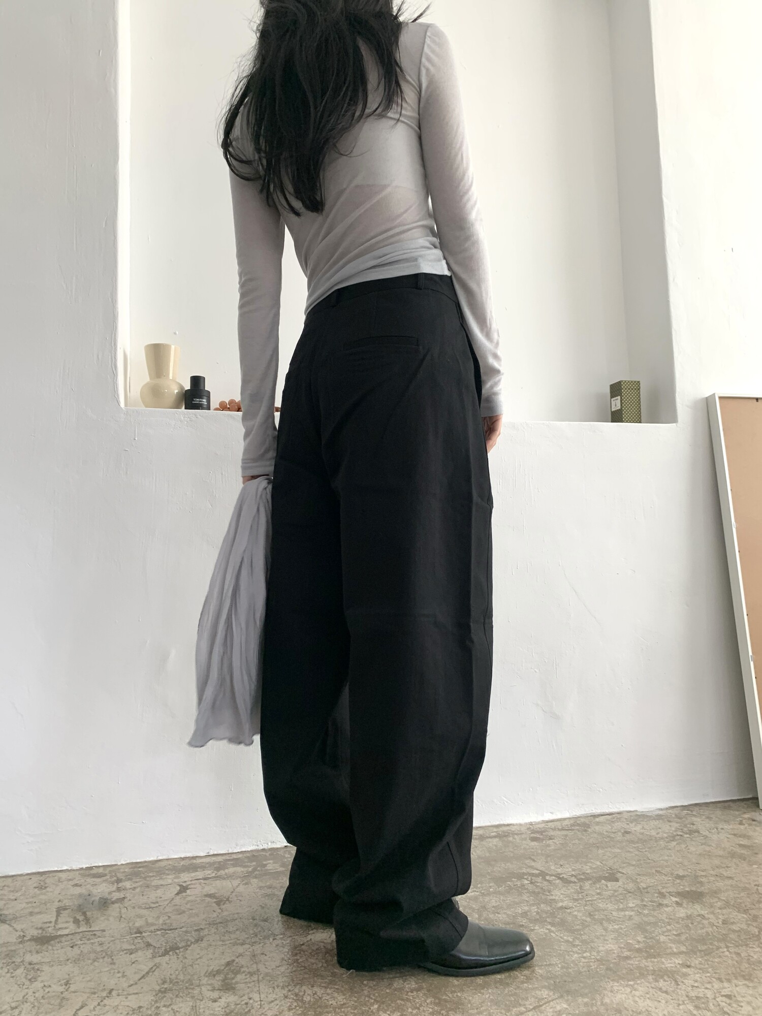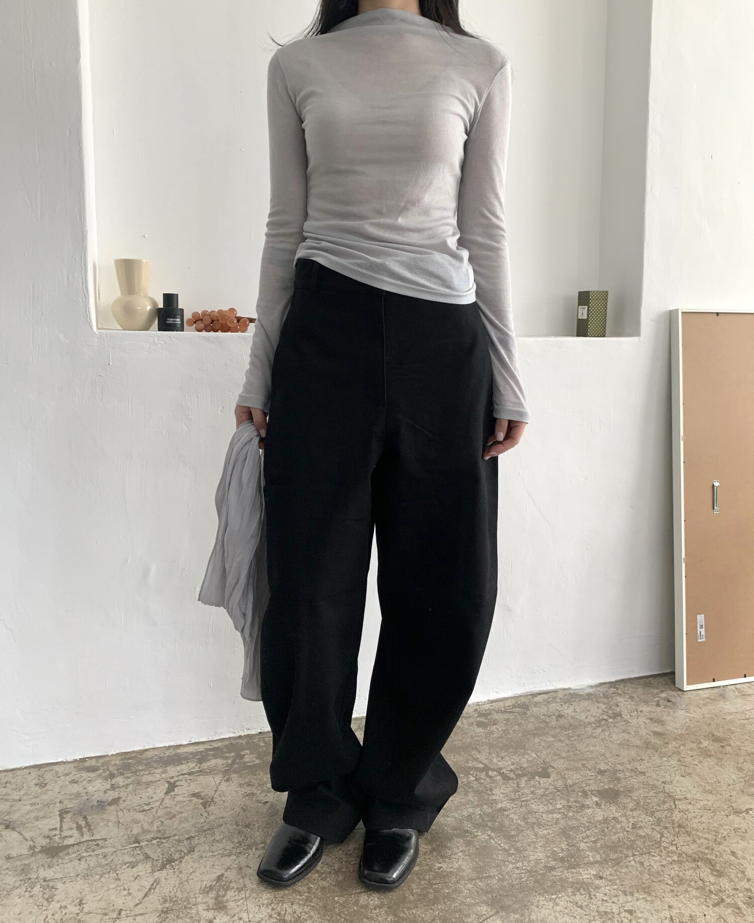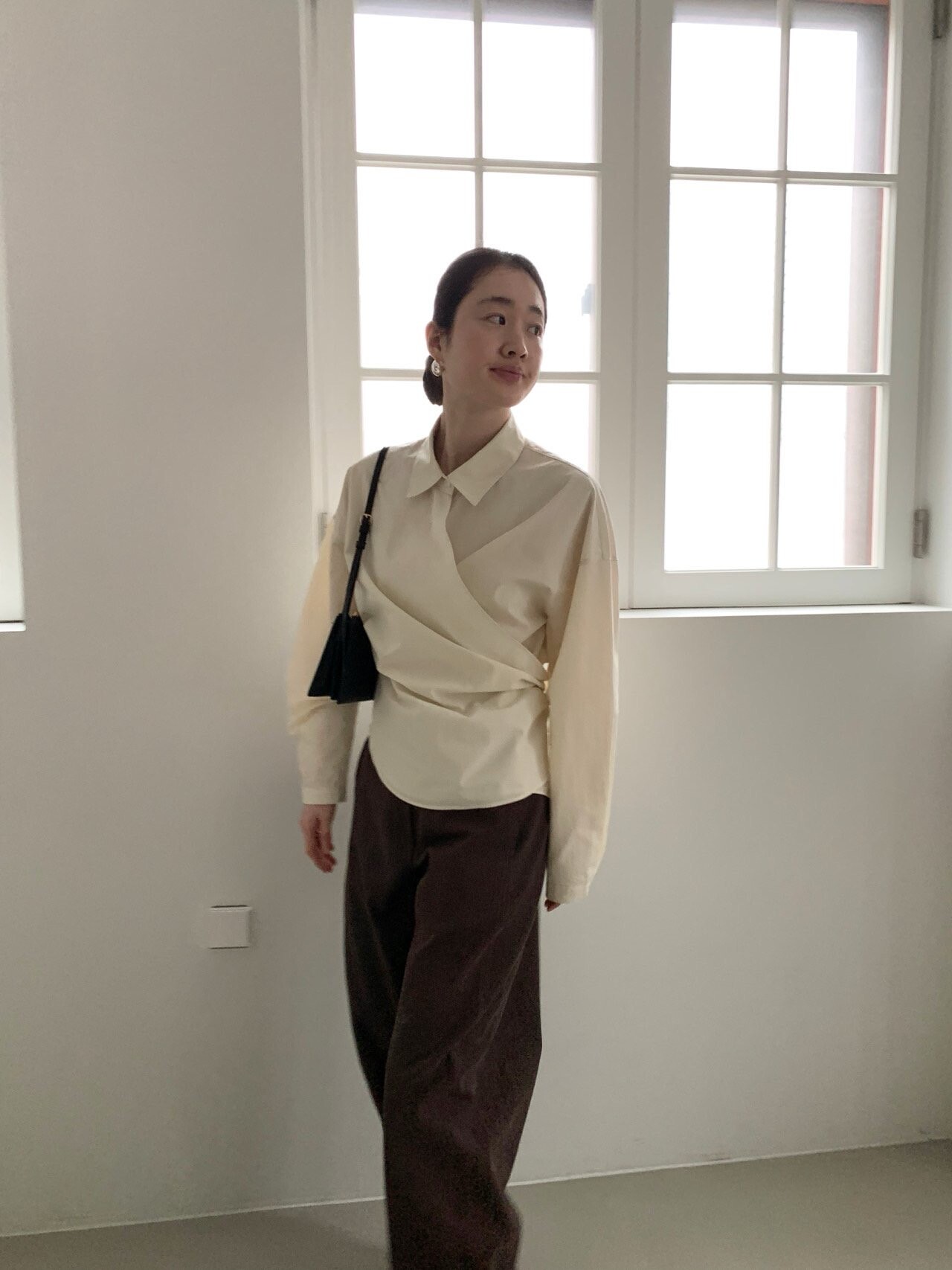 -전체적으로 와이드한 핏으로 중성적이면서도 세련된 무드를 연출