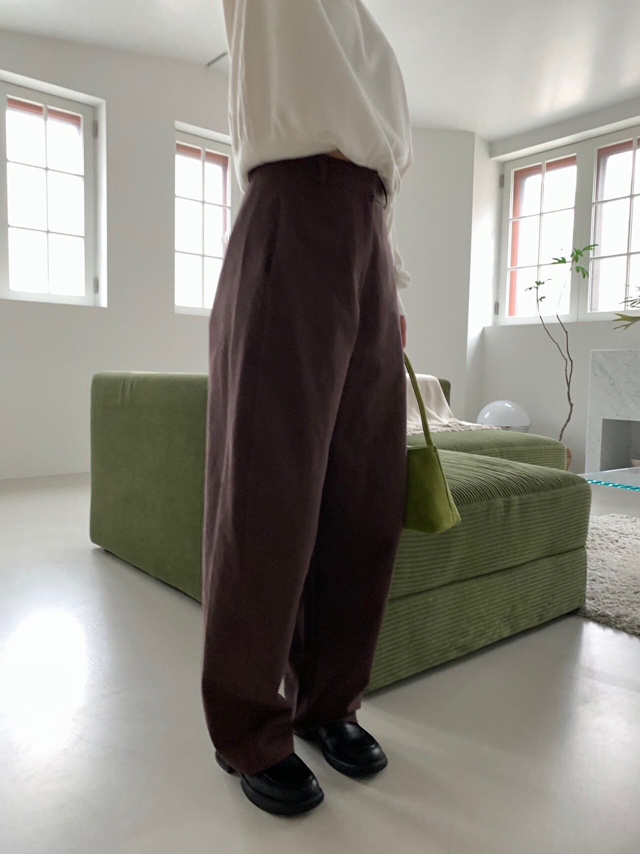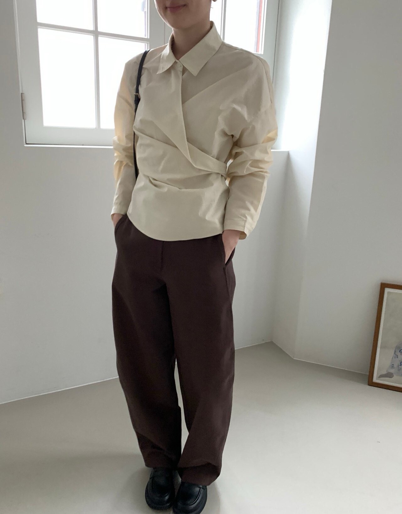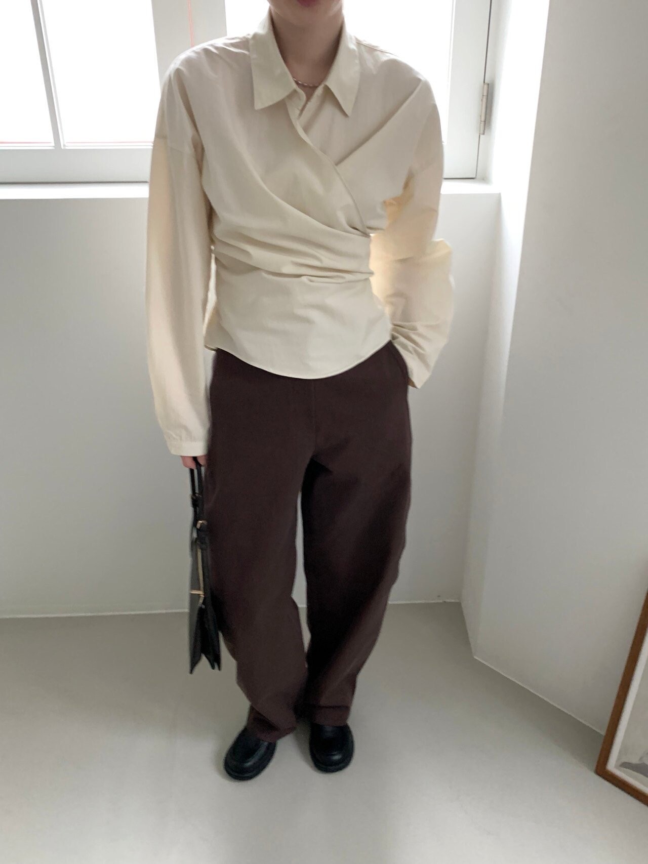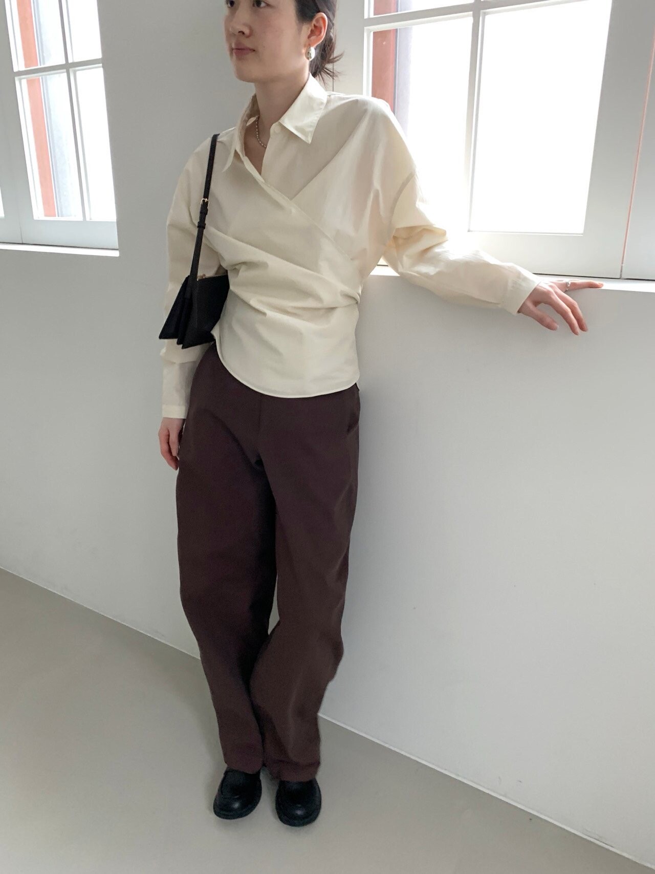-전체적으로 와이드한 핏으로 중성적이면서도 세련된 무드를 연출