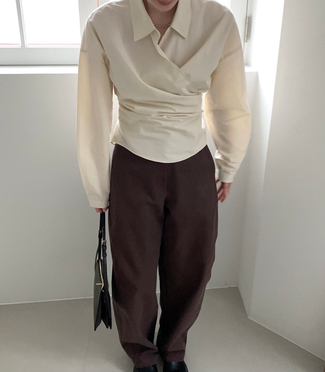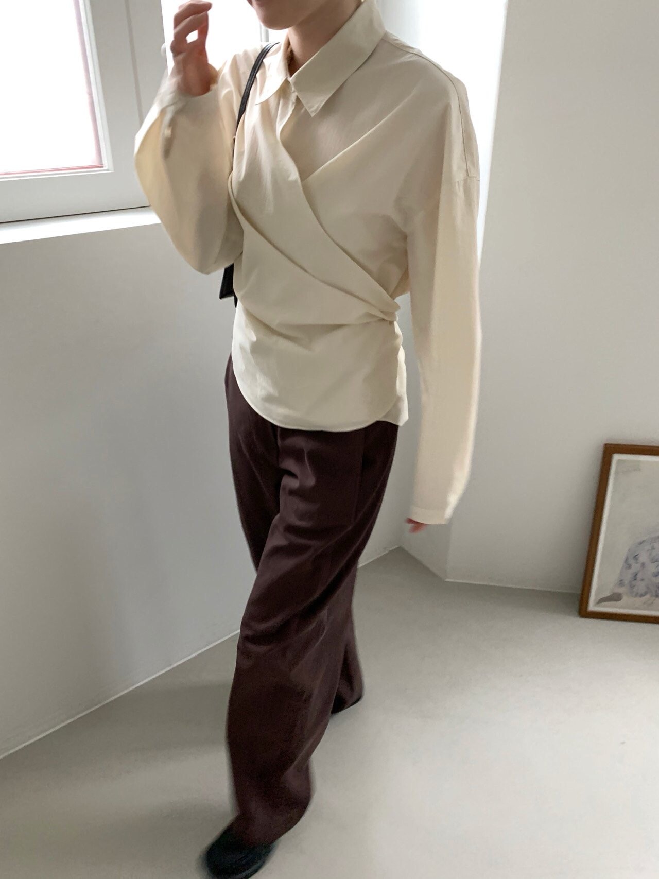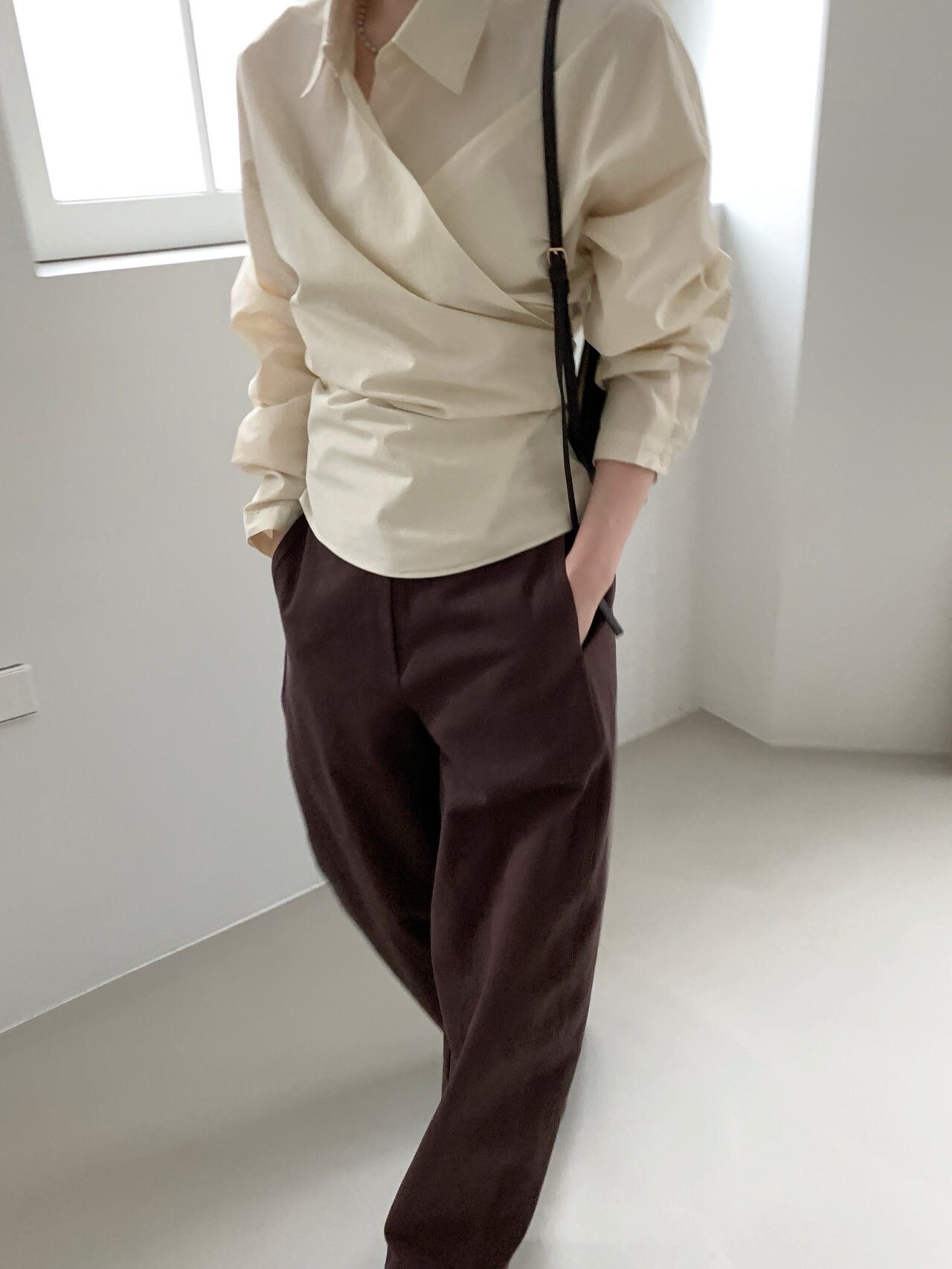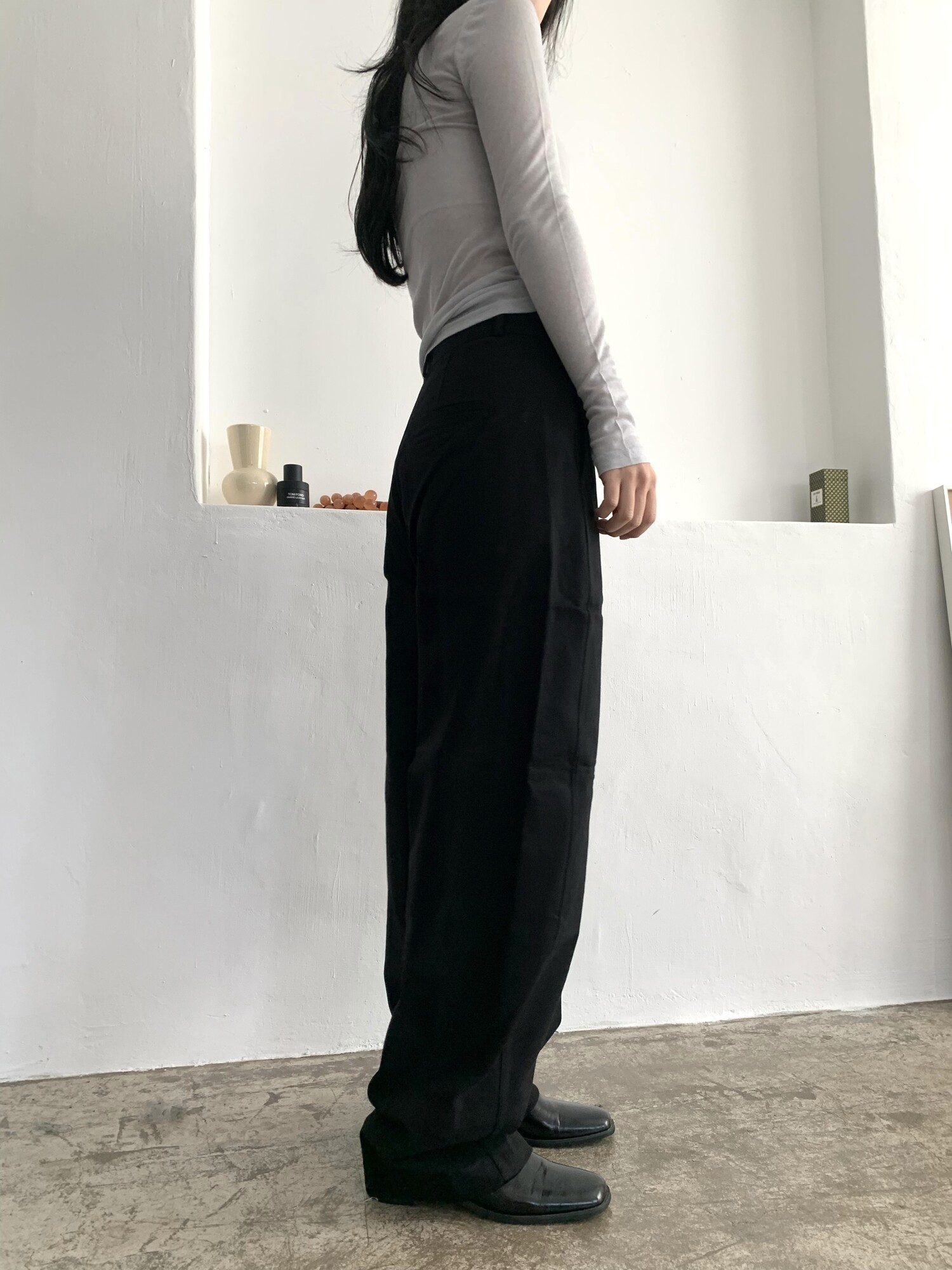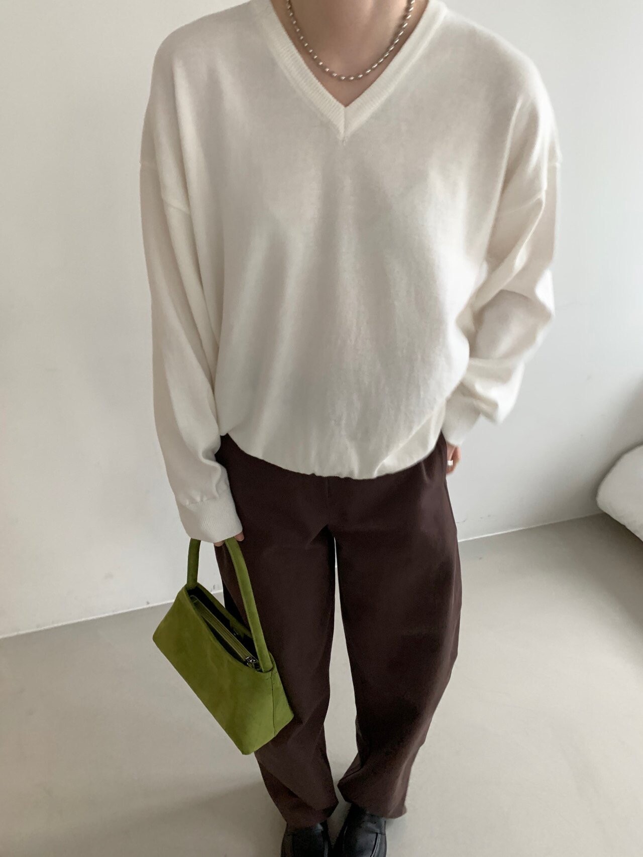 -전체적으로 와이드한 핏으로 중성적이면서도 세련된 무드를 연출