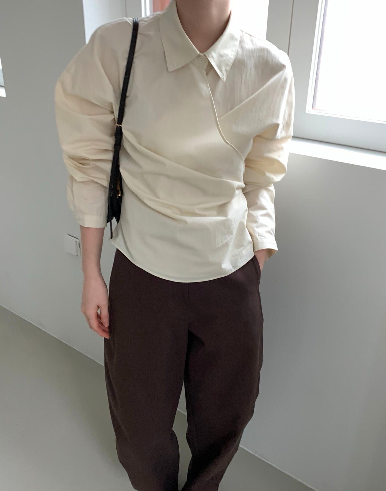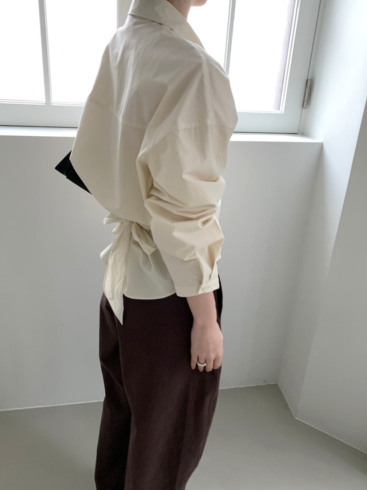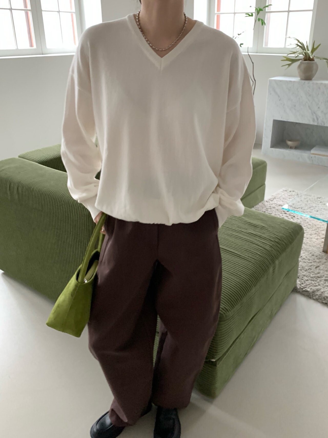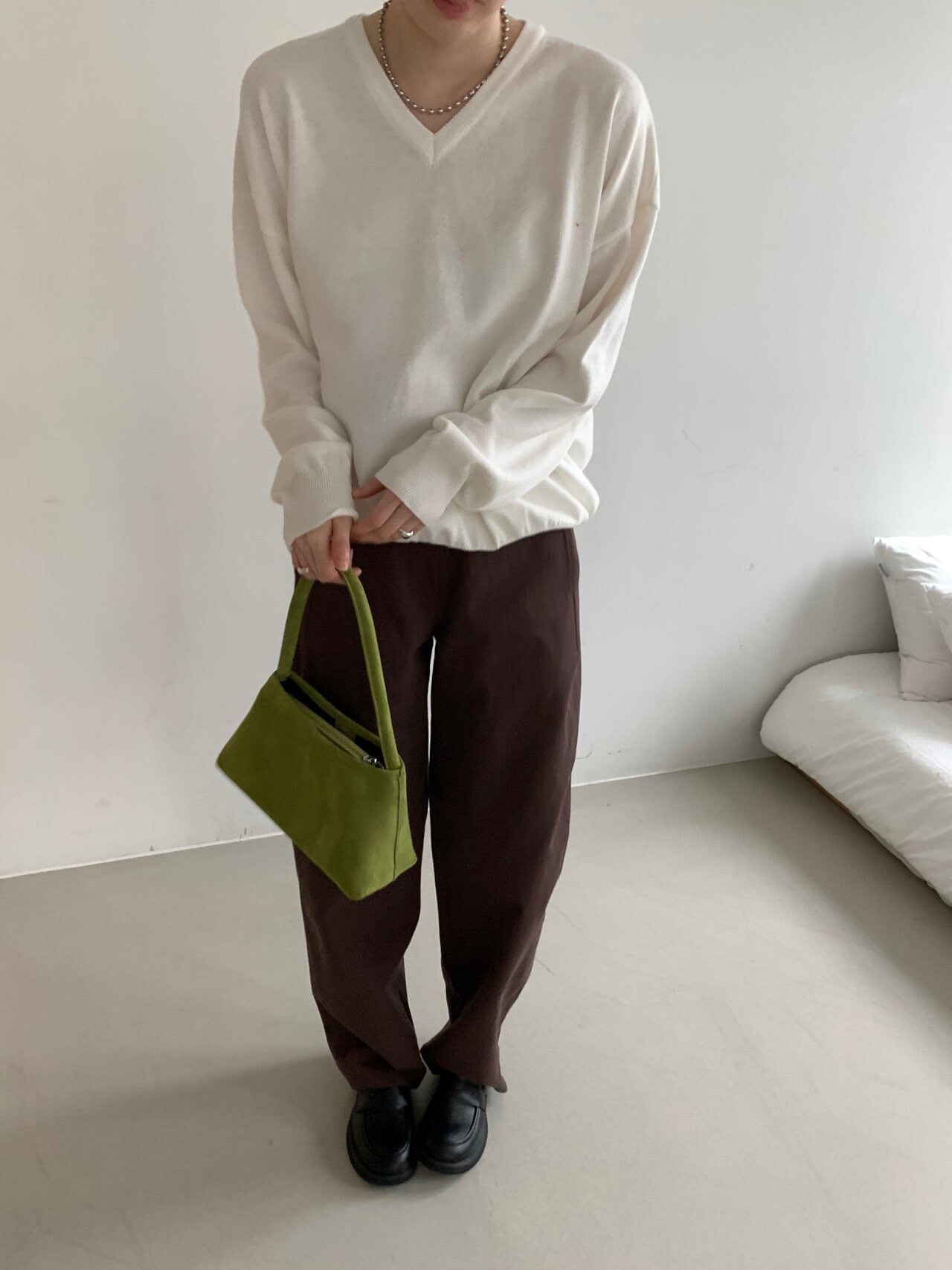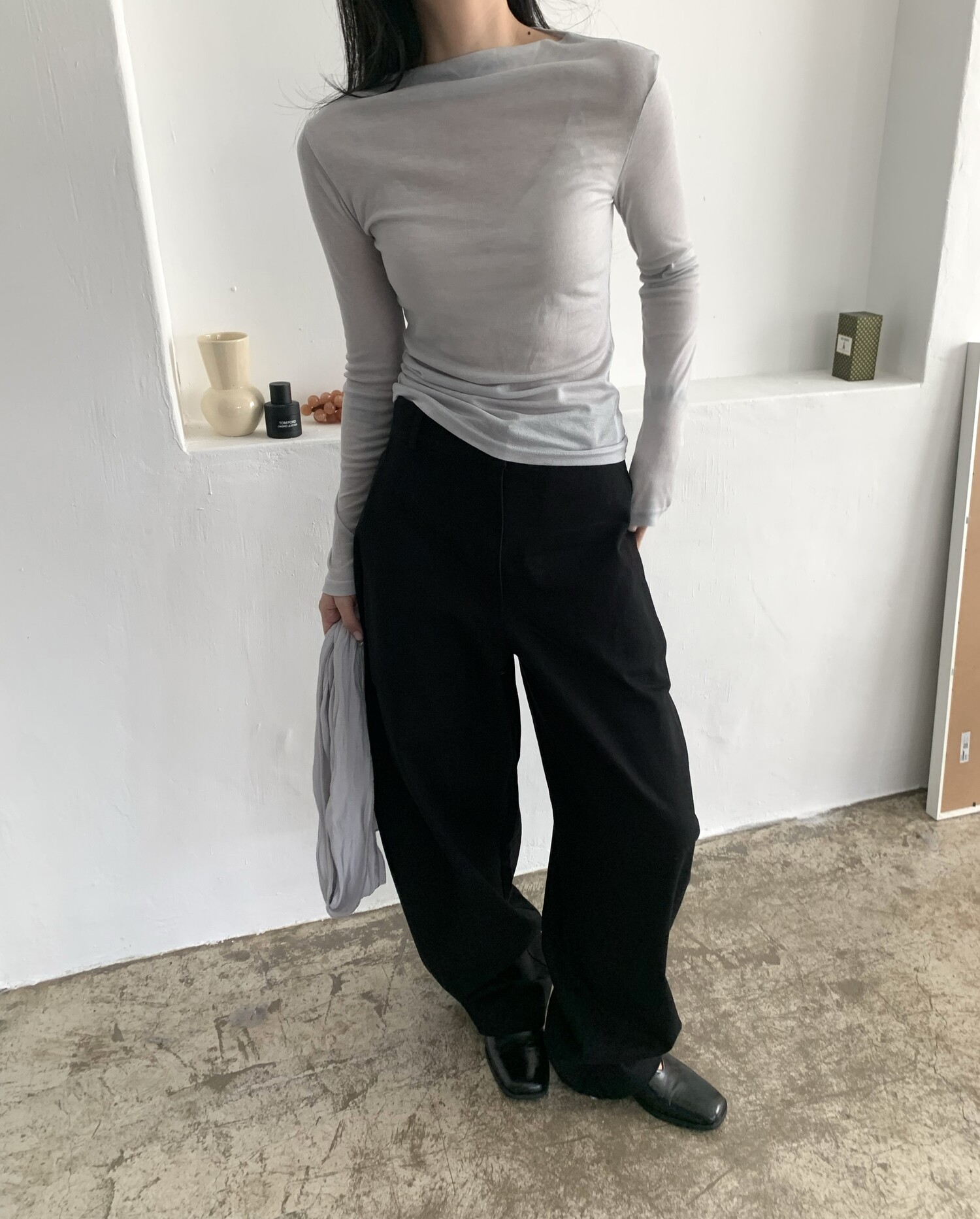 -전체적으로 와이드한 핏으로 중성적이면서도 세련된 무드를 연출