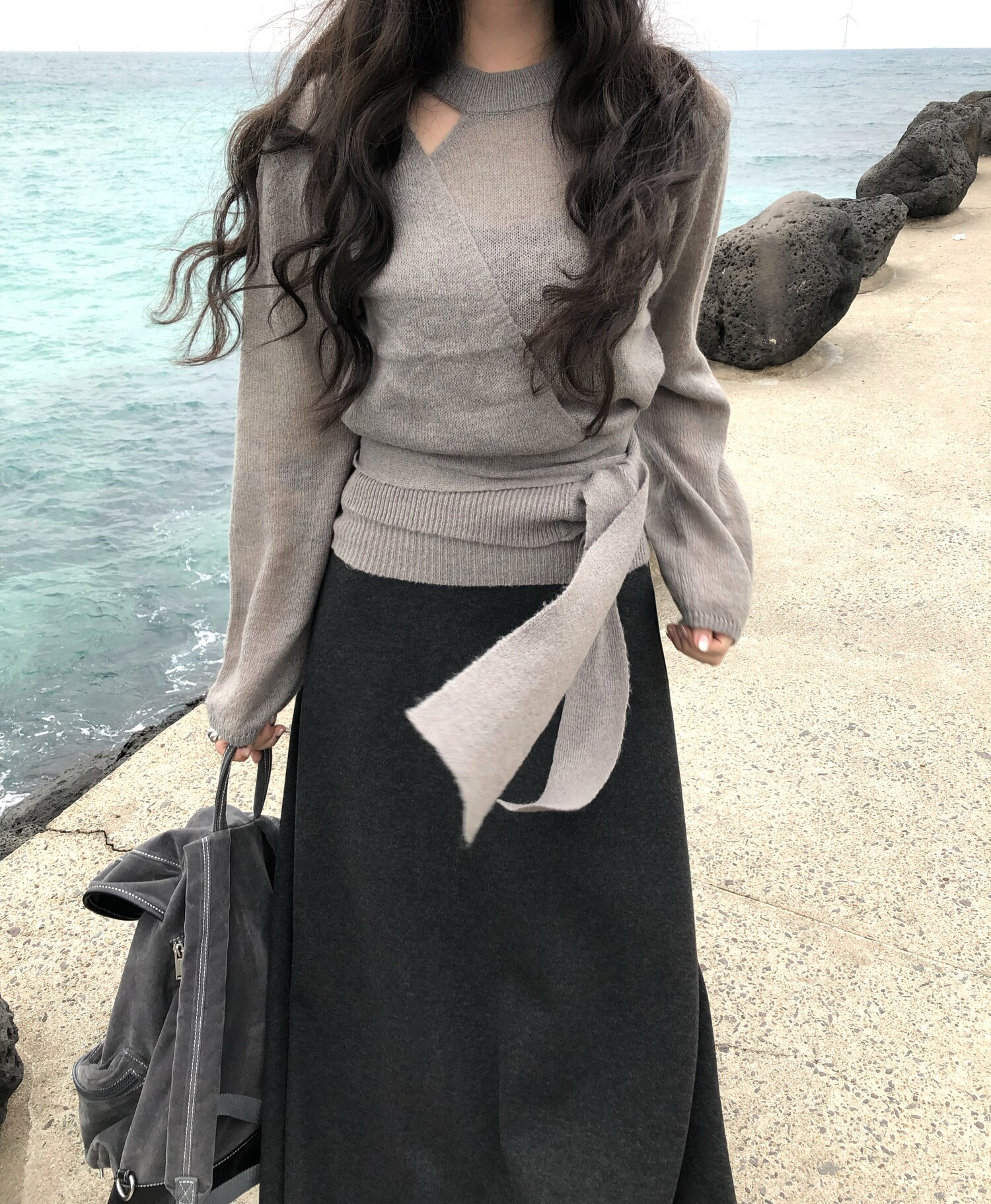 긴 스트랩 한바퀴 둘러 묶어주시면 되어요! 밑단 실루엣 잡아줘서 슬림하게 만들어준답니다.(살짝 타이트하기에 나시보다는 크롭한 탑이나 브라 착용 권장드립니다.