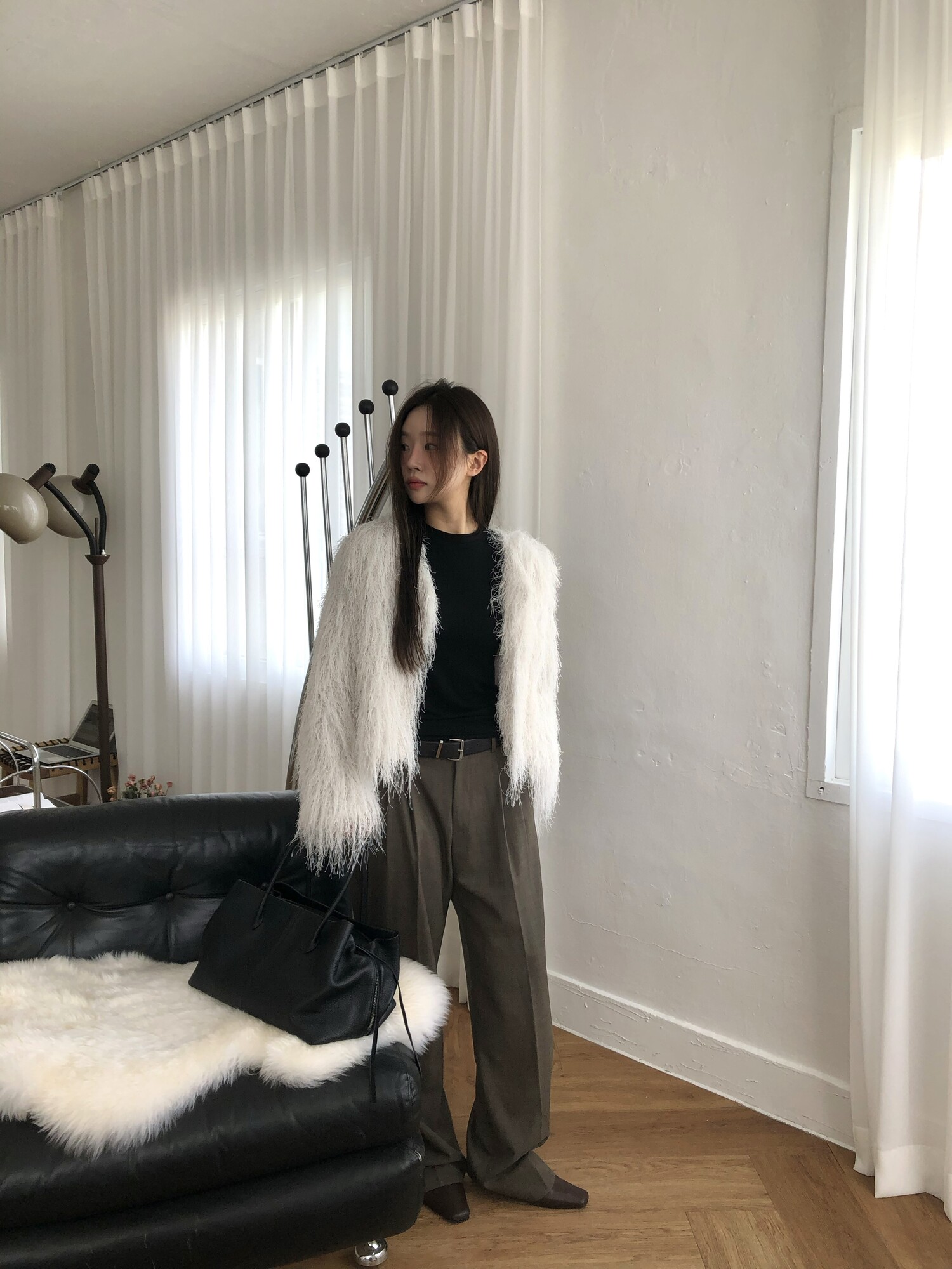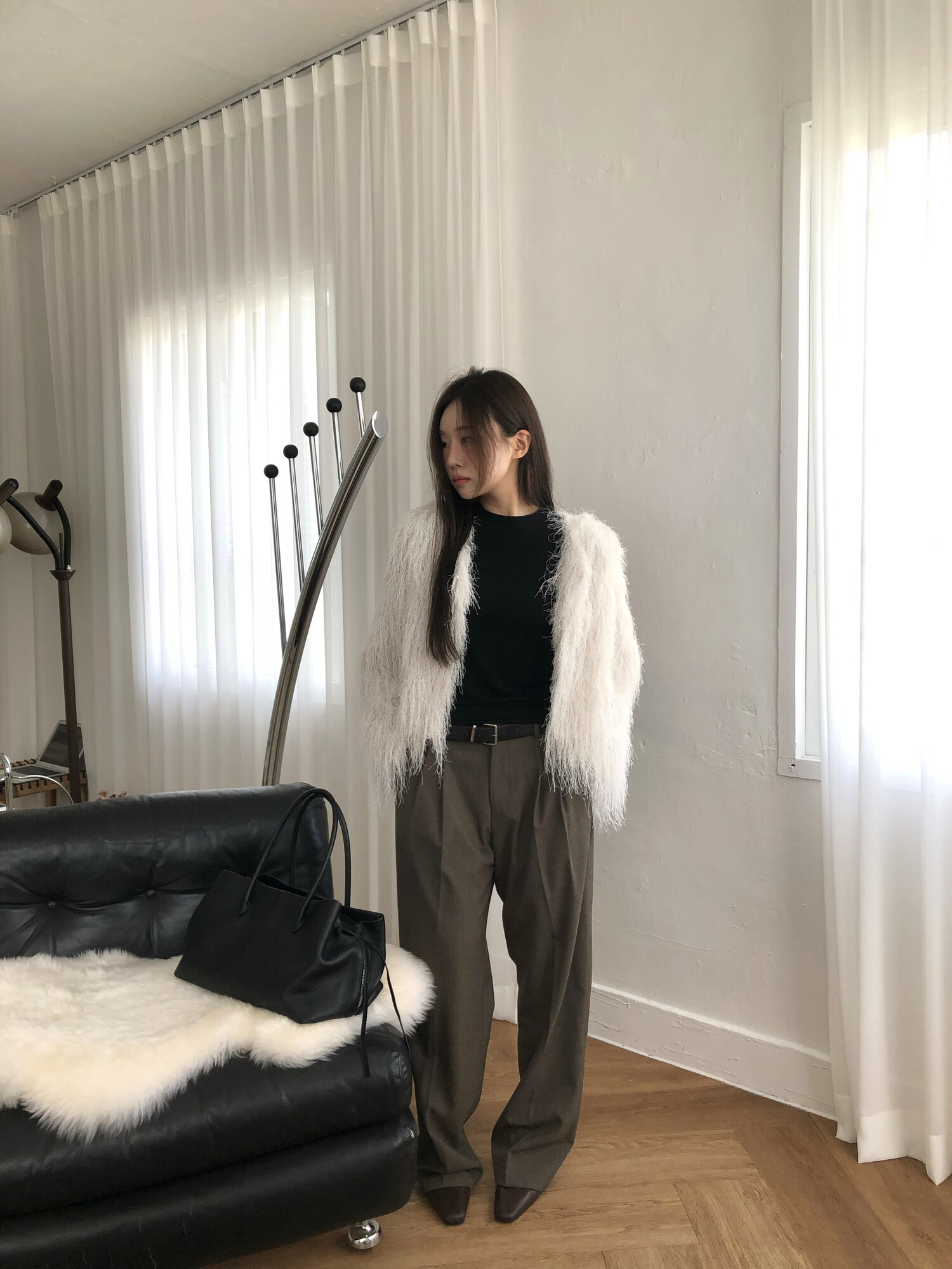 -베이직하면서 여유감이 느껴지는 살짝 루즈한 핏&프론트 자개 원버튼 오픈/클로징.