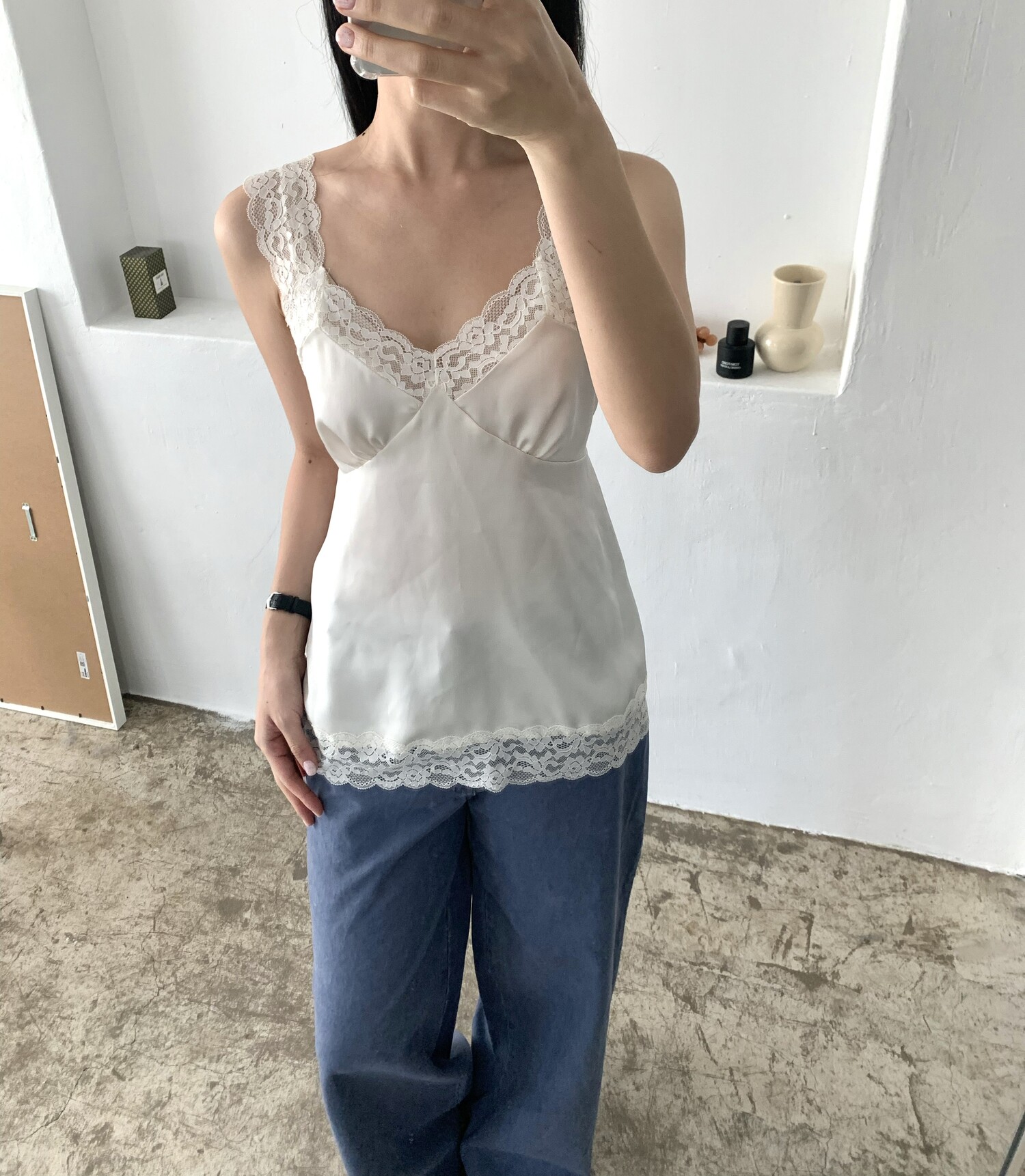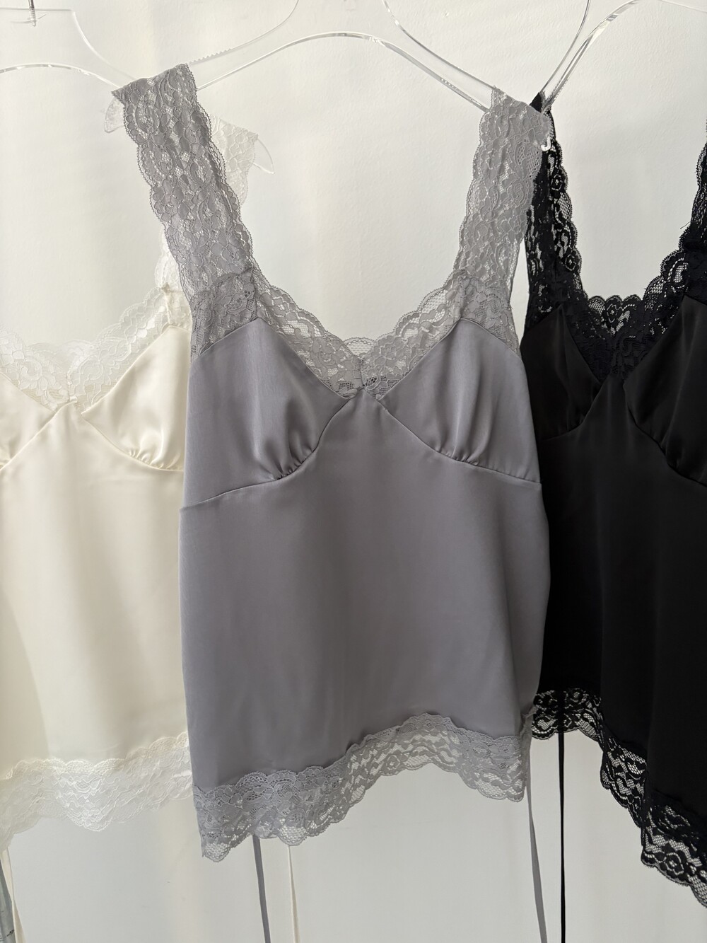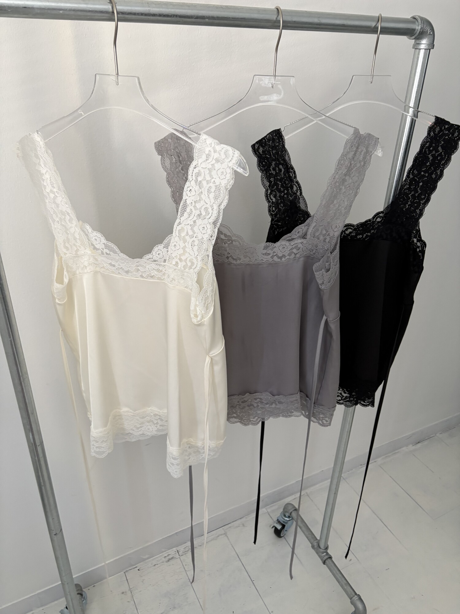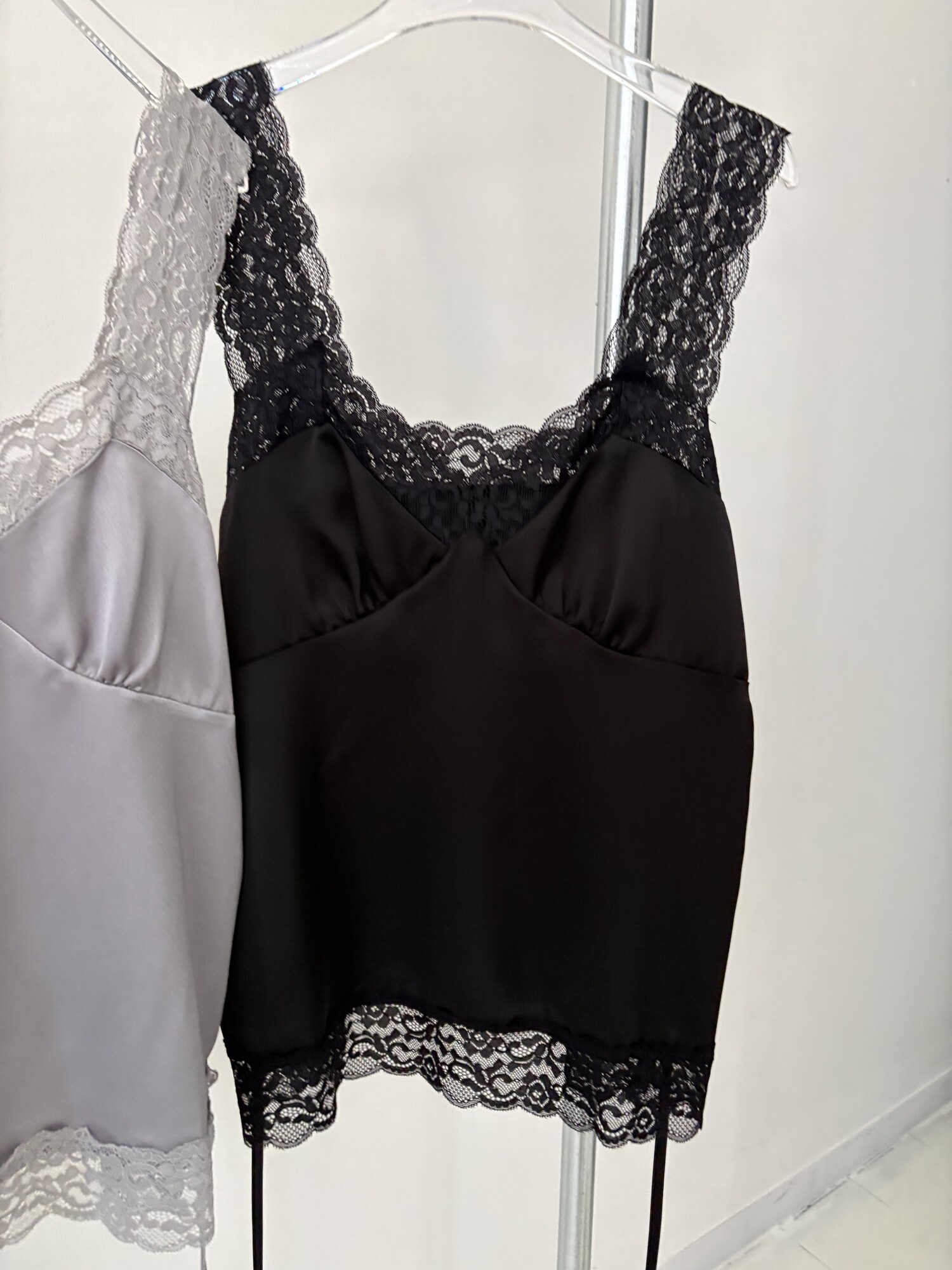 -은은한 광택감이 고급스런 새틴 소재의 레이스 나시에요, 요즘 한참 인기있는 머스트템이죠 ㅎㅎ