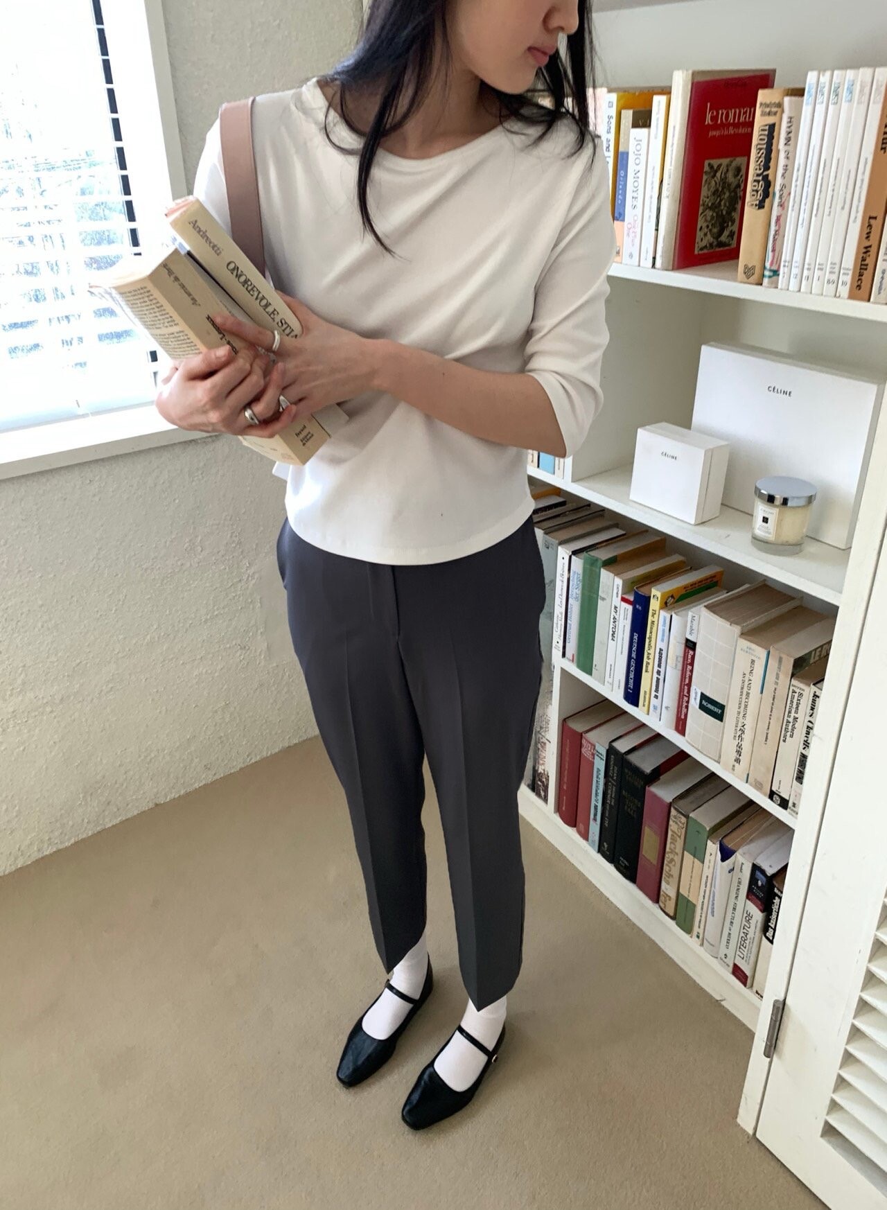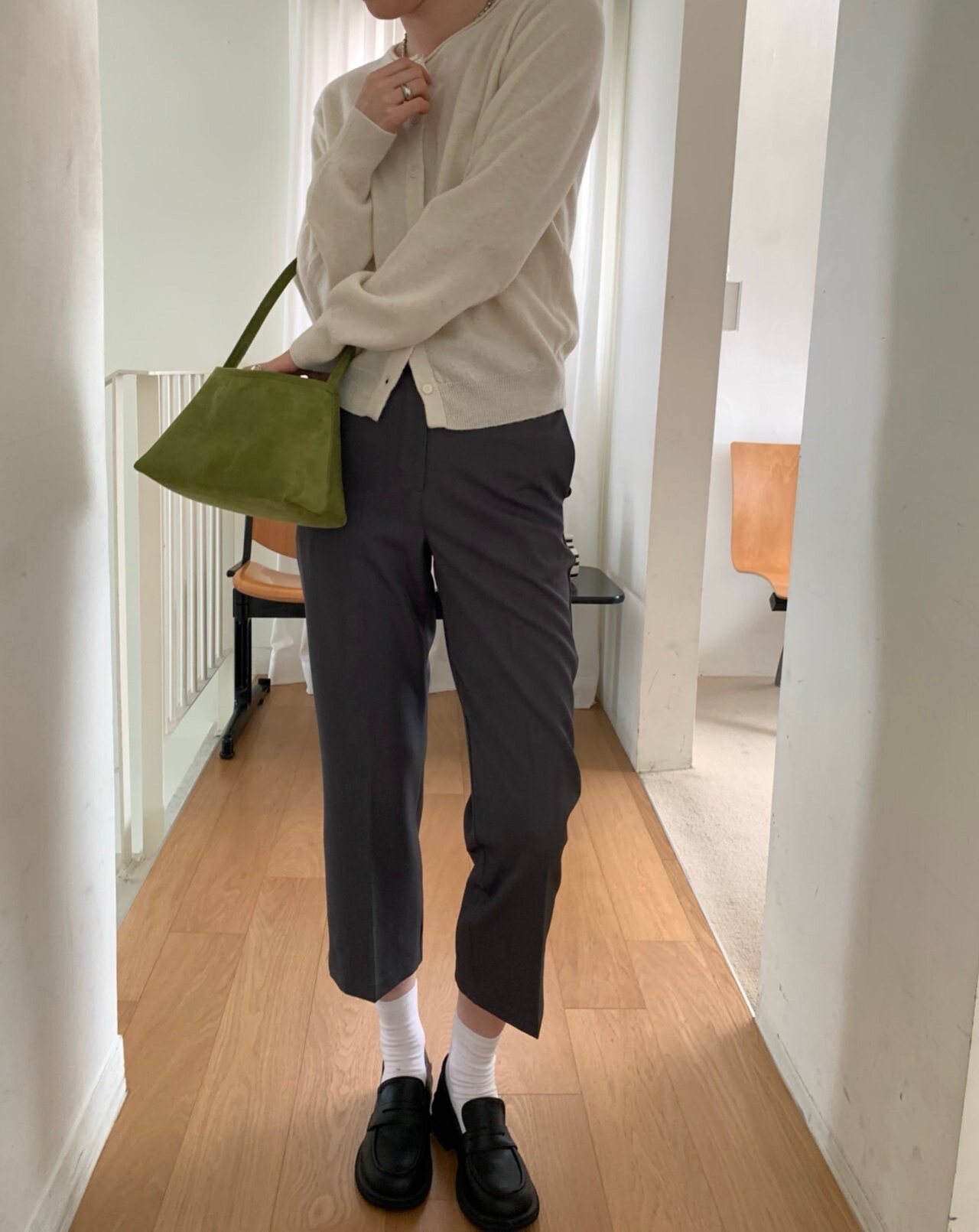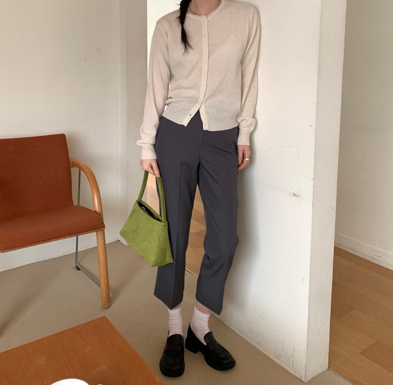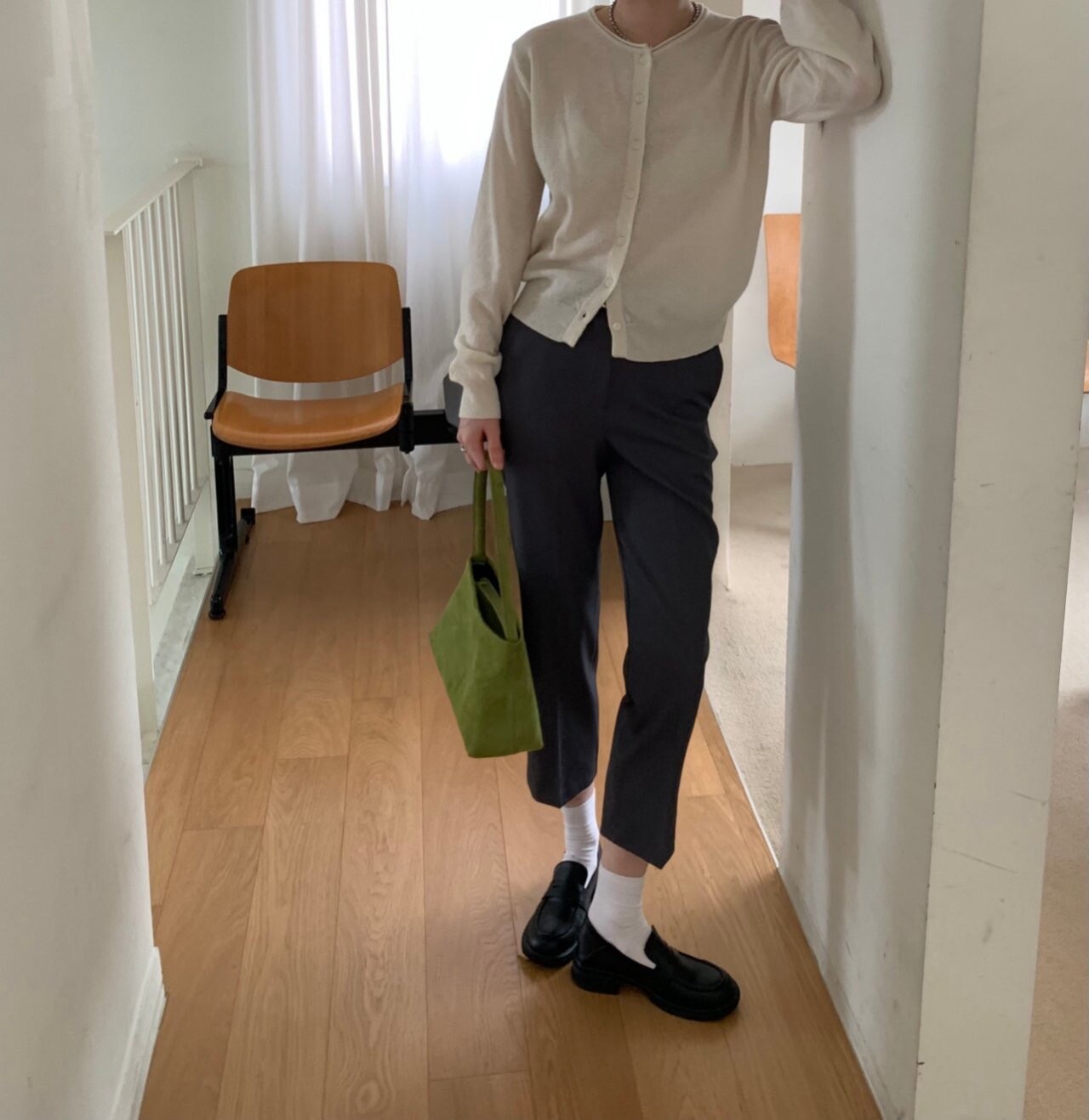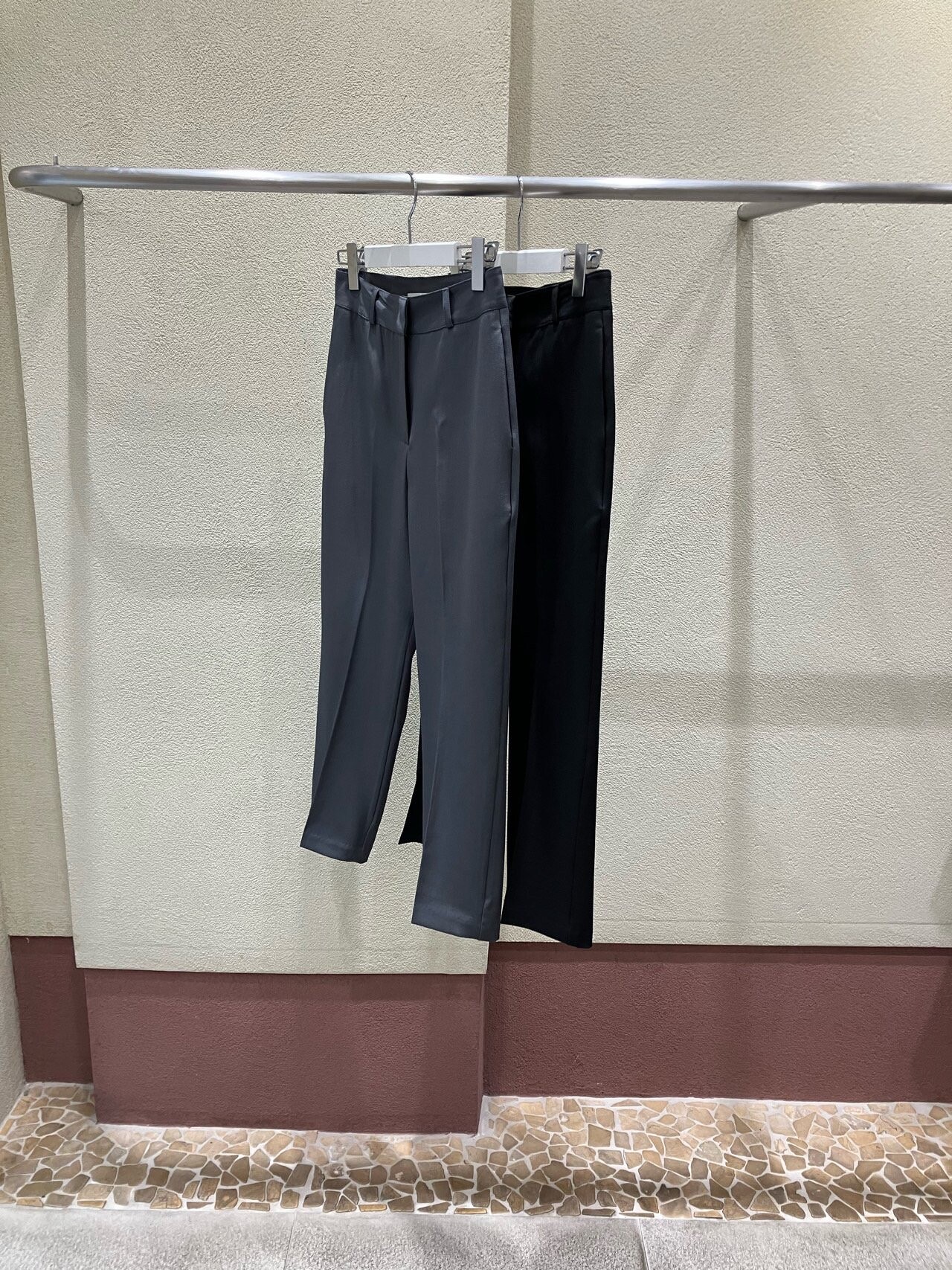 -툭 떨어지는 슬랙스 원단으로 붙지 않고 슬림한 핏 연출