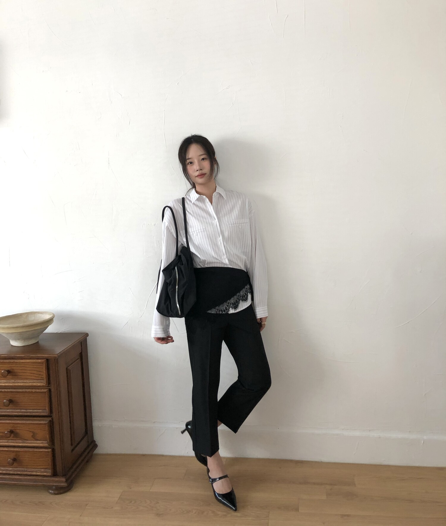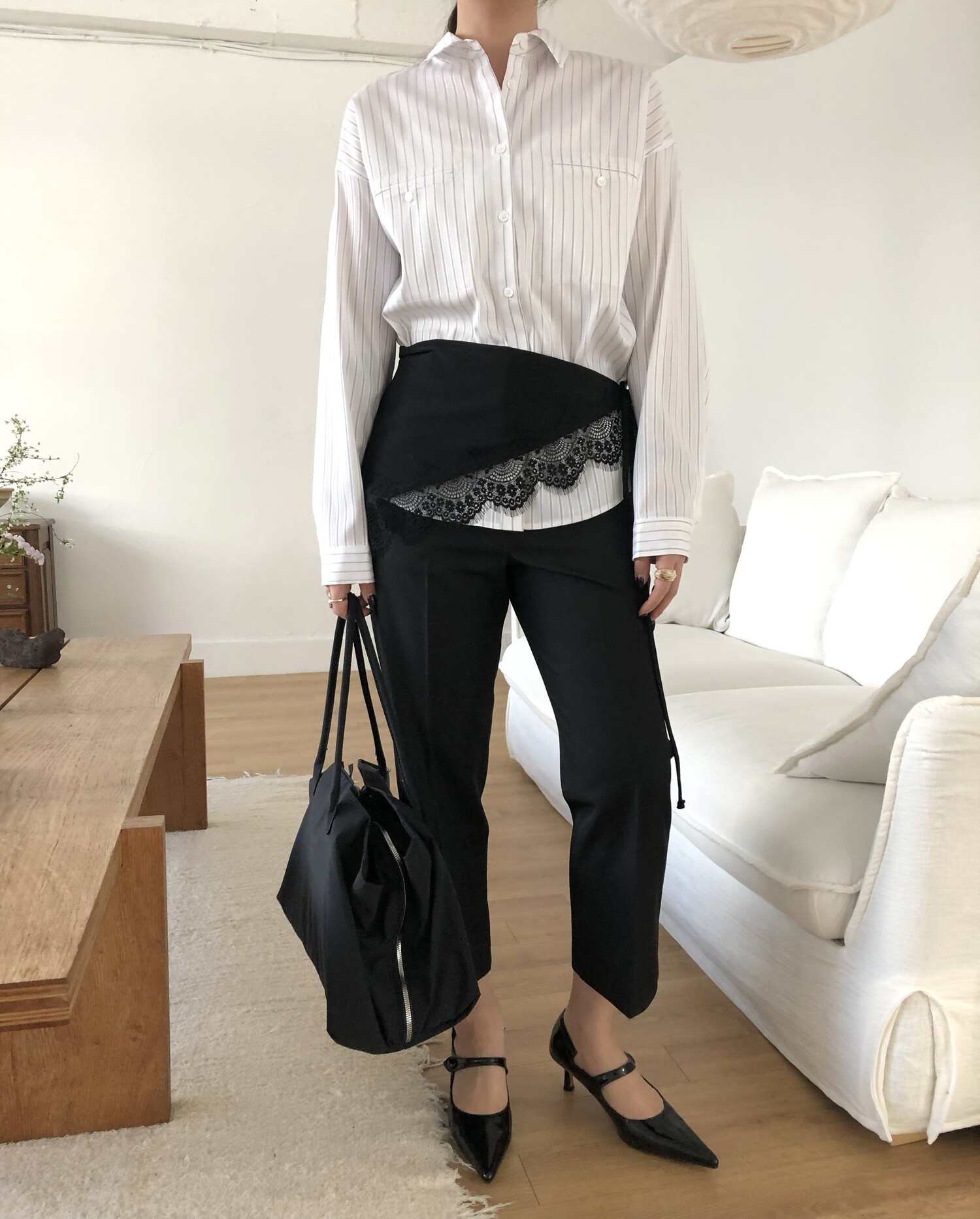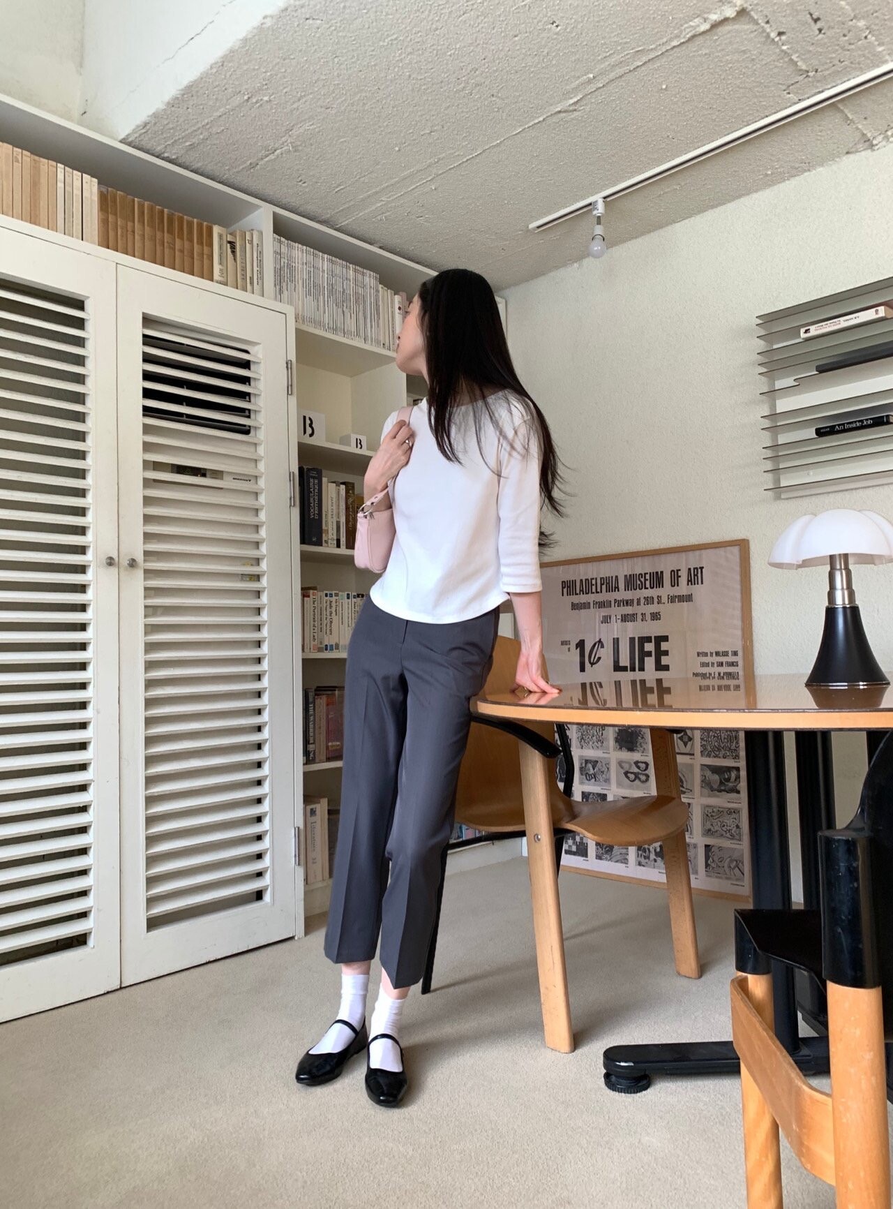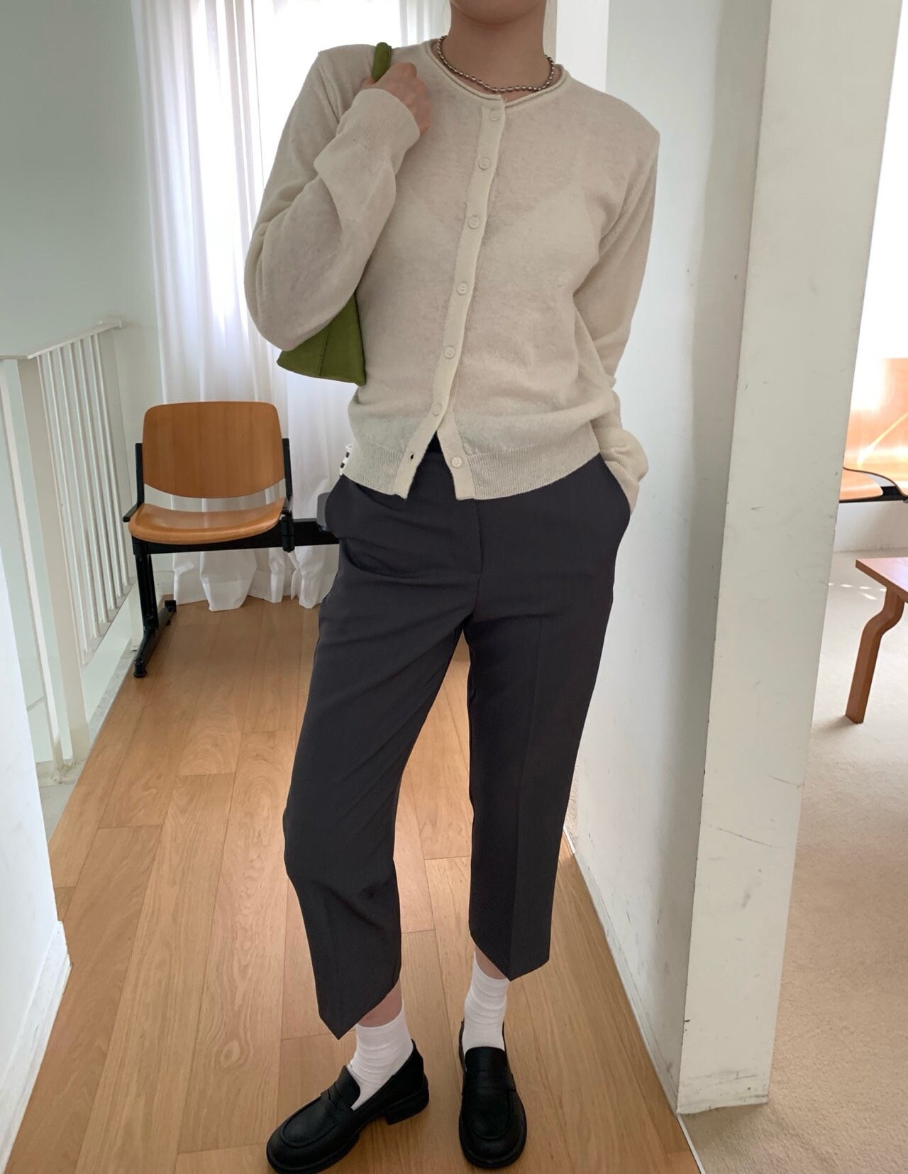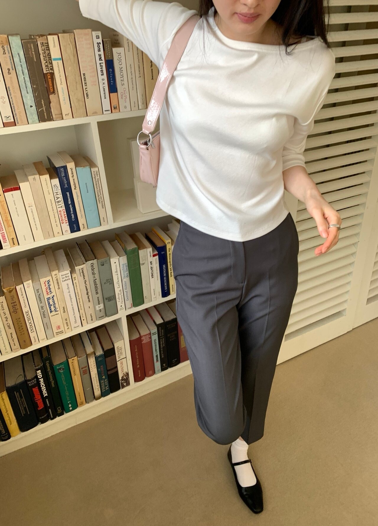 -툭 떨어지는 슬랙스 원단으로 붙지 않고 슬림한 핏 연출