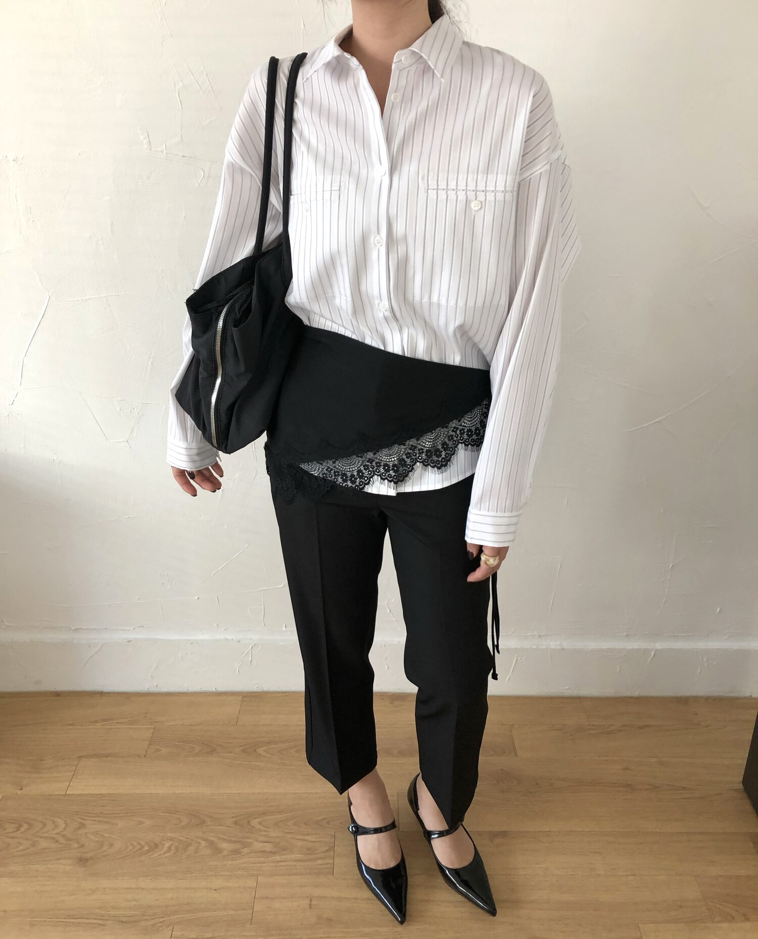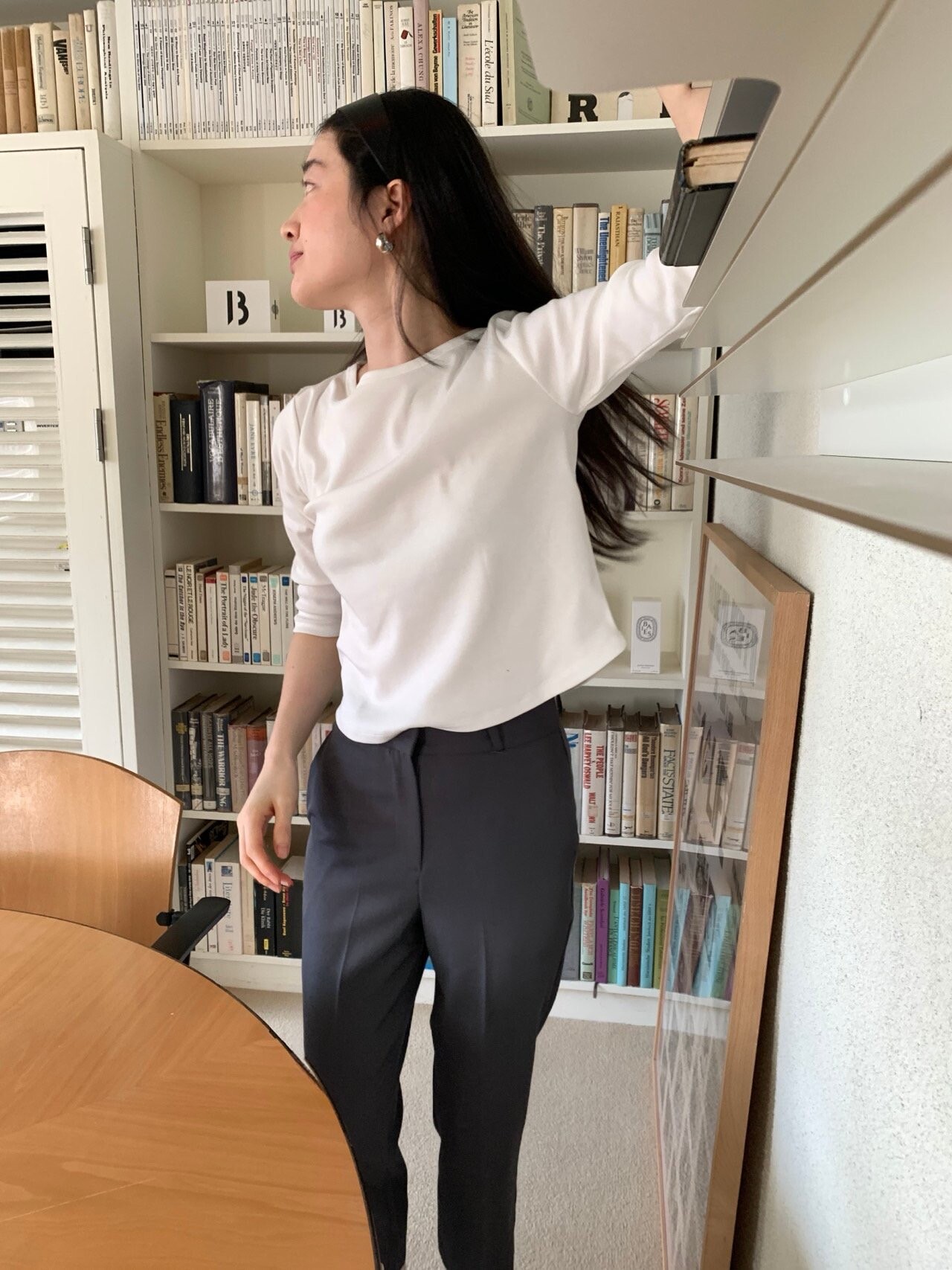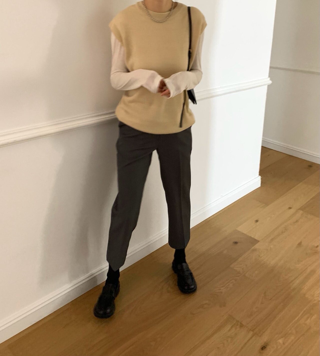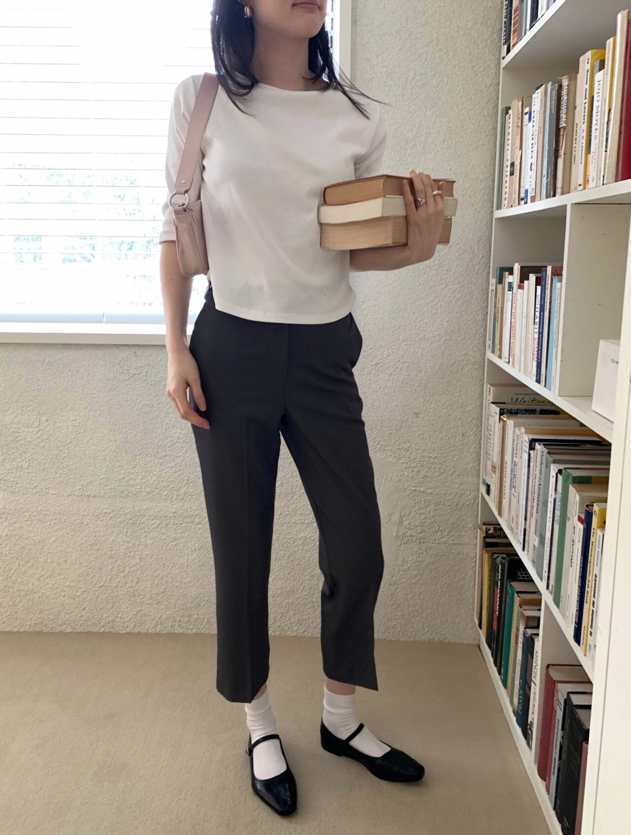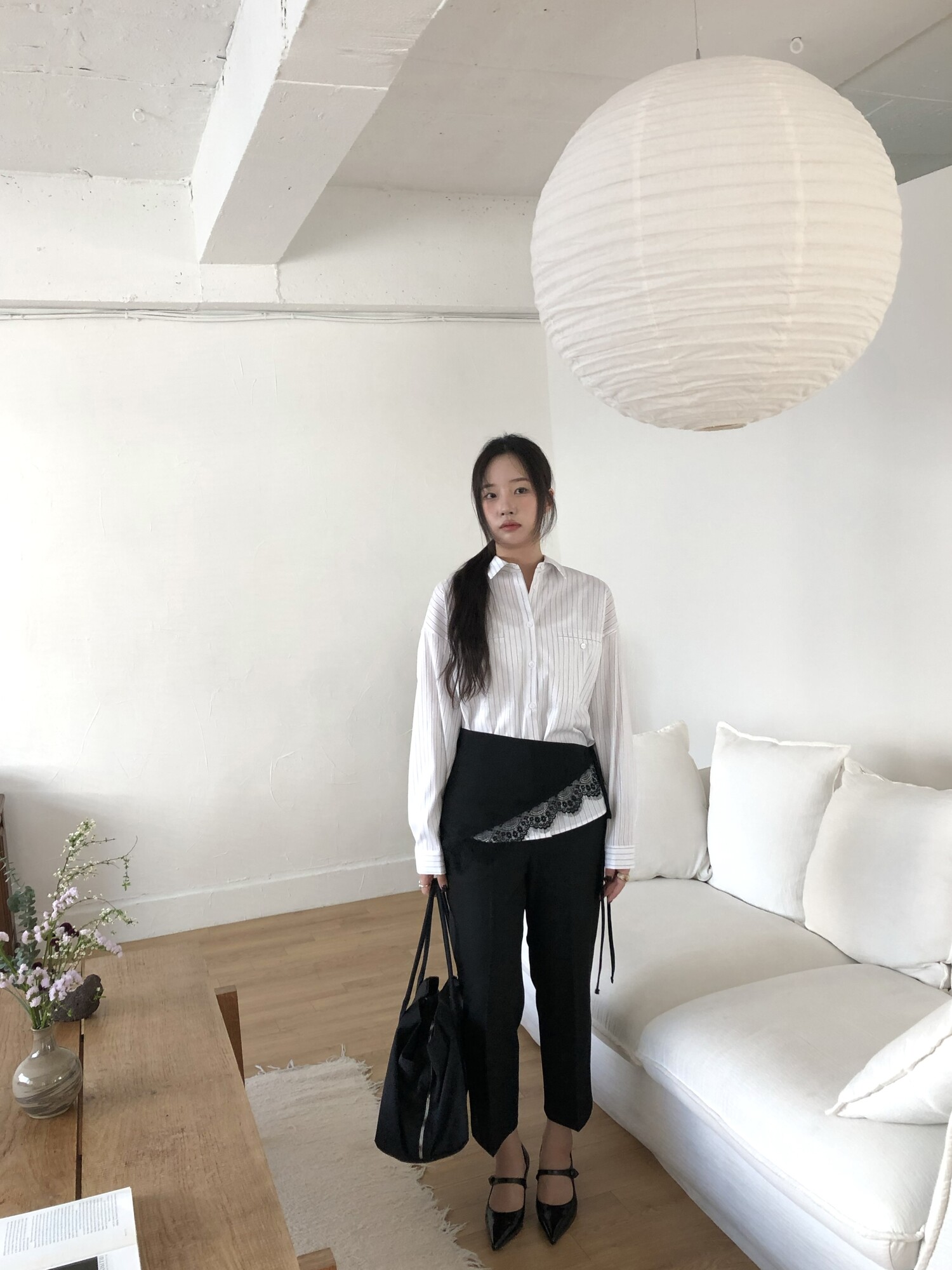 -툭 떨어지는 슬랙스 원단으로 붙지 않고 슬림한 핏 연출